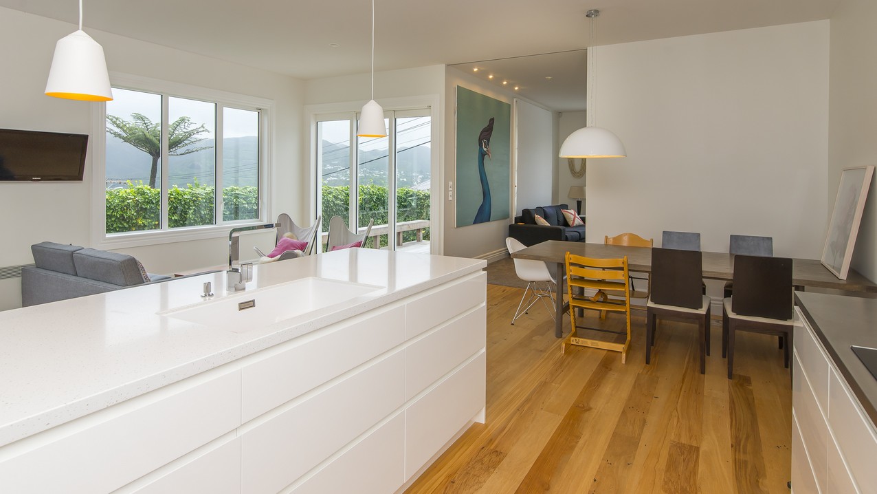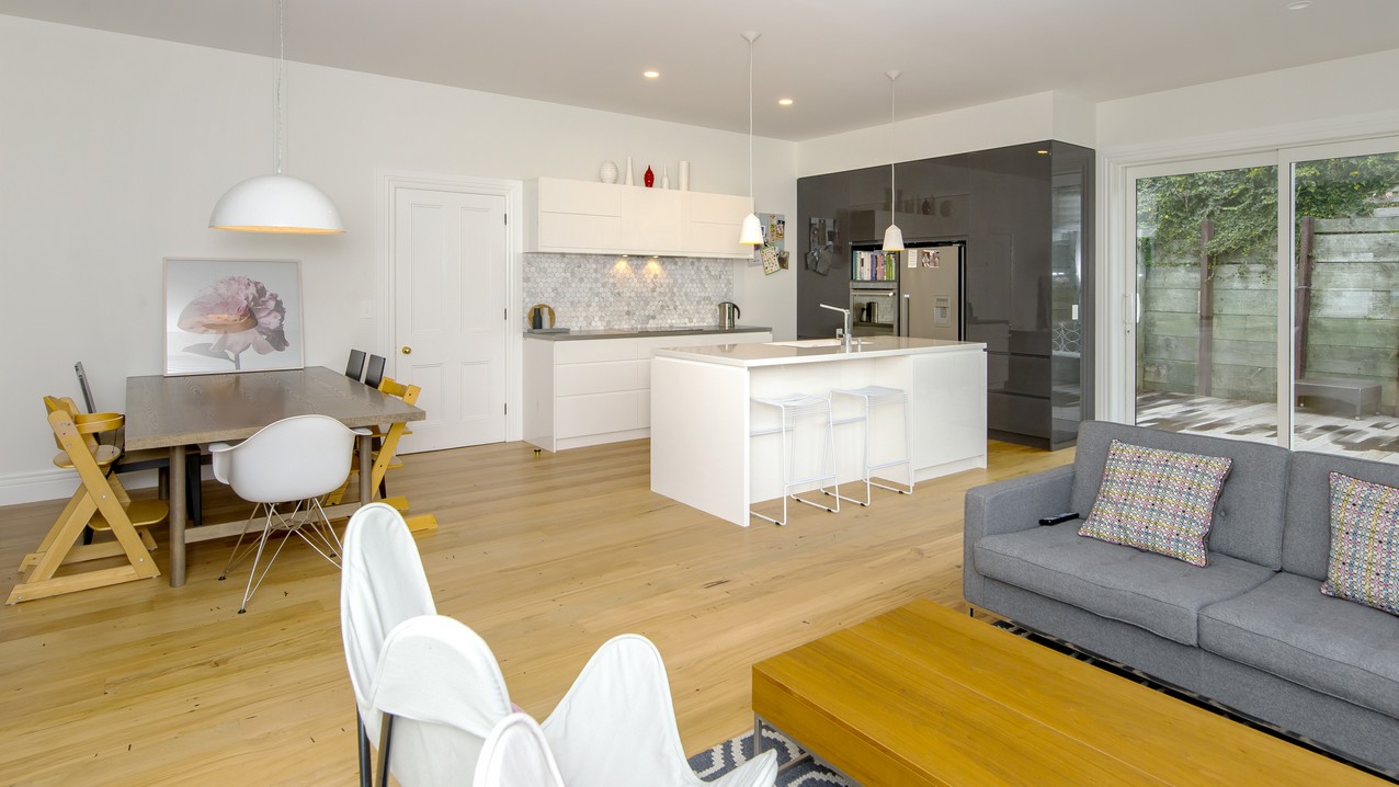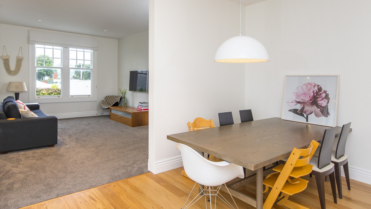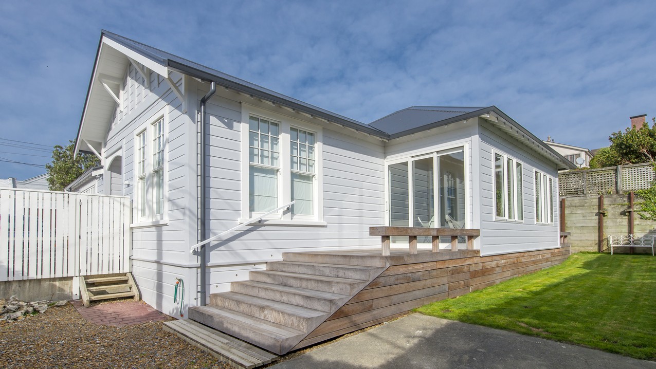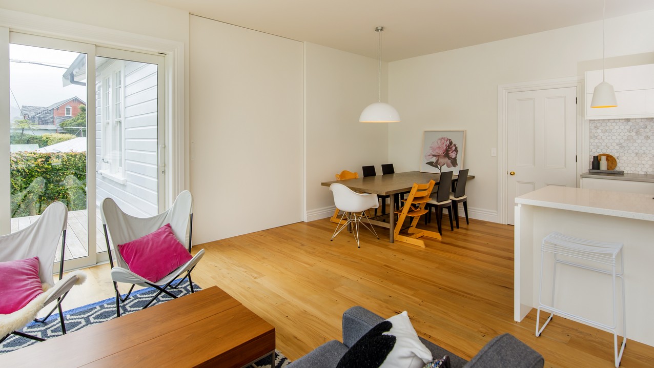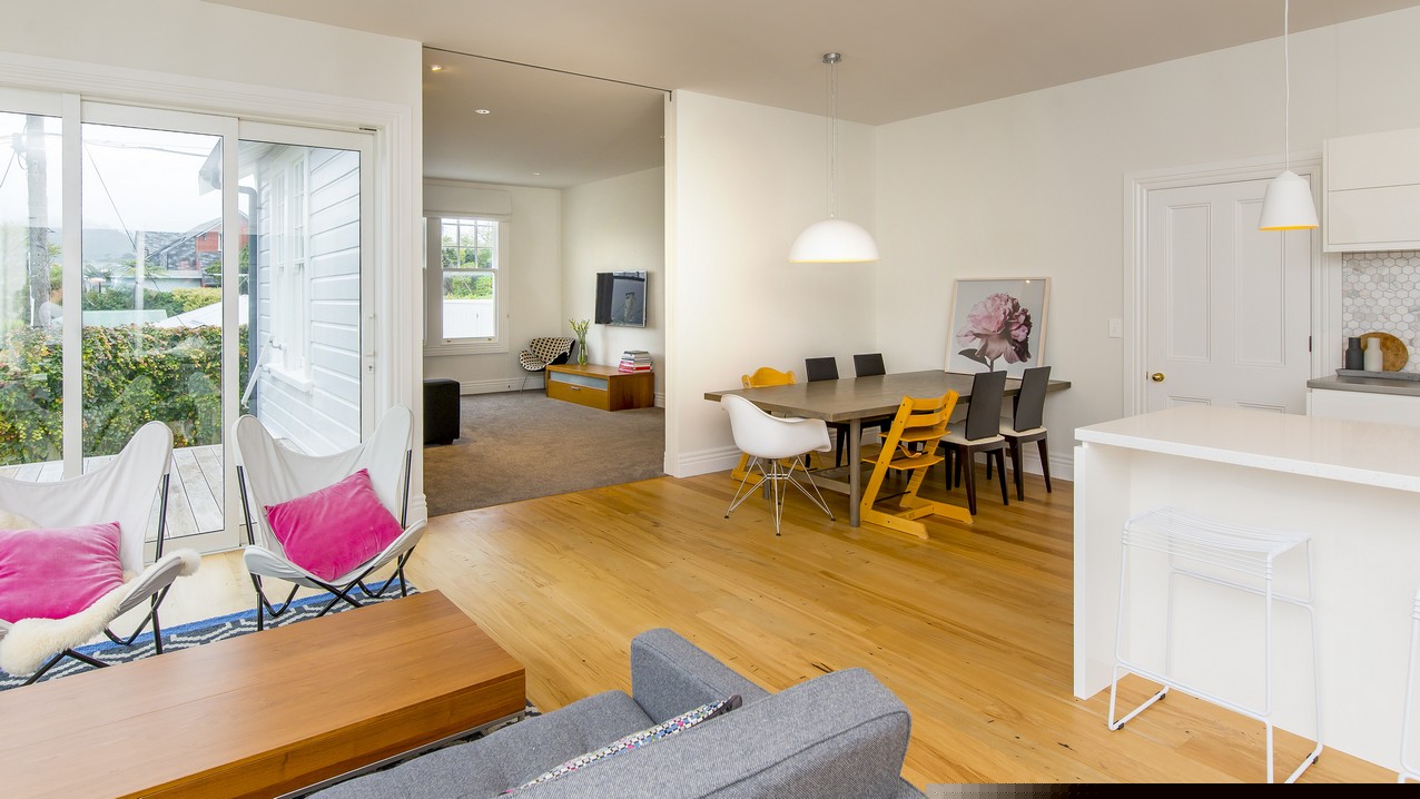 Now with four bedrooms and two bathrooms, the spacious family home in Wadestown, Wellington, is light, warm, comfortable and a pleasure to live in. The owners had firm requirements of functionality for their young and growing family, and wanted to find a balance between maintaining the character of their home and making it fit for modern living. Building on its lovely bones, the upgrade and extension has restored this residence to its former glory and beyond. While much of the internal structure has been reorganised for effective use of space, external features have been retained to reinforce the home’s historic identity. A mixture of traditional details, such as timber sash windows and a stunning reclaimed stained-glass front door, coexist with modern conveniences. Aluminium multi-sliders in the new open-plan space, and an ensuite off the master bedroom, are conducive to contemporary, easy living.