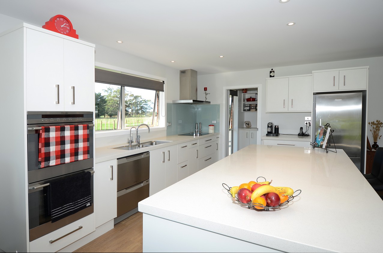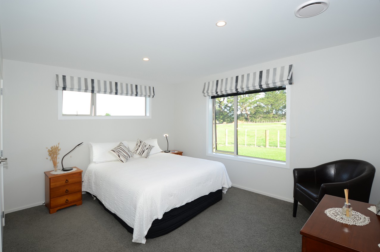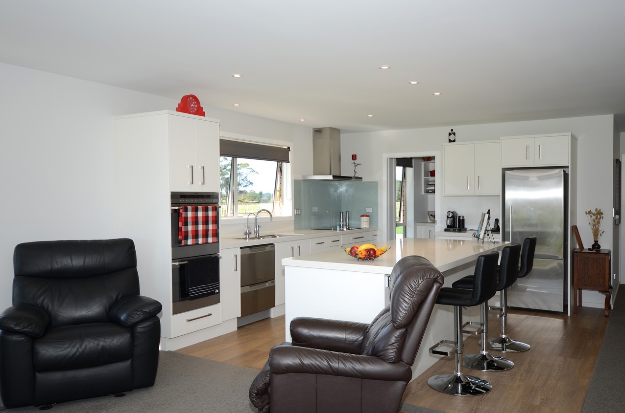 Exposed trusses enhance the country feel of the covered outdoor entertaining area, drawing attention to its impressive height. Brick feature columns tie into the home’s rock-solid cladding. The alfresco space flows inside to a large open-plan living hub, the heart of this 318sqm four-bedroom home. A separate lounge offers a cosy, quiet place away from the action and the TV. A terraced area, protected from prevailing winds, is also on offer for enjoyment of the outdoors. For more comfortable – and horizontal – appreciation of the ever-changing vista, the master bedroom is the place to be. Grey tint glass offers sun protection without spoiling the view. An ensuite completes this retreat. The home has been built to last using quality products throughout. A high level of insulation keeps things lovely and warm.
