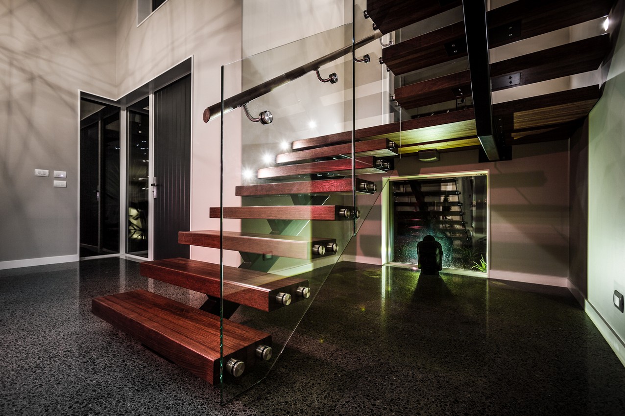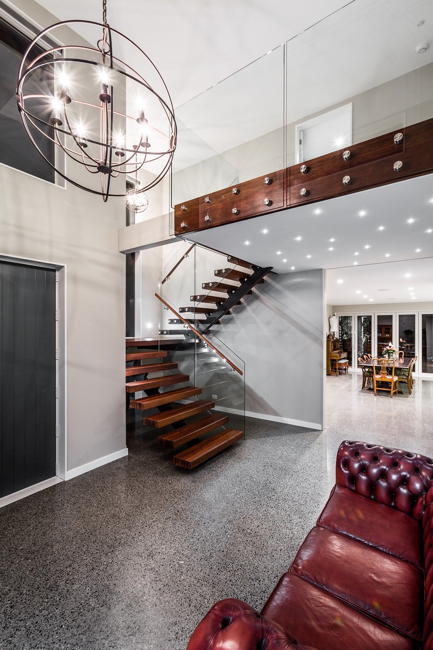 Situated up the stunning feature staircase, the master suite is king of the castle. This generous domain enjoys commanding views over the cleverly designed landscaping to the trees beyond. A large walk-in wardrobe, elegant ensuite and lift complete this enviable retreat. Four living spaces cater to all facets of family life. The versatile open-plan area can be easily divided into media, lounge, dining and family rooms, and spills seamlessly into a covered landscape room, ideal for wine with friends. The kids’ quarters embrace bedrooms, bathrooms and a lounge. With an eye on future generations, the 410sqm footprint treads lightly on the planet: powerful photovoltaic panels gather energy, while the fully insulated polished concrete slab keeps heat from escaping through the floor of this flawless home.