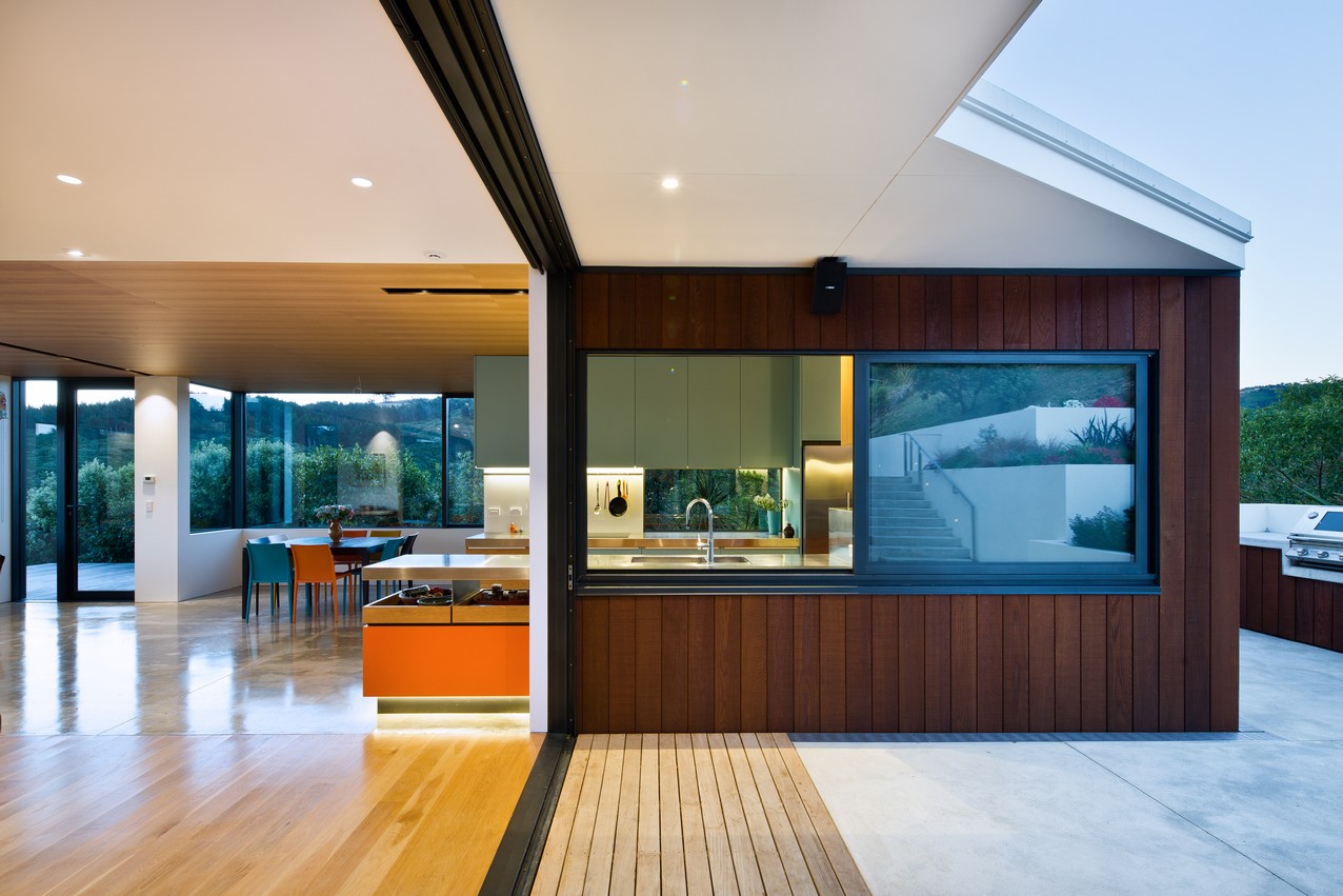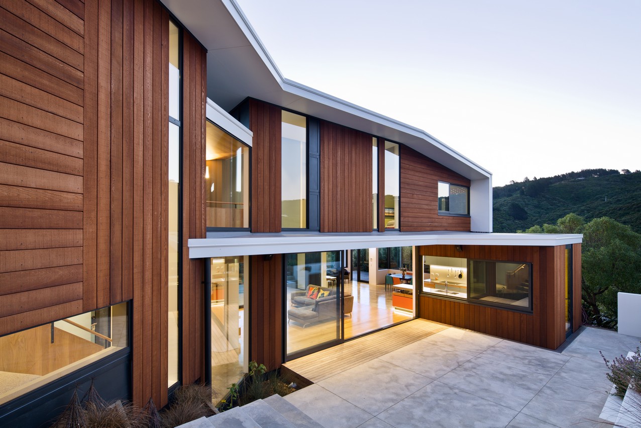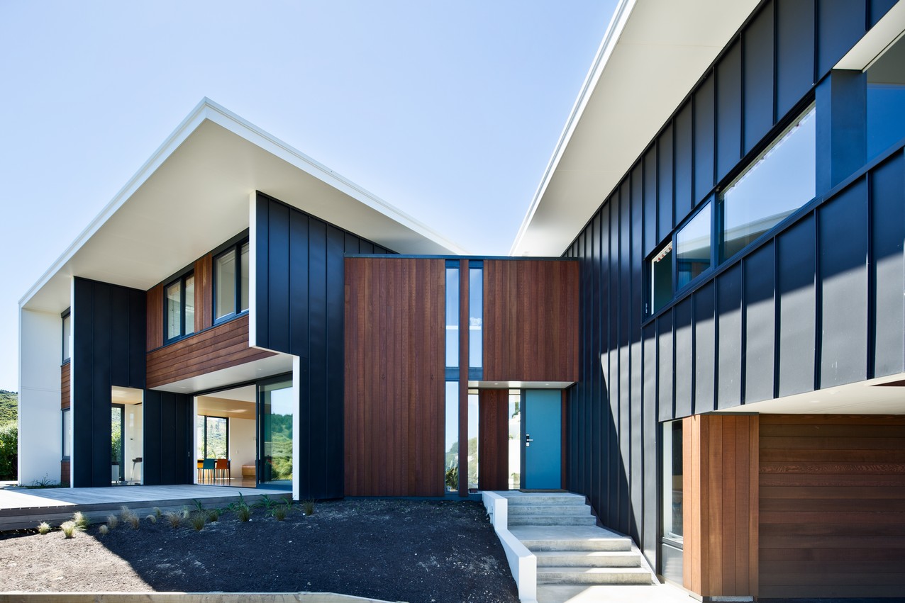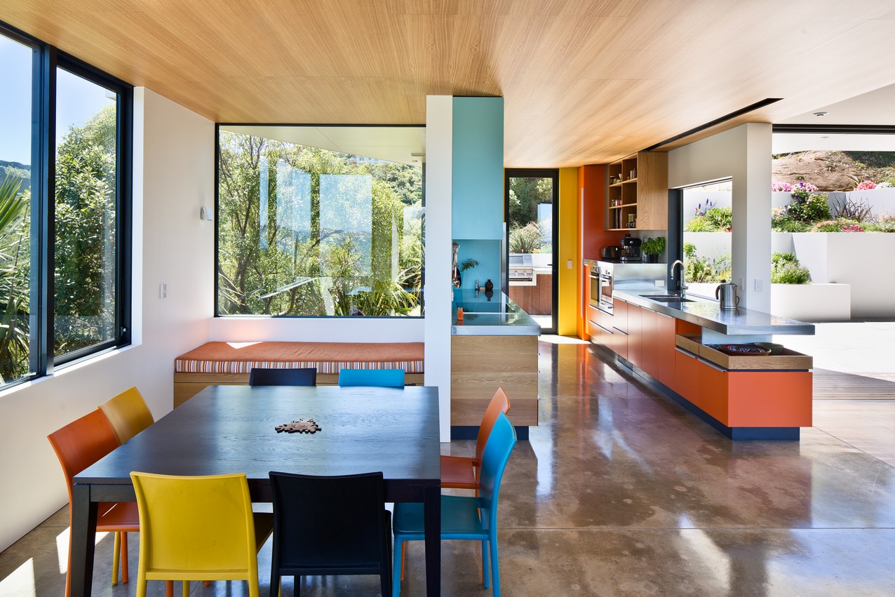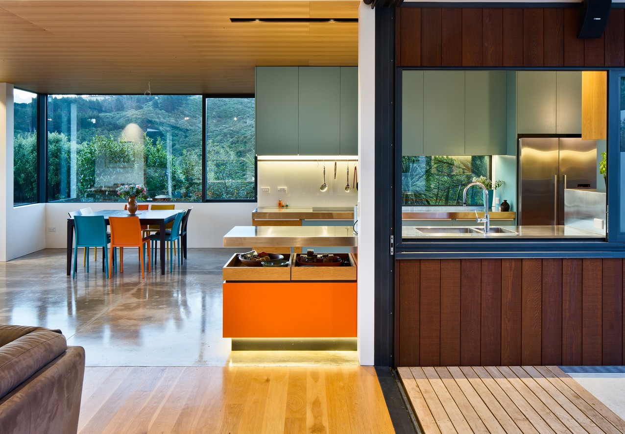 Clad in zinc, corrugated Colorsteel and cedar, this architecturally designed home in Lower Hutt exudes space and style. Wood elements and splashes of orange give the contemporary home a retro vibe.