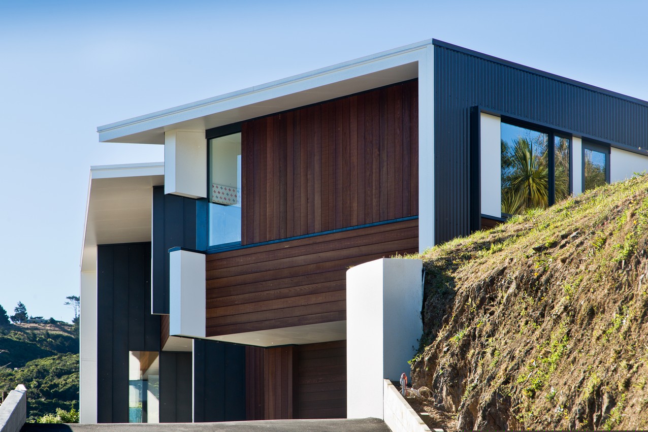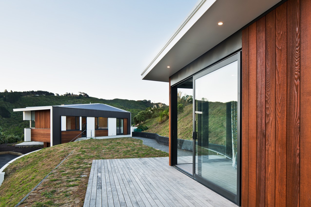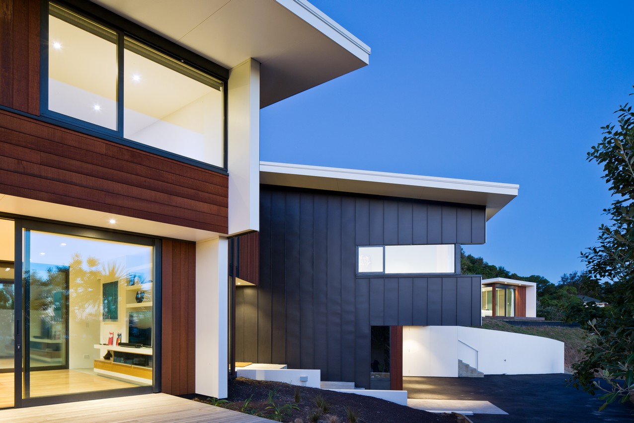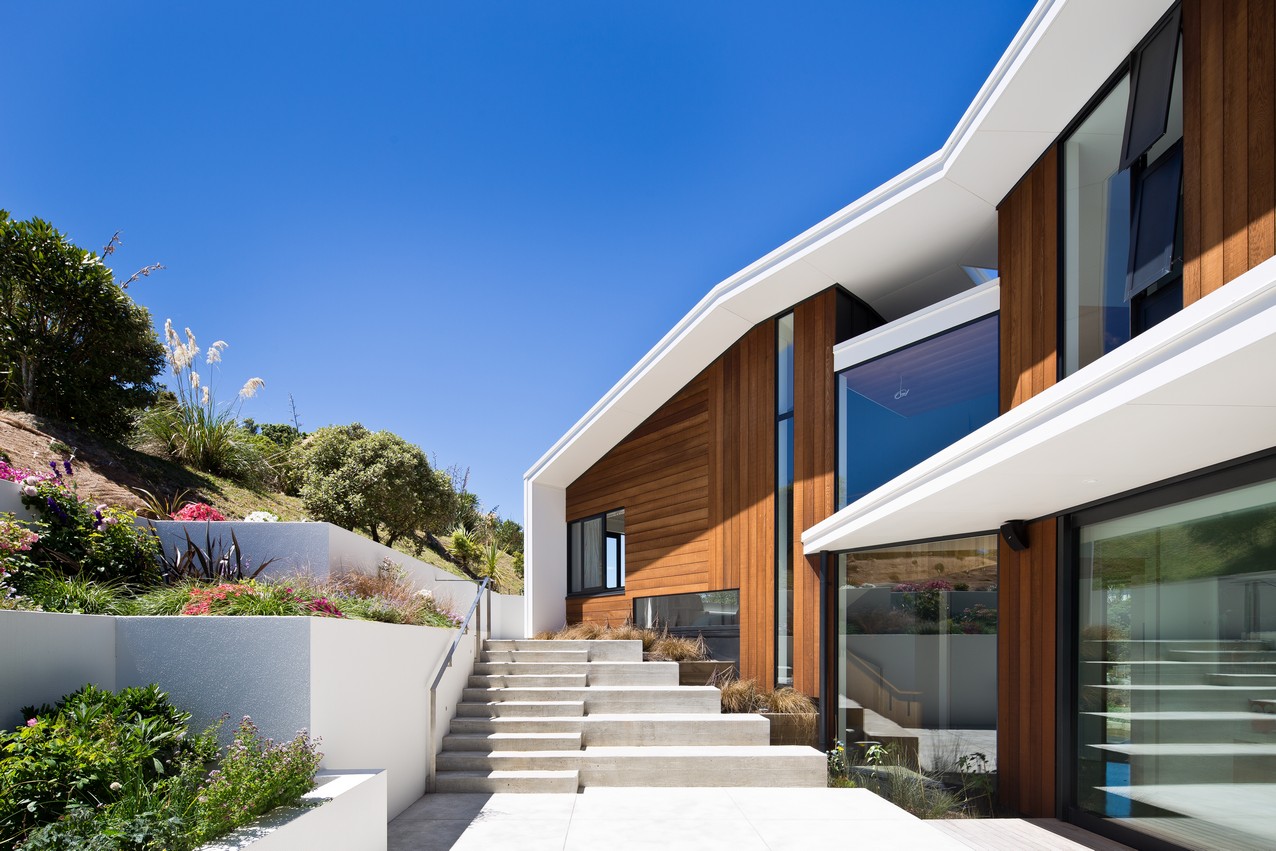 Clad in zinc, corrugated Colorsteel and cedar, this architecturally designed home in Lower Hutt exudes space and style. Wood elements and splashes of orange give the contemporary home a retro vibe.