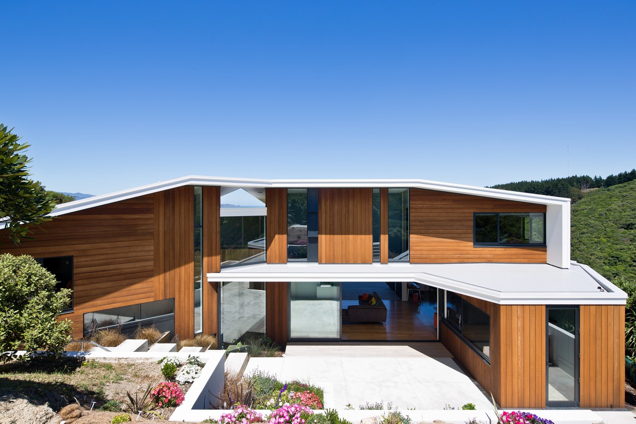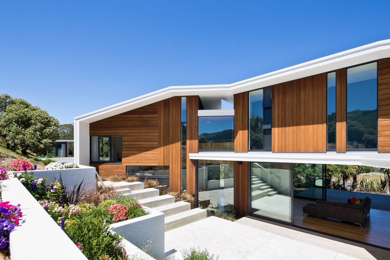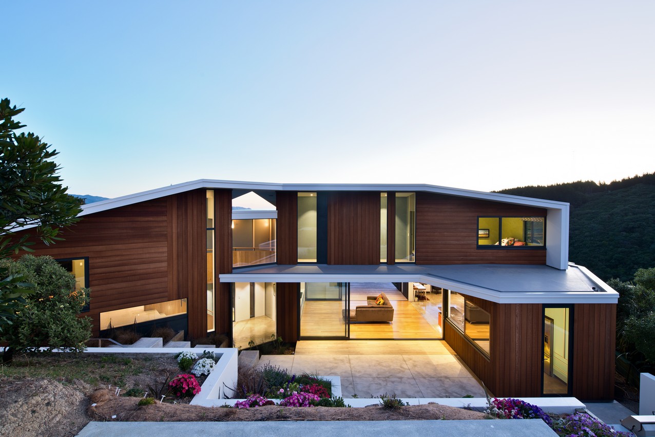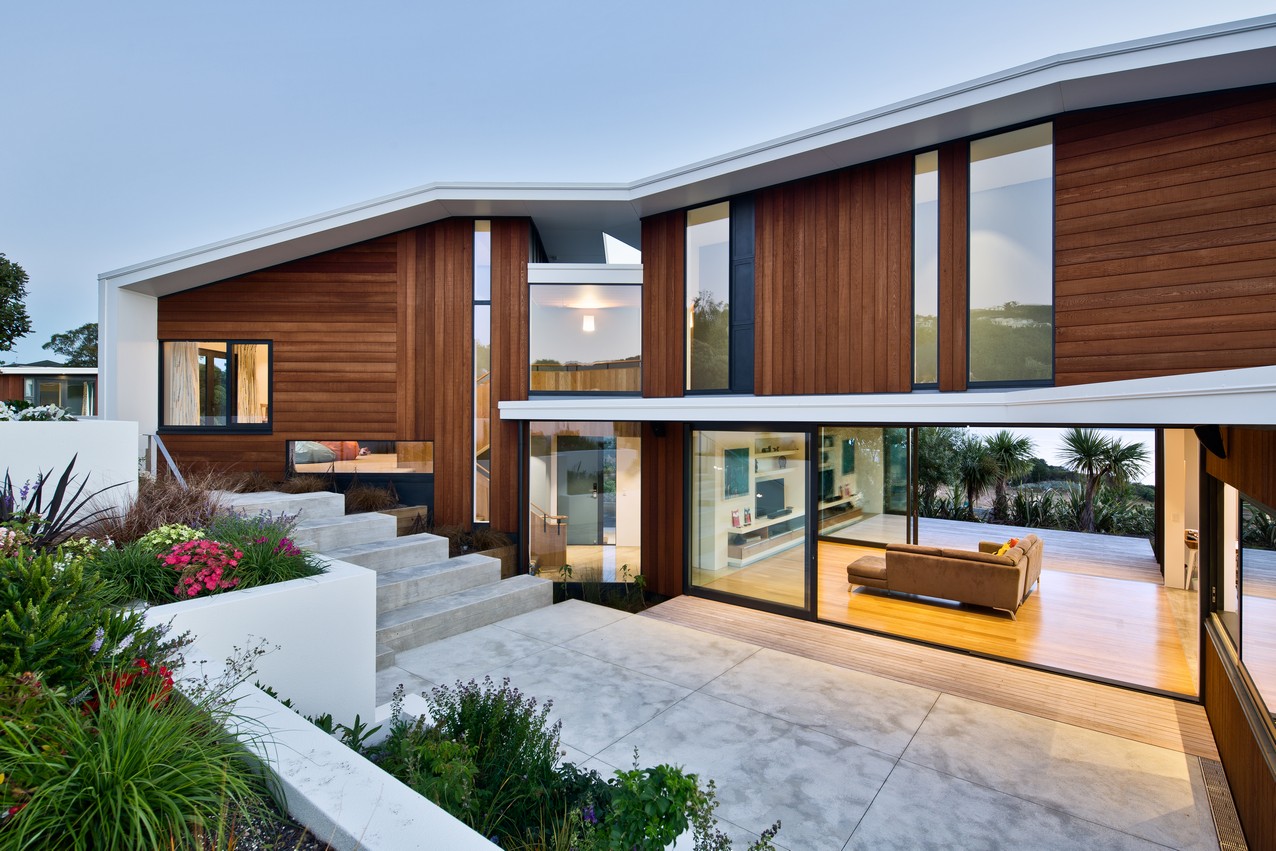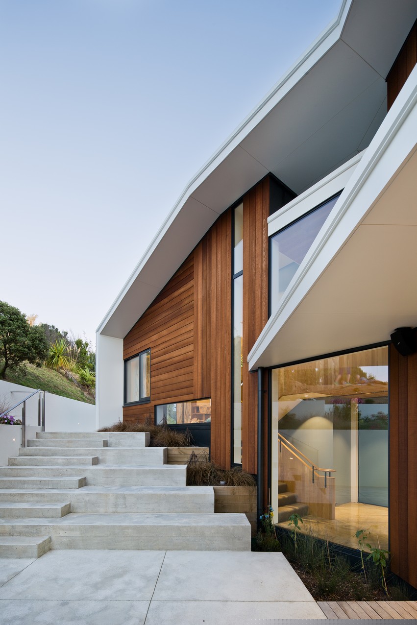 Clad in zinc, corrugated Colorsteel and cedar, this architecturally designed home in Lower Hutt exudes space and style. Wood elements and splashes of orange give the contemporary home a retro vibe.
