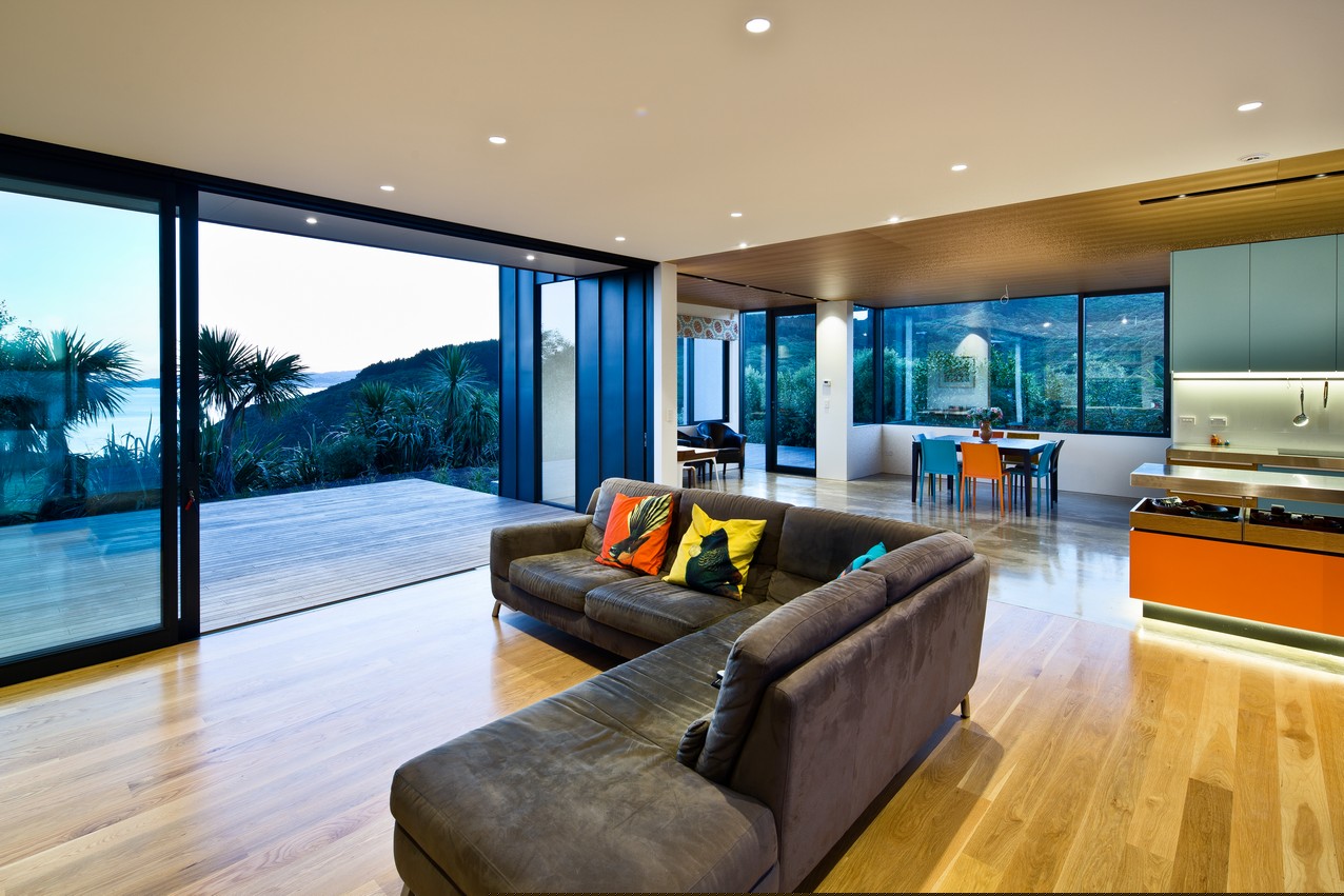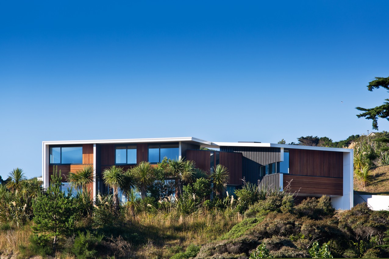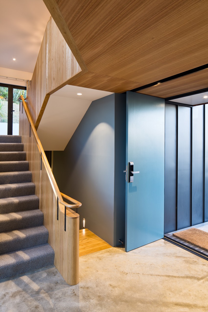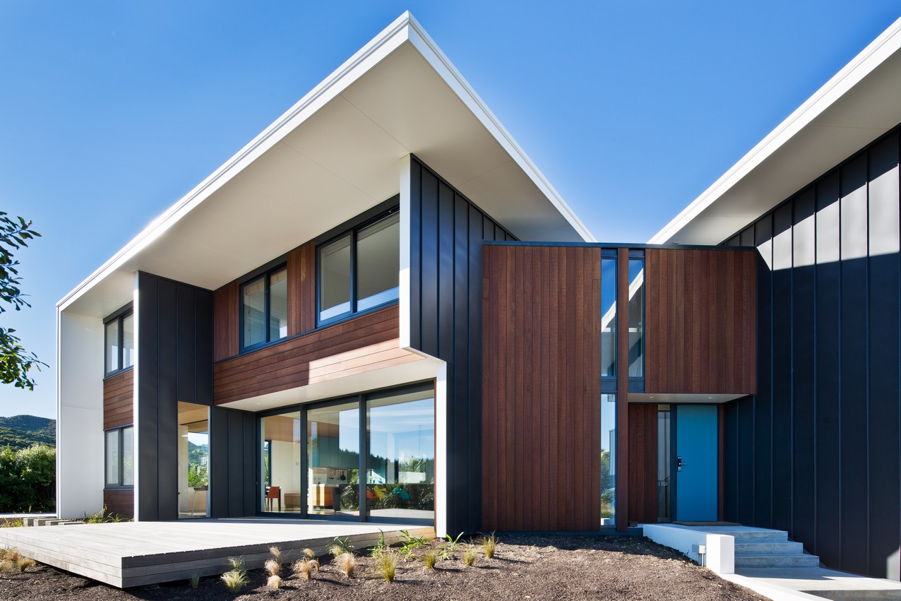 Clad in zinc, corrugated Colorsteel and cedar, this architecturally designed home in Lower Hutt exudes space and style. Wood elements and splashes of orange give the contemporary home a retro vibe.