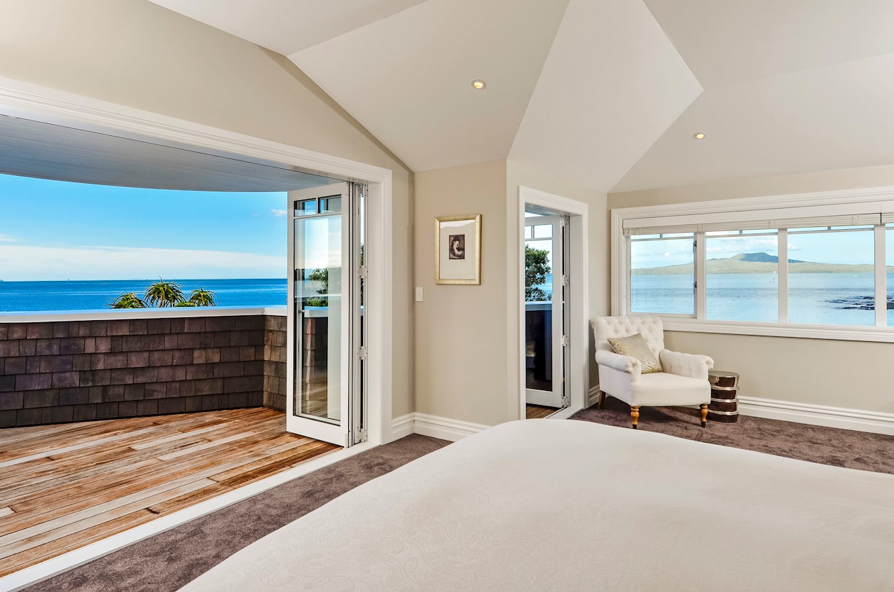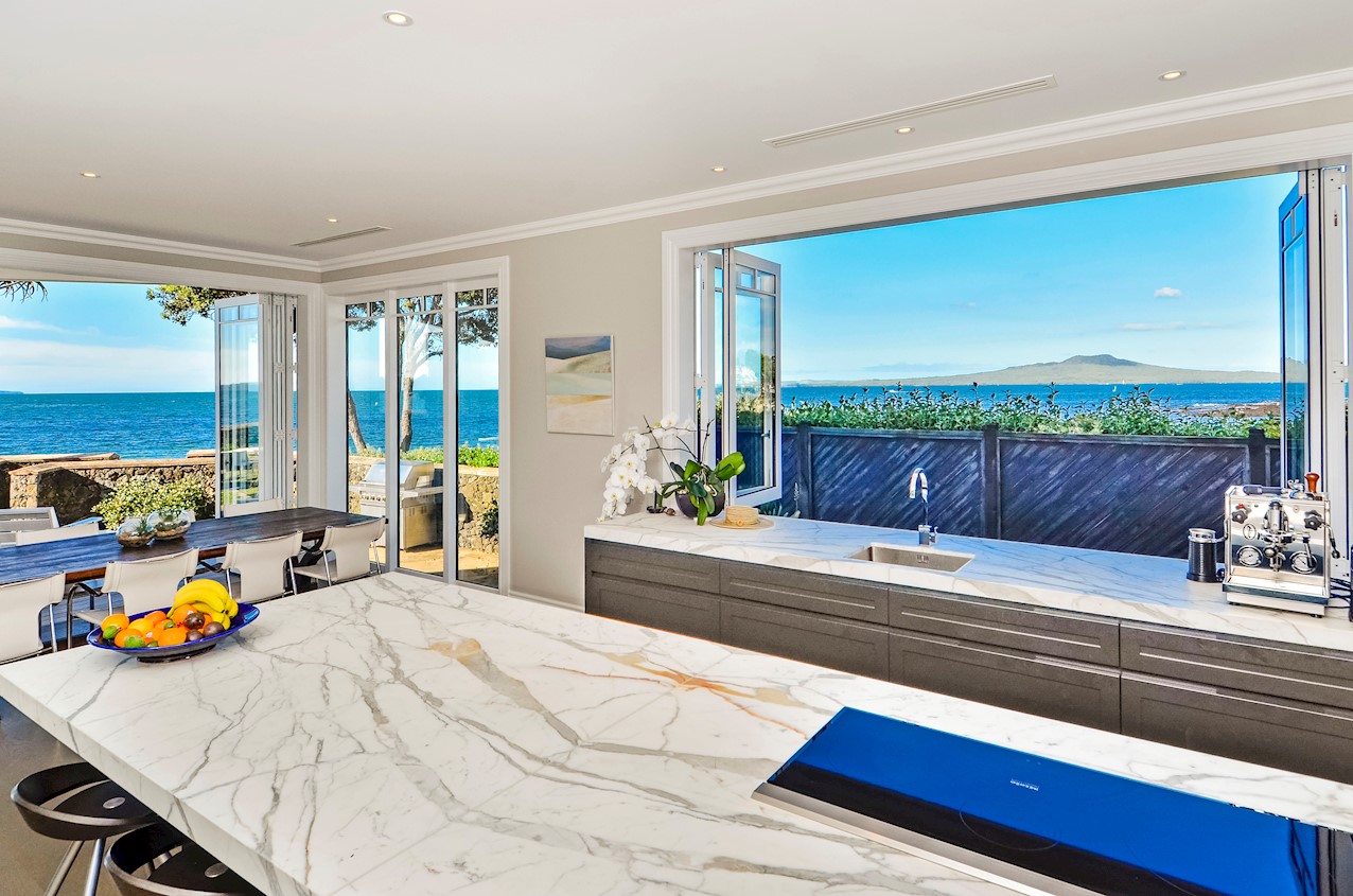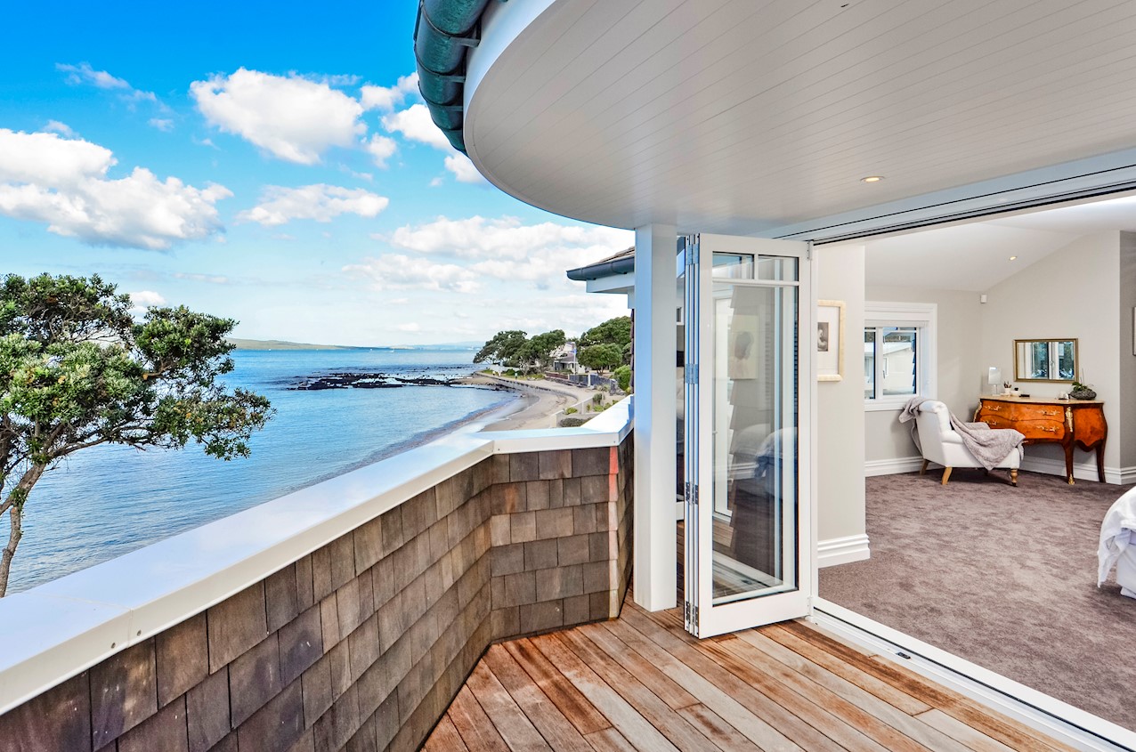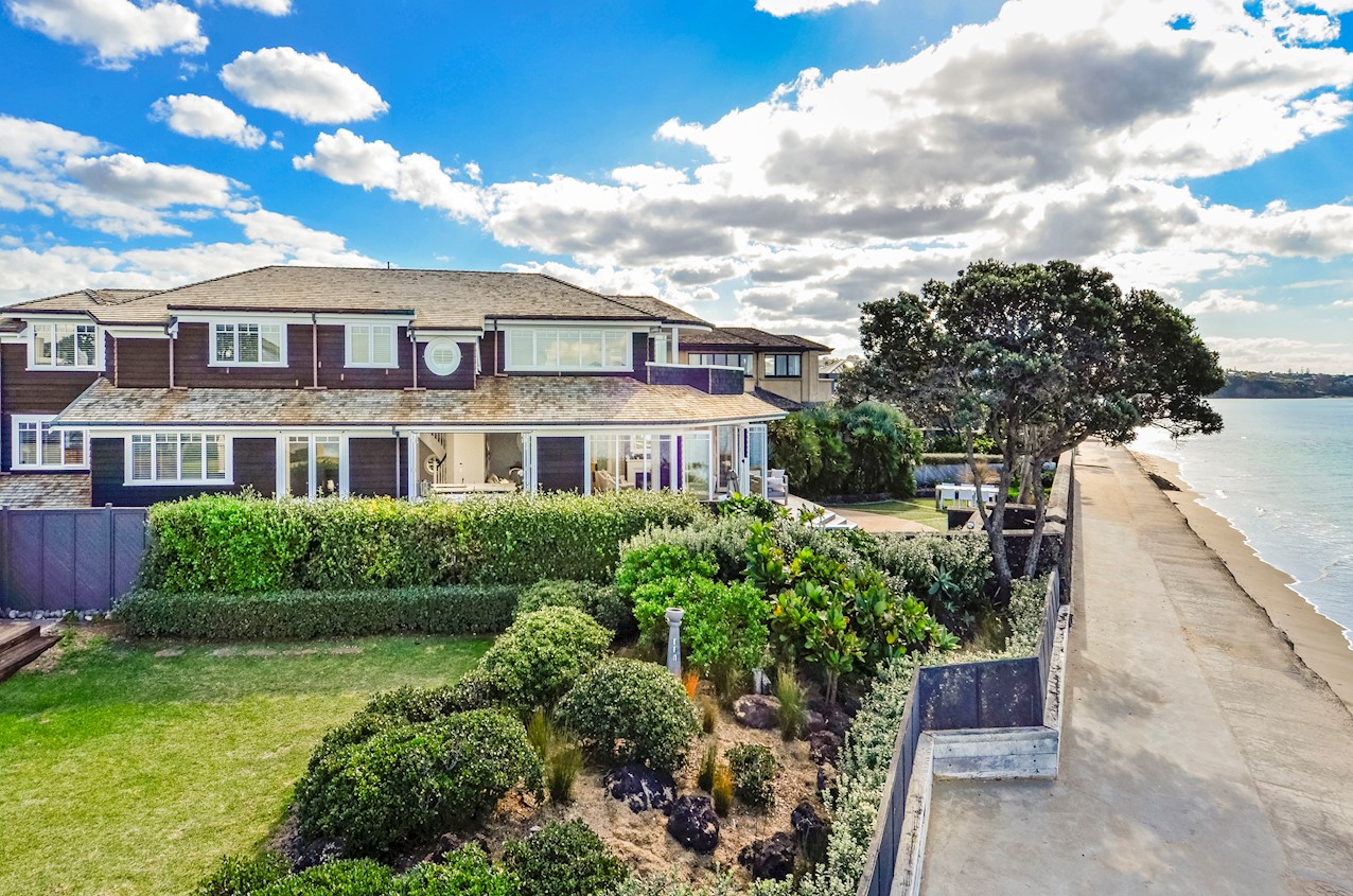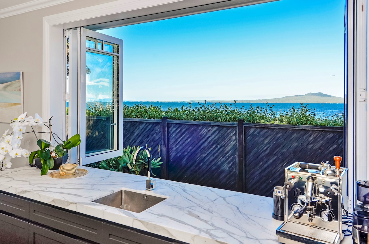 The remarkable renovation of this 454sqm Milford residence could more accurately be described as a reincarnation. No stone has been left unturned in transforming the beach-front home into a contemporary Cape Cod-style escape. Fragments of existing framing are all that remain of the former family home. Plaster cladding was stripped and switched for smart cedar weatherboards. Large decks gaze over the water. The new shingle roof caps things off nicely. The home’s many small rooms were demolished, with new structural beams installed to support a more open, flowing layout. That’s not to say there’s nowhere to retreat for peace and quiet. Five beautifully updated bedrooms easily accommodate residents and guests. Three exquisitely tiled bathrooms with walk-in glazed showers and freestanding bowl-shaped baths provide everyday luxury. A feature spiral staircase, ornate fireplaces and a state-of-the-art kitchen with marble benchtops are just a few more stunning features of this magnificent makeover.