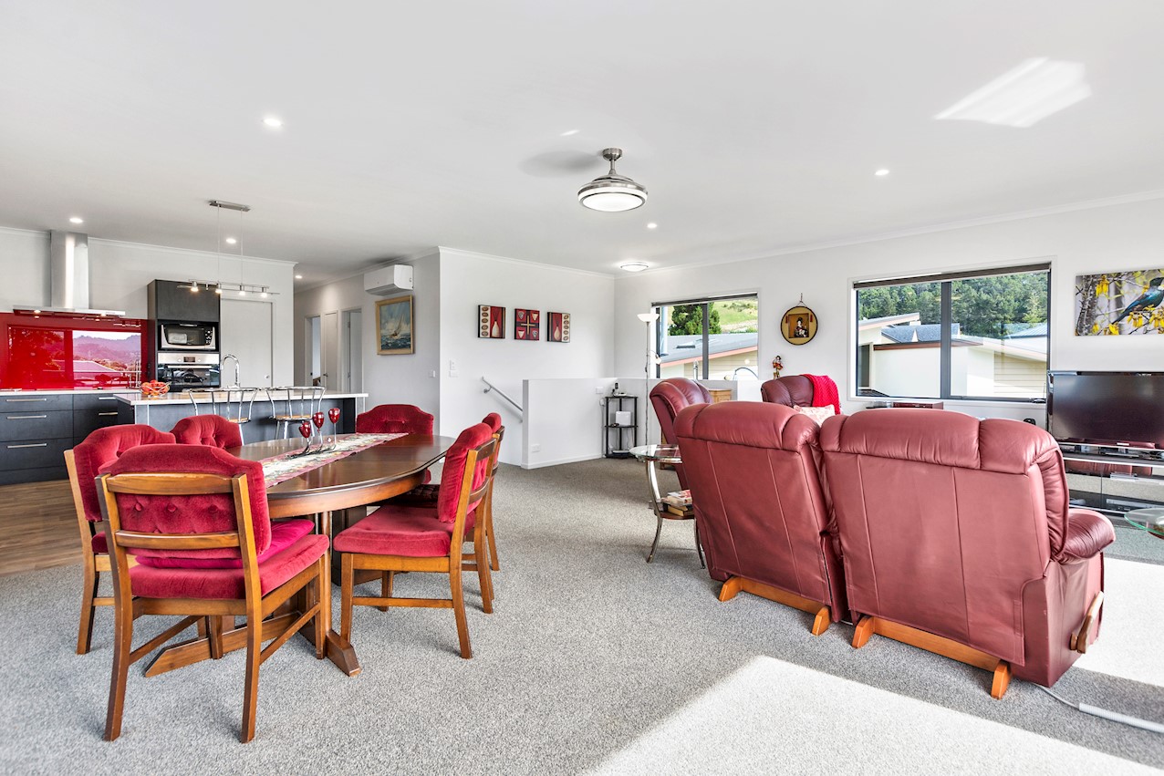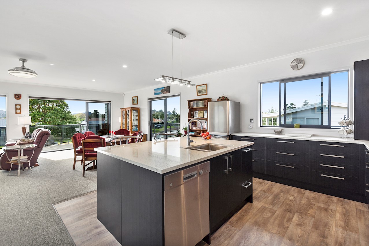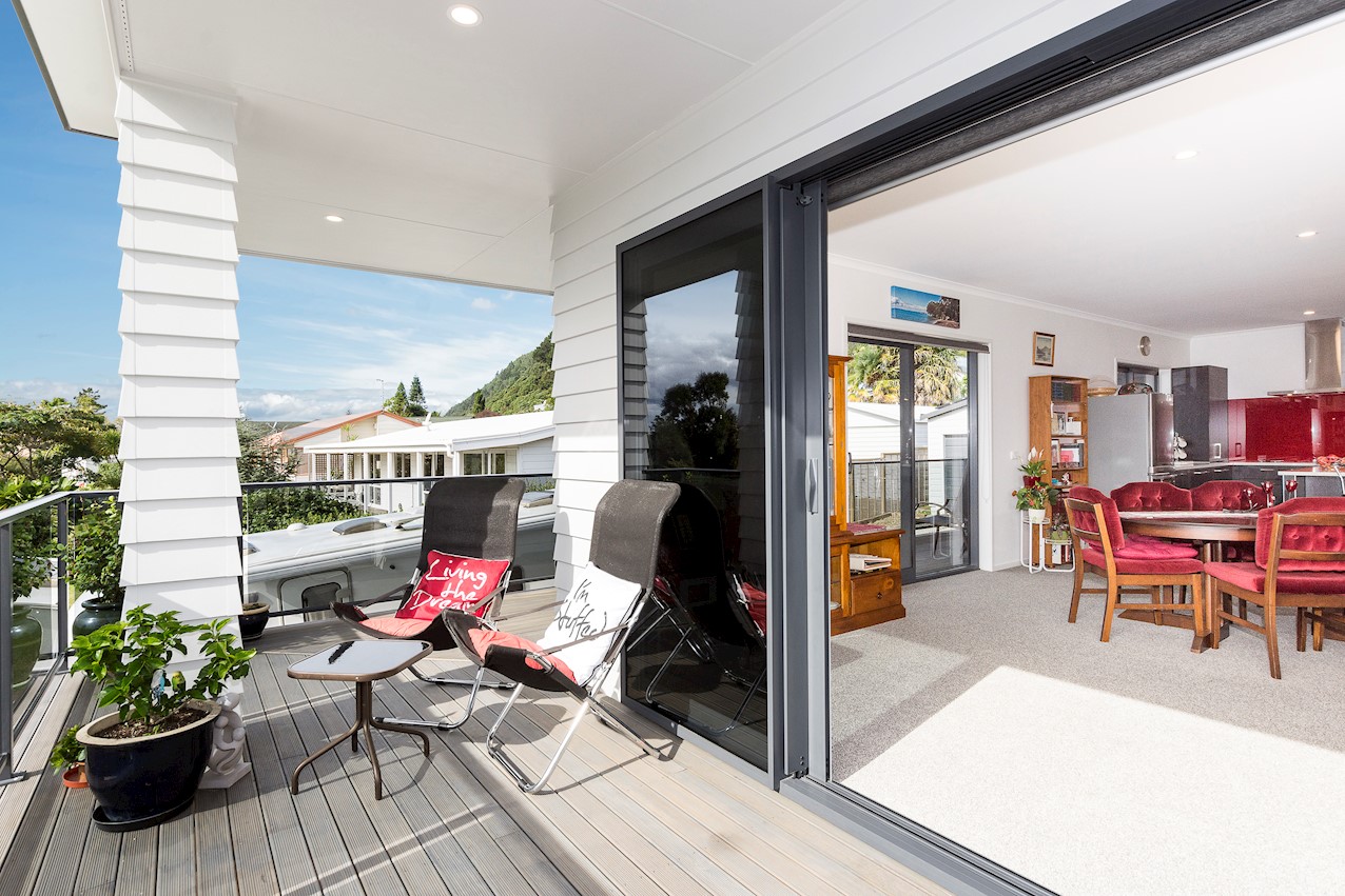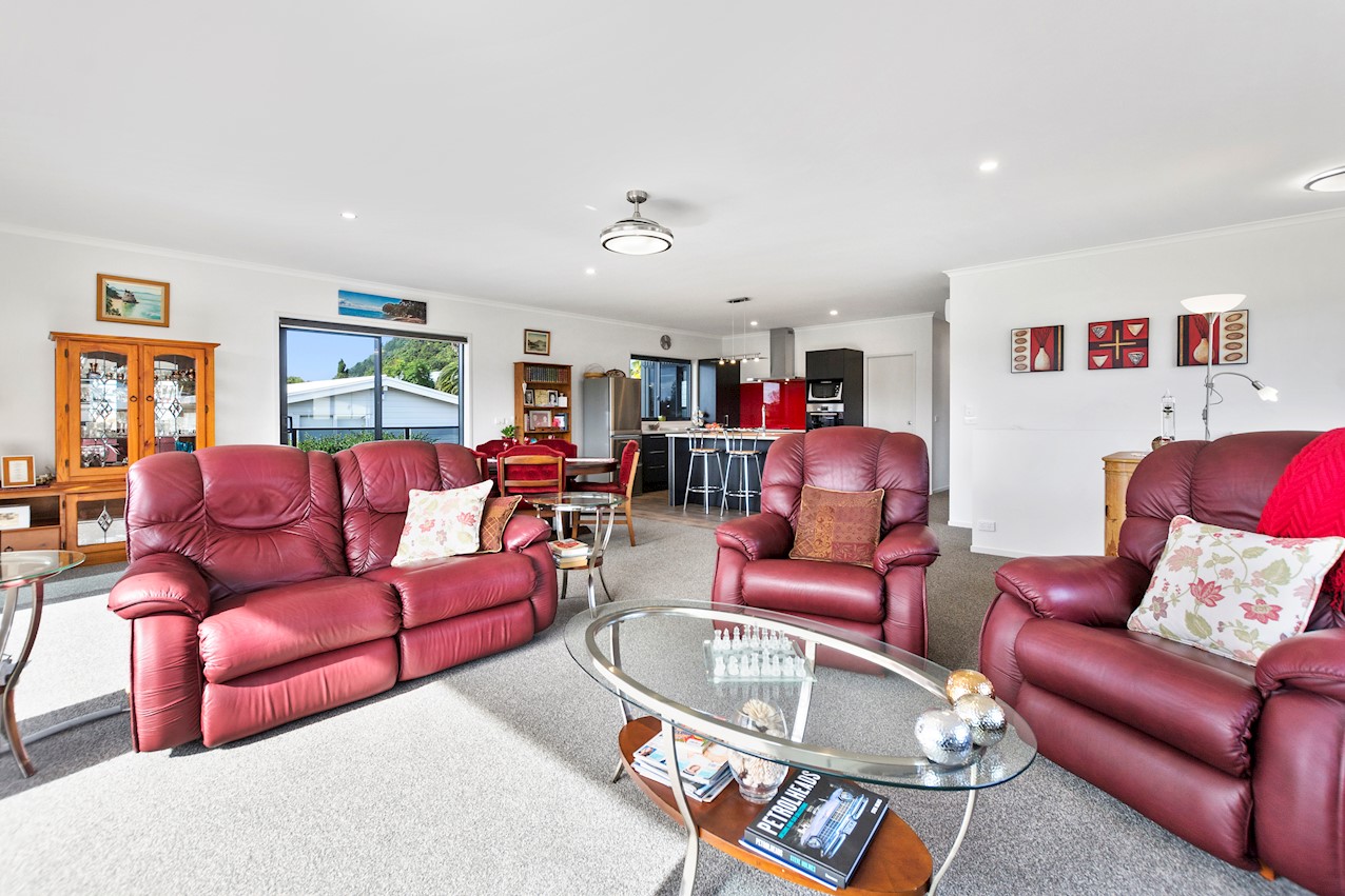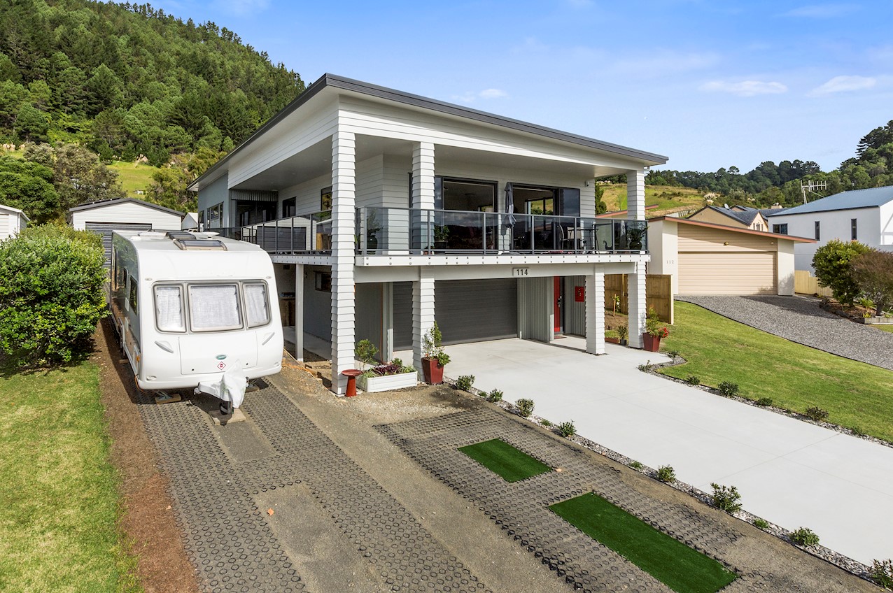 Life’s coasting along beautifully for the owners of this pleasant and super-practical Pauanui retirement pad. Light, bright Linea weatherboard and corrugated iron cladding add plenty of street appeal. The bright red front door provides a welcome introduction. Built over two storeys, the great-value three-bedroom, two-bathroom residence will easily accommodate family and friends. Open-plan living creates a wonderful hub for everyday enjoyment on the top floor. The kitchen boasts a walk-in pantry and a scarlet splashback – the cherry on top. The layout flows easily into other areas of the home. Loads of sunshine floods in through ample glazing. The overall feel is light and open. North-facing glass sliders enable a smooth transition between indoor and outdoor living. The sheltered upstairs alfresco area is a tempting space to put your feet up and enjoy the outlook at any time of the day. Downstairs, the large double garage also functions as a work space. All the boxes are ticked on a tight budget.