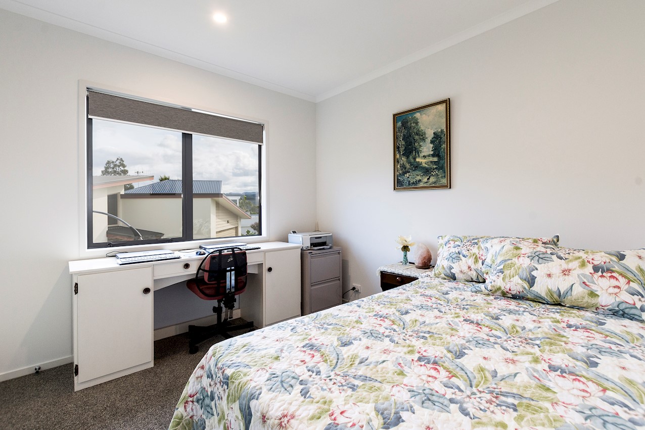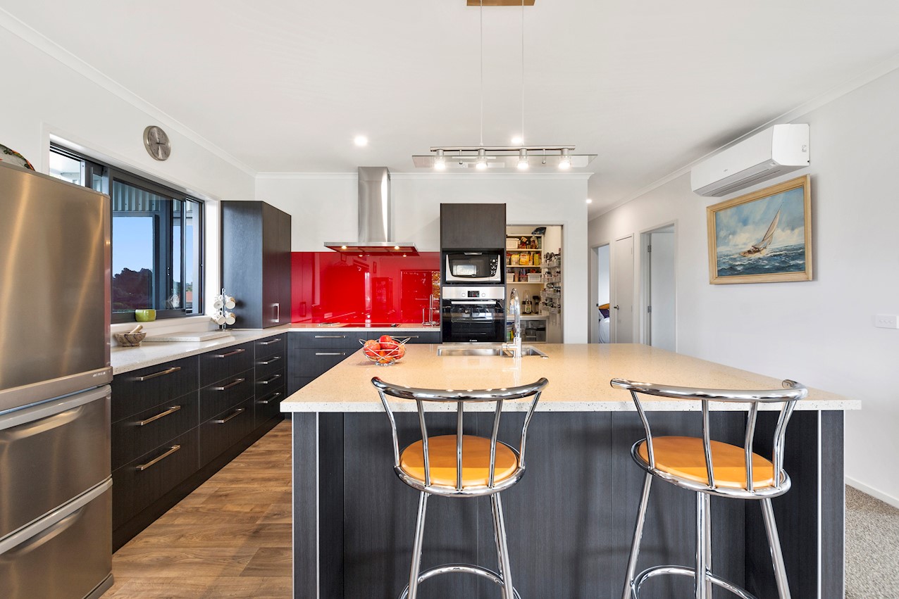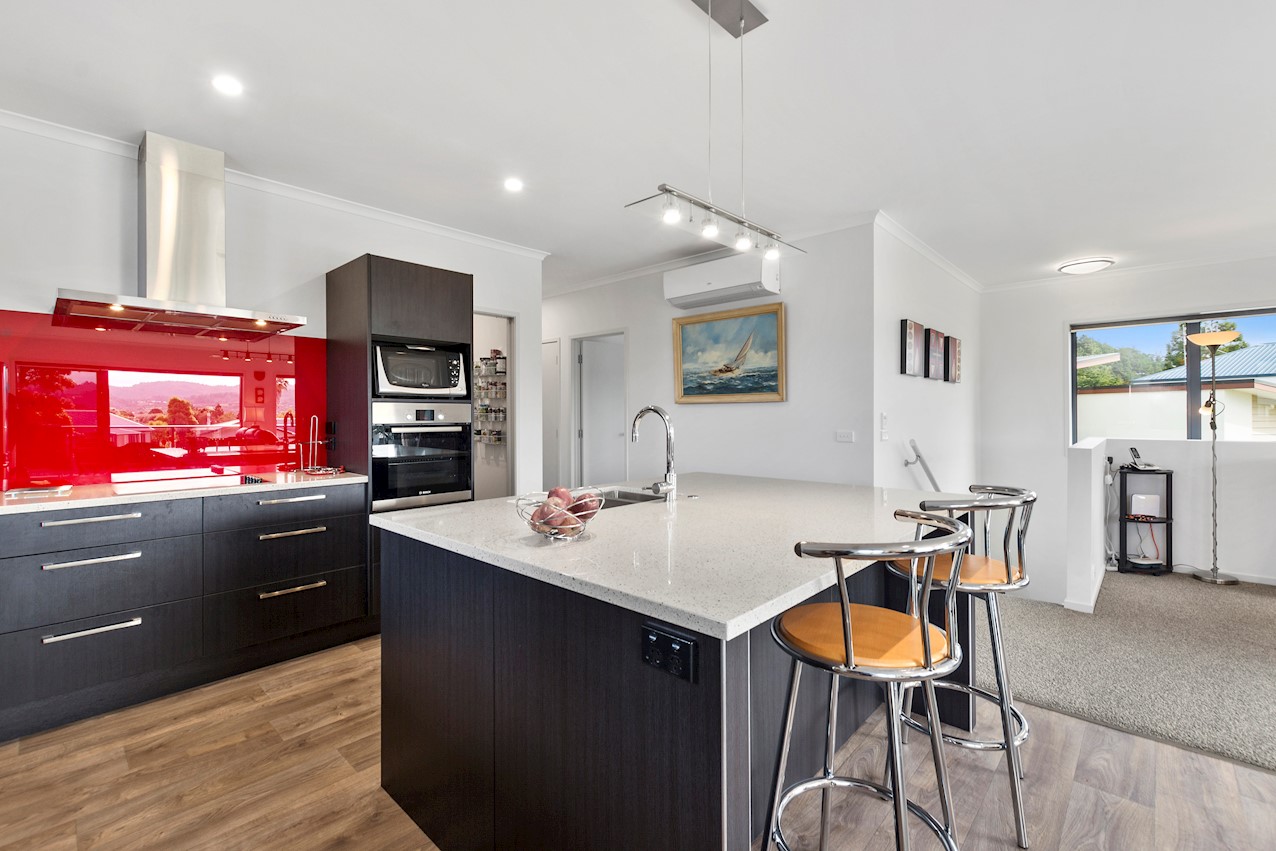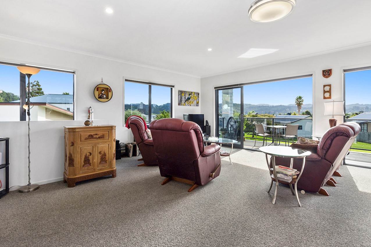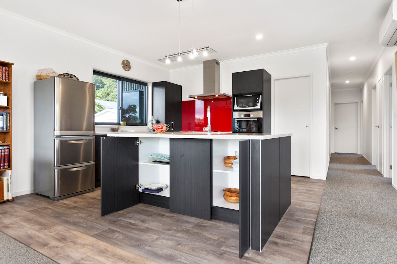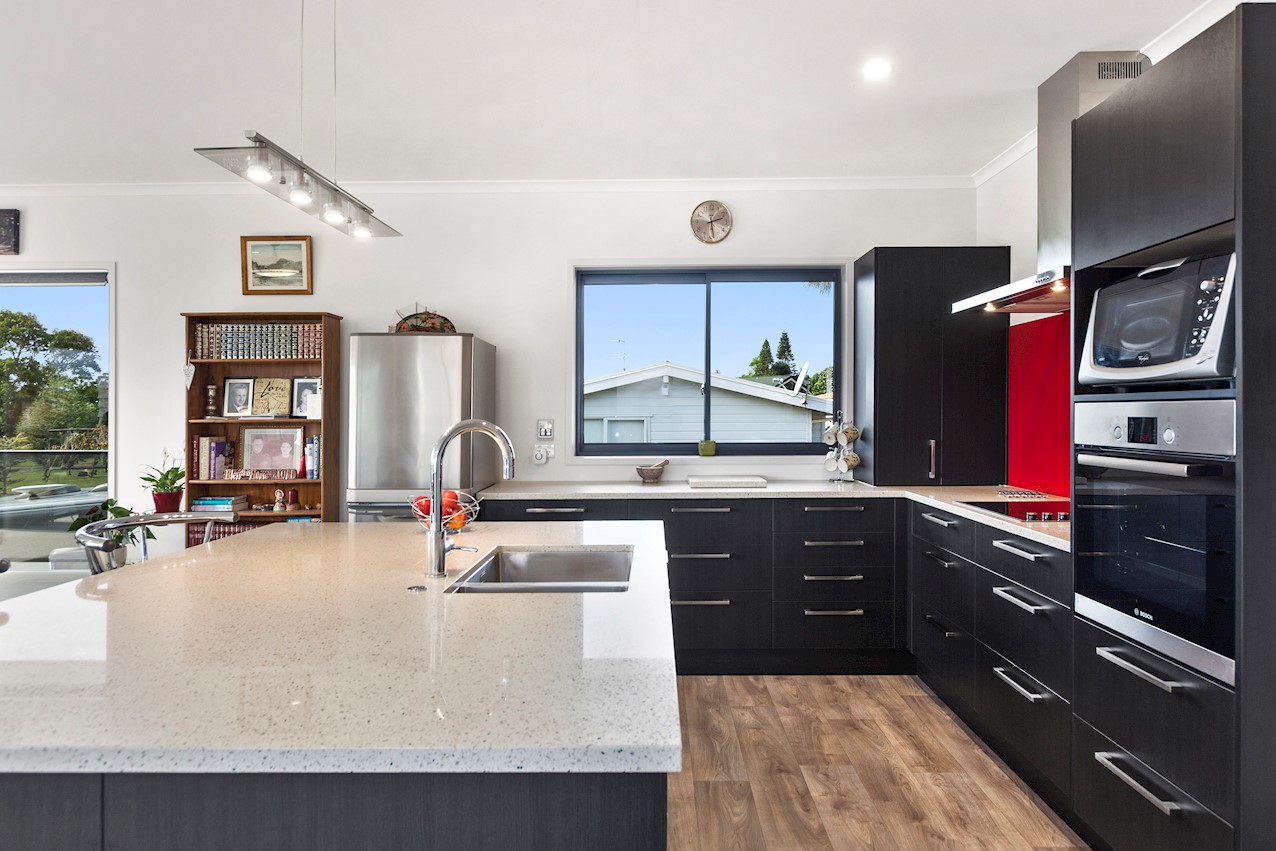 Life’s coasting along beautifully for the owners of this pleasant and super-practical Pauanui retirement pad. Light, bright Linea weatherboard and corrugated iron cladding add plenty of street appeal. The bright red front door provides a welcome introduction. Built over two storeys, the great-value three-bedroom, two-bathroom residence will easily accommodate family and friends. Open-plan living creates a wonderful hub for everyday enjoyment on the top floor. The kitchen boasts a walk-in pantry and a scarlet splashback – the cherry on top. The layout flows easily into other areas of the home. Loads of sunshine floods in through ample glazing. The overall feel is light and open. North-facing glass sliders enable a smooth transition between indoor and outdoor living. The sheltered upstairs alfresco area is a tempting space to put your feet up and enjoy the outlook at any time of the day. Downstairs, the large double garage also functions as a work space. All the boxes are ticked on a tight budget.