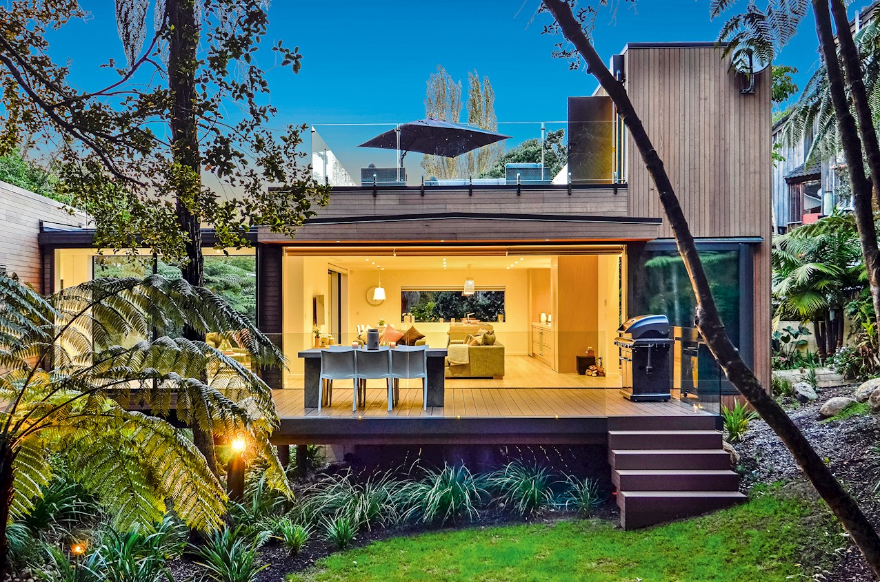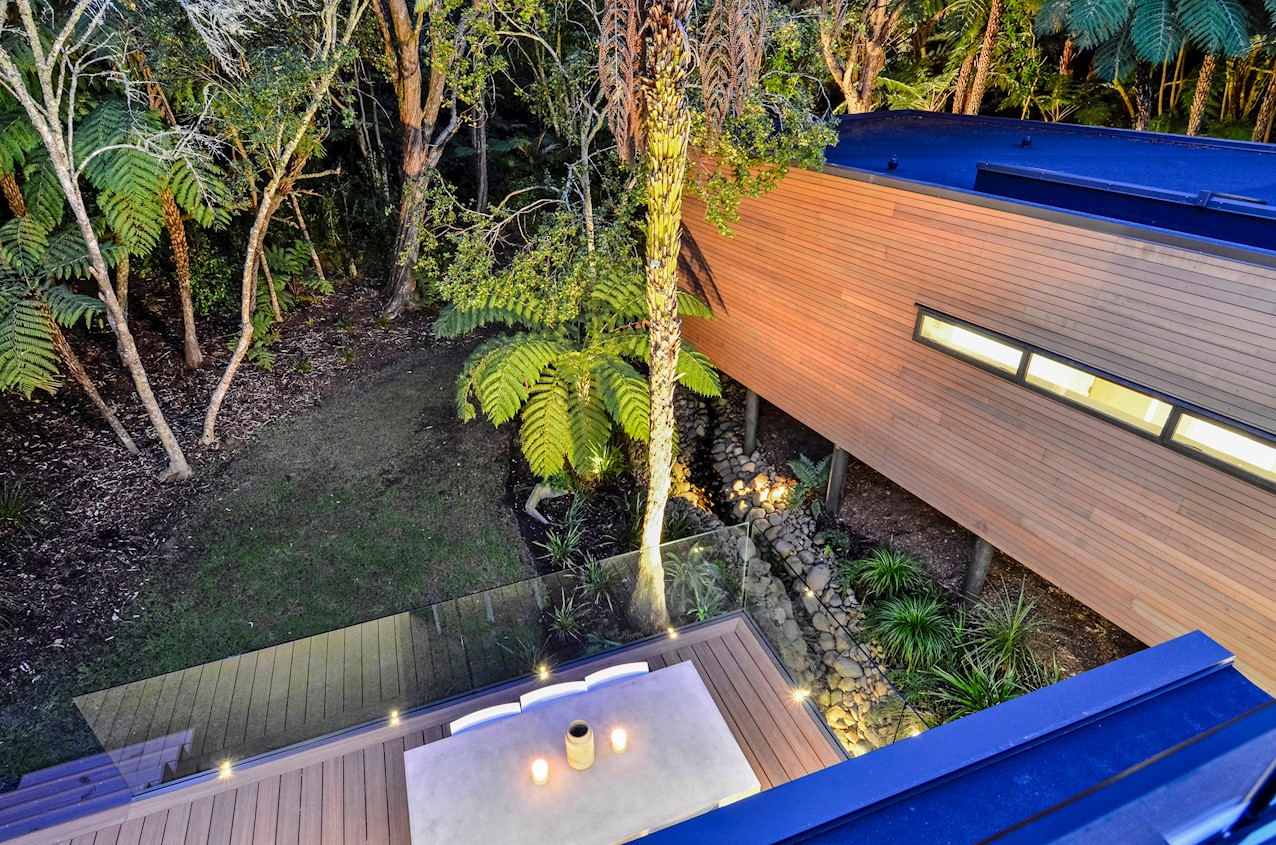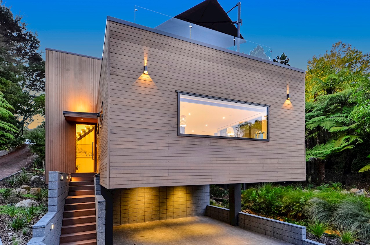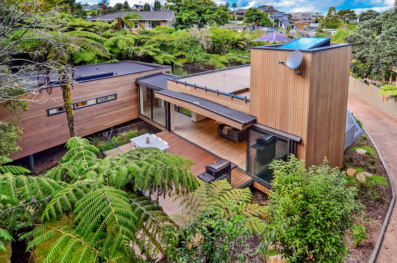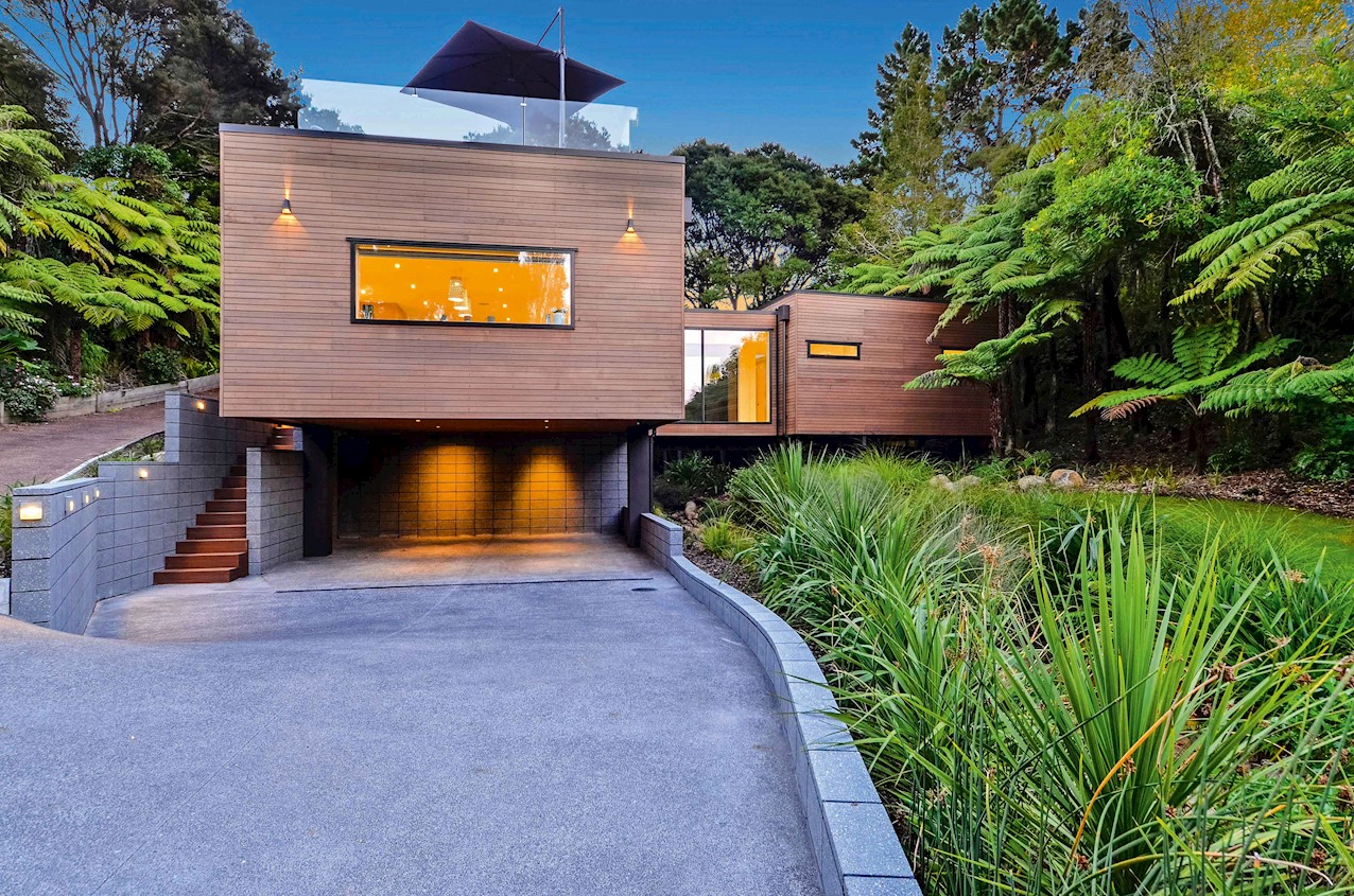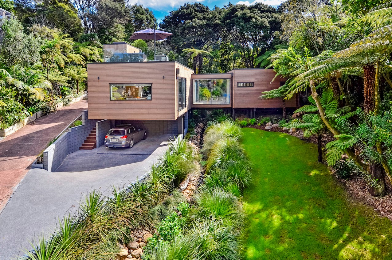 This Castor Bay beauty is the first home in Auckland to be built with Formance Structural Insulated Panels (SIPs). And after word gets out about the finished product, it’s hard to imagine it will be the last. Elegantly understated box-like forms appear to hover above the ground. Established native bush provides a tranquil and immersive setting, allowing the structure to nestle harmoniously into its surrounds. The beautifully textured exterior can be appreciated from inside, too. A glazed bridge draws in the sun and links the living and sleeping wings. Light timber flooring keeps the interior bright and luxurious, and there’s carpet for quiet in the sleeping spaces. The three peaceful bedrooms are serviced by two tiled bathrooms. The living area and entertainer’s kitchen flow to a glazed deck with barbecue. Positioned up the floating feature staircase, a superb roof deck with spa pool perfectly caps off this contemporary abode. Parking is neatly tucked away under the cantilevered living area. The 180sqm footprint is cleverly utilised.