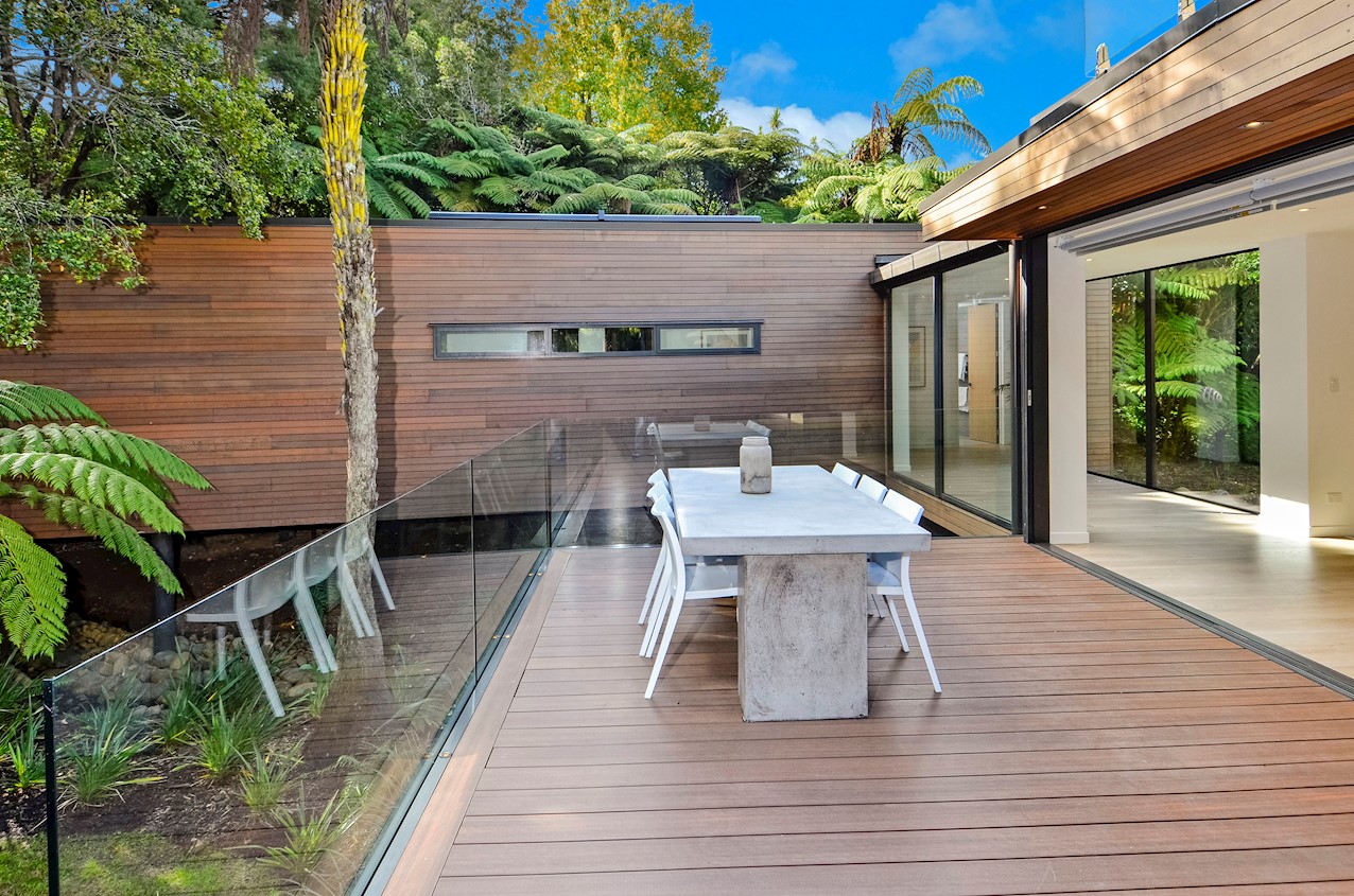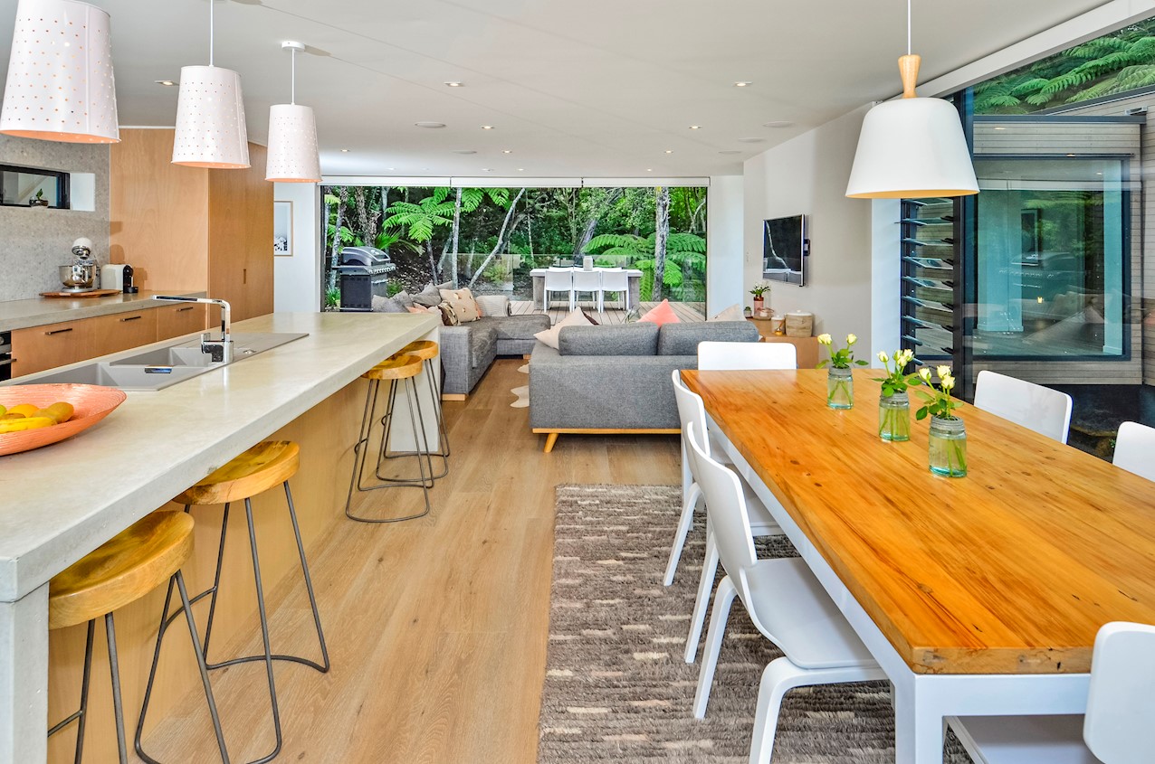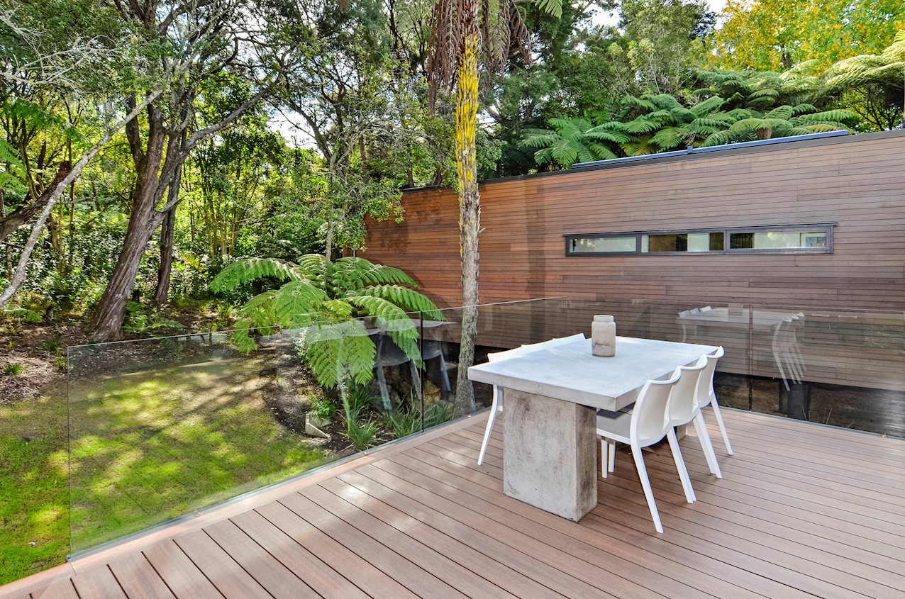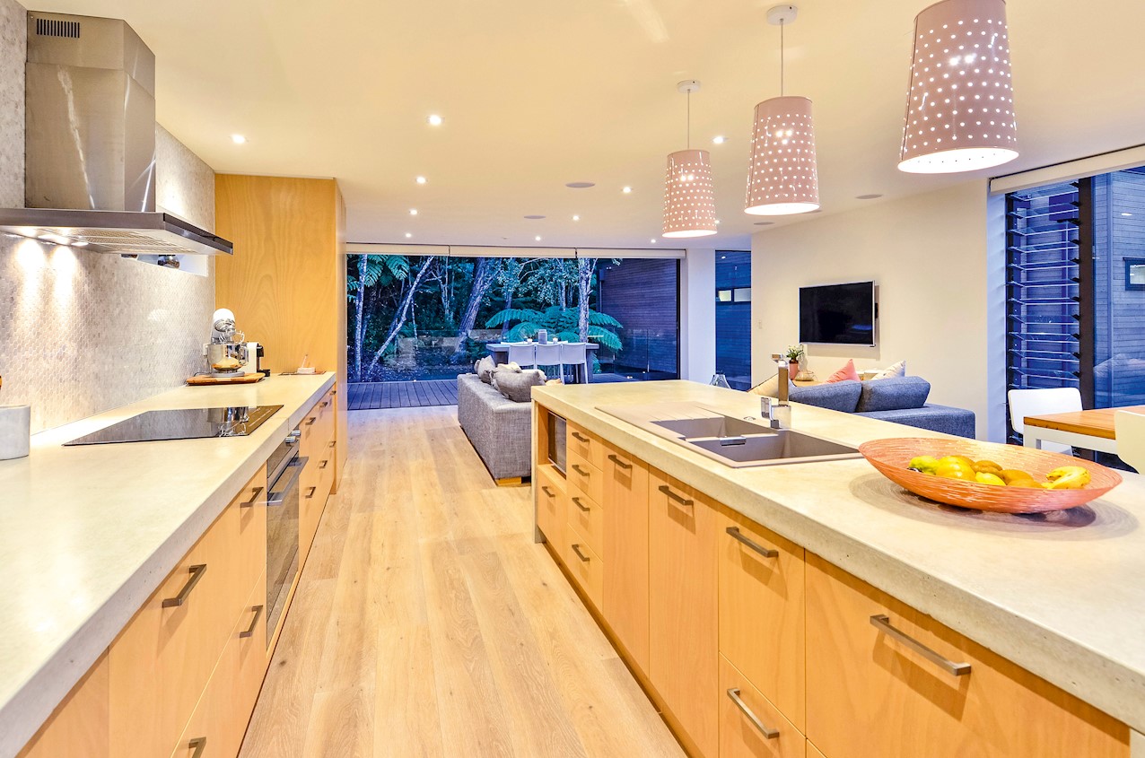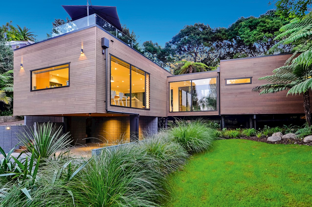 This Castor Bay beauty is the first home in Auckland to be built with Formance Structural Insulated Panels (SIPs). And after word gets out about the finished product, it’s hard to imagine it will be the last. Elegantly understated box-like forms appear to hover above the ground. Established native bush provides a tranquil and immersive setting, allowing the structure to nestle harmoniously into its surrounds. The beautifully textured exterior can be appreciated from inside, too. A glazed bridge draws in the sun and links the living and sleeping wings. Light timber flooring keeps the interior bright and luxurious, and there’s carpet for quiet in the sleeping spaces. The three peaceful bedrooms are serviced by two tiled bathrooms. The living area and entertainer’s kitchen flow to a glazed deck with barbecue. Positioned up the floating feature staircase, a superb roof deck with spa pool perfectly caps off this contemporary abode. Parking is neatly tucked away under the cantilevered living area. The 180sqm footprint is cleverly utilised.
