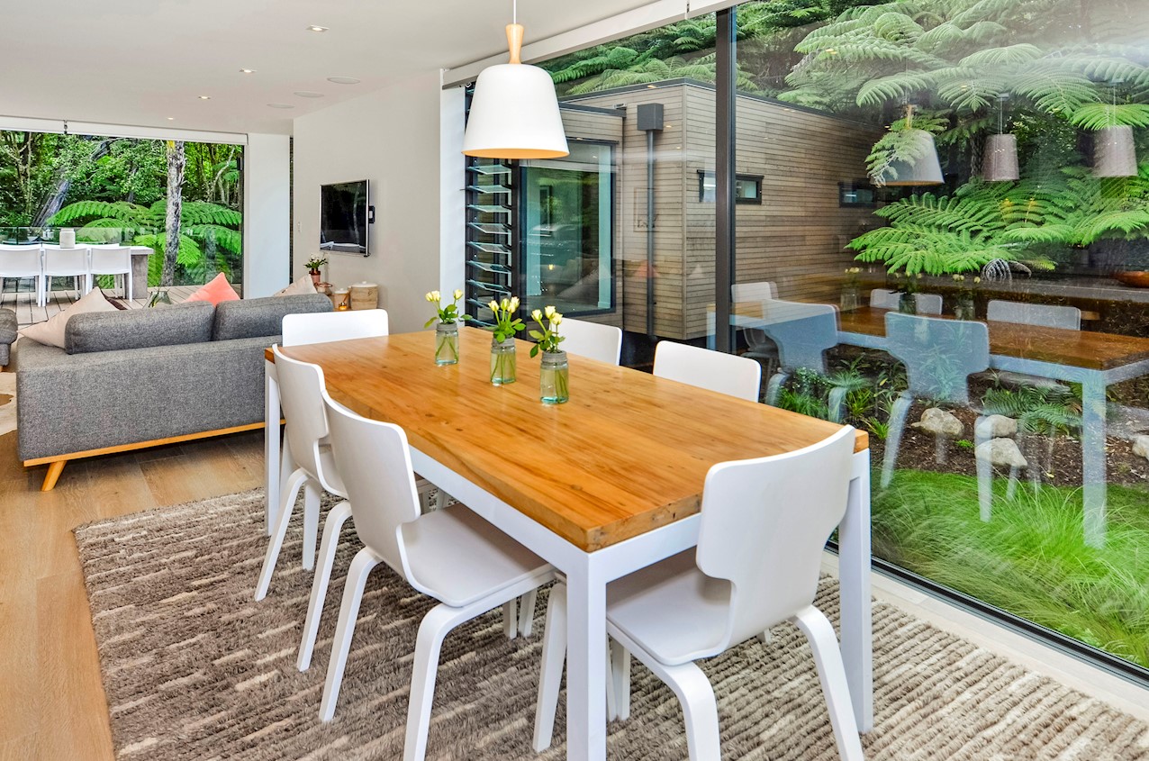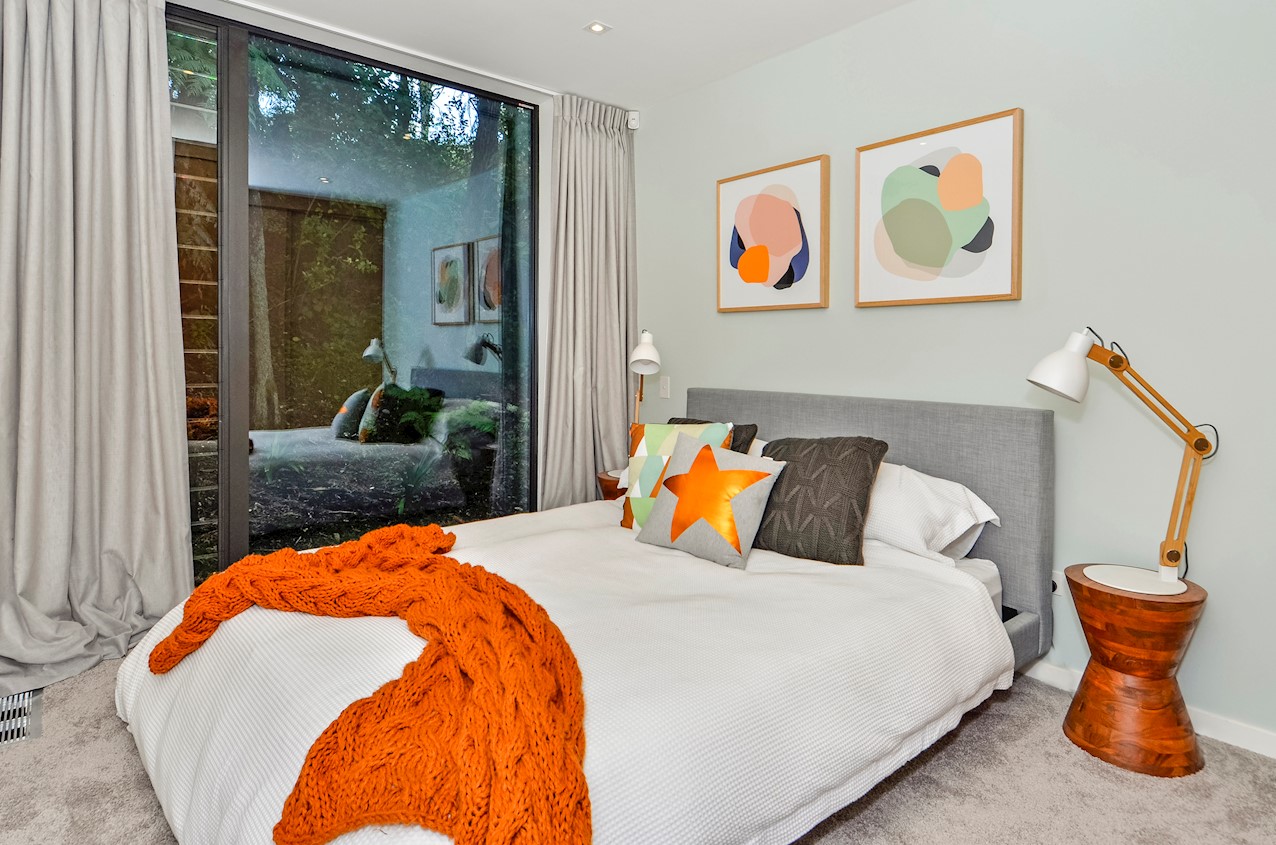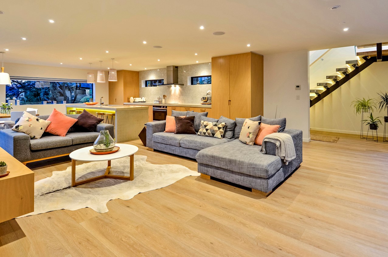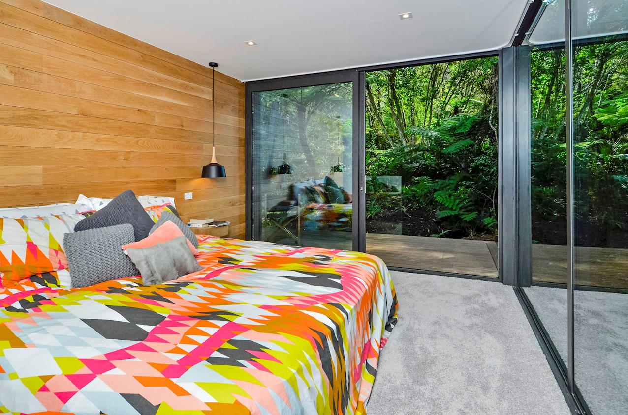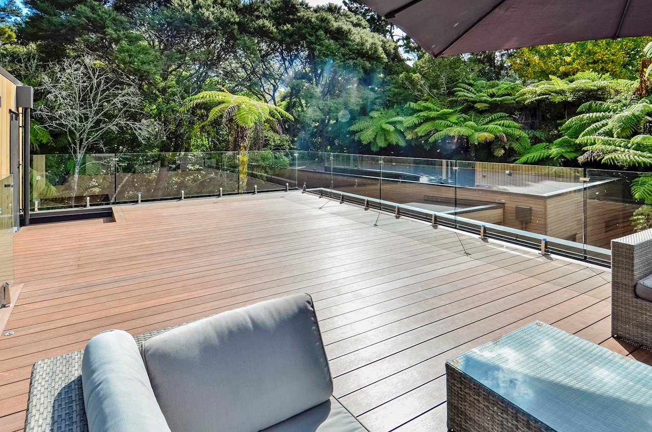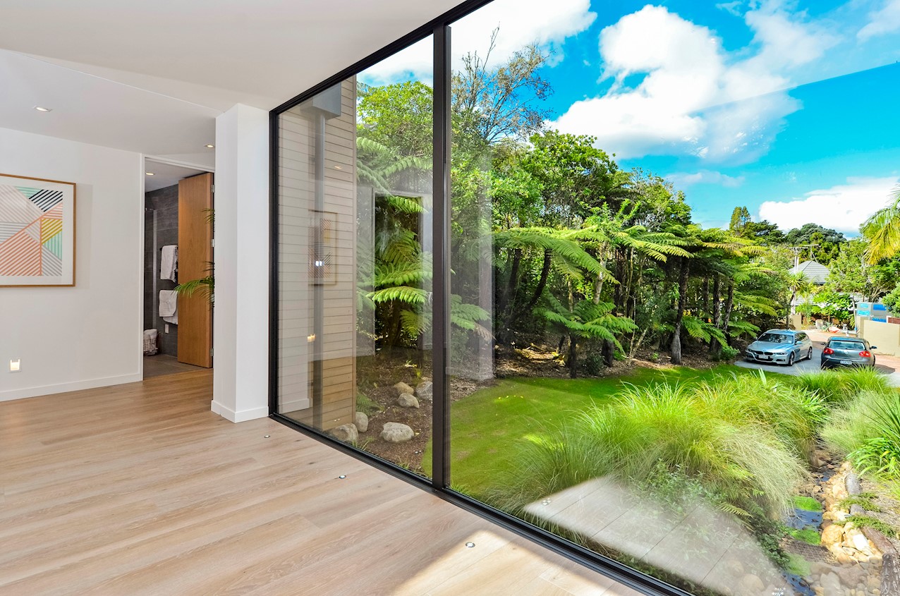 This Castor Bay beauty is the first home in Auckland to be built with Formance Structural Insulated Panels (SIPs). And after word gets out about the finished product, it’s hard to imagine it will be the last. Elegantly understated box-like forms appear to hover above the ground. Established native bush provides a tranquil and immersive setting, allowing the structure to nestle harmoniously into its surrounds. The beautifully textured exterior can be appreciated from inside, too. A glazed bridge draws in the sun and links the living and sleeping wings. Light timber flooring keeps the interior bright and luxurious, and there’s carpet for quiet in the sleeping spaces. The three peaceful bedrooms are serviced by two tiled bathrooms. The living area and entertainer’s kitchen flow to a glazed deck with barbecue. Positioned up the floating feature staircase, a superb roof deck with spa pool perfectly caps off this contemporary abode. Parking is neatly tucked away under the cantilevered living area. The 180sqm footprint is cleverly utilised.