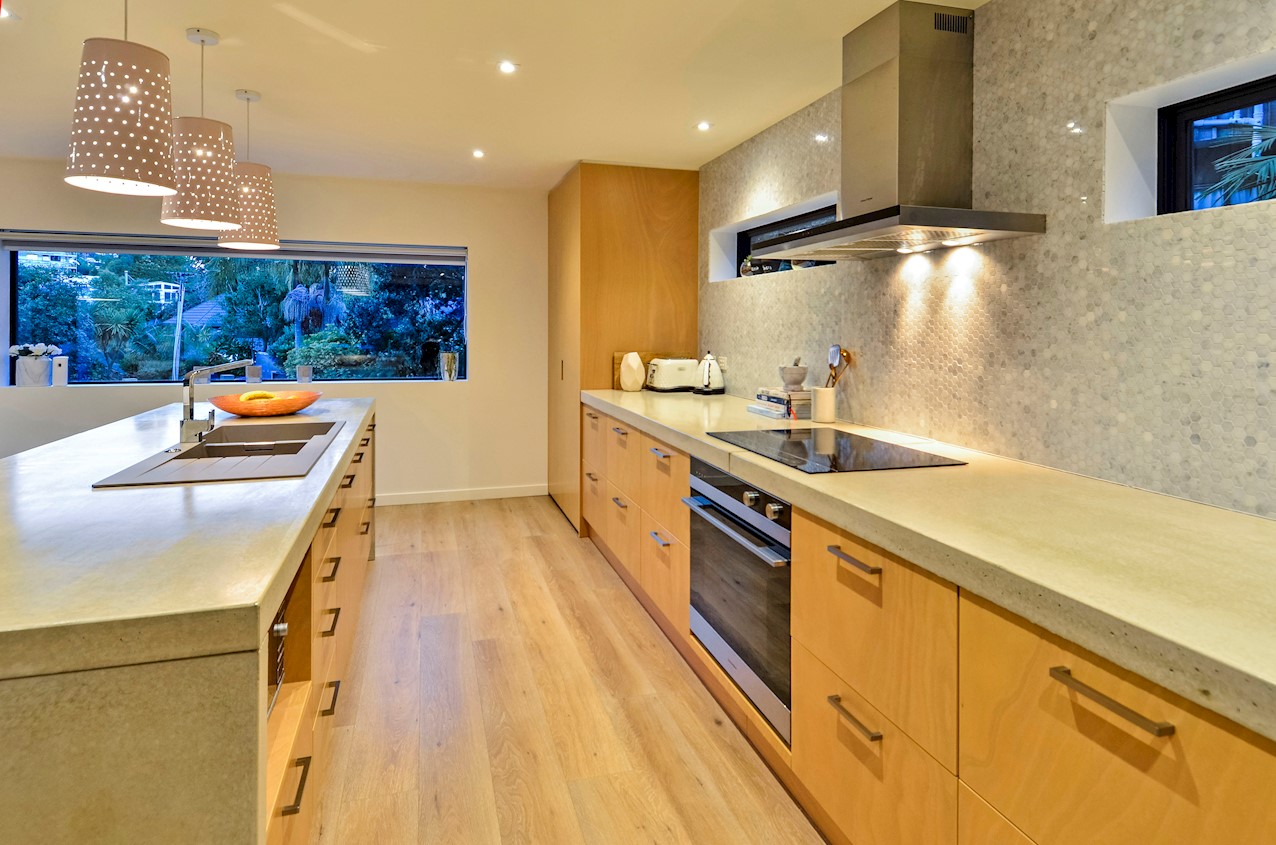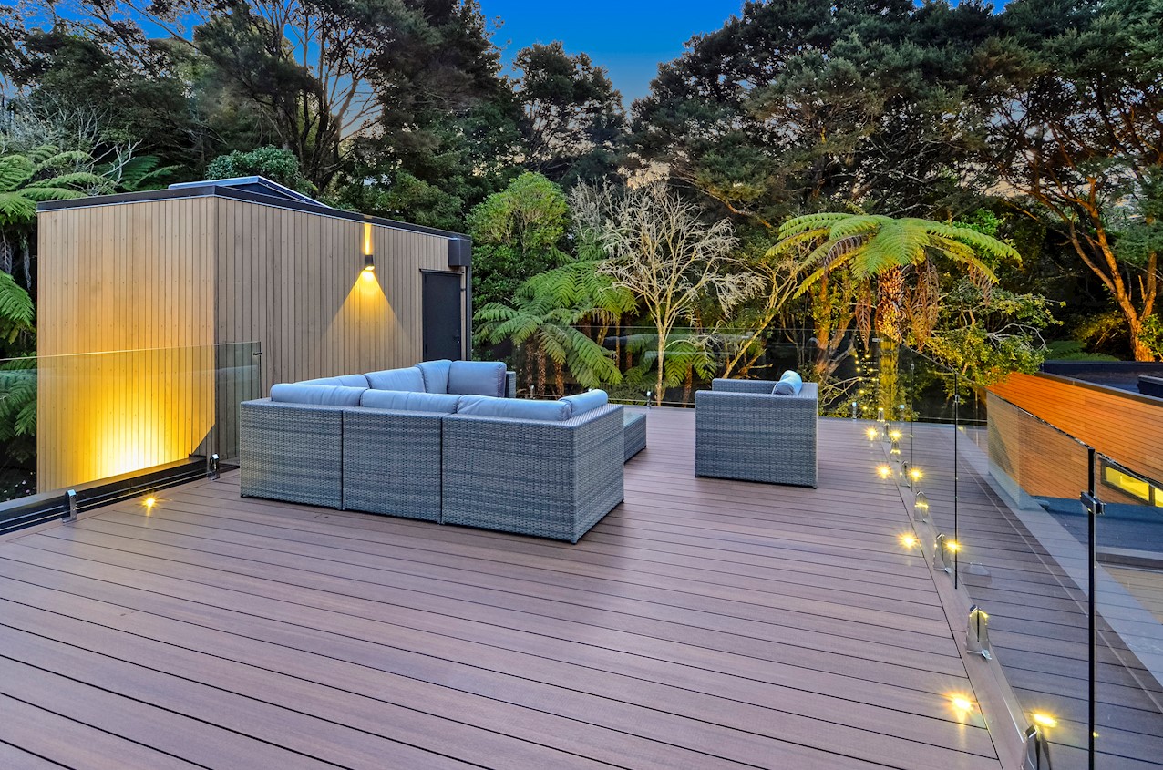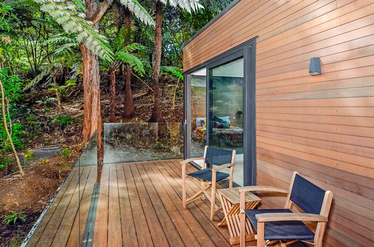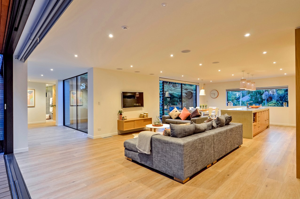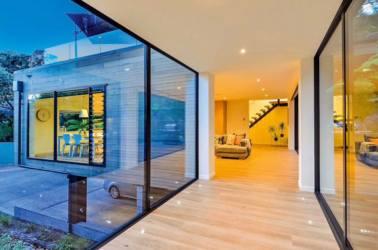 This Castor Bay beauty is the first home in Auckland to be built with Formance Structural Insulated Panels (SIPs). And after word gets out about the finished product, it’s hard to imagine it will be the last. Elegantly understated box-like forms appear to hover above the ground. Established native bush provides a tranquil and immersive setting, allowing the structure to nestle harmoniously into its surrounds. The beautifully textured exterior can be appreciated from inside, too. A glazed bridge draws in the sun and links the living and sleeping wings. Light timber flooring keeps the interior bright and luxurious, and there’s carpet for quiet in the sleeping spaces. The three peaceful bedrooms are serviced by two tiled bathrooms. The living area and entertainer’s kitchen flow to a glazed deck with barbecue. Positioned up the floating feature staircase, a superb roof deck with spa pool perfectly caps off this contemporary abode. Parking is neatly tucked away under the cantilevered living area. The 180sqm footprint is cleverly utilised.