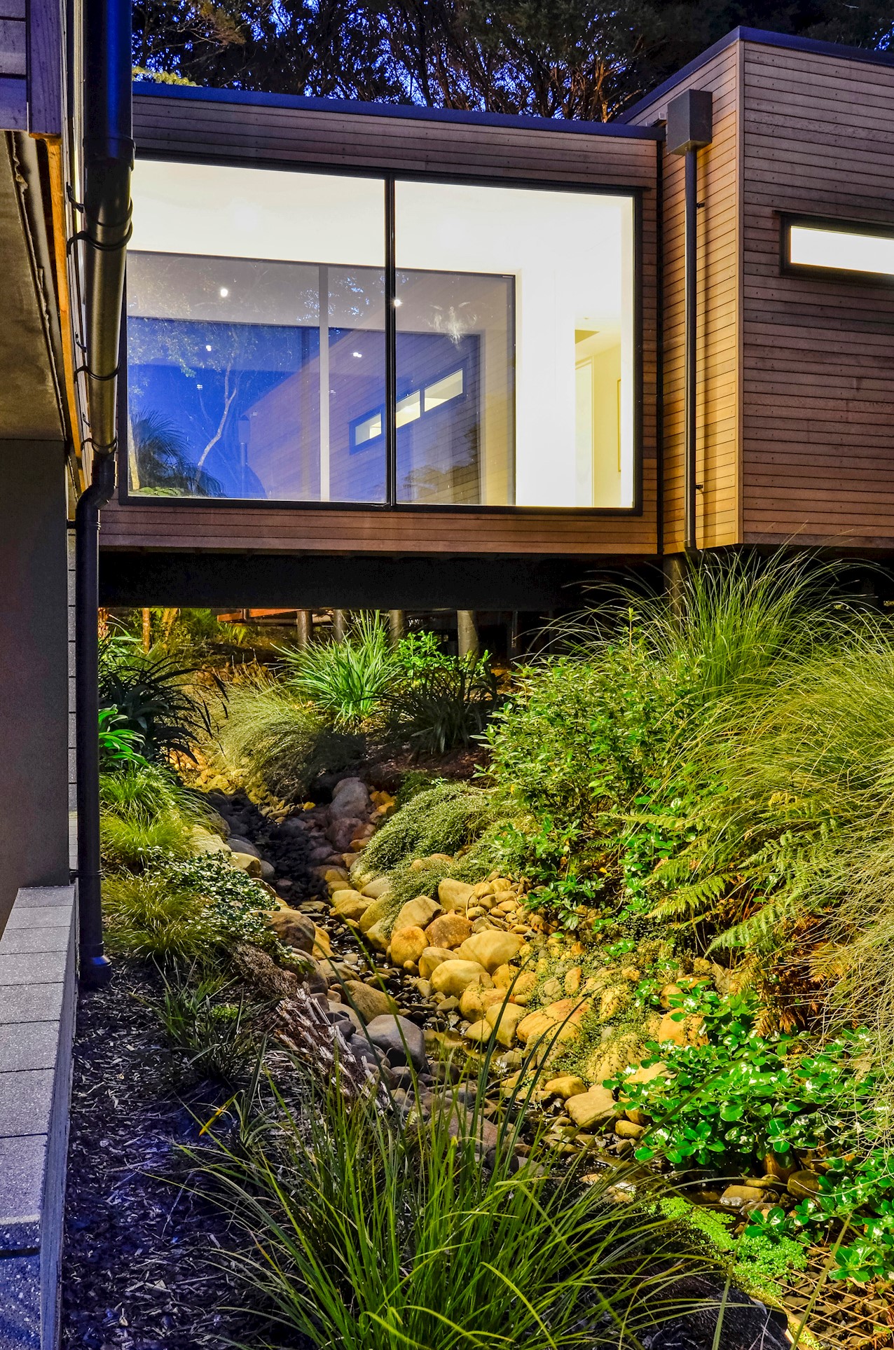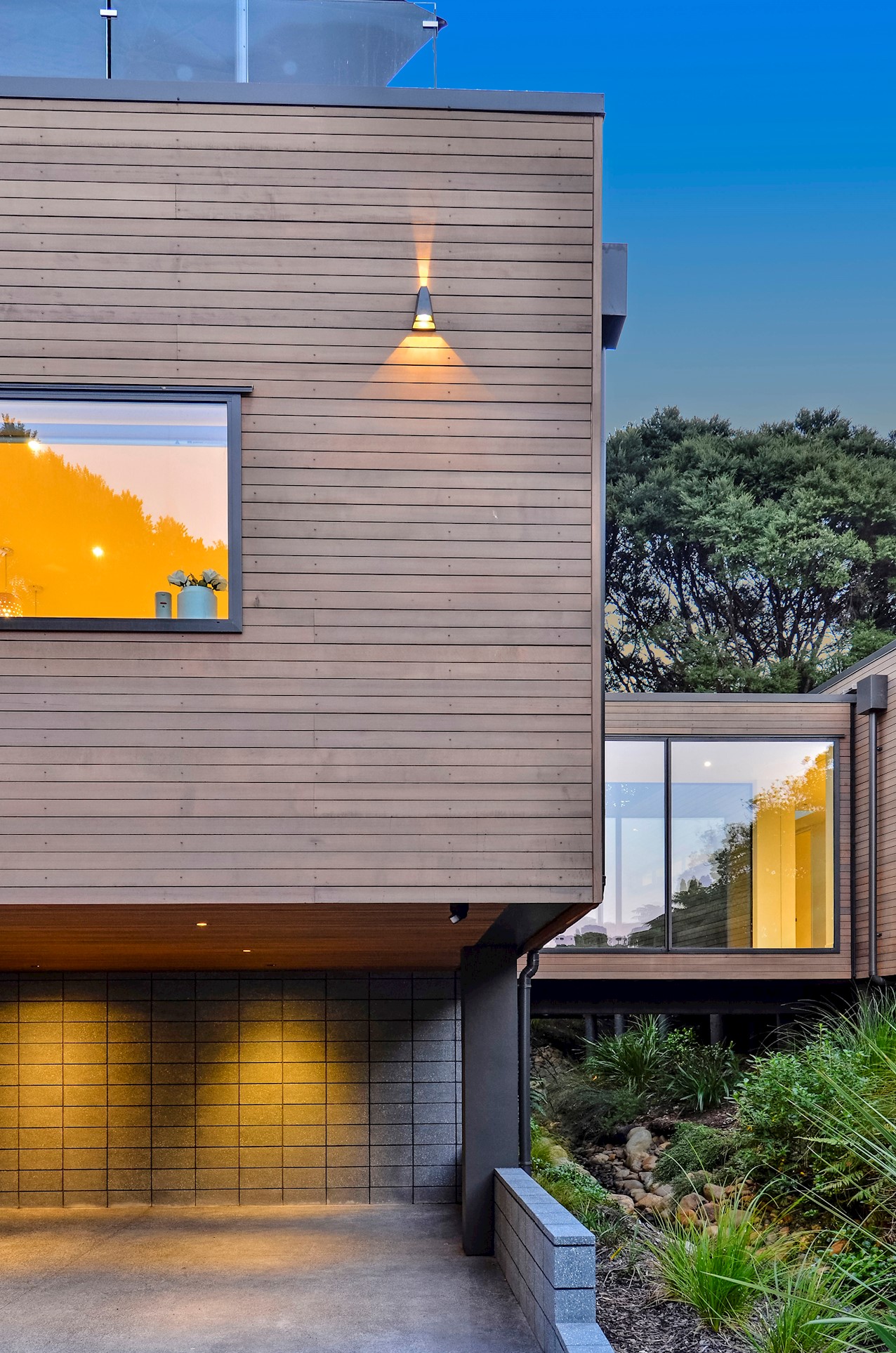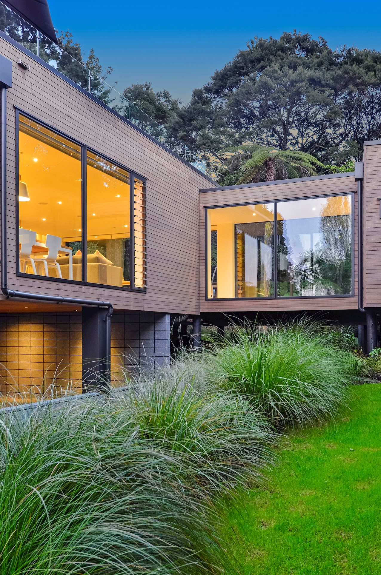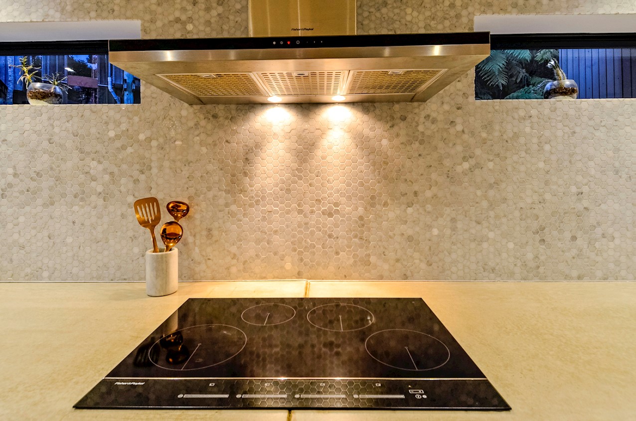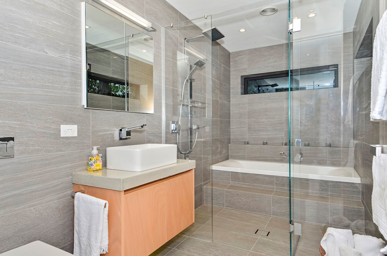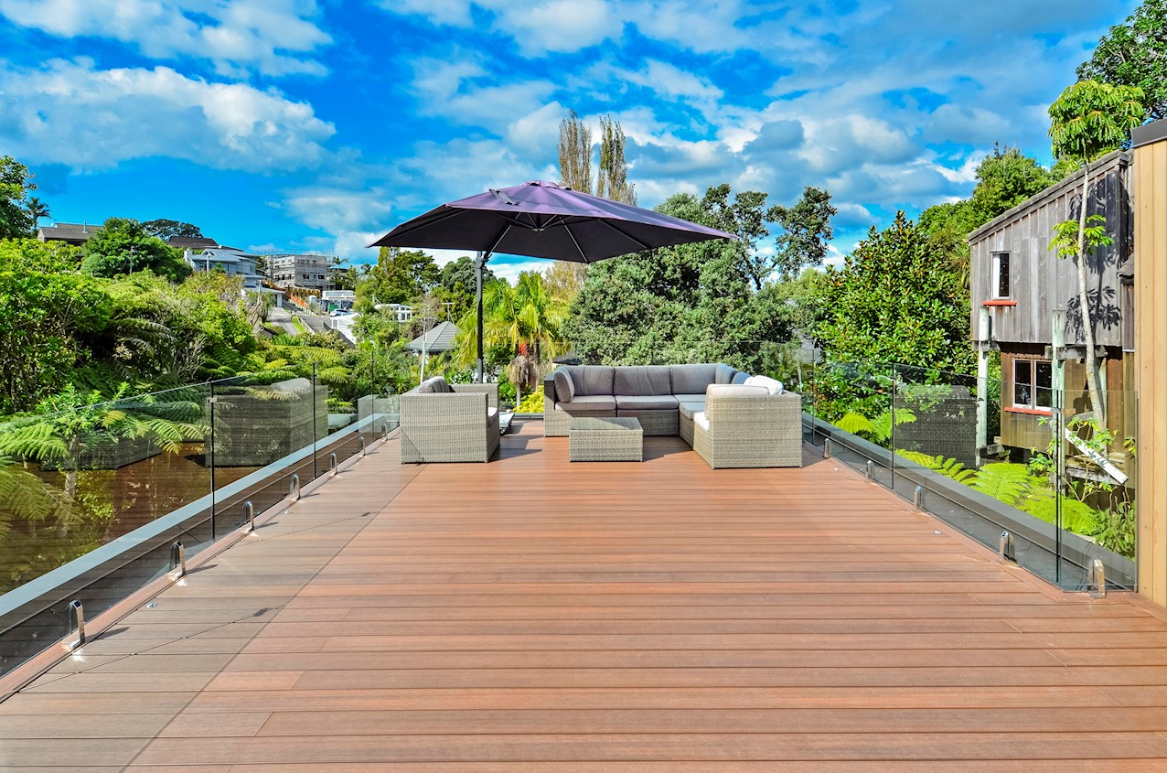 This Castor Bay beauty is the first home in Auckland to be built with Formance Structural Insulated Panels (SIPs). And after word gets out about the finished product, it’s hard to imagine it will be the last. Elegantly understated box-like forms appear to hover above the ground. Established native bush provides a tranquil and immersive setting, allowing the structure to nestle harmoniously into its surrounds. The beautifully textured exterior can be appreciated from inside, too. A glazed bridge draws in the sun and links the living and sleeping wings. Light timber flooring keeps the interior bright and luxurious, and there’s carpet for quiet in the sleeping spaces. The three peaceful bedrooms are serviced by two tiled bathrooms. The living area and entertainer’s kitchen flow to a glazed deck with barbecue. Positioned up the floating feature staircase, a superb roof deck with spa pool perfectly caps off this contemporary abode. Parking is neatly tucked away under the cantilevered living area. The 180sqm footprint is cleverly utilised.