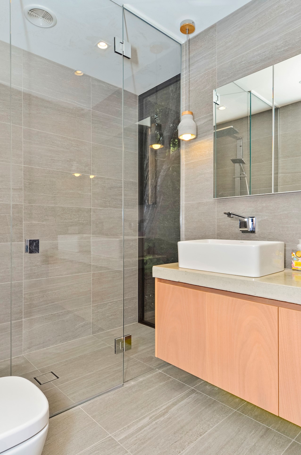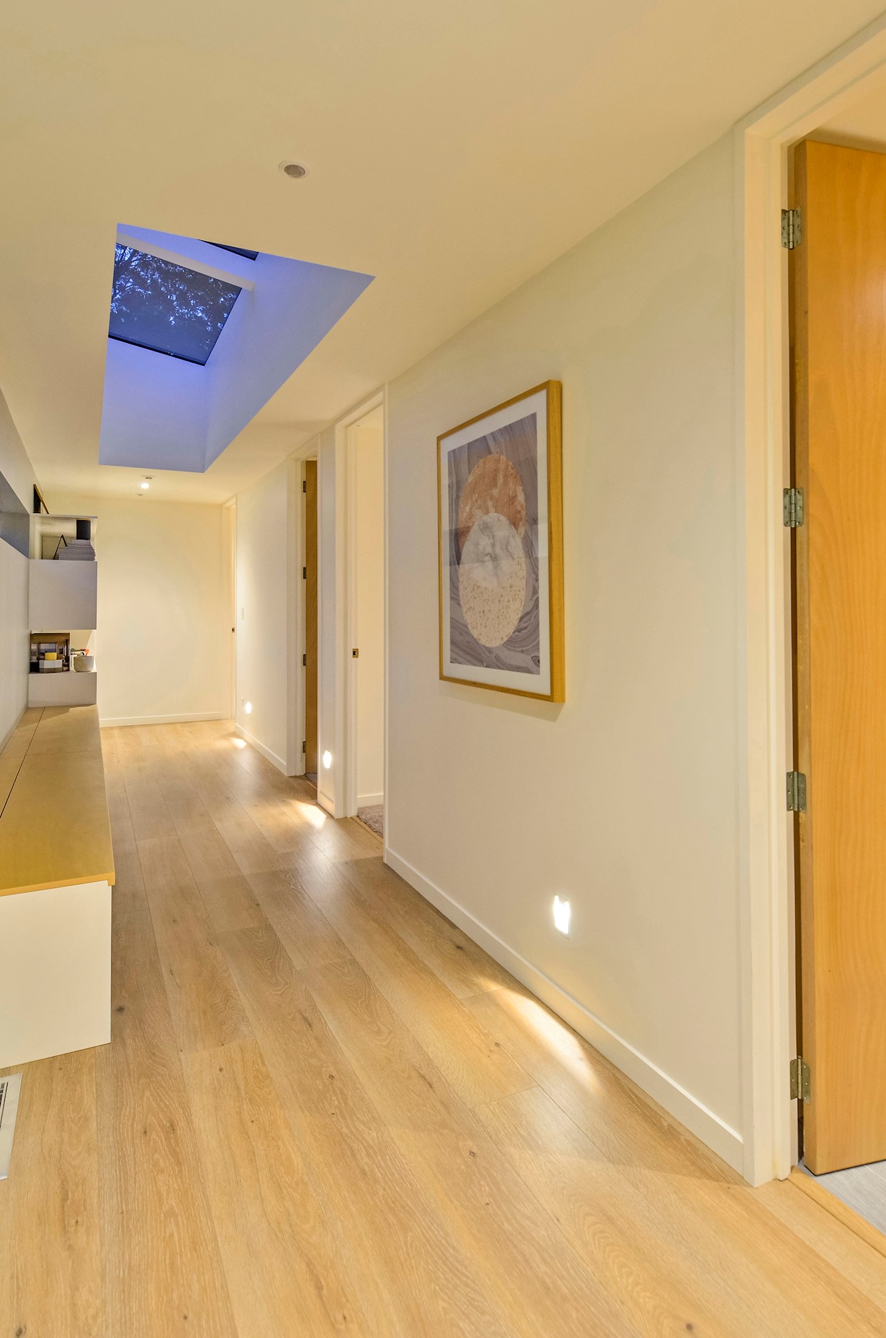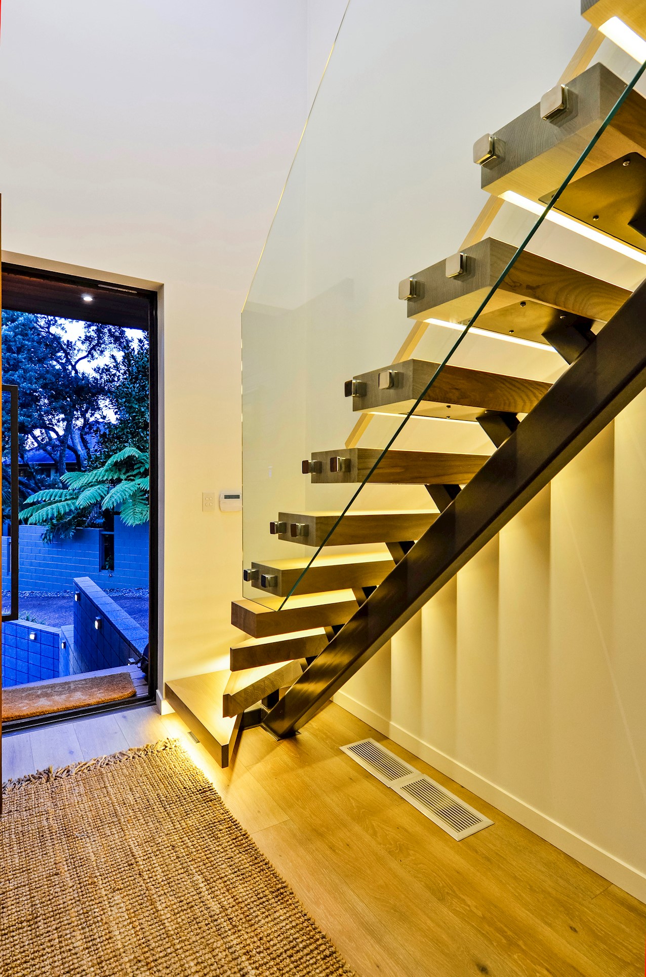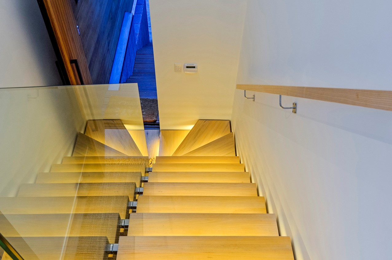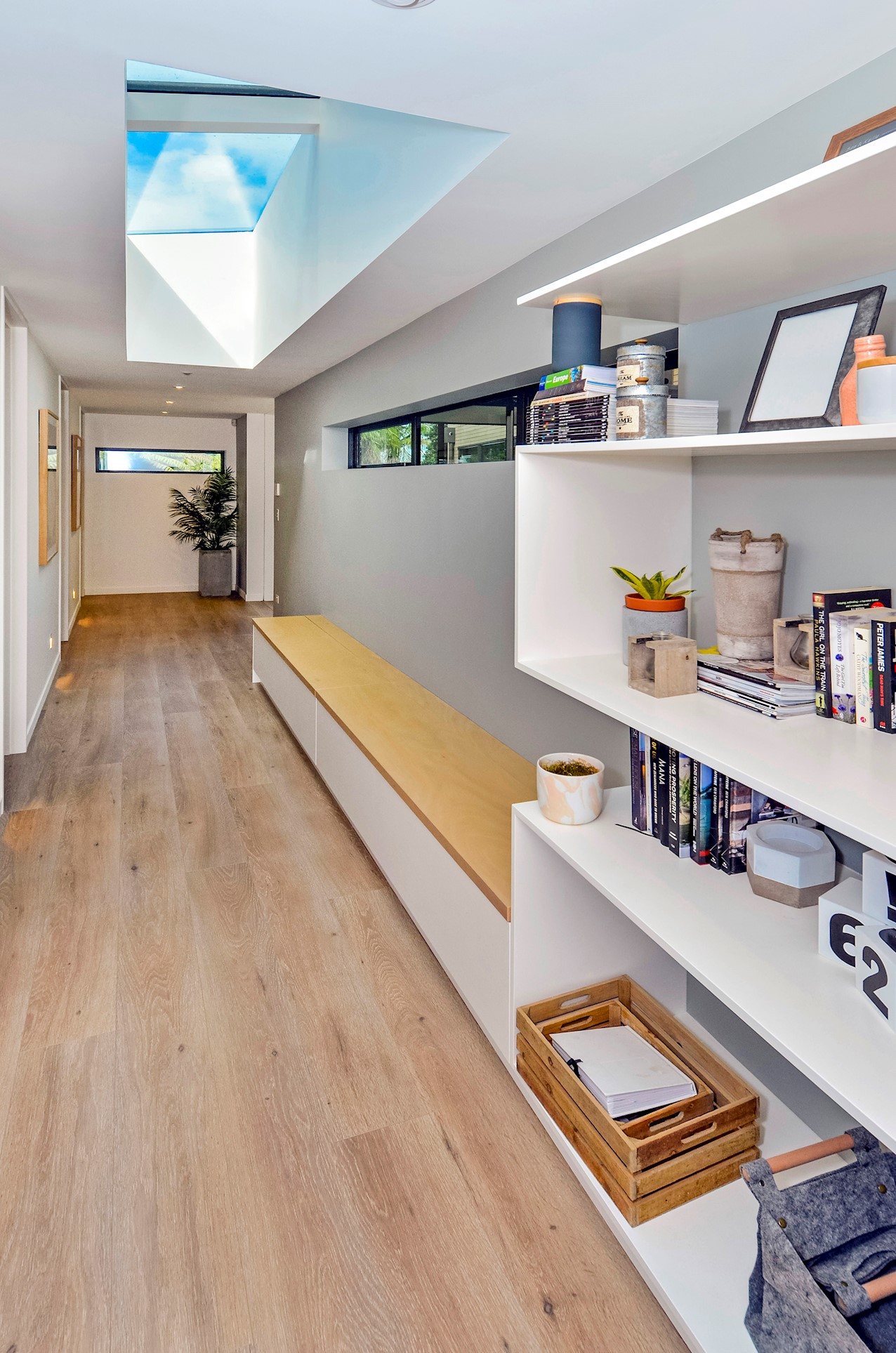 This Castor Bay beauty is the first home in Auckland to be built with Formance Structural Insulated Panels (SIPs). And after word gets out about the finished product, it’s hard to imagine it will be the last. Elegantly understated box-like forms appear to hover above the ground. Established native bush provides a tranquil and immersive setting, allowing the structure to nestle harmoniously into its surrounds. The beautifully textured exterior can be appreciated from inside, too. A glazed bridge draws in the sun and links the living and sleeping wings. Light timber flooring keeps the interior bright and luxurious, and there’s carpet for quiet in the sleeping spaces. The three peaceful bedrooms are serviced by two tiled bathrooms. The living area and entertainer’s kitchen flow to a glazed deck with barbecue. Positioned up the floating feature staircase, a superb roof deck with spa pool perfectly caps off this contemporary abode. Parking is neatly tucked away under the cantilevered living area. The 180sqm footprint is cleverly utilised.
