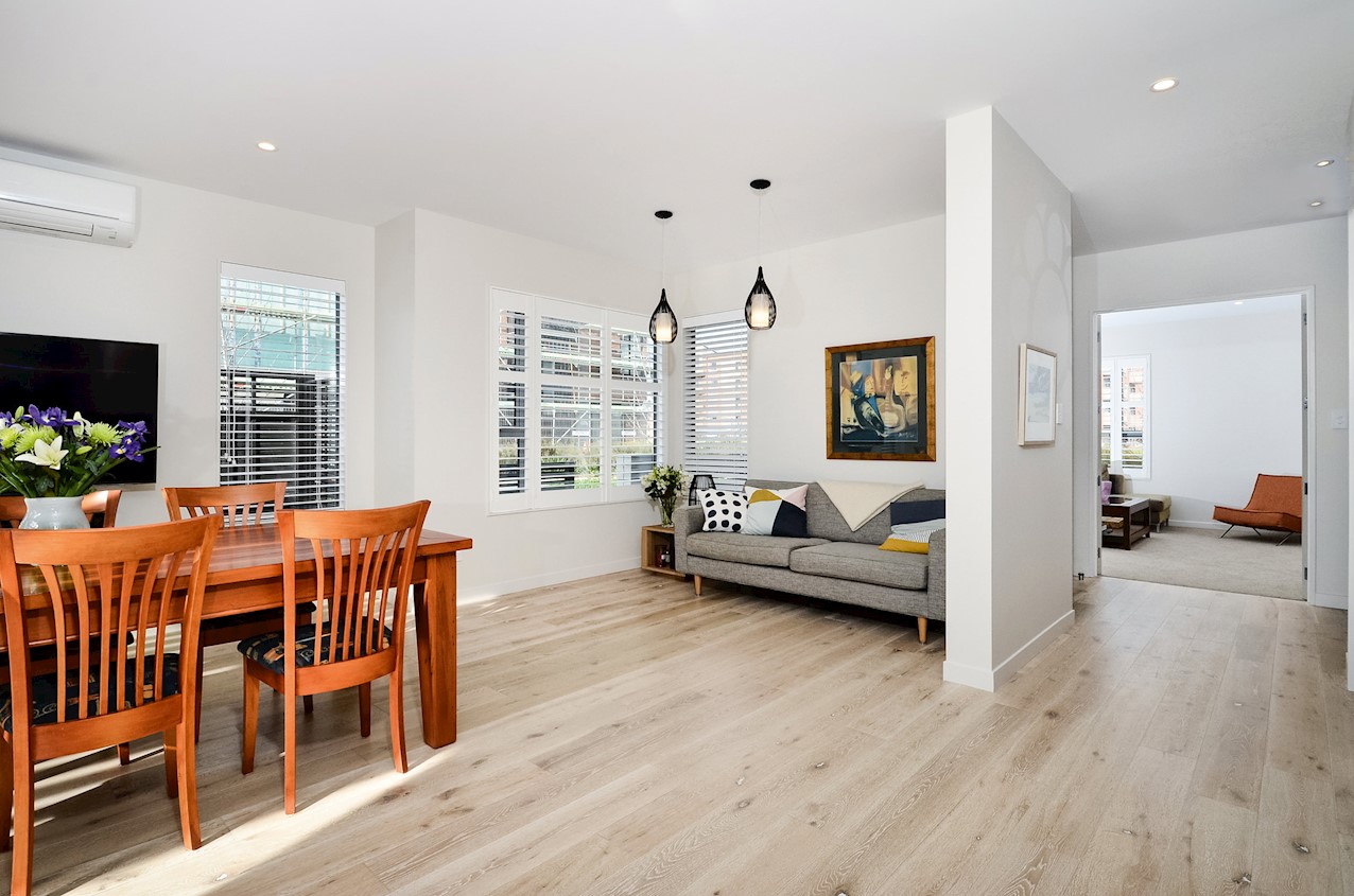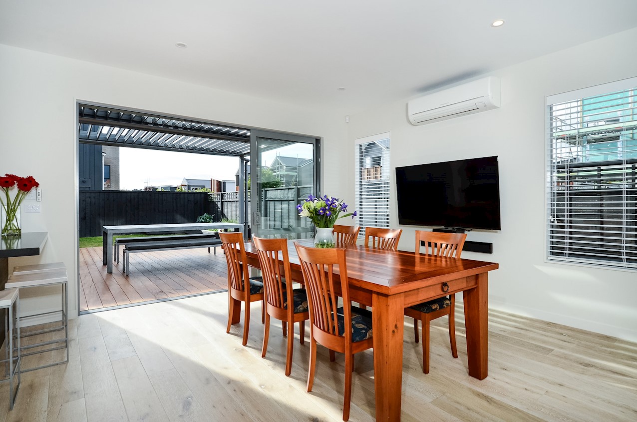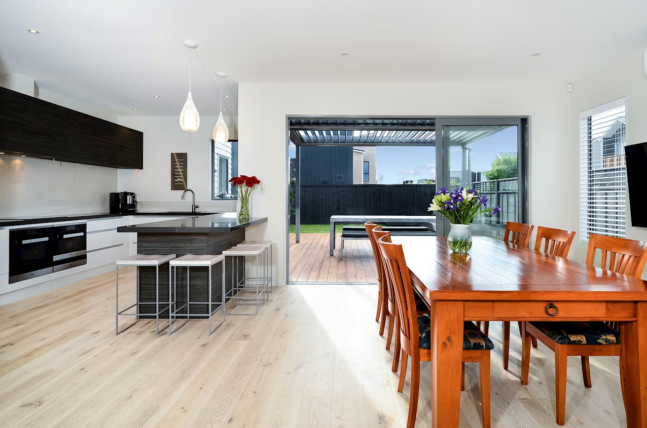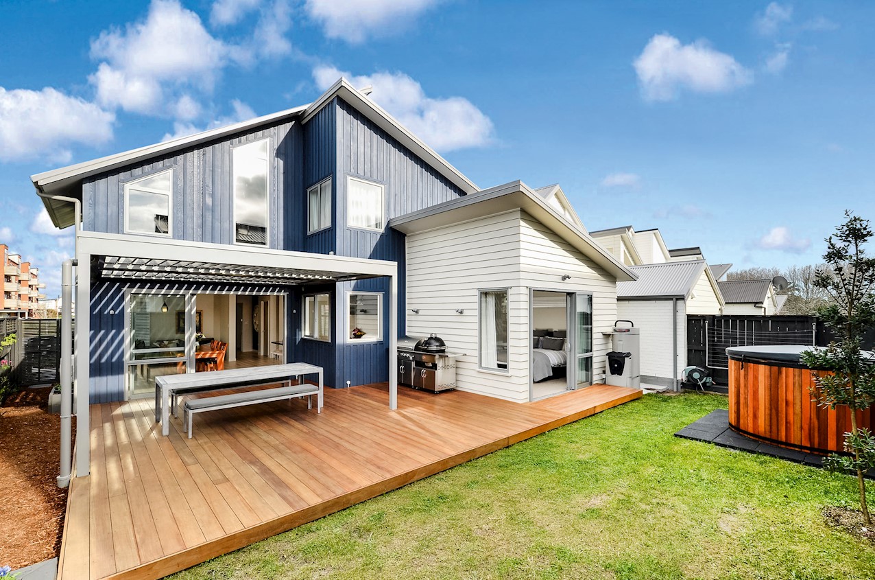 With three bedrooms, three bathrooms and three living spaces, this Hobsonville home is built for comfort and style. The 228sqm family residence boasts an airy and open environment for effortless everyday living. Lofty ceilings and elevated windows enhance the sense of space and light without compromising privacy from nearby neighbours. Perfect for relaxing or entertaining, the stylish open-plan ground floor encompasses dining, kitchen and living spaces. The living domain flows seamlessly to a generous-sized covered deck for alfresco dining and barbecues. The master bedroom is a private retreat for the heads of house and features a well-designed ensuite. It also opens to the outdoors through a glass slider. Mosaic-tile detailing is a striking feature of the three beautifully equipped bathrooms. Low-maintenance landscaping includes a lawn where the kids can play – every aspect of this well-designed abode is in harmony with family life.