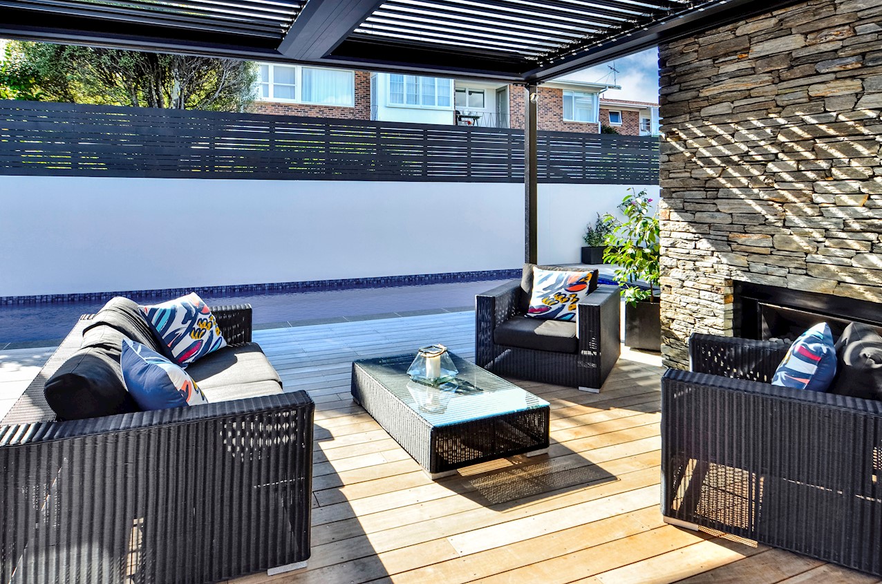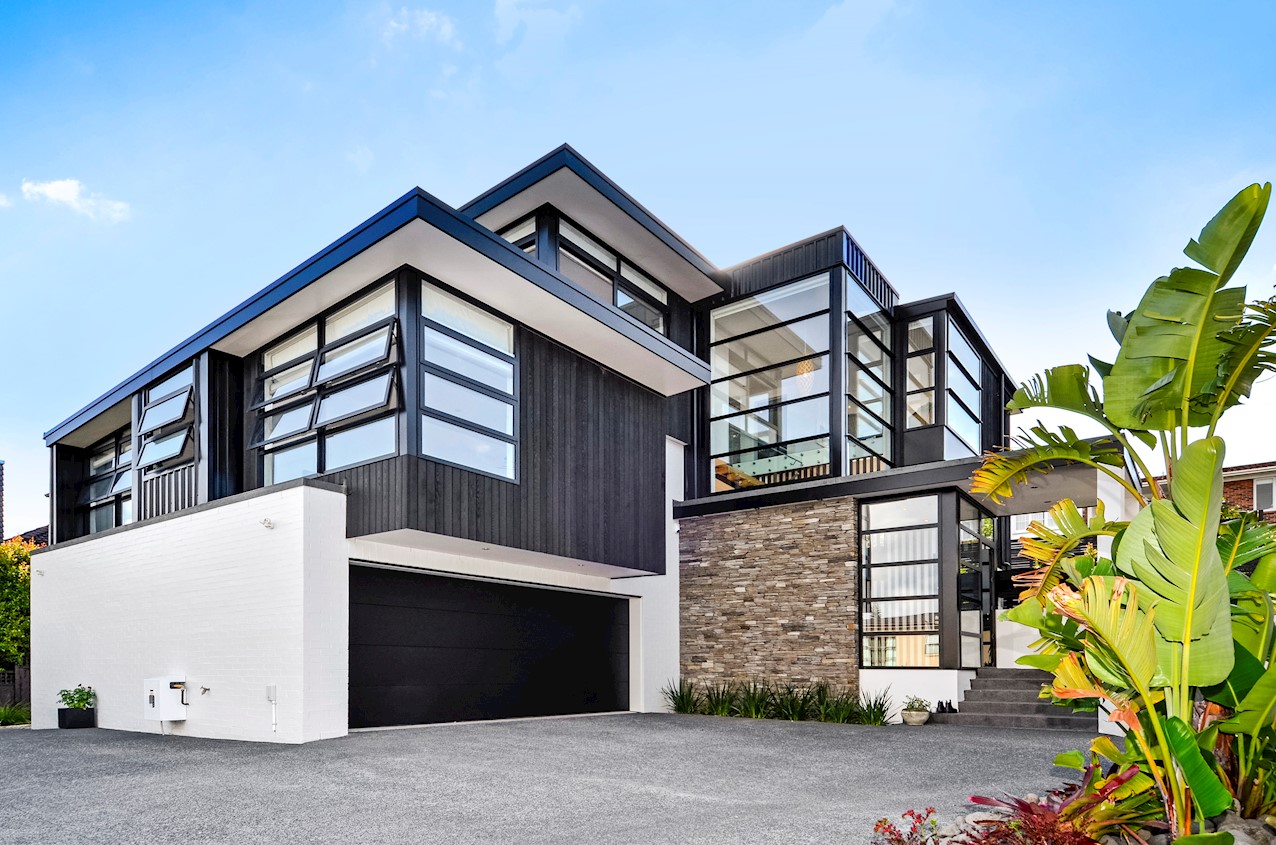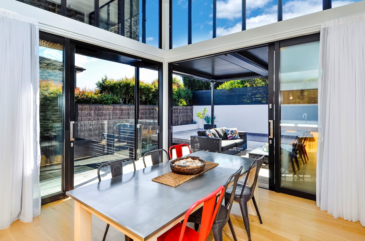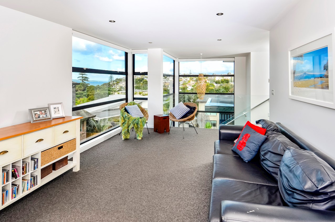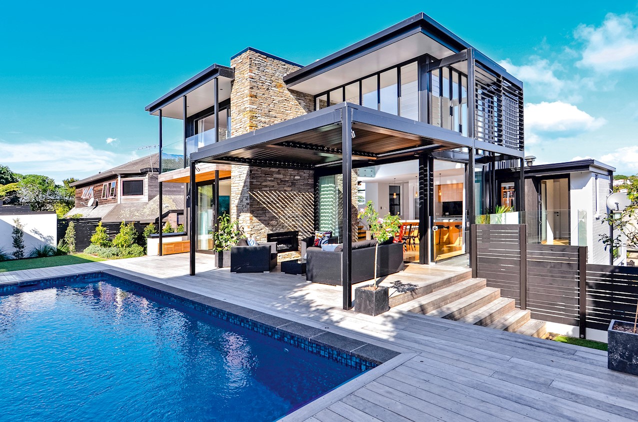 The designers of this North Shore beauty have harnessed the power of four and found the formula for luxury family living. Four bedrooms, four bathrooms and four living areas offer ample space to retreat for relaxation or to spend quality time together. Extensive floor-to-ceiling glazing enhances the home’s modern exterior, all the while soaking up sunshine and capturing sea views. A double-height ceiling sends the sense of space through the roof in the dining area, while louvred screens temper harsh rays. Beautifully designed and refined interior spaces flow effortlessly to outdoor living upstairs and down. The luxurious swimming pool offers resort-style cool and endless enjoyment on summer days. A large wall partially bisects the home, linking inside and out, upstairs and down. Set in this stone feature, you’ll find a double-sided fireplace which warms living and dining, plus an alfresco fire – great for outdoor entertaining on colder nights. This stellar home provides every modern comfort and convenience a family could dream of.
