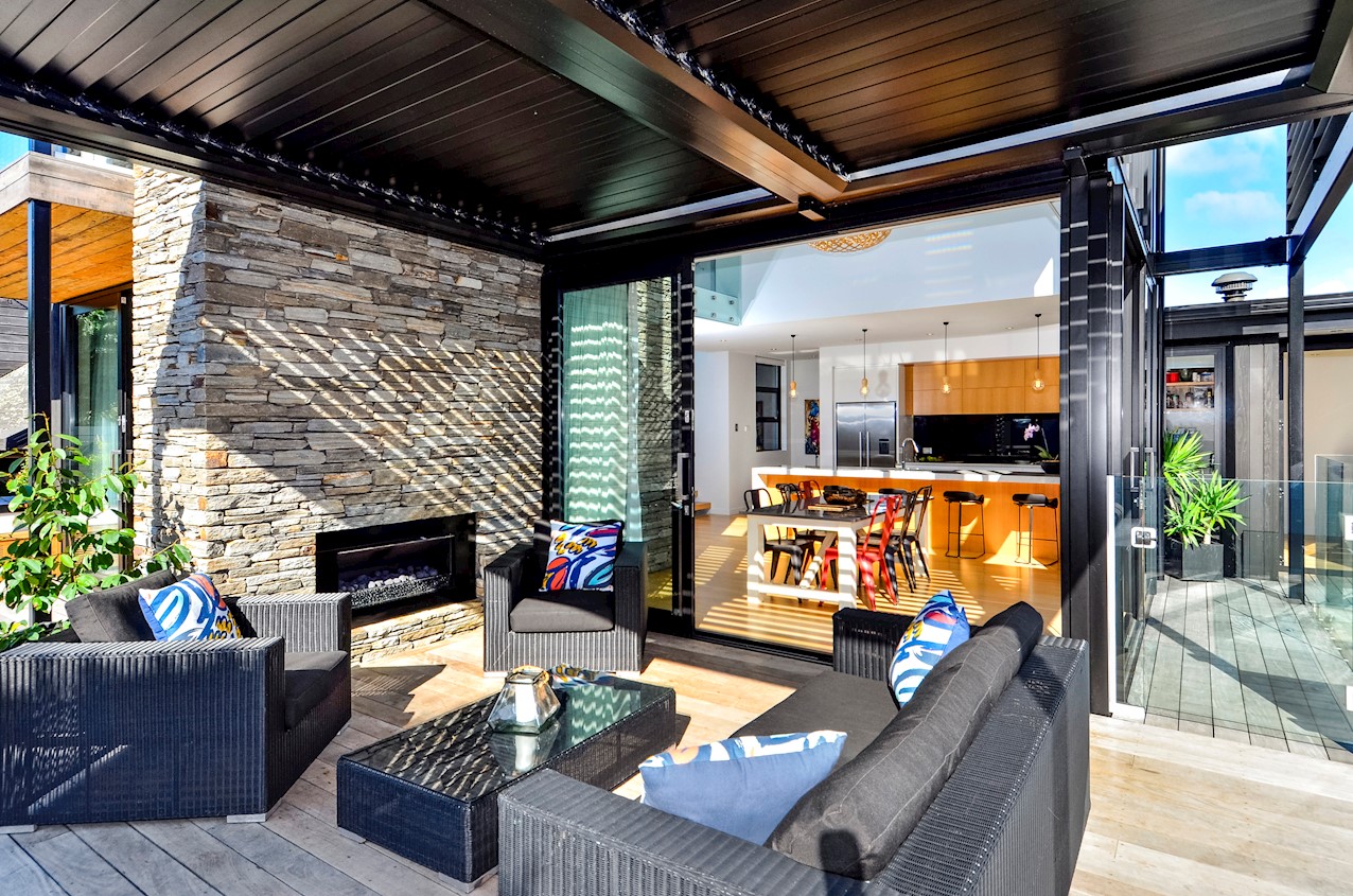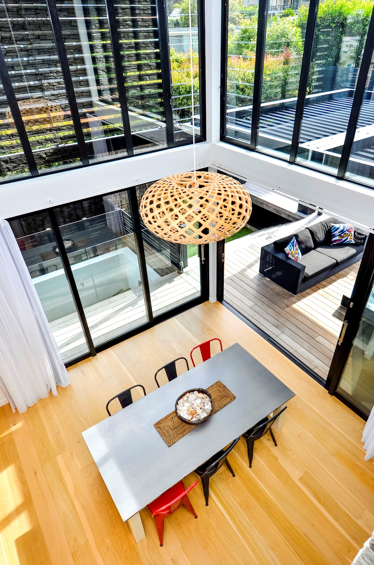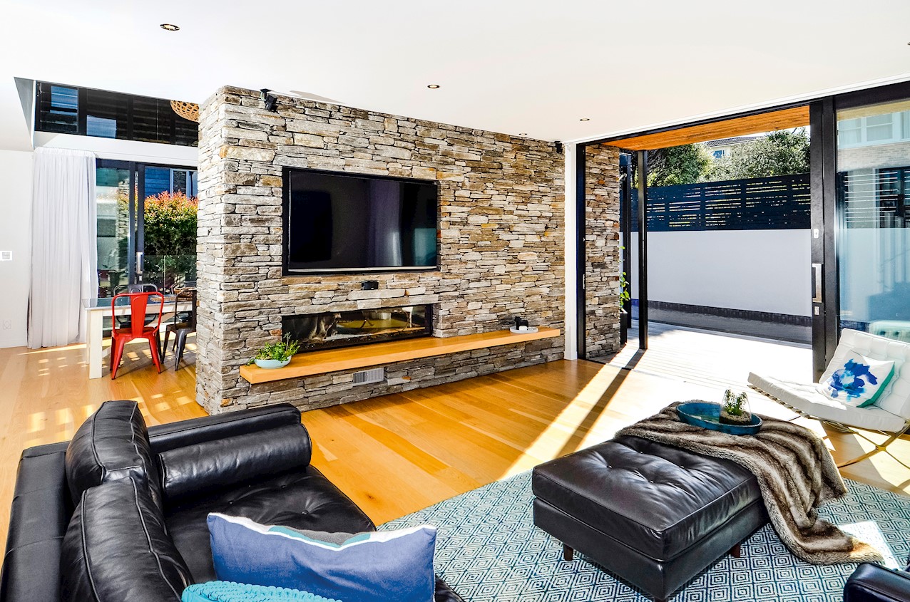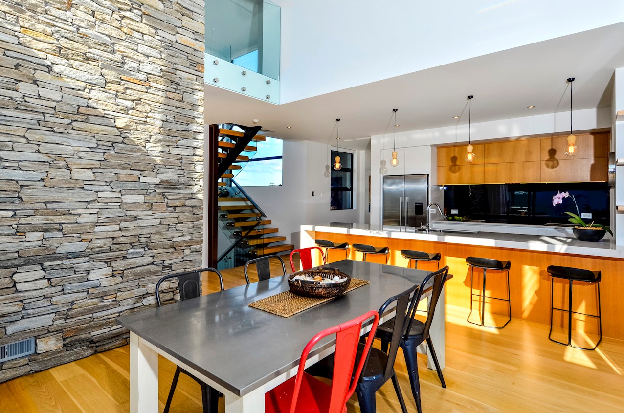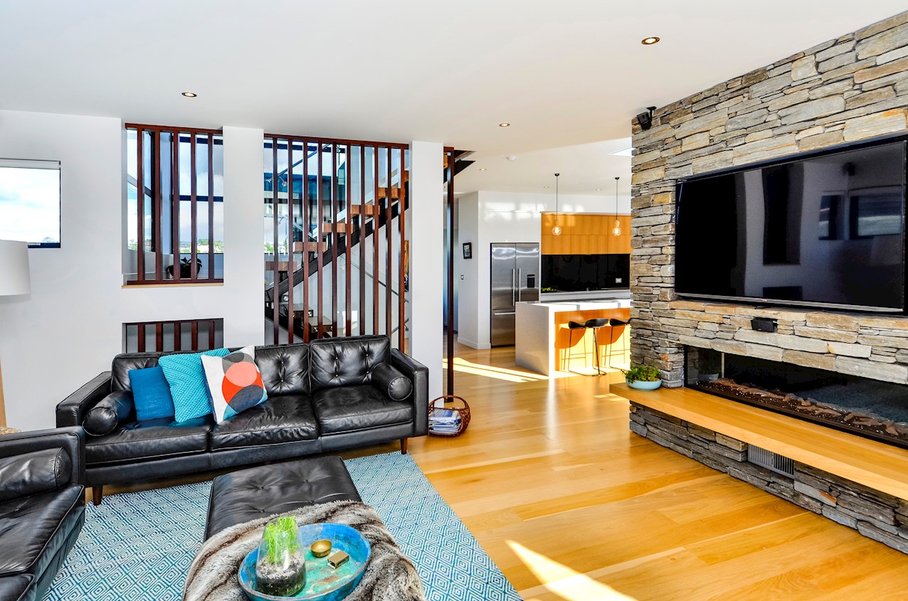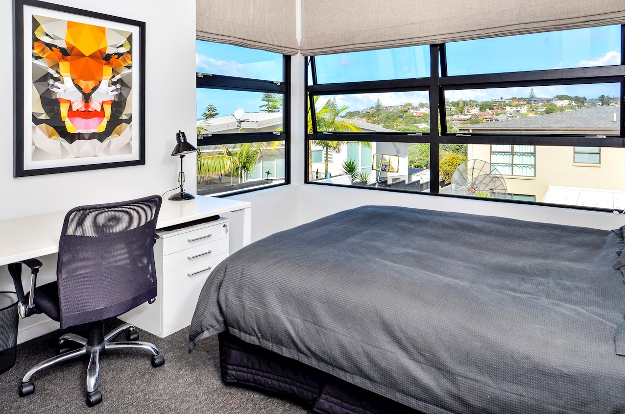 The designers of this North Shore beauty have harnessed the power of four and found the formula for luxury family living. Four bedrooms, four bathrooms and four living areas offer ample space to retreat for relaxation or to spend quality time together. Extensive floor-to-ceiling glazing enhances the home’s modern exterior, all the while soaking up sunshine and capturing sea views. A double-height ceiling sends the sense of space through the roof in the dining area, while louvred screens temper harsh rays. Beautifully designed and refined interior spaces flow effortlessly to outdoor living upstairs and down. The luxurious swimming pool offers resort-style cool and endless enjoyment on summer days. A large wall partially bisects the home, linking inside and out, upstairs and down. Set in this stone feature, you’ll find a double-sided fireplace which warms living and dining, plus an alfresco fire – great for outdoor entertaining on colder nights. This stellar home provides every modern comfort and convenience a family could dream of.