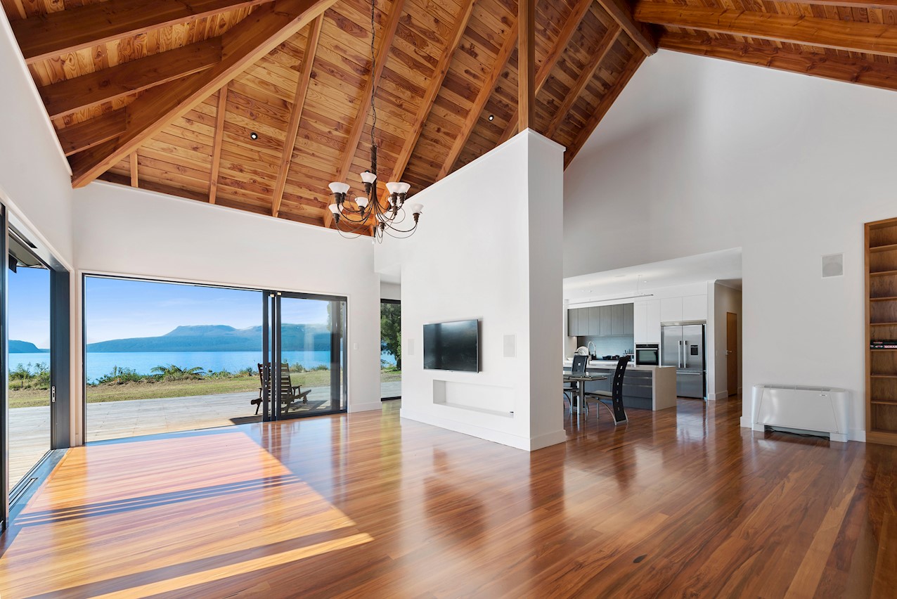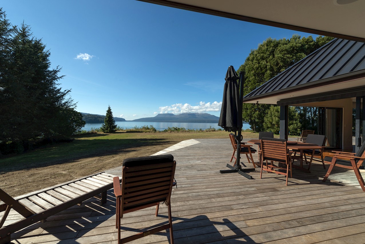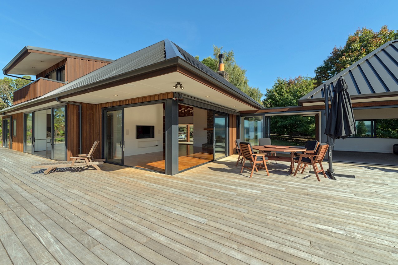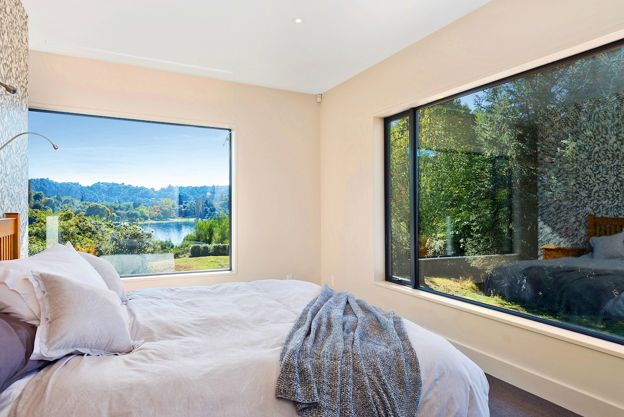 Like many of us, this recently reinvigorated Rotorua retreat would rather forget the 90s. And by the looks of it, it has. No expense has been spared in this makeover, which has transformed the Tarawera residence into the ultimate lake house – or should we say houses? Two spacious structures are delicately linked by the addition of a glass ‘bridge’, which frames lake and mountain views. It also allows a look-through view from the sheltered west deck. The wide-open interior exudes timeless style while being superbly functional for wheelchair users. The timber feature ceiling, floating high above warming wood floors in the open-plan area, is simply breathtaking. If you can tear your eyes off it long enough, you’ll notice the enviable lake views through large swathes of glass. It’s such a relaxing sight from the entertainer’s kitchen. With four bedrooms, four bathrooms and two living areas, there’s lots of space for guests. Huge decks set the scene for alfresco affairs night and day. The upstairs bedroom enjoys it own private balcony.