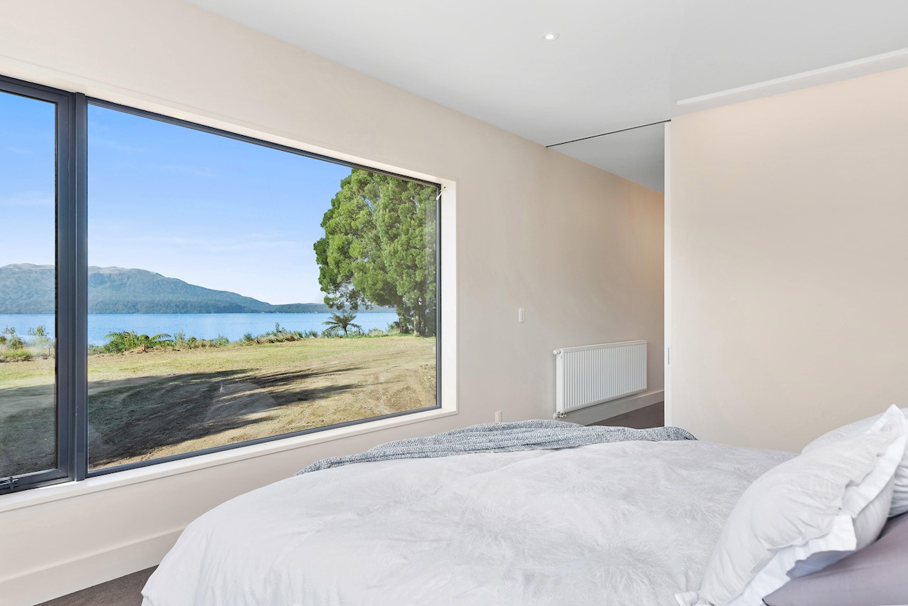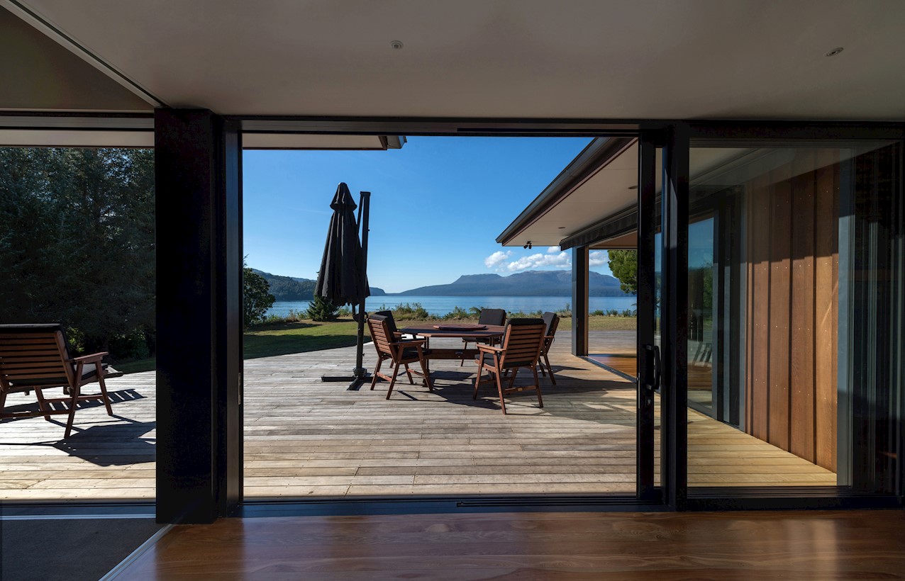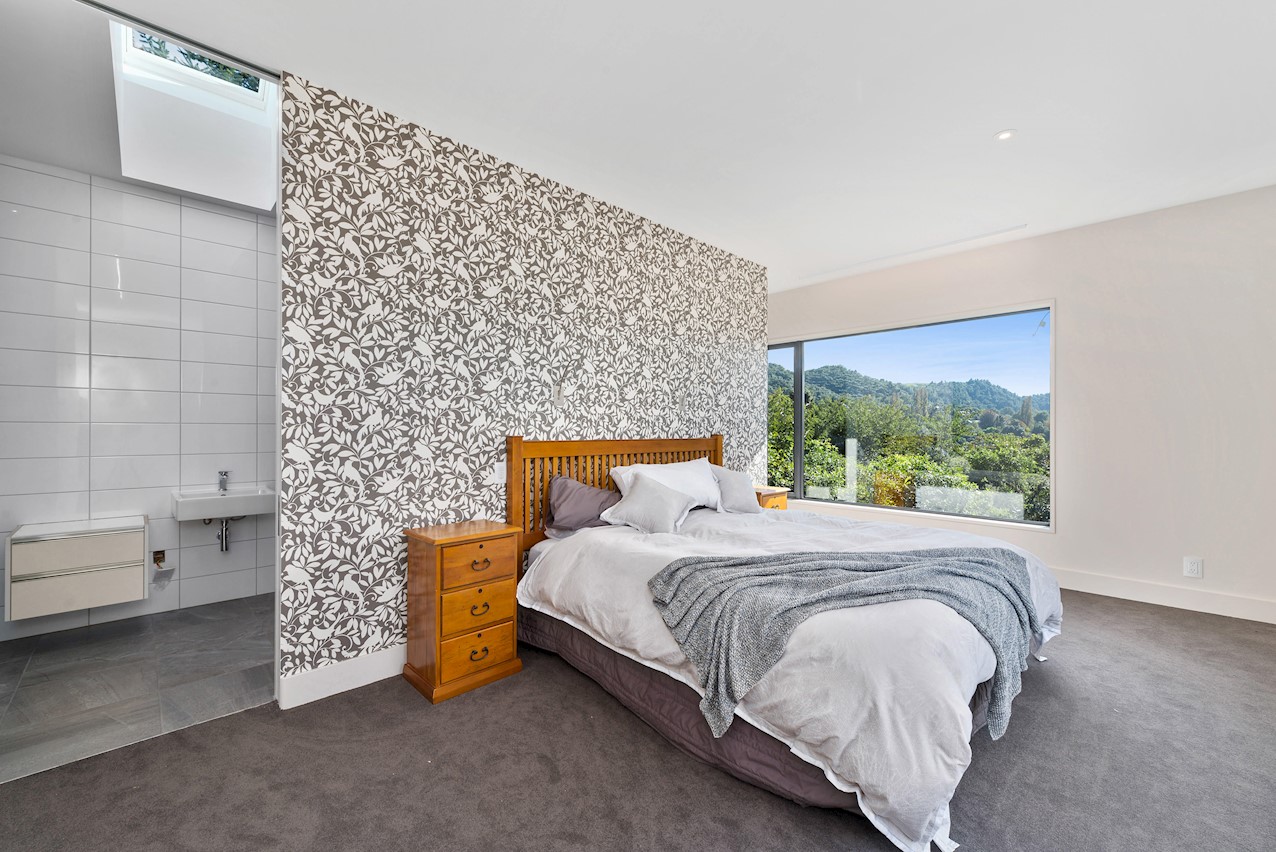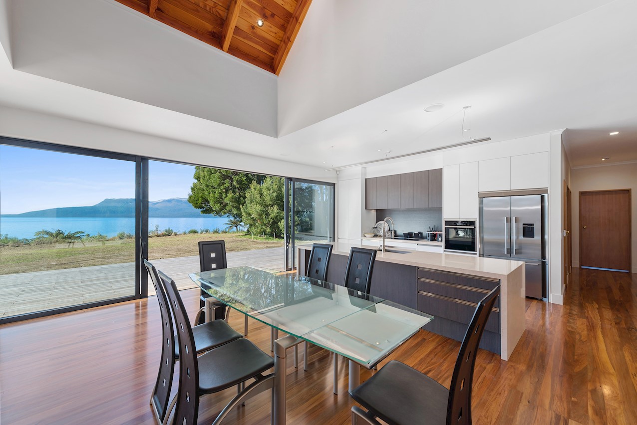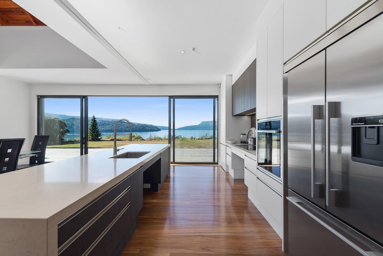 Like many of us, this recently reinvigorated Rotorua retreat would rather forget the 90s. And by the looks of it, it has. No expense has been spared in this makeover, which has transformed the Tarawera residence into the ultimate lake house – or should we say houses? Two spacious structures are delicately linked by the addition of a glass ‘bridge’, which frames lake and mountain views. It also allows a look-through view from the sheltered west deck. The wide-open interior exudes timeless style while being superbly functional for wheelchair users. The timber feature ceiling, floating high above warming wood floors in the open-plan area, is simply breathtaking. If you can tear your eyes off it long enough, you’ll notice the enviable lake views through large swathes of glass. It’s such a relaxing sight from the entertainer’s kitchen. With four bedrooms, four bathrooms and two living areas, there’s lots of space for guests. Huge decks set the scene for alfresco affairs night and day. The upstairs bedroom enjoys it own private balcony.