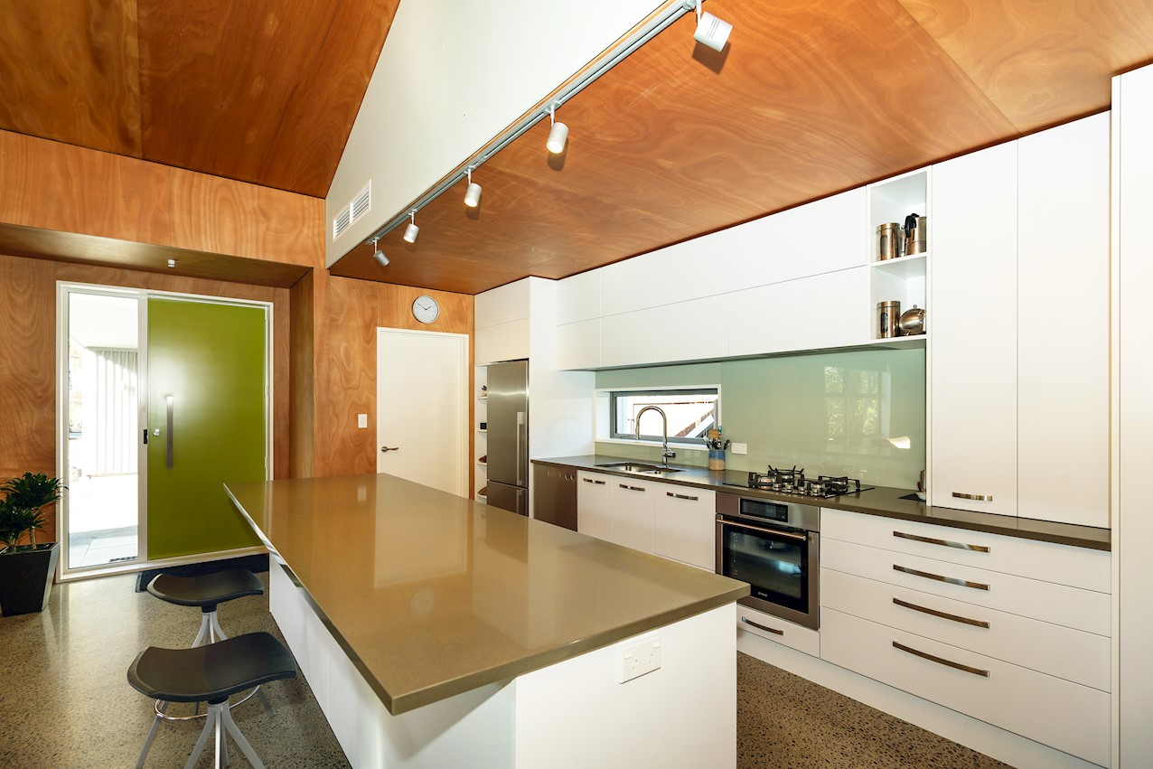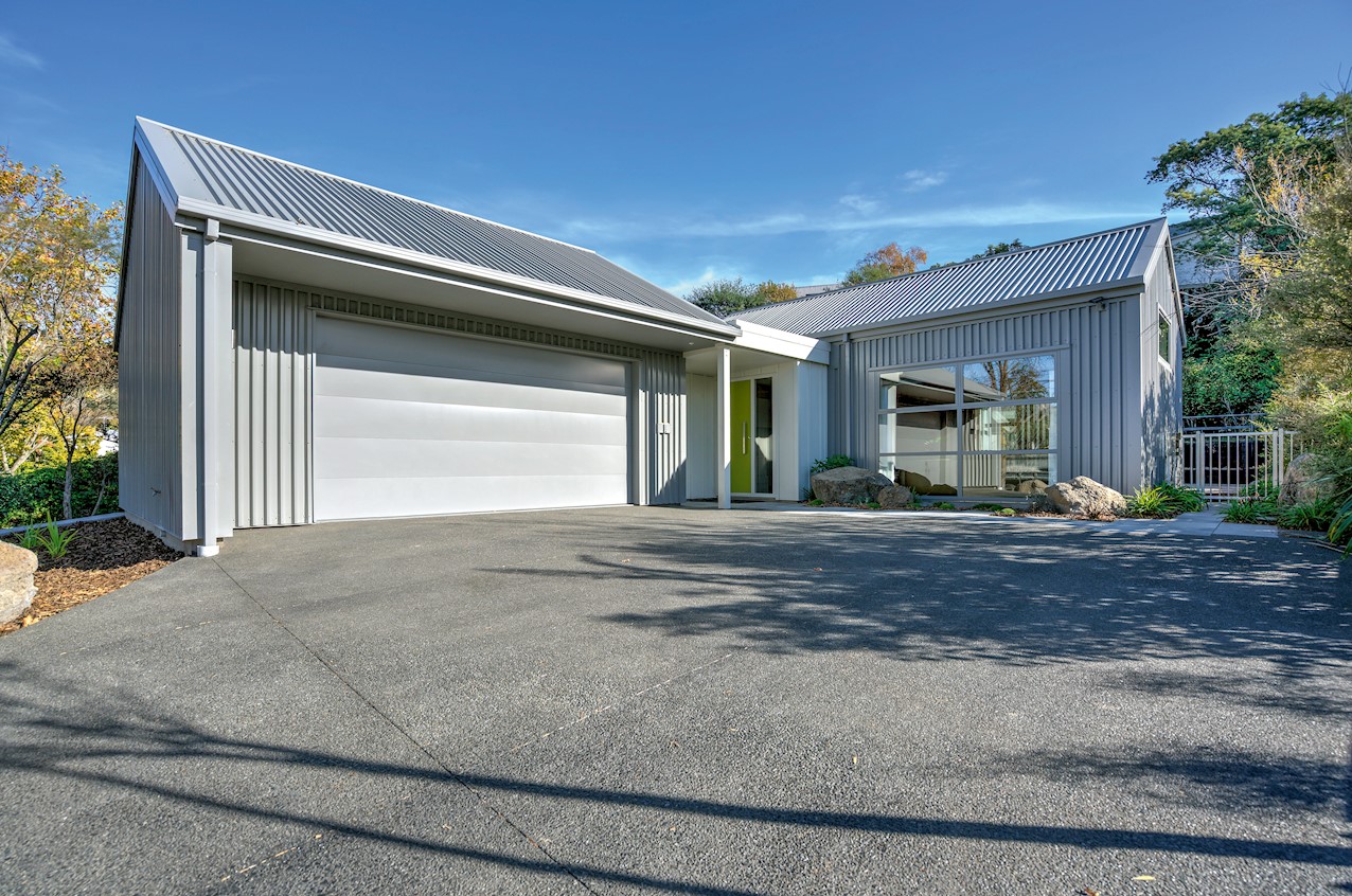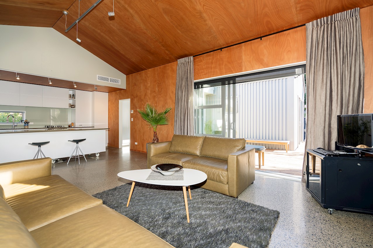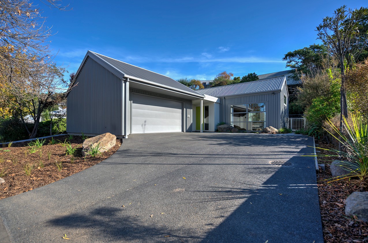The eye-catching cladding of this Hillsborough home is reminiscent of industrial shipping containers, but the form suggests a classic farm building. Inside, it’s contemporary domestic bliss with a large living space under vaulted ceilings. A bulkhead creates an intimate cooking experience in the entertainer’s kitchen. Large swathes of timber enhance the cocoon feel of the open plan. Floor-to-ceiling drapes up the comfort factor. Polished concrete floors are practical and pleasing to the senses. They also offer thermal mass for solar gain. The home centres around a large alfresco living space. This is a fantastic spot to soak up the sunshine while enjoying time with friends. Decking sweeps around to offer indoor-outdoor flow off the master bedroom. This room features a walk-through wardrobe which connects to a private ensuite. A further bedroom and a main bathroom offer plenty of great options on 165sqm. An office, laundry, double garage and spa pool take care of business and leisure.