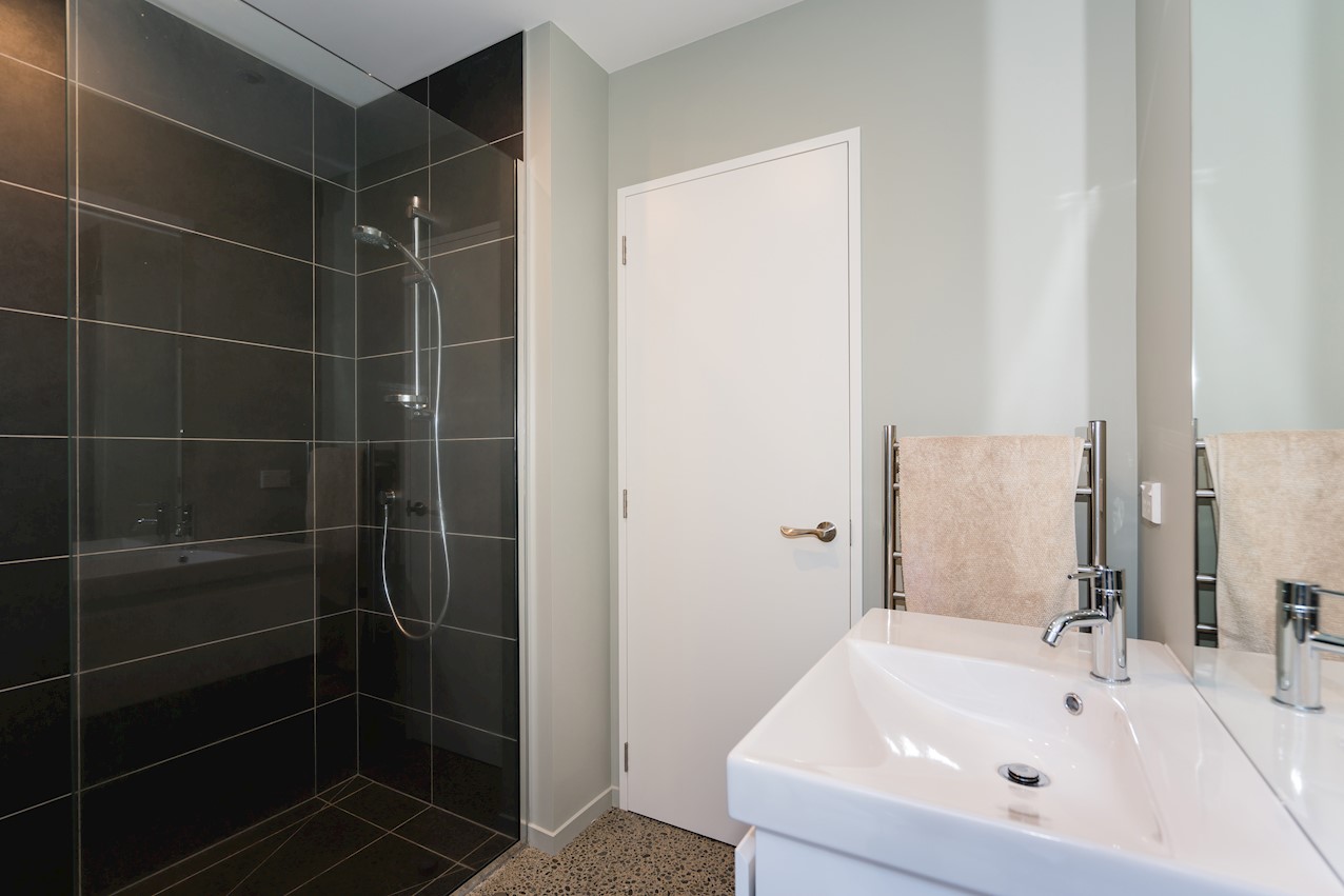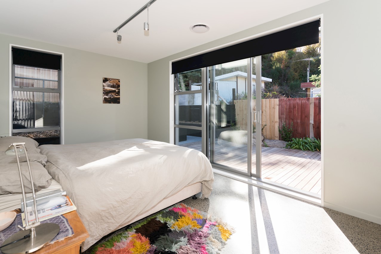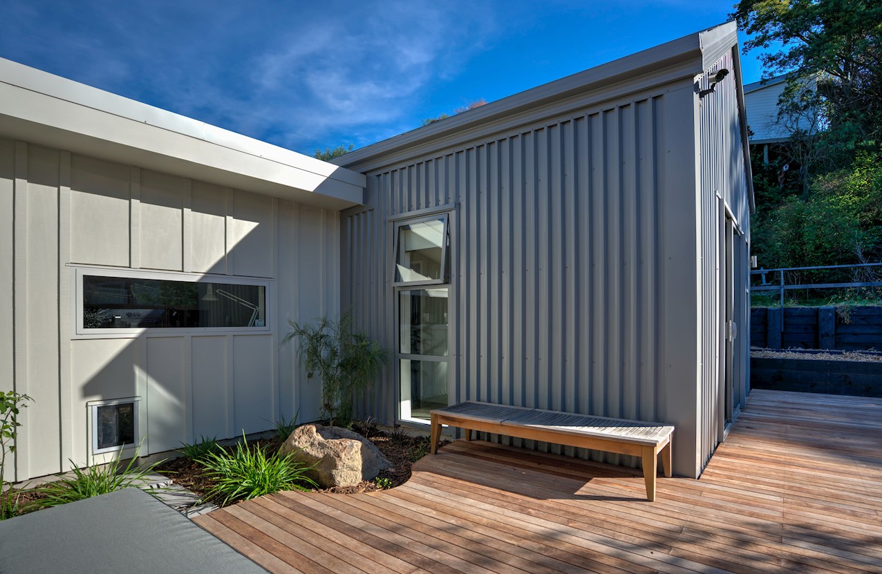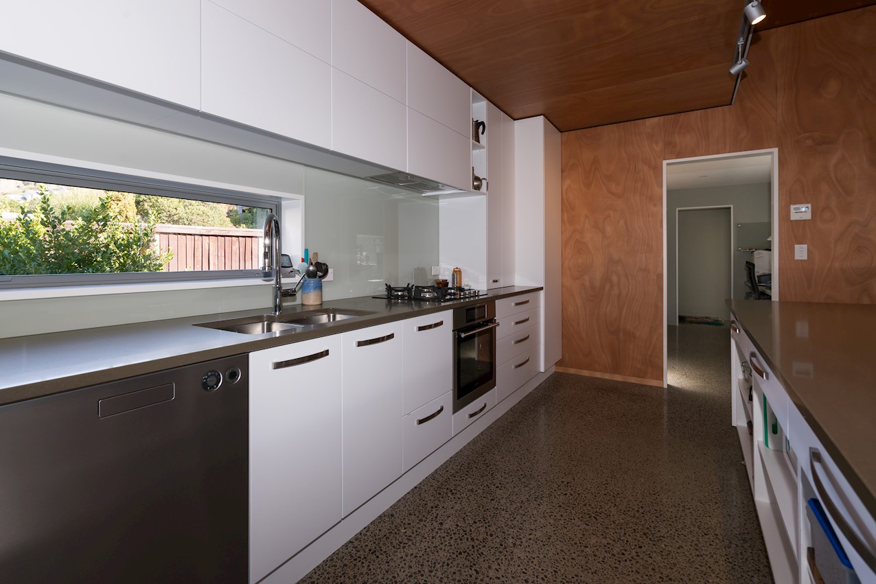 The eye-catching cladding of this Hillsborough home is reminiscent of industrial shipping containers, but the form suggests a classic farm building. Inside, it’s contemporary domestic bliss with a large living space under vaulted ceilings. A bulkhead creates an intimate cooking experience in the entertainer’s kitchen. Large swathes of timber enhance the cocoon feel of the open plan. Floor-to-ceiling drapes up the comfort factor. Polished concrete floors are practical and pleasing to the senses. They also offer thermal mass for solar gain. The home centres around a large alfresco living space. This is a fantastic spot to soak up the sunshine while enjoying time with friends. Decking sweeps around to offer indoor-outdoor flow off the master bedroom. This room features a walk-through wardrobe which connects to a private ensuite. A further bedroom and a main bathroom offer plenty of great options on 165sqm. An office, laundry, double garage and spa pool take care of business and leisure.