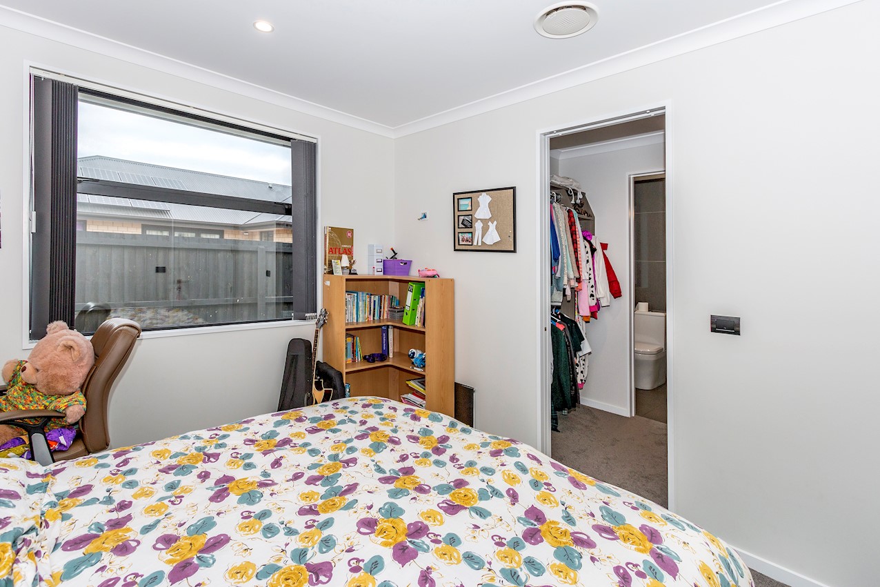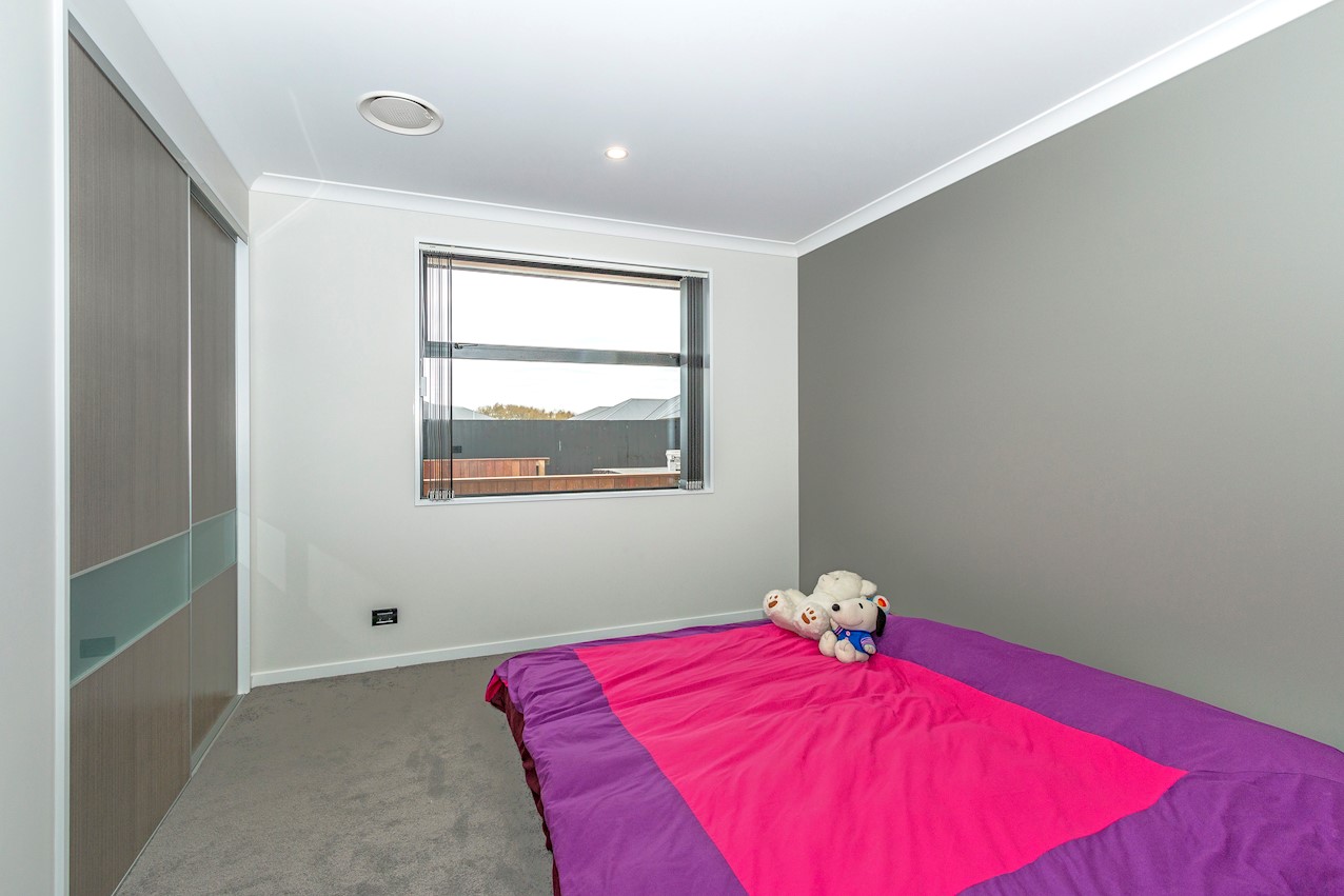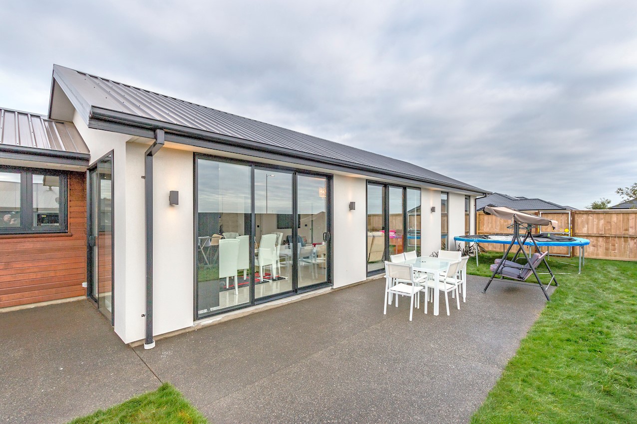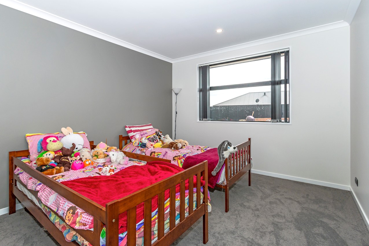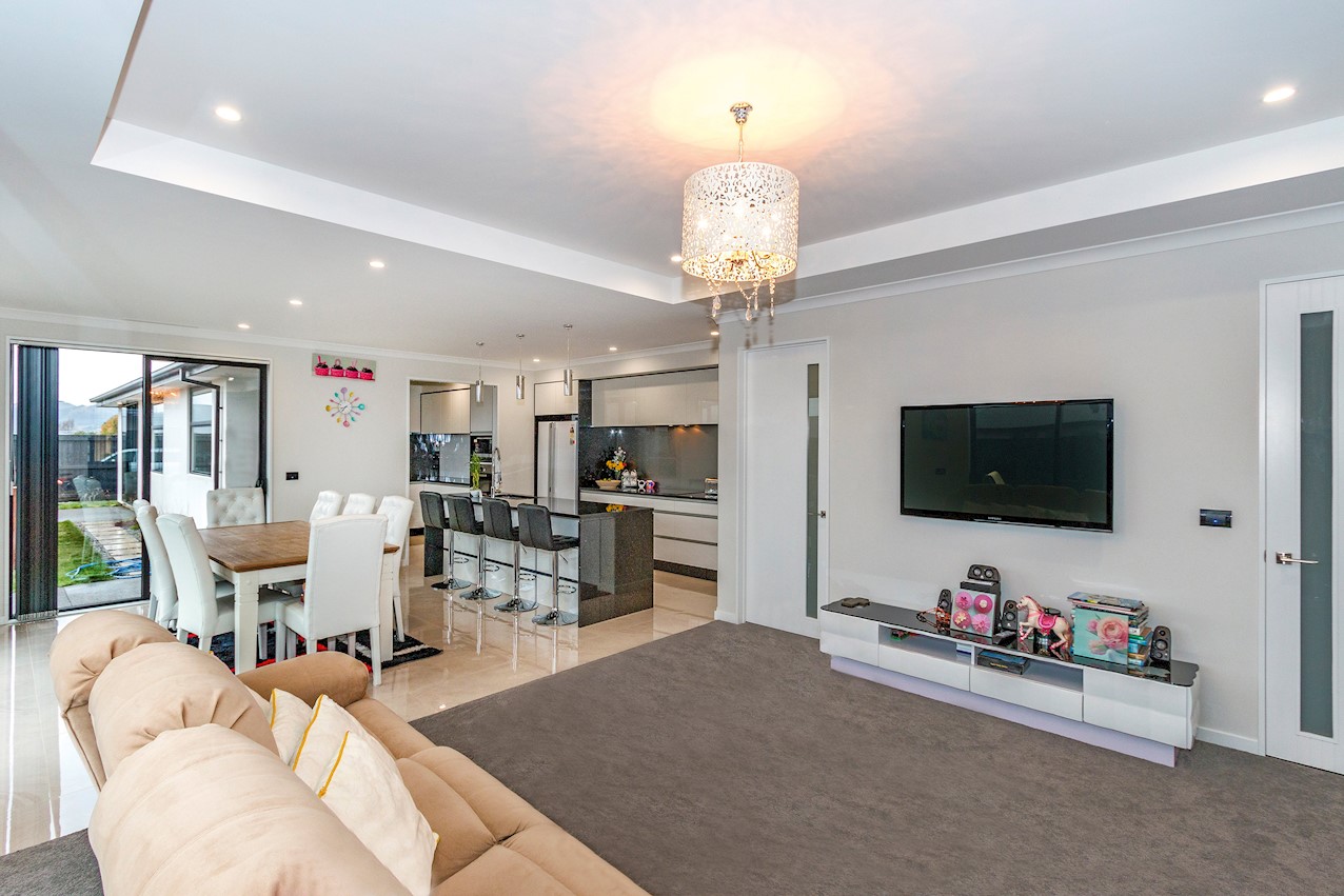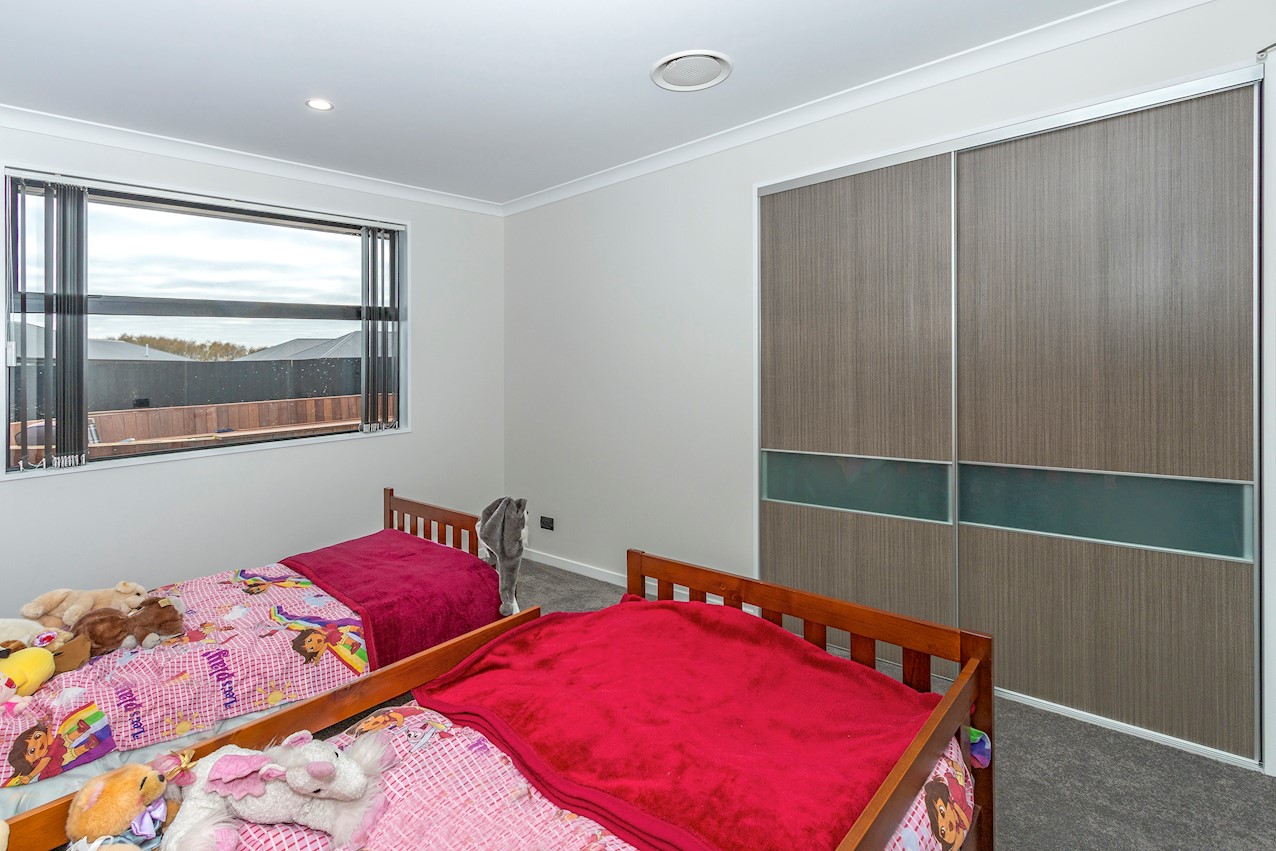This stylish Wigram residence has been designed to soak up the sun and deliver maximum family friendly functionality. The 280sqm layout boasts five bedrooms, three bathrooms and two living spaces. The master and guest bedrooms both feature fully tiled ensuites. The tiled family bathroom serves the three children’s rooms. Everyday action and relaxation revolves around the central open-plan area. The stylish kitchen is a home chef’s dream with its high-gloss finish, floor tiles and scullery with separate cooking facilities. Good indoor-outdoor flow encourages everyone to get outside and enjoy the fresh air. Dinner can be enjoyed on the patio, while kids play on the fully fenced lawn with trampoline. The overall feeling of the home is light and spacious, yet cosy in all the right places. The separate formal lounge is a super spot to spend winter nights. Rib-raft flooring, ducted heat pumps and high-quality insulation ensure the home stays warm and healthy year-round. The double garage is a bonus.