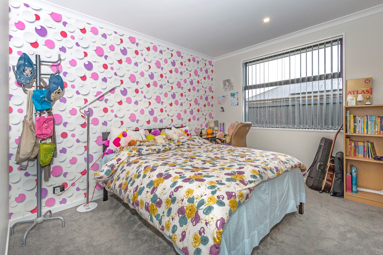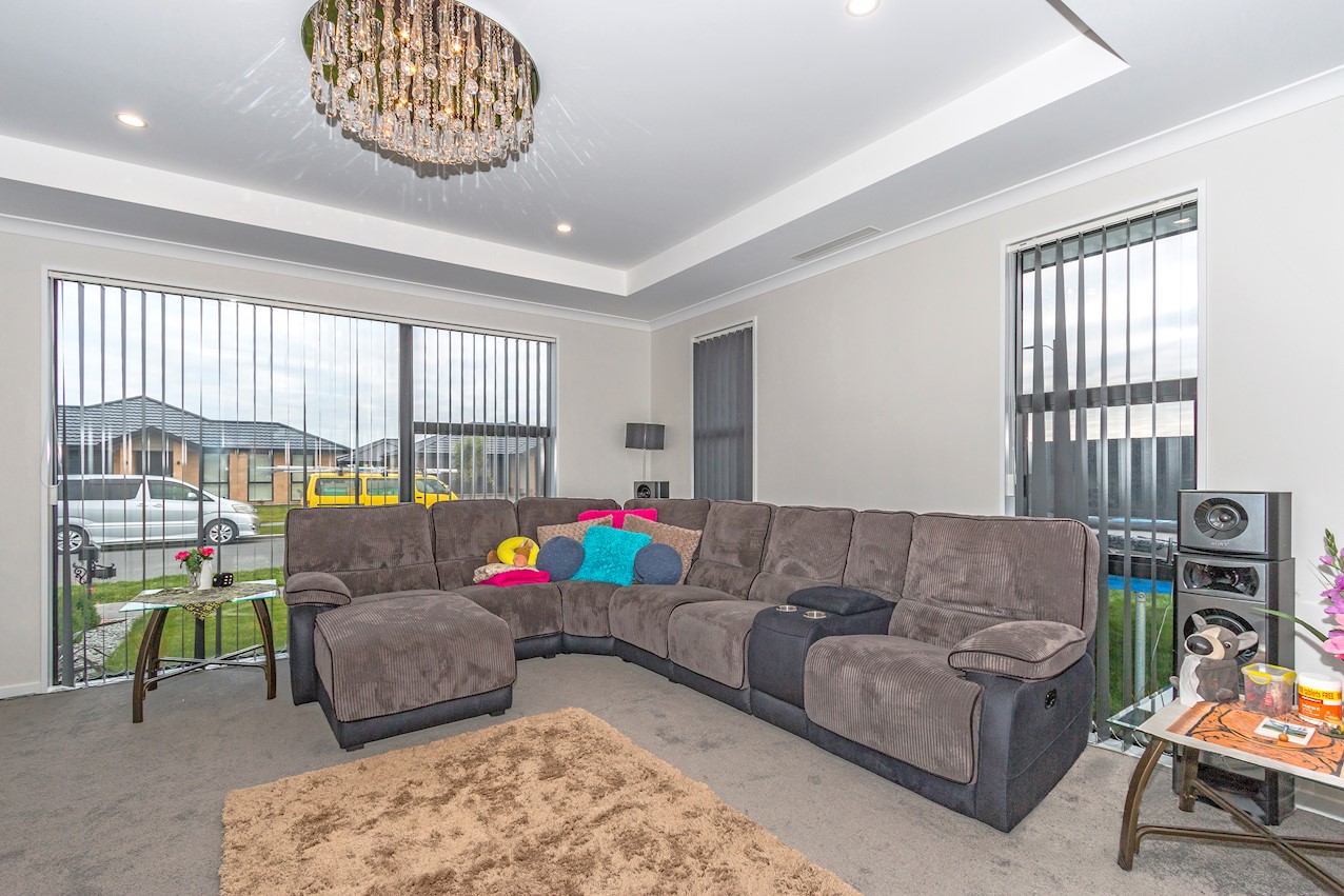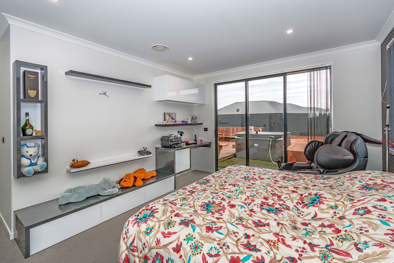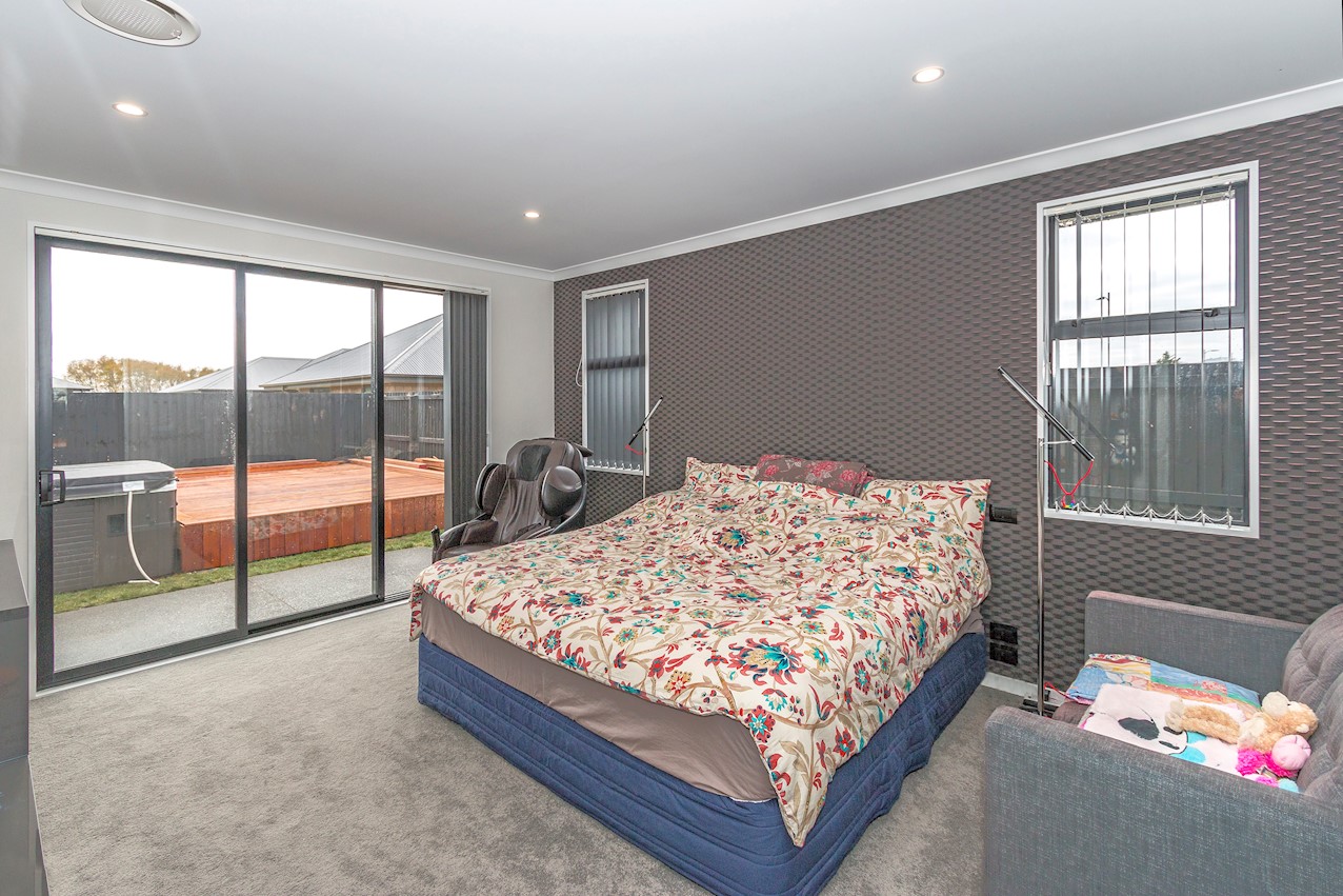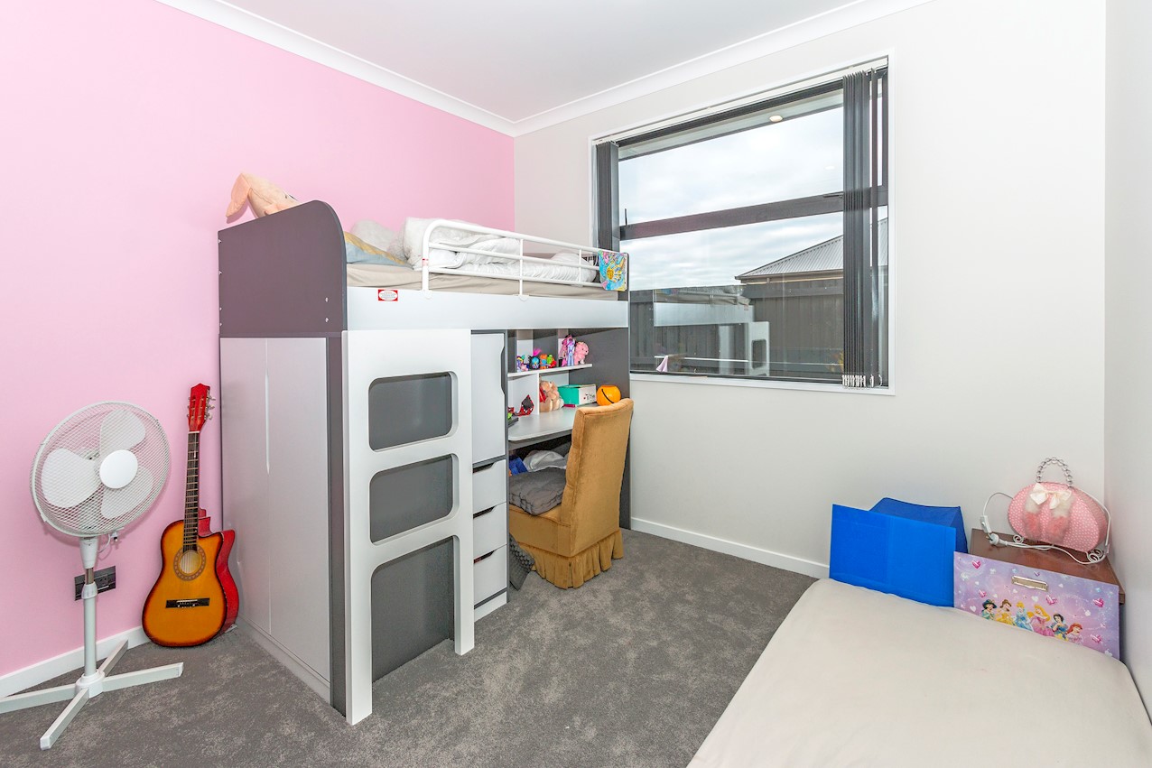 This stylish Wigram residence has been designed to soak up the sun and deliver maximum family friendly functionality. The 280sqm layout boasts five bedrooms, three bathrooms and two living spaces. The master and guest bedrooms both feature fully tiled ensuites. The tiled family bathroom serves the three children’s rooms. Everyday action and relaxation revolves around the central open-plan area. The stylish kitchen is a home chef’s dream with its high-gloss finish, floor tiles and scullery with separate cooking facilities. Good indoor-outdoor flow encourages everyone to get outside and enjoy the fresh air. Dinner can be enjoyed on the patio, while kids play on the fully fenced lawn with trampoline. The overall feeling of the home is light and spacious, yet cosy in all the right places. The separate formal lounge is a super spot to spend winter nights. Rib-raft flooring, ducted heat pumps and high-quality insulation ensure the home stays warm and healthy year-round. The double garage is a bonus.
