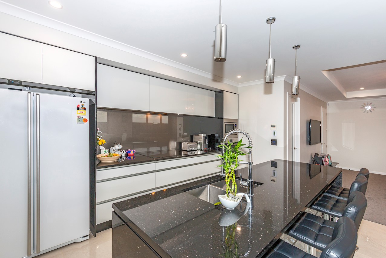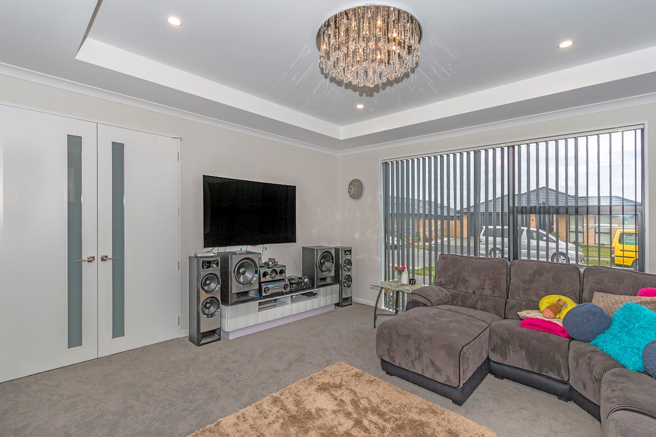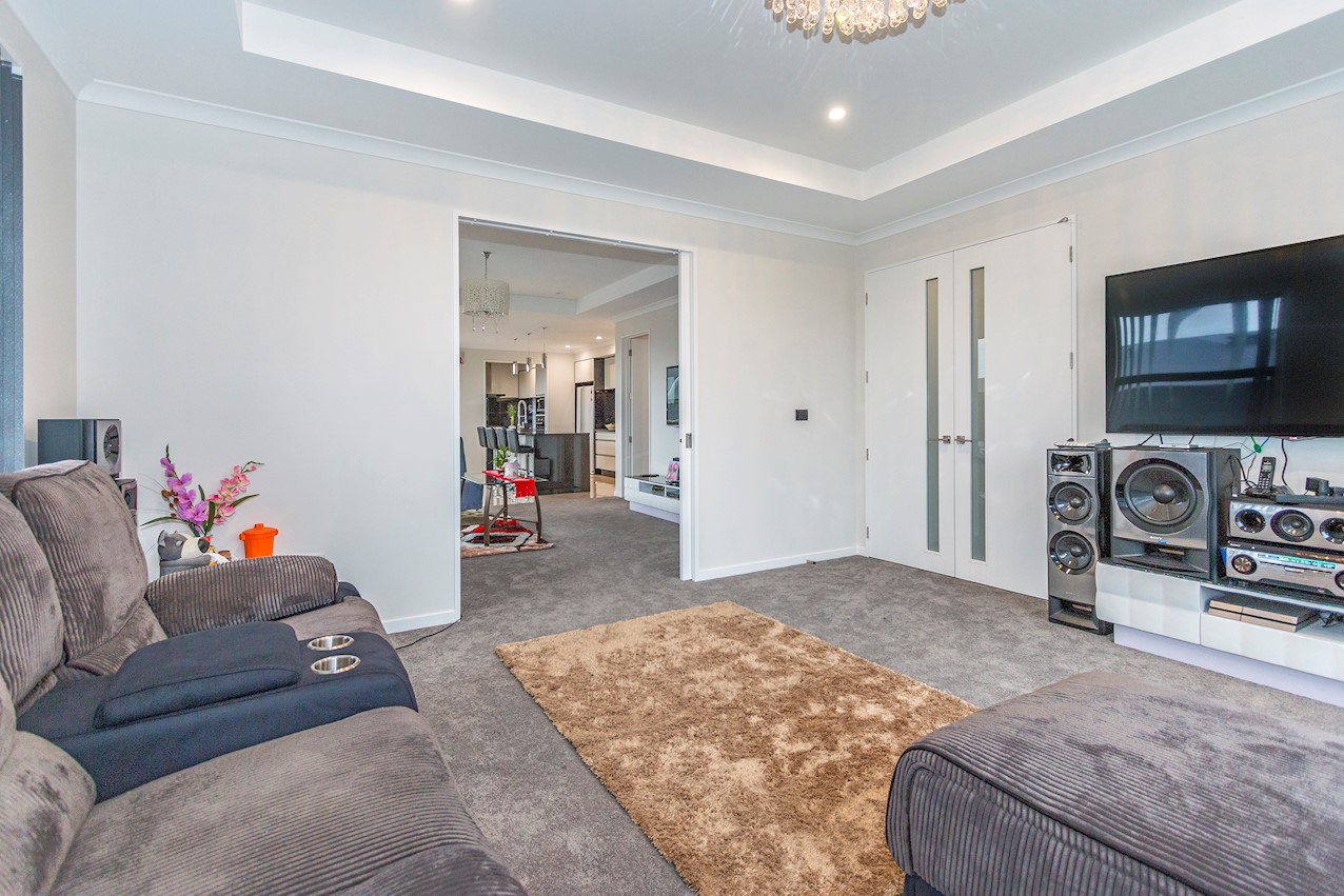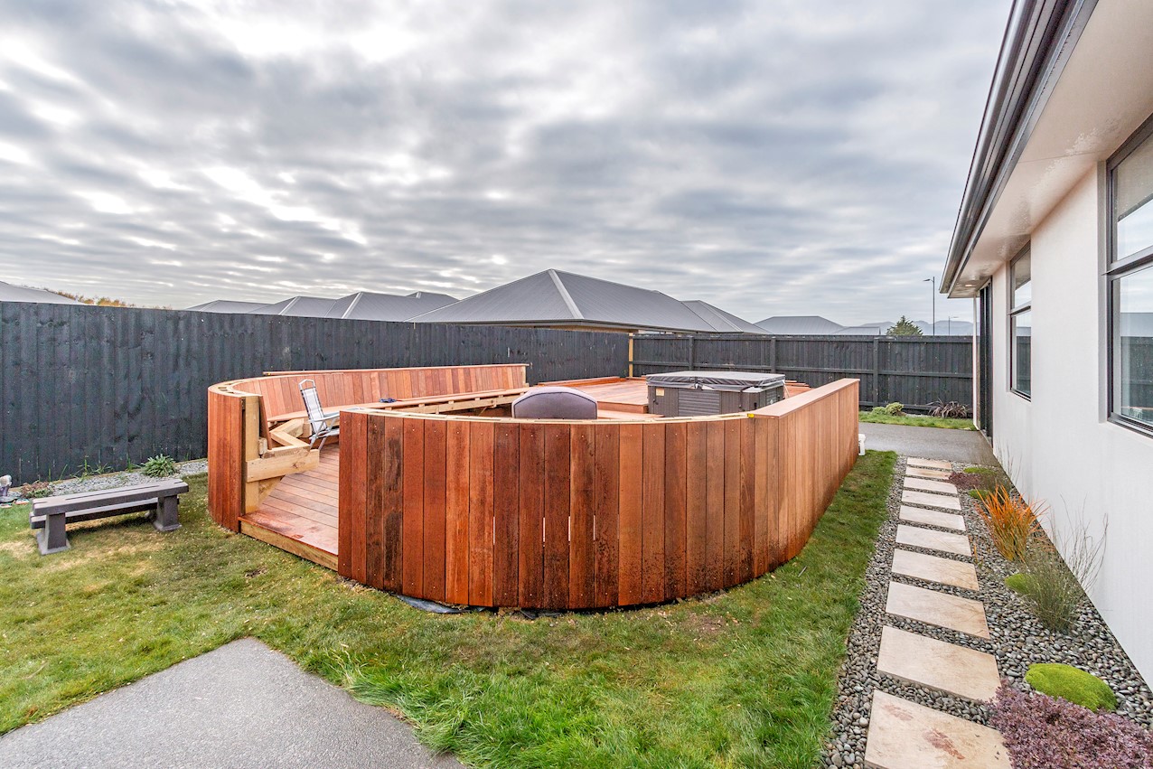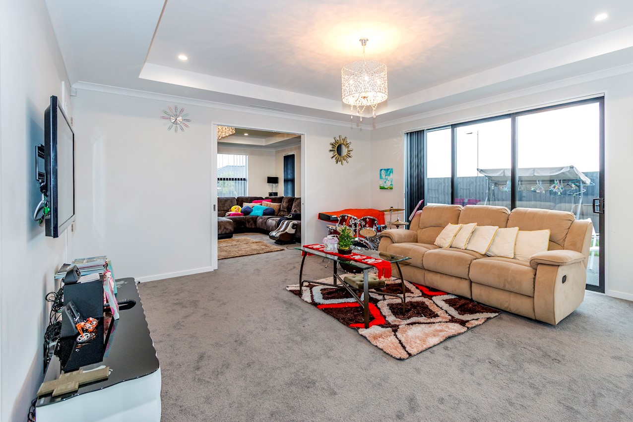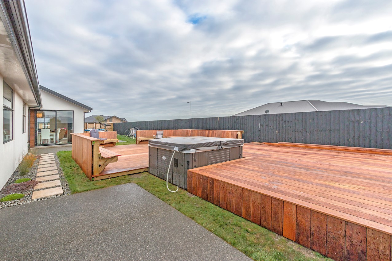 This stylish Wigram residence has been designed to soak up the sun and deliver maximum family friendly functionality. The 280sqm layout boasts five bedrooms, three bathrooms and two living spaces. The master and guest bedrooms both feature fully tiled ensuites. The tiled family bathroom serves the three children’s rooms. Everyday action and relaxation revolves around the central open-plan area. The stylish kitchen is a home chef’s dream with its high-gloss finish, floor tiles and scullery with separate cooking facilities. Good indoor-outdoor flow encourages everyone to get outside and enjoy the fresh air. Dinner can be enjoyed on the patio, while kids play on the fully fenced lawn with trampoline. The overall feeling of the home is light and spacious, yet cosy in all the right places. The separate formal lounge is a super spot to spend winter nights. Rib-raft flooring, ducted heat pumps and high-quality insulation ensure the home stays warm and healthy year-round. The double garage is a bonus.