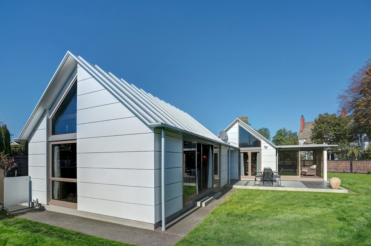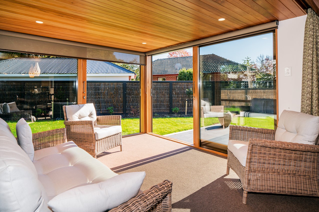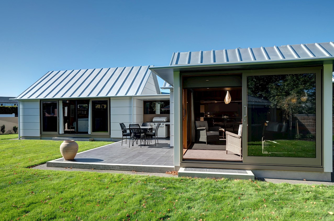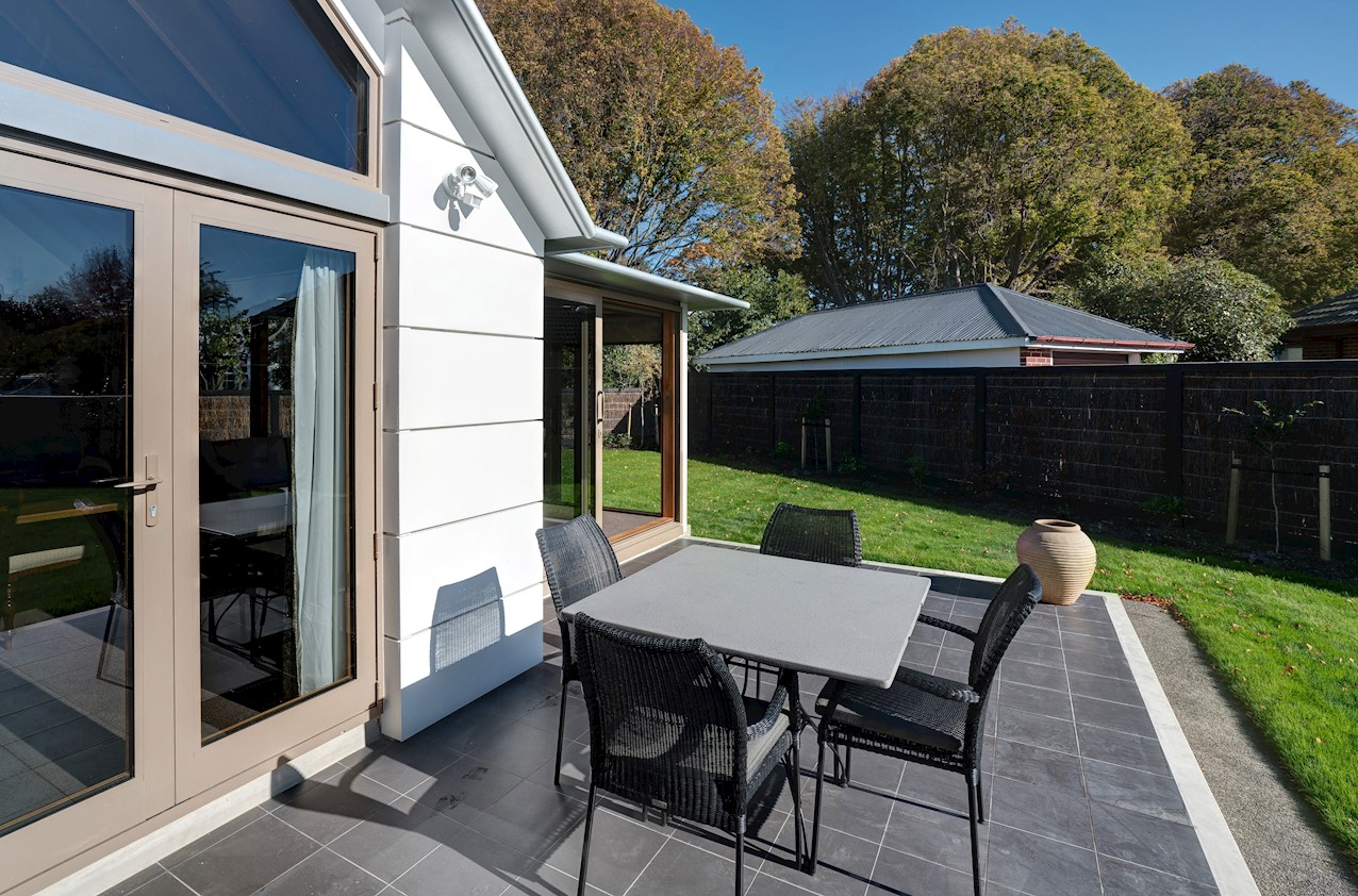 Things have worked out nicely for the owners of this fine Fendalton home. A reworking of their original 1966 residence, destroyed in the Christchurch earthquakes, this is part replica, part reincarnation. The new build benefits from the use of modern building products and methodologies, creating a hard-wearing and comfortable home that’s ready to face the future. The former living-room ceiling was rescued, relocated and reinstated above new and improved foundations. Exposed beams draw the eye to the vaulted ceiling, with tongue-and-groove lining carrying through to the sunroom. A welcome addition to the home’s original floorplan, this space flows to an easy-breezy alfresco area with a barbecue nook. The lush lawn is soothing to the eye. Solar panels on the roof bask in the sun and donate to power usage. Terra Lana wall batts provide a natural solution to insulation. Large walk-in showers in the tiled bathrooms are a convenient luxury for the retired clients who couldn’t be happier with their home.