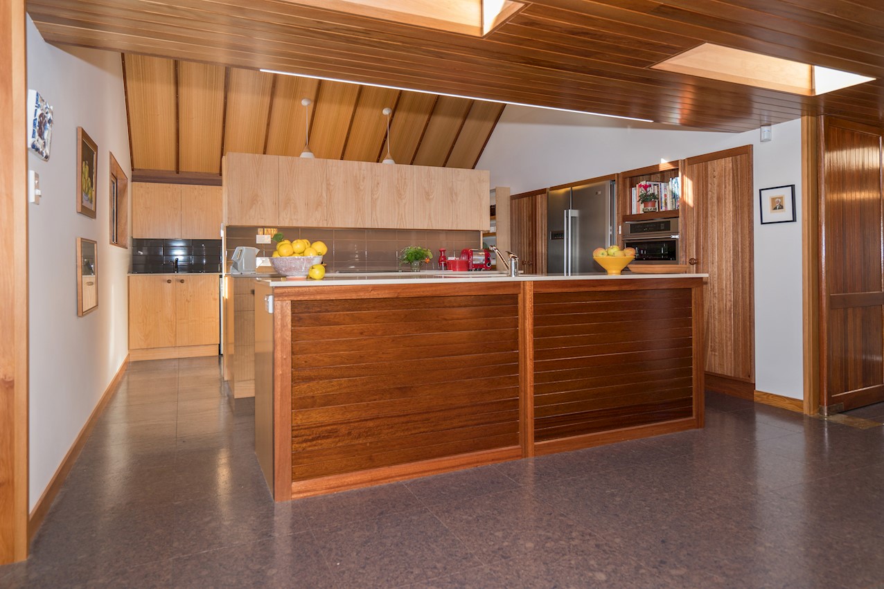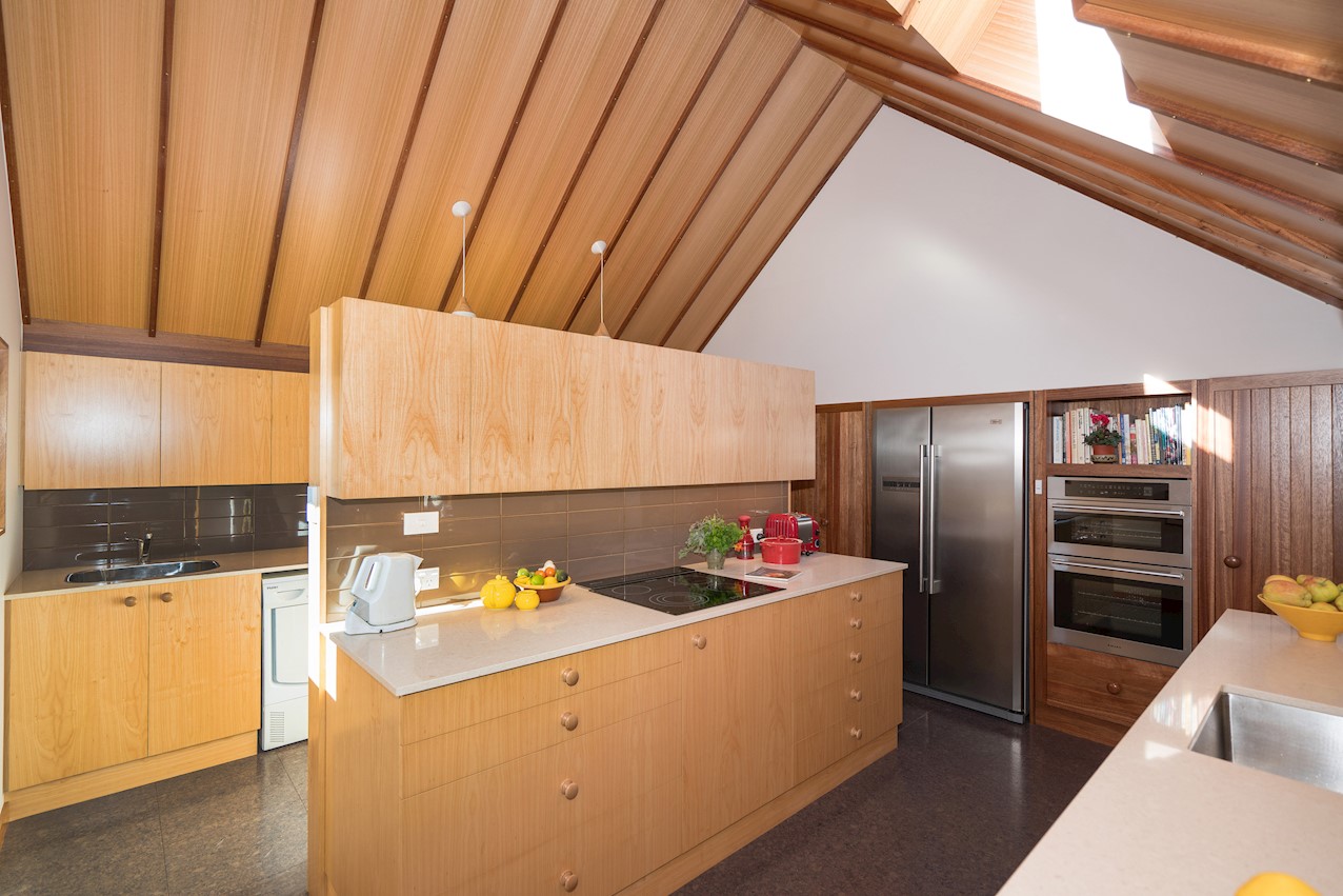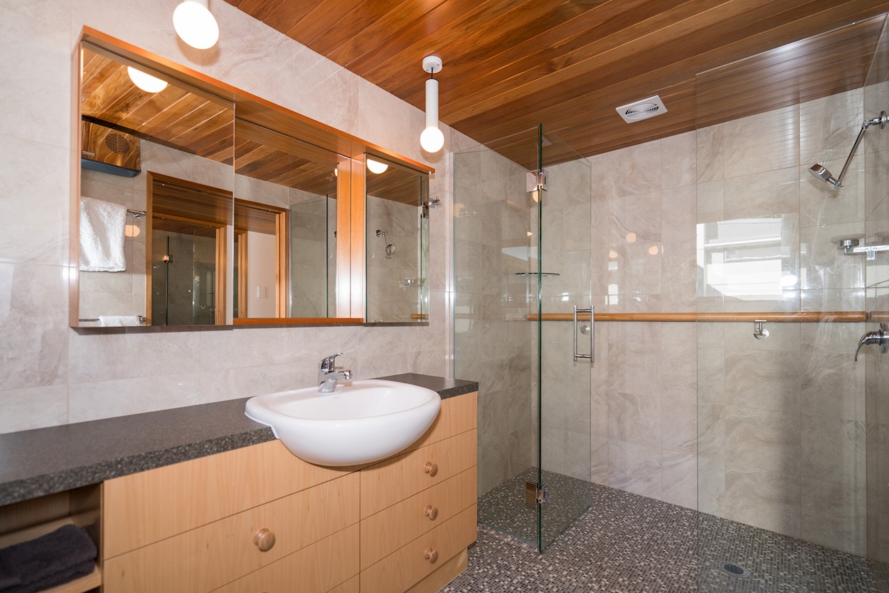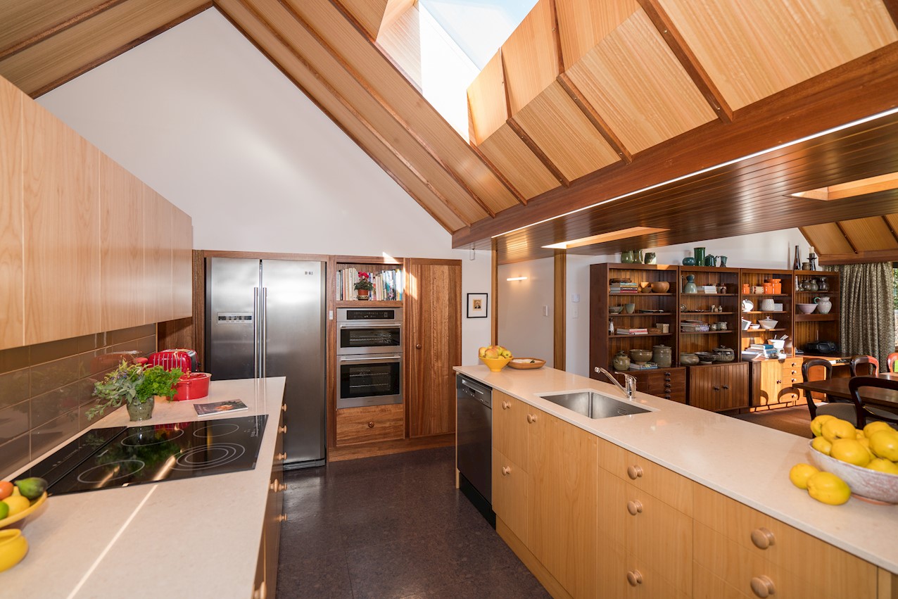 Things have worked out nicely for the owners of this fine Fendalton home. A reworking of their original 1966 residence, destroyed in the Christchurch earthquakes, this is part replica, part reincarnation. The new build benefits from the use of modern building products and methodologies, creating a hard-wearing and comfortable home that’s ready to face the future. The former living-room ceiling was rescued, relocated and reinstated above new and improved foundations. Exposed beams draw the eye to the vaulted ceiling, with tongue-and-groove lining carrying through to the sunroom. A welcome addition to the home’s original floorplan, this space flows to an easy-breezy alfresco area with a barbecue nook. The lush lawn is soothing to the eye. Solar panels on the roof bask in the sun and donate to power usage. Terra Lana wall batts provide a natural solution to insulation. Large walk-in showers in the tiled bathrooms are a convenient luxury for the retired clients who couldn’t be happier with their home.