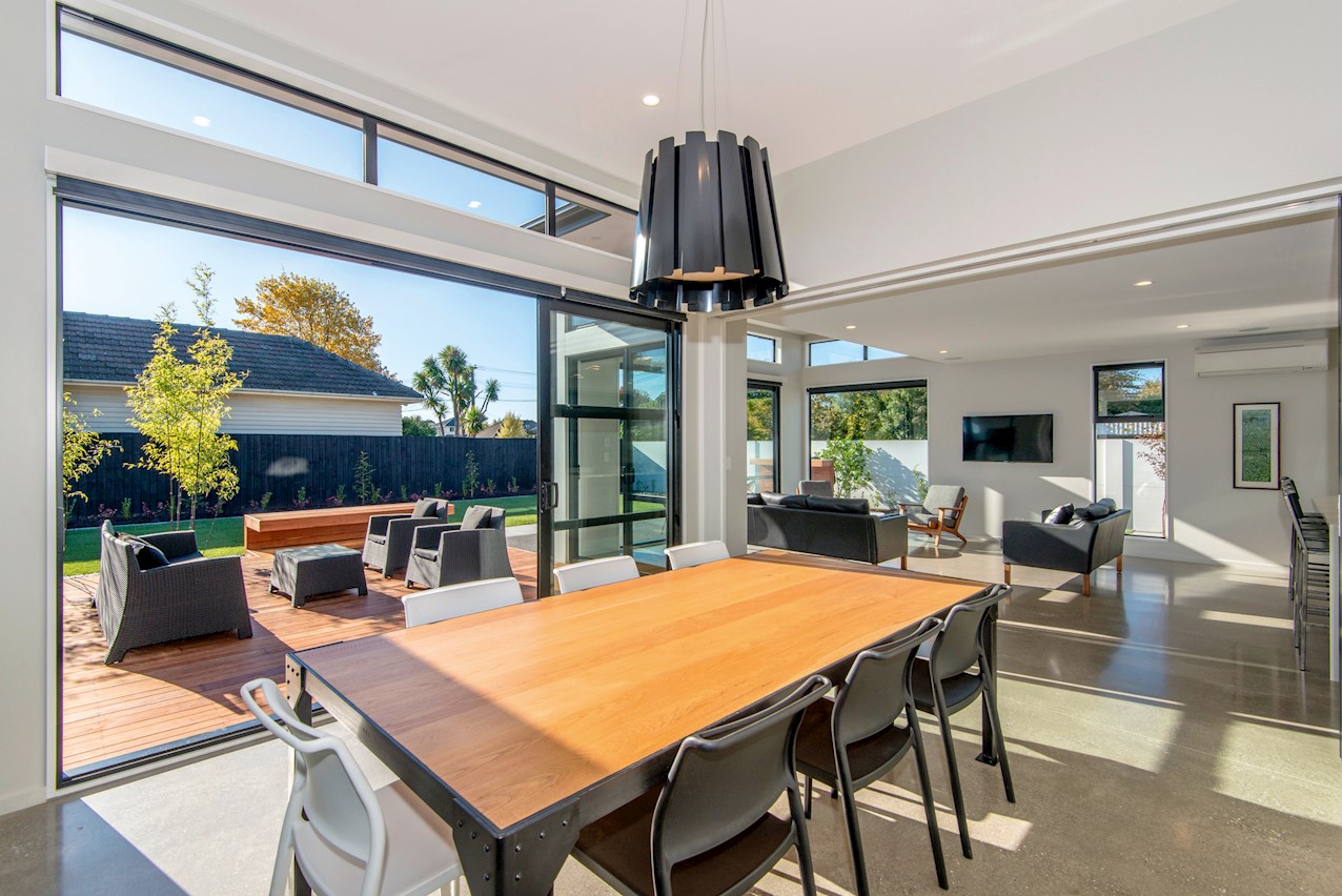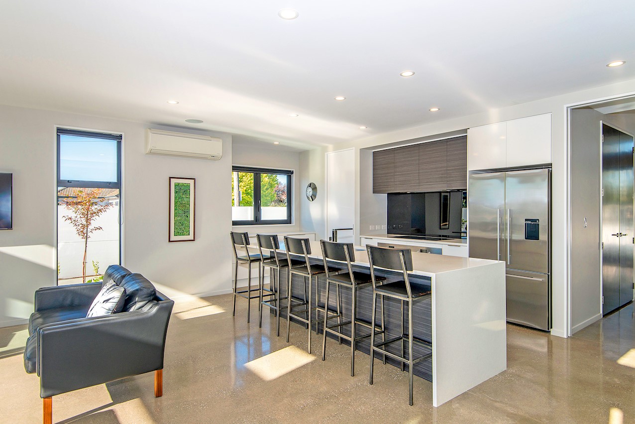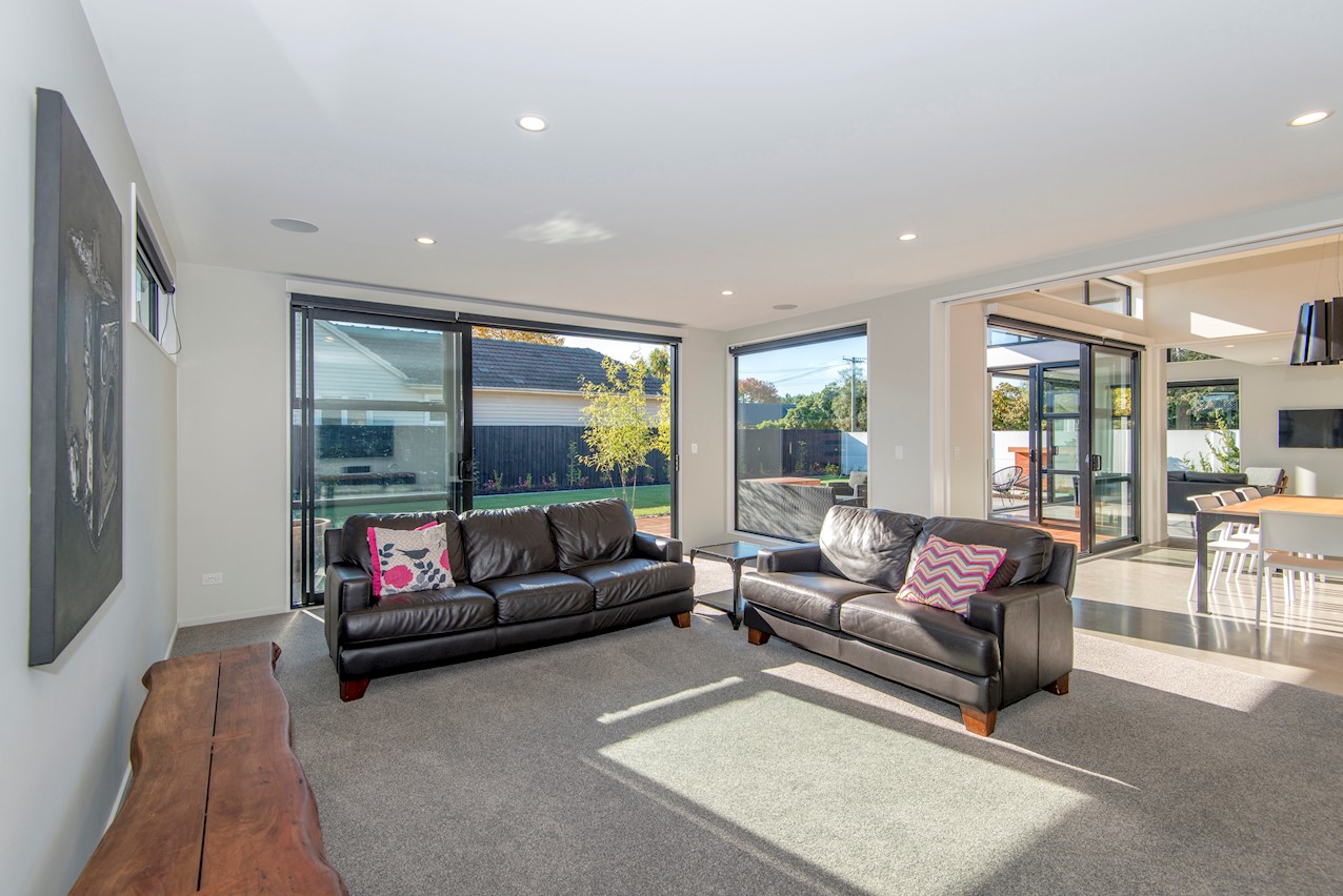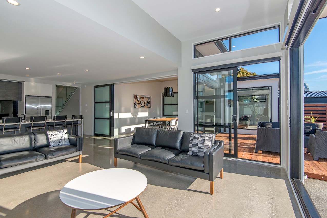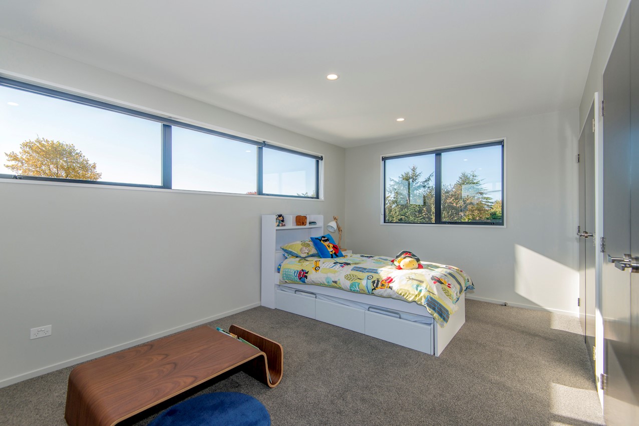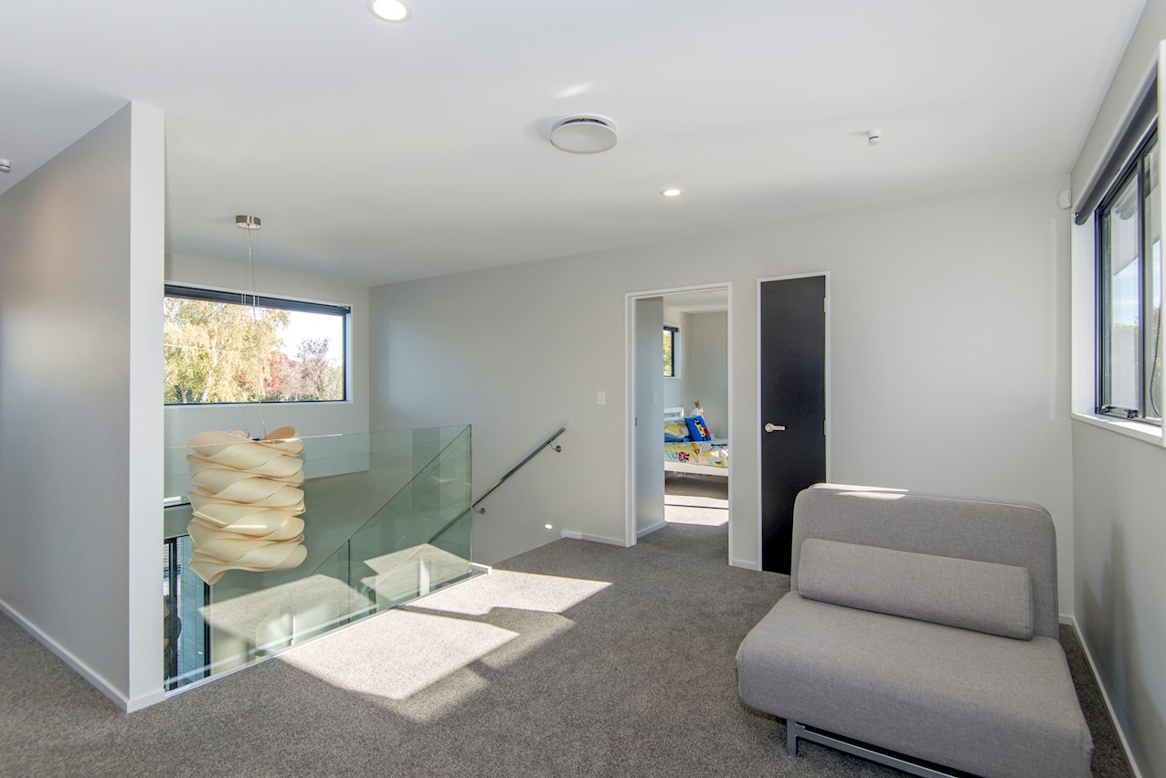 This modern four-bedroom family home is an entertainer’s dream in Strowan. The living room and lounge are connected via the dining room. Tall windows and clerestories draw in natural light throughout all four seasons. Sleek polished concrete floors bask in all-day rays. The heat is radiated back into the home late into the evening. In summer, open the doors to create an amazing area for barbecues and entertainment. Alternatively, stay in and close the New Yorker stackers to create separate family friendly spaces. Kids can entertain themselves on one side, while parents enjoy some well-deserved peace and quiet or time with friends. The home’s entrance welcomes with style and open arms. A modern light shade illuminates the area which leads to the second storey. The large landing functions as a third lounge to accommodate growing children and their friends. Two bathrooms are finished in style with classic fittings and lines. In-slab heating and solar hot water are great features of this fantastic 326sqm home.
