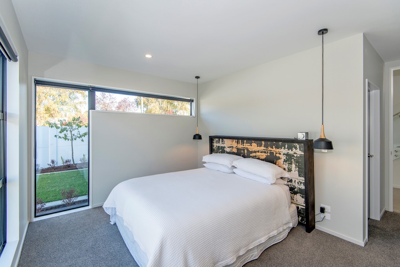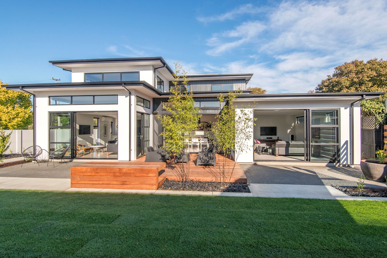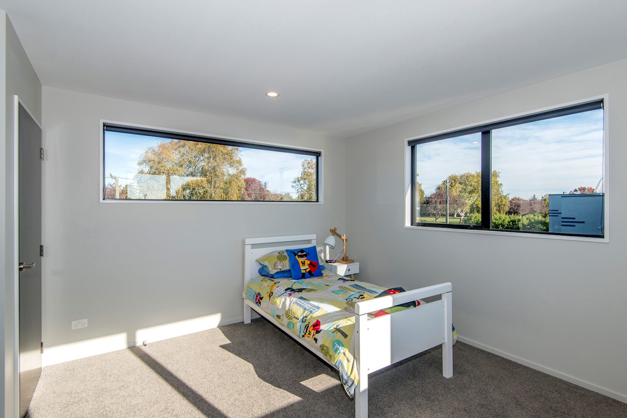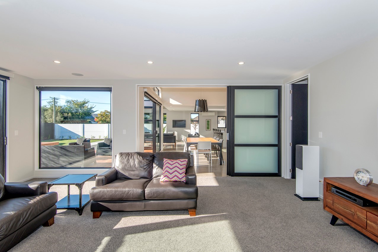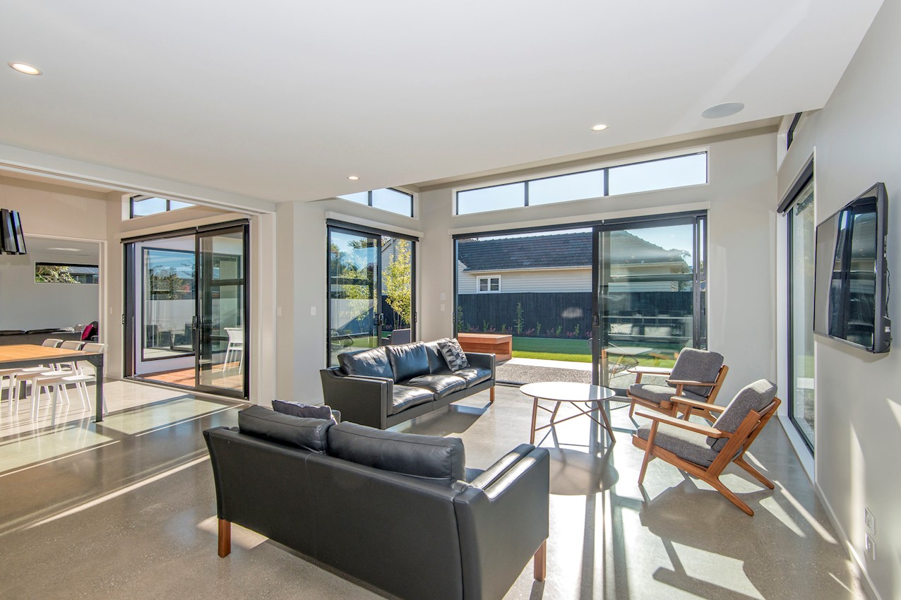 This modern four-bedroom family home is an entertainer’s dream in Strowan. The living room and lounge are connected via the dining room. Tall windows and clerestories draw in natural light throughout all four seasons. Sleek polished concrete floors bask in all-day rays. The heat is radiated back into the home late into the evening. In summer, open the doors to create an amazing area for barbecues and entertainment. Alternatively, stay in and close the New Yorker stackers to create separate family friendly spaces. Kids can entertain themselves on one side, while parents enjoy some well-deserved peace and quiet or time with friends. The home’s entrance welcomes with style and open arms. A modern light shade illuminates the area which leads to the second storey. The large landing functions as a third lounge to accommodate growing children and their friends. Two bathrooms are finished in style with classic fittings and lines. In-slab heating and solar hot water are great features of this fantastic 326sqm home.