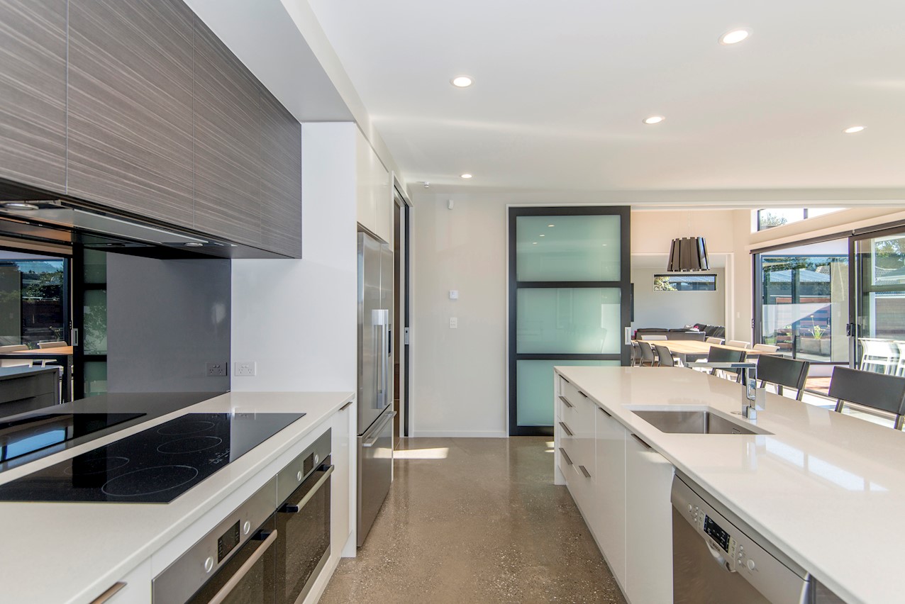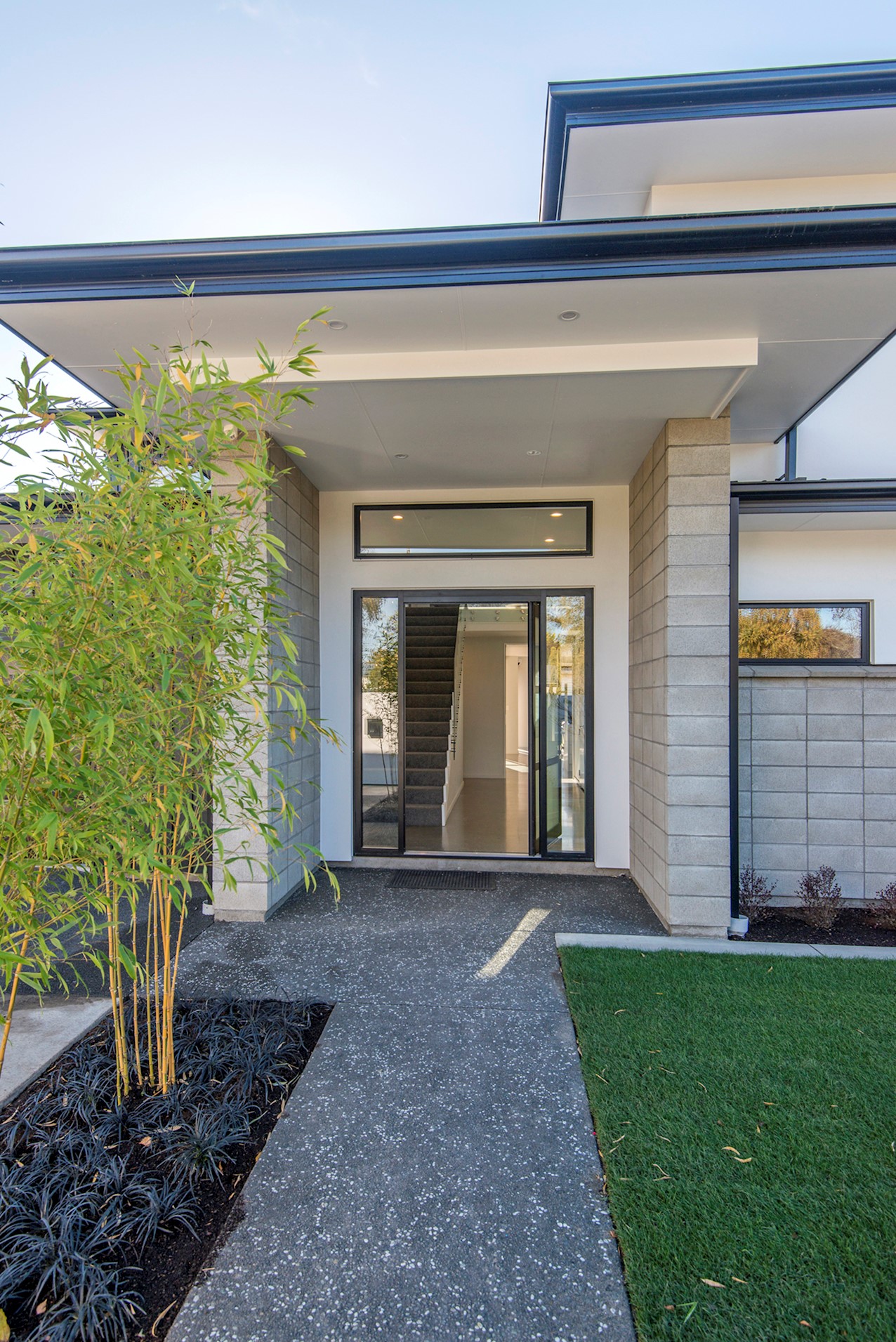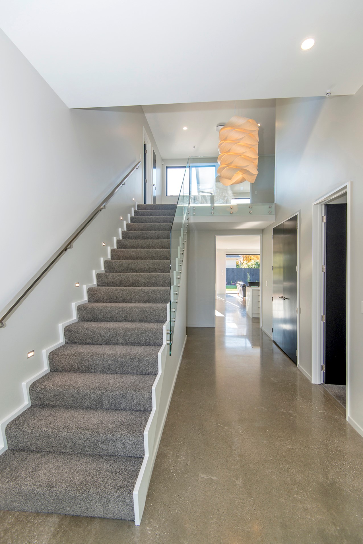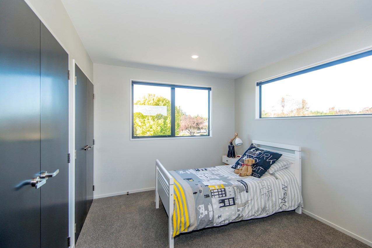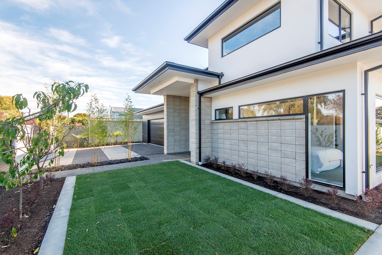 This modern four-bedroom family home is an entertainer’s dream in Strowan. The living room and lounge are connected via the dining room. Tall windows and clerestories draw in natural light throughout all four seasons. Sleek polished concrete floors bask in all-day rays. The heat is radiated back into the home late into the evening. In summer, open the doors to create an amazing area for barbecues and entertainment. Alternatively, stay in and close the New Yorker stackers to create separate family friendly spaces. Kids can entertain themselves on one side, while parents enjoy some well-deserved peace and quiet or time with friends. The home’s entrance welcomes with style and open arms. A modern light shade illuminates the area which leads to the second storey. The large landing functions as a third lounge to accommodate growing children and their friends. Two bathrooms are finished in style with classic fittings and lines. In-slab heating and solar hot water are great features of this fantastic 326sqm home.