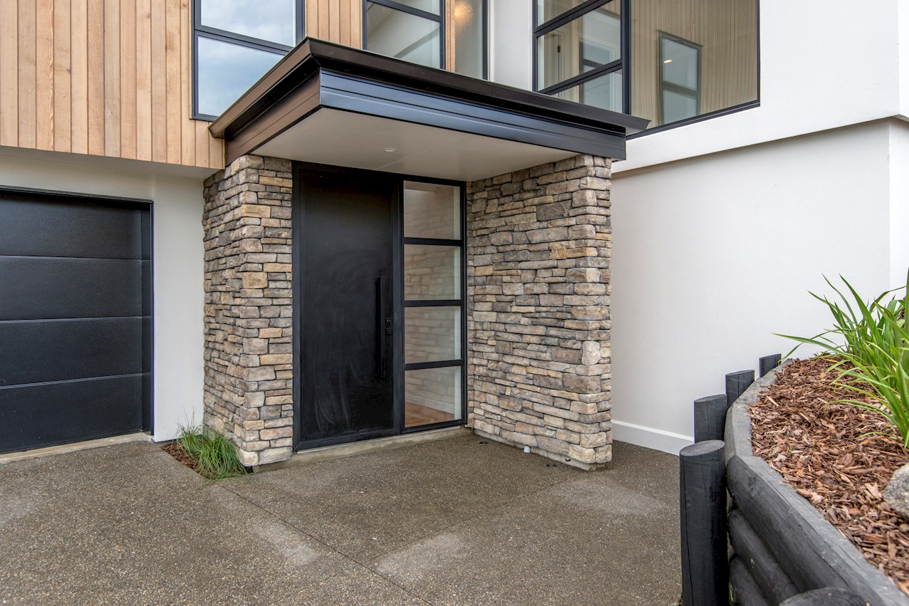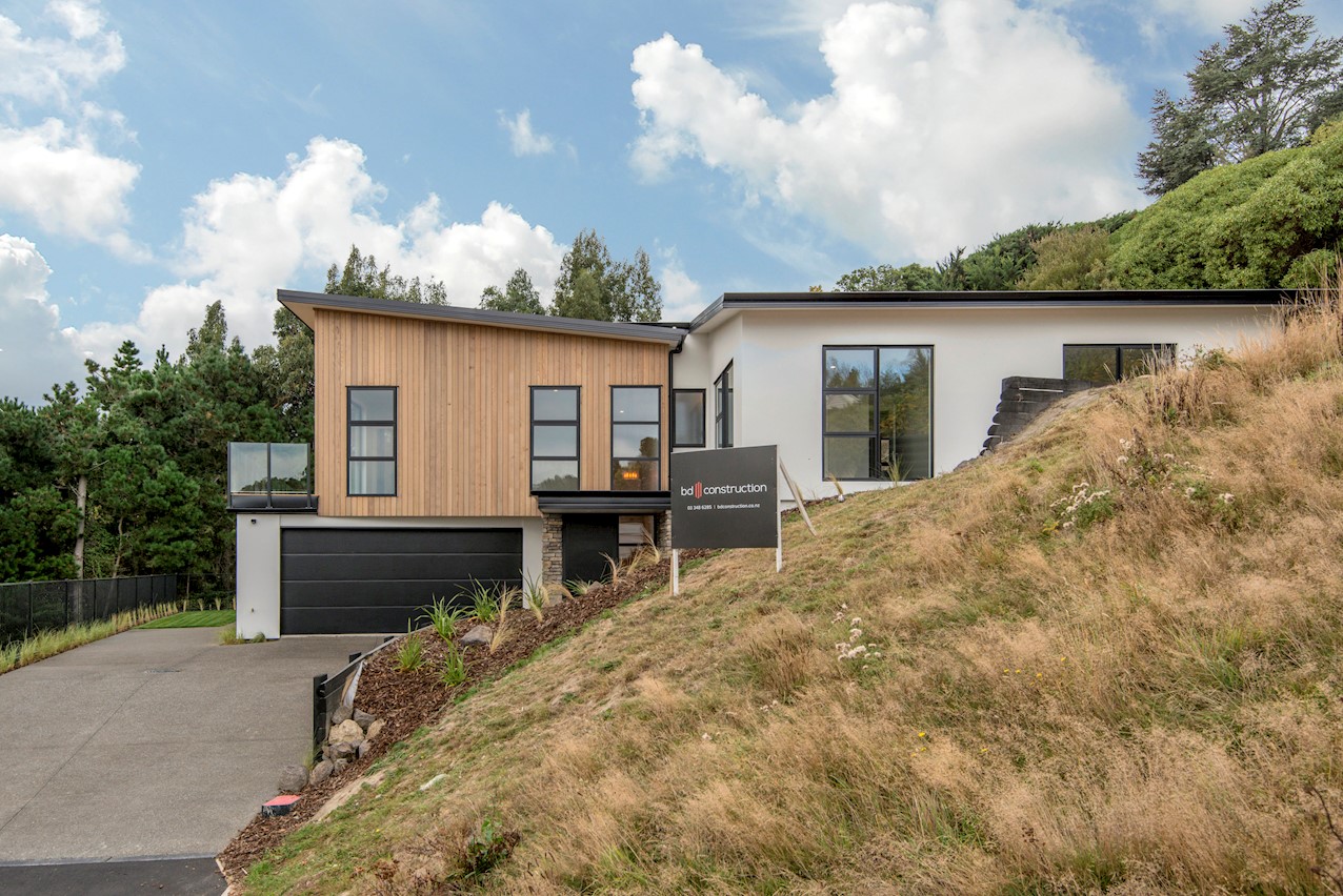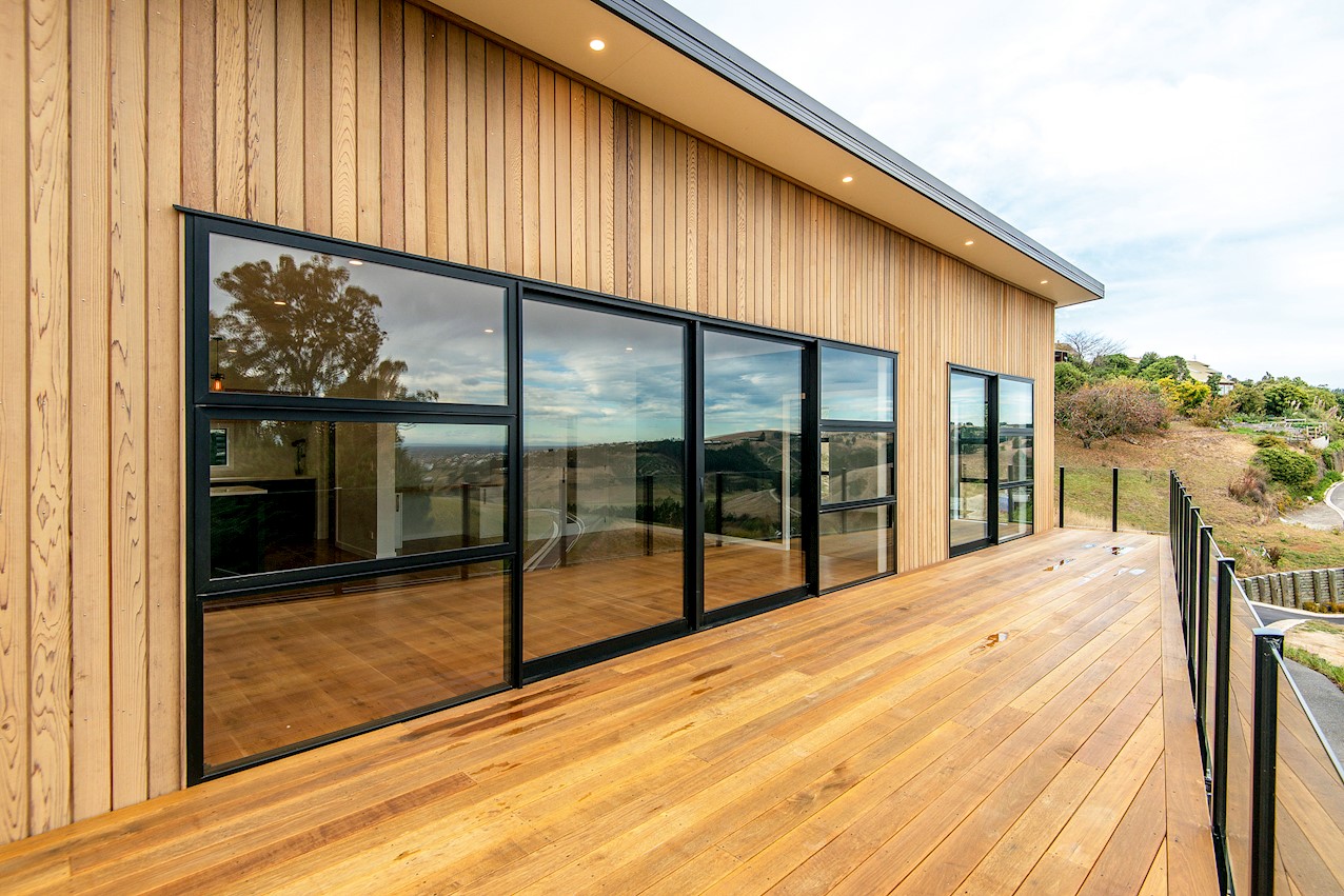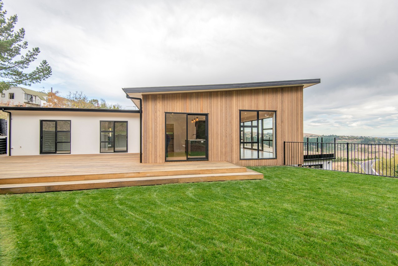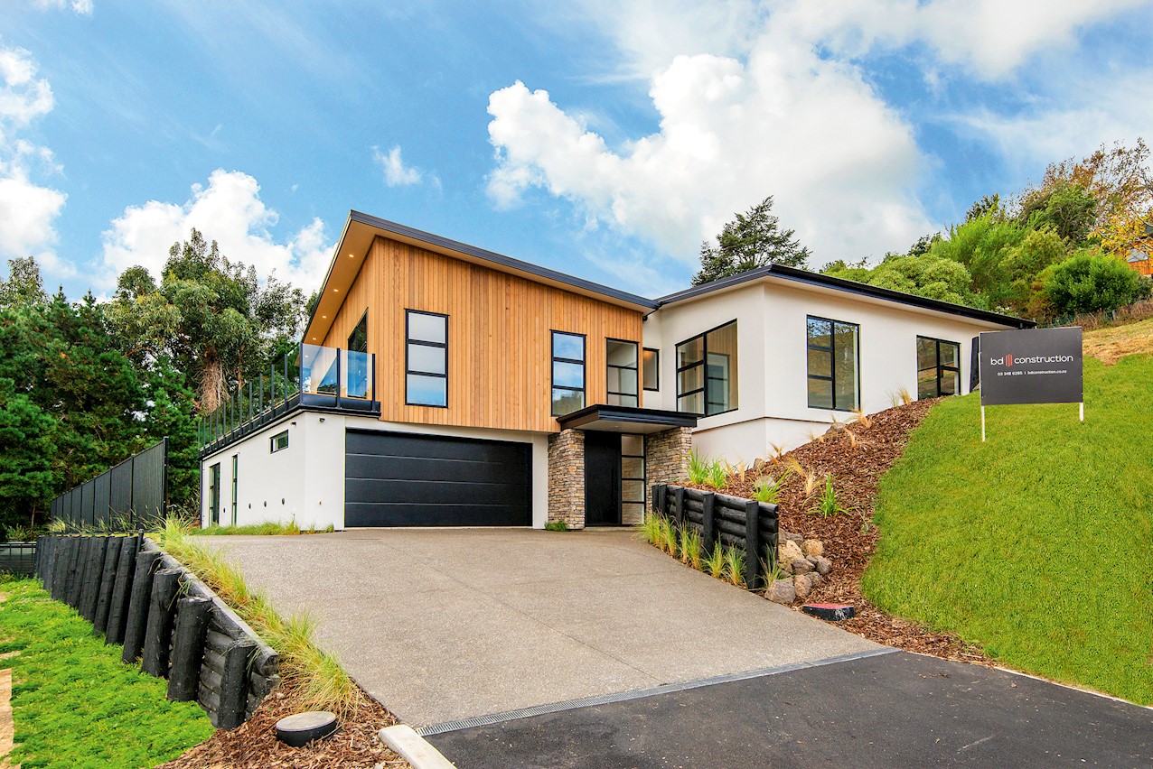 Set high in the Cashmere Hills above Christchurch, this five-bedroom, two-storey home is a stunner. Mature trees and views to the Southern Alps create a wonderful backdrop for modern living. Stepped into the hillside and with split-level garden terracing, the steep section lives up to its potential. Cedar and stone cladding create striking appeal, enhanced with black and white accents. Internal materials echo the exterior, with light oak timber floors, white walls, stone benchtops and a sleek black kitchen with black tapware and sink. High ceilings lend the living spaces an airy feel and large glass sliders and a balcony maximise the view. The kitchen flows out to a large sun-soaked deck for alfresco dining and entertaining. Two bedrooms open onto the rear deck, while the master enjoys views to the Alps. The ensuite features a double sink and shower with sleek black tiling. On the ground floor, a secluded guest suite overlooks the lower garden terrace to the outdoors. There’s no shortage of views to please the eye.