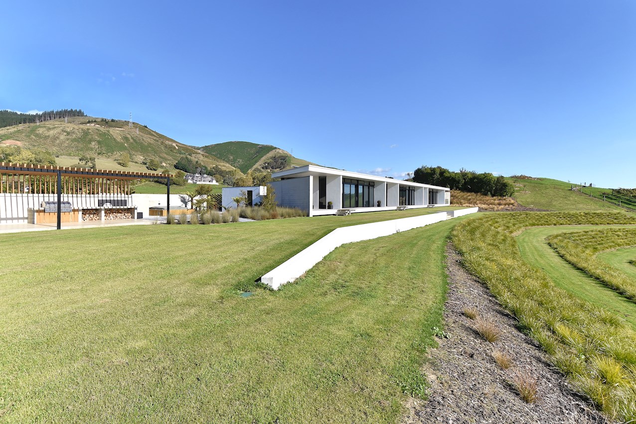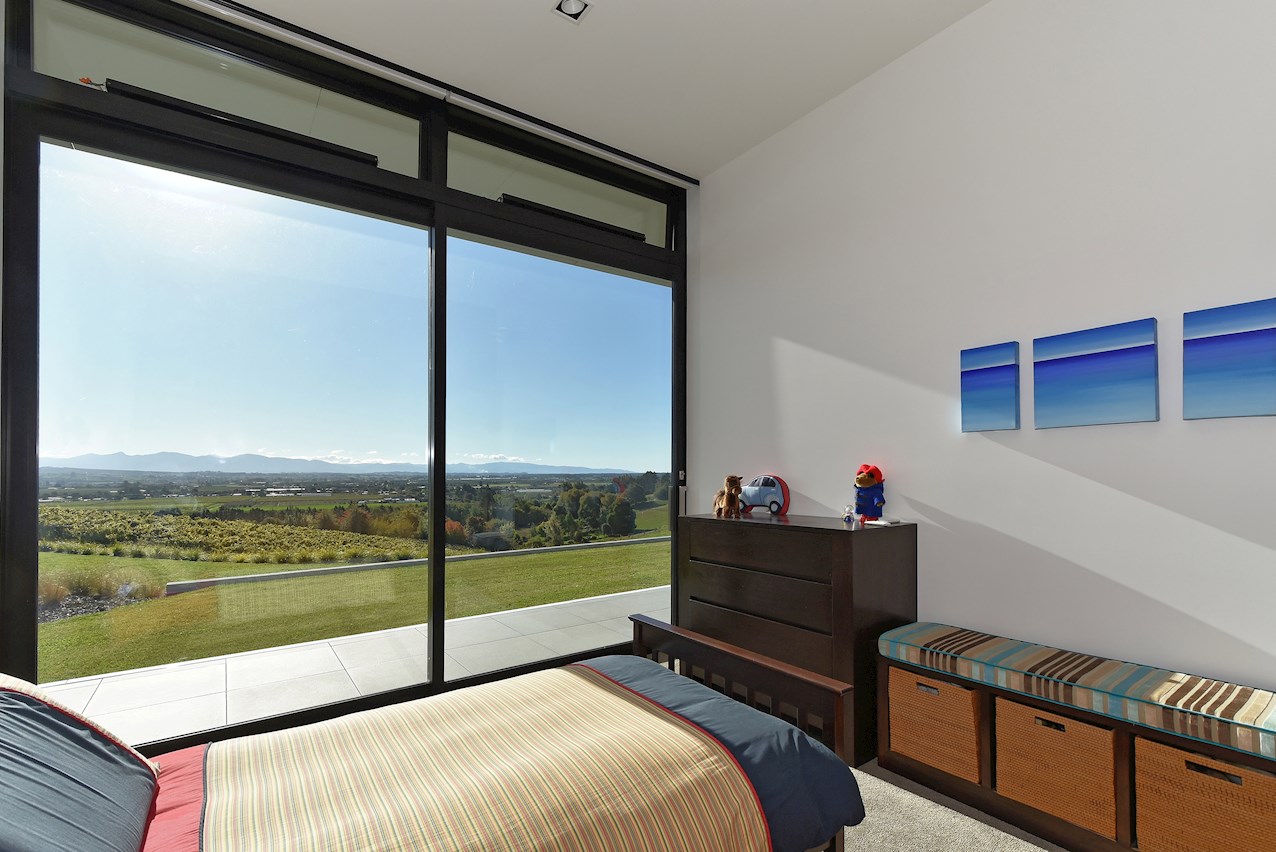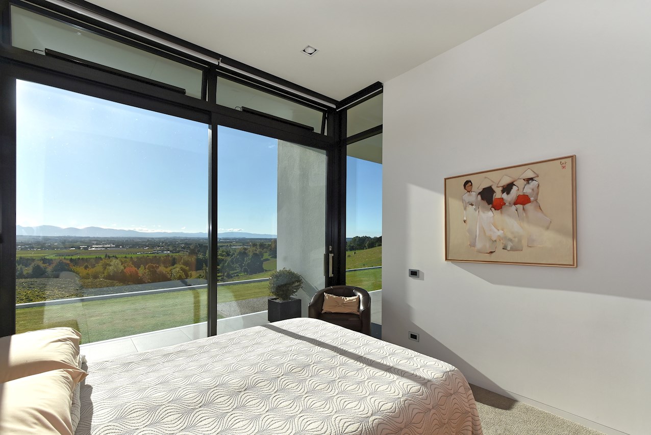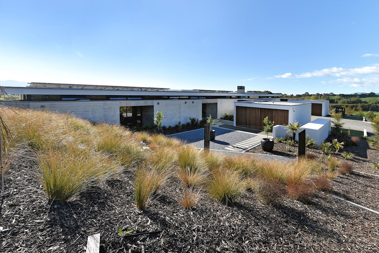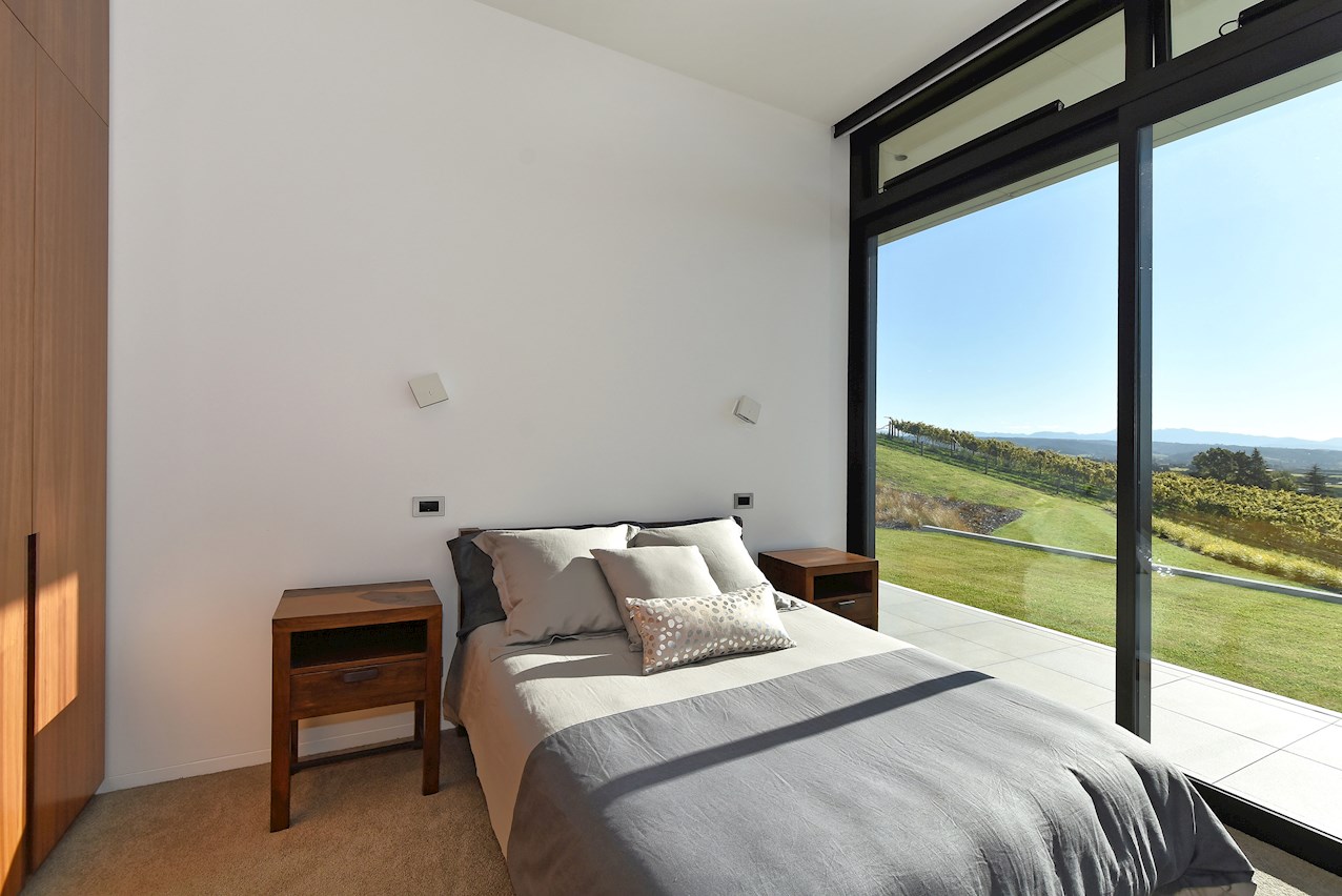 All glass and concrete, the stunning single-level façade stretches an incredible 60m. That’s one way to keep a low profile on a big budget. Warren and Mahoney architects have gone to great lengths to ensure this home in Hope, Nelson, makes a striking impression both inside and out. The spacious open-plan living area embraces residents with its warming walnut panelling. The timber is also used in the rear corridor, doors and bespoke cabinetry. The kitchen is an entertainer’s haven with engaging views to Tasman Bay over the vineyard and Waimea Plains, the perfect excuse to raise a toast. Five bedrooms, three bathrooms and a separate lounge sit more than comfortably on the 500sqm footprint. Plus, there’s a self-contained studio. This house is also highly sustainable, with 44 PV panels and 10 water-heating panels located outside. Timers take care of underfloor heating. Superior insulation, low-E argon-filled windows and a polystyrene underfloor slab keep things extra cosy.