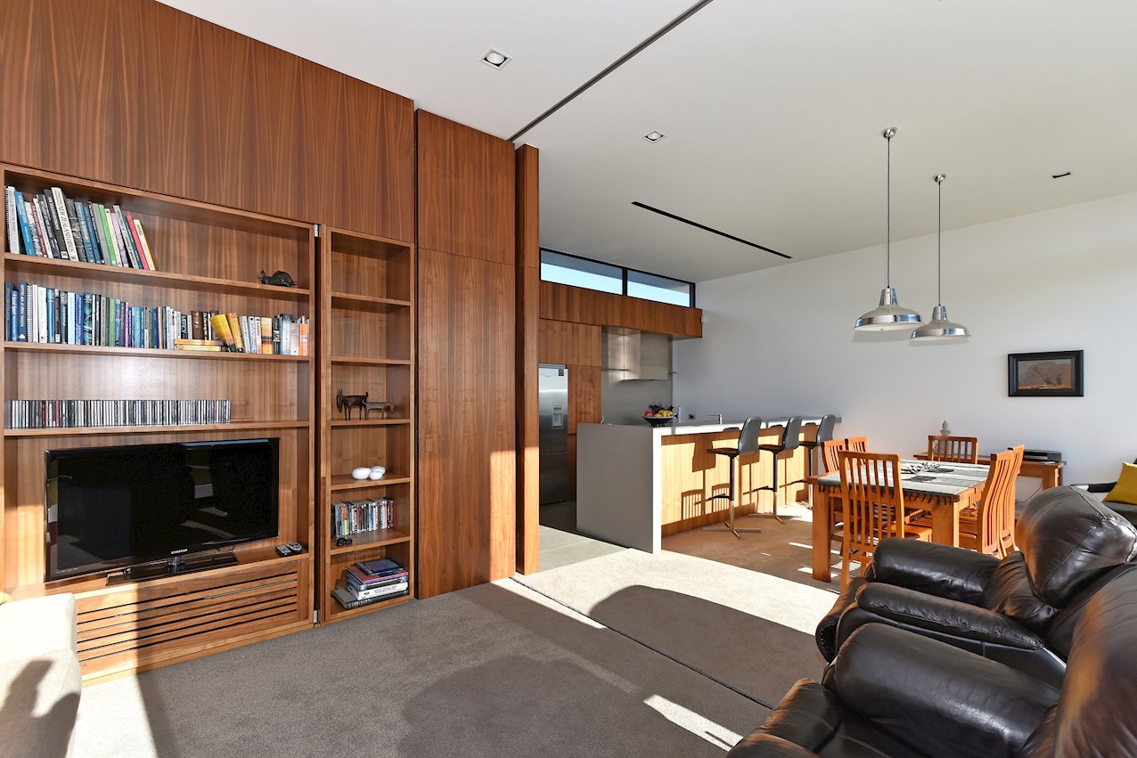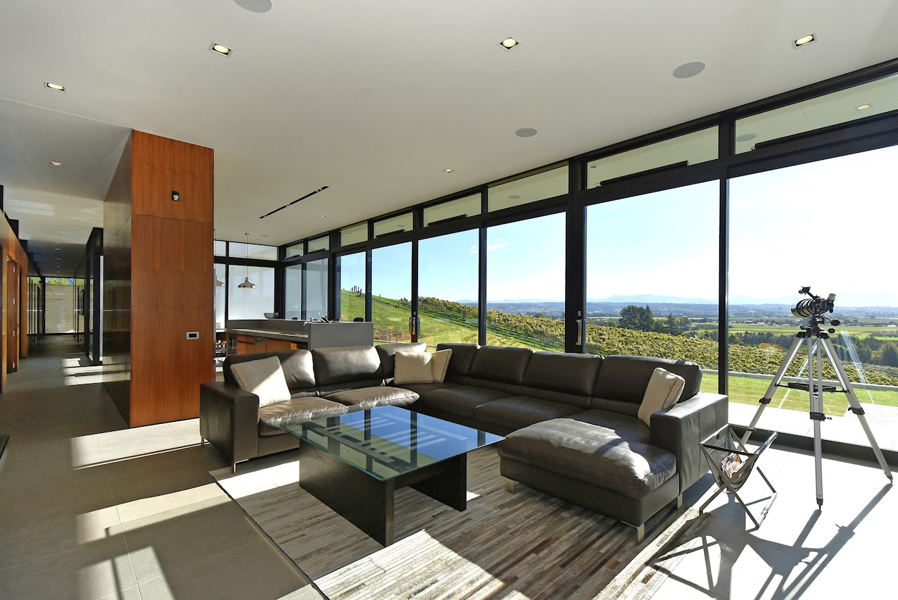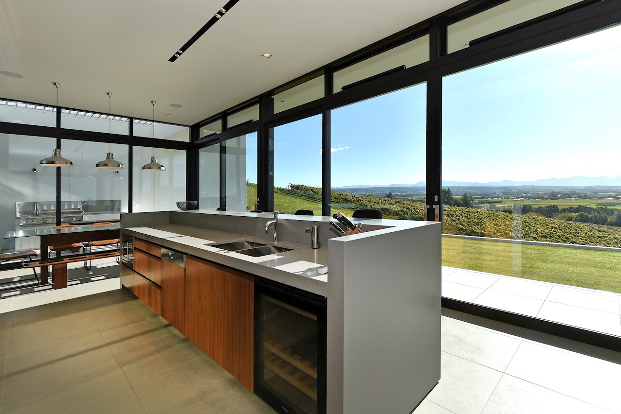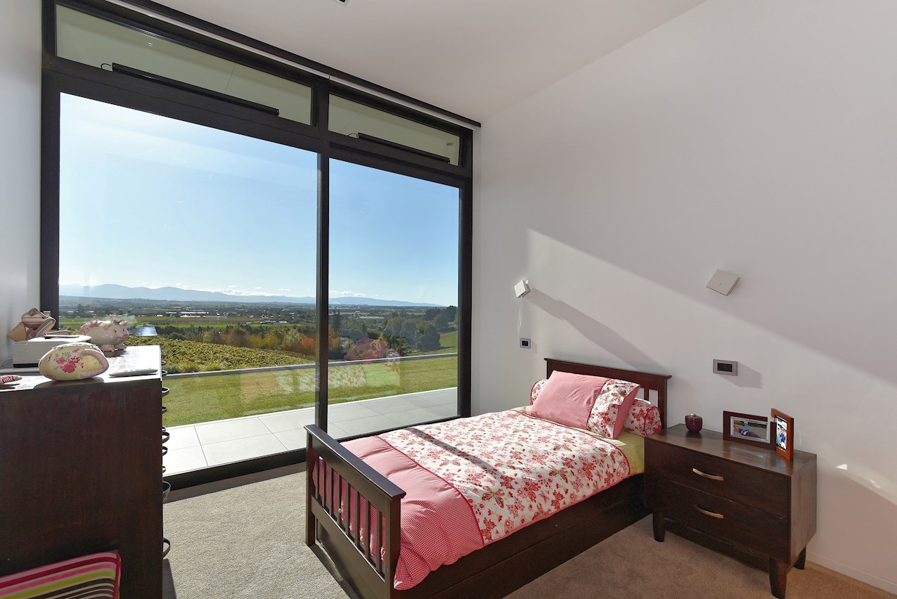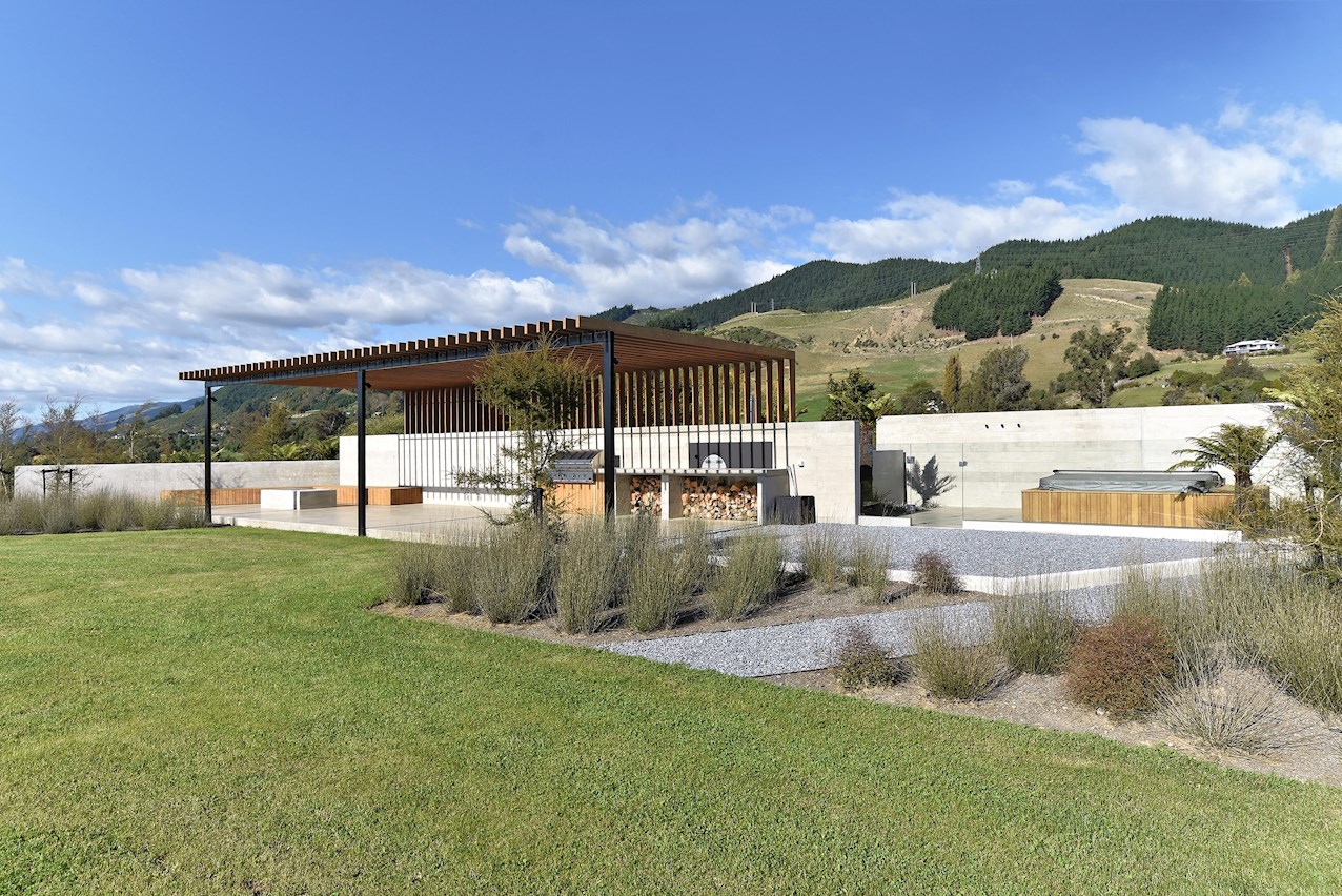 All glass and concrete, the stunning single-level façade stretches an incredible 60m. That’s one way to keep a low profile on a big budget. Warren and Mahoney architects have gone to great lengths to ensure this home in Hope, Nelson, makes a striking impression both inside and out. The spacious open-plan living area embraces residents with its warming walnut panelling. The timber is also used in the rear corridor, doors and bespoke cabinetry. The kitchen is an entertainer’s haven with engaging views to Tasman Bay over the vineyard and Waimea Plains, the perfect excuse to raise a toast. Five bedrooms, three bathrooms and a separate lounge sit more than comfortably on the 500sqm footprint. Plus, there’s a self-contained studio. This house is also highly sustainable, with 44 PV panels and 10 water-heating panels located outside. Timers take care of underfloor heating. Superior insulation, low-E argon-filled windows and a polystyrene underfloor slab keep things extra cosy.