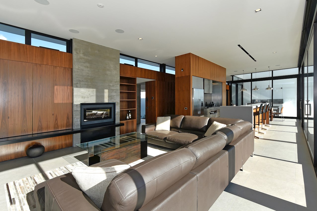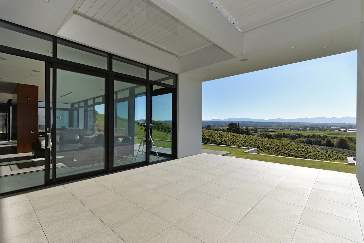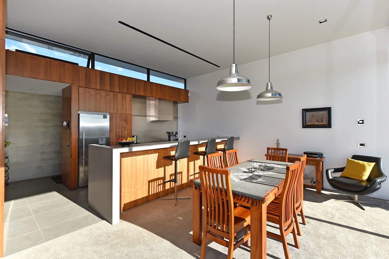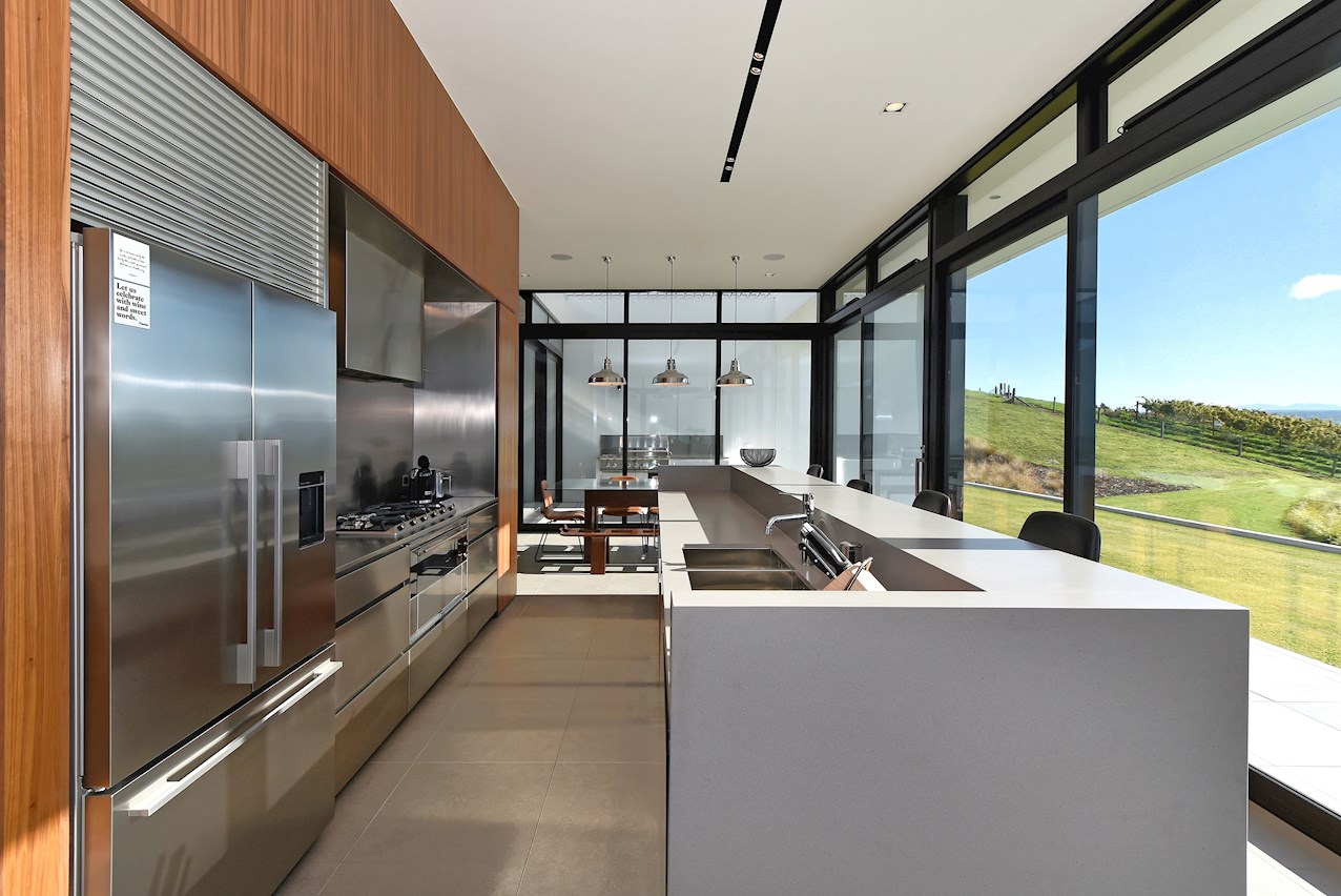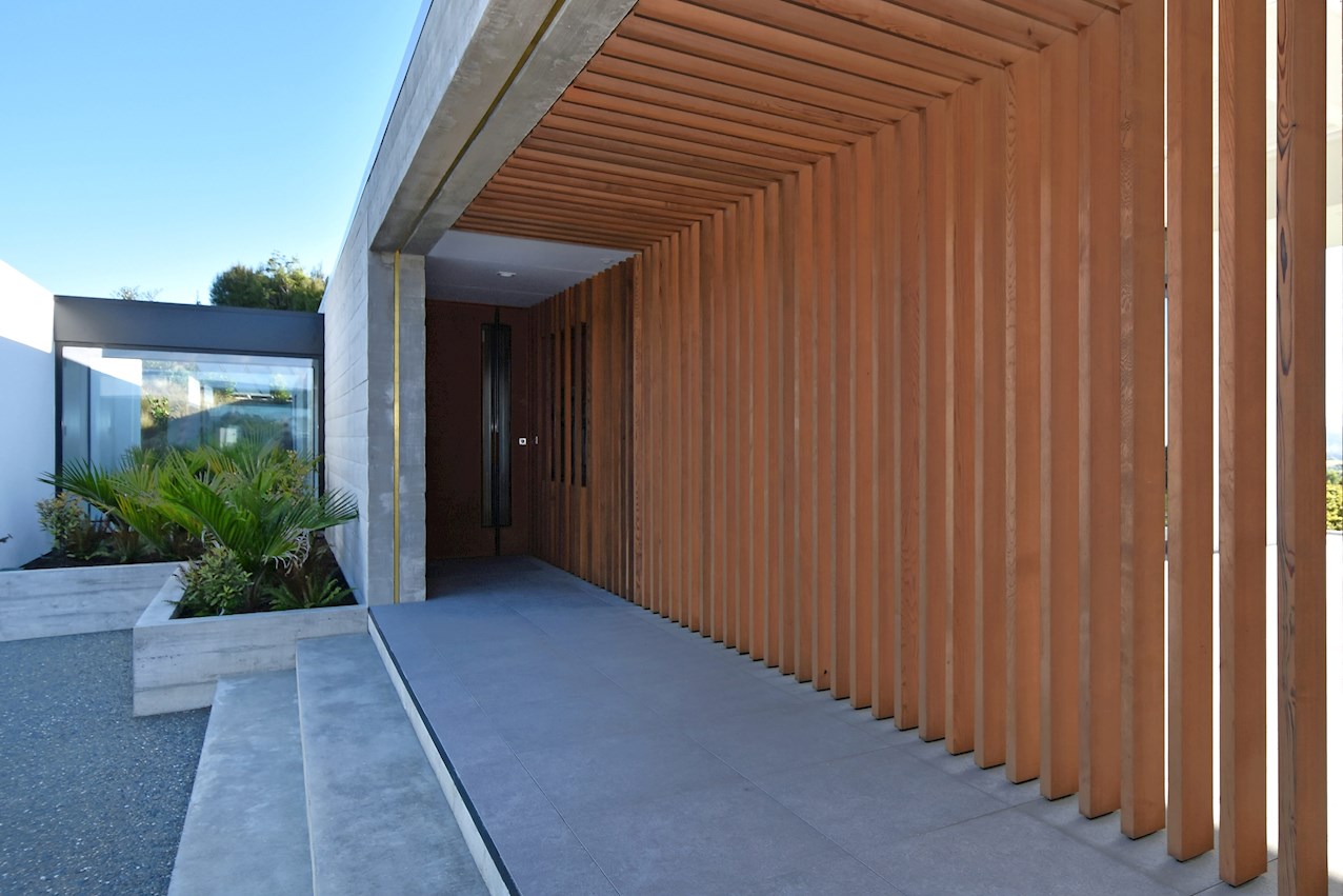 All glass and concrete, the stunning single-level façade stretches an incredible 60m. That’s one way to keep a low profile on a big budget. Warren and Mahoney architects have gone to great lengths to ensure this home in Hope, Nelson, makes a striking impression both inside and out. The spacious open-plan living area embraces residents with its warming walnut panelling. The timber is also used in the rear corridor, doors and bespoke cabinetry. The kitchen is an entertainer’s haven with engaging views to Tasman Bay over the vineyard and Waimea Plains, the perfect excuse to raise a toast. Five bedrooms, three bathrooms and a separate lounge sit more than comfortably on the 500sqm footprint. Plus, there’s a self-contained studio. This house is also highly sustainable, with 44 PV panels and 10 water-heating panels located outside. Timers take care of underfloor heating. Superior insulation, low-E argon-filled windows and a polystyrene underfloor slab keep things extra cosy.