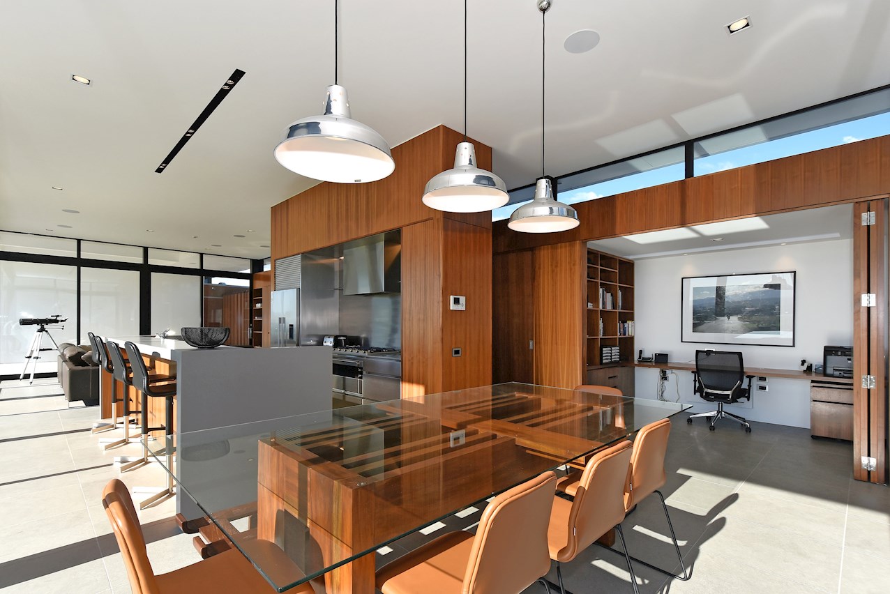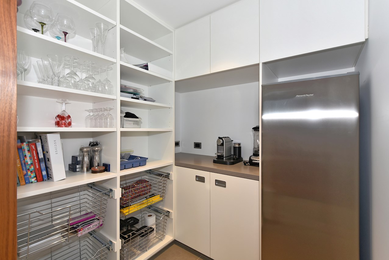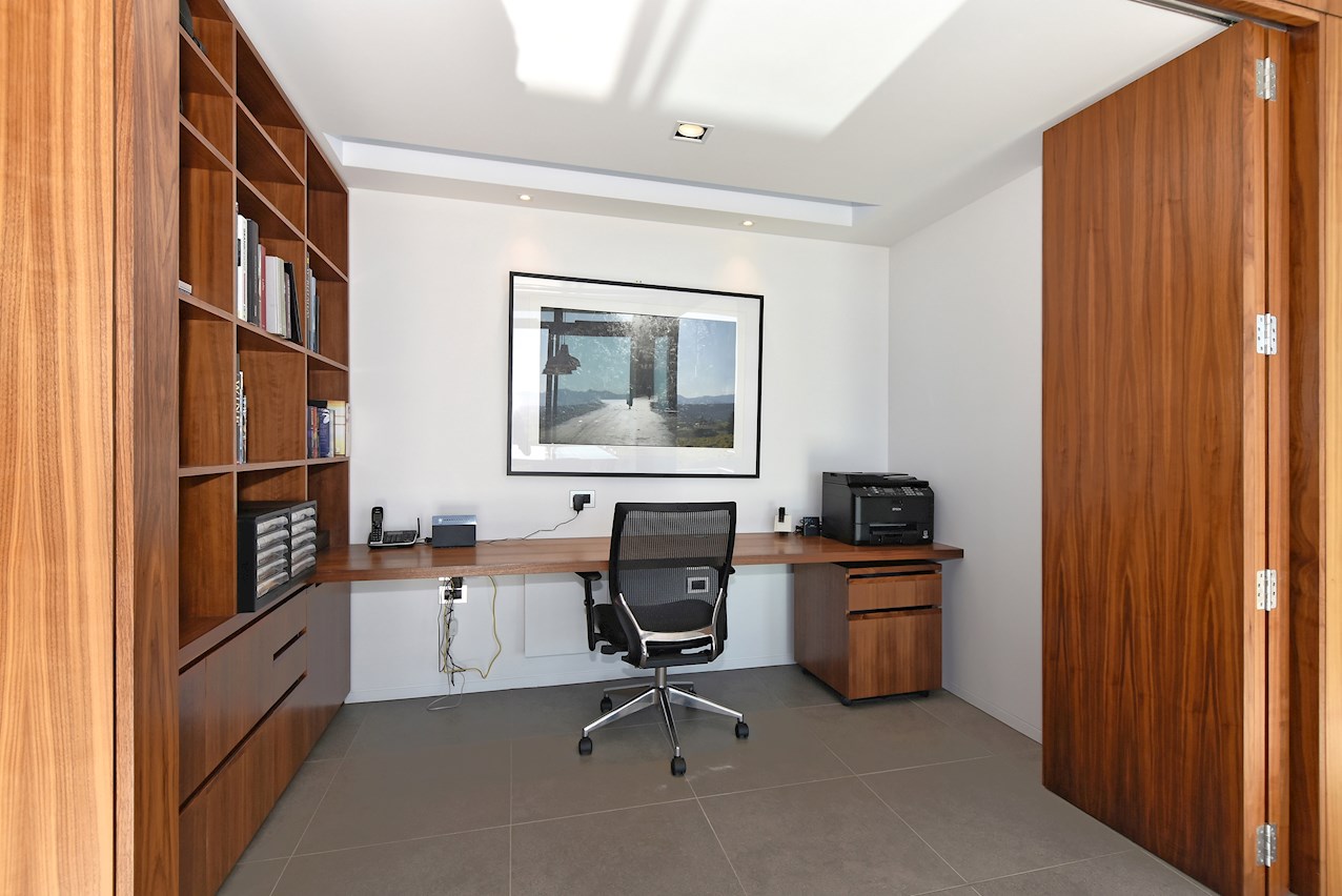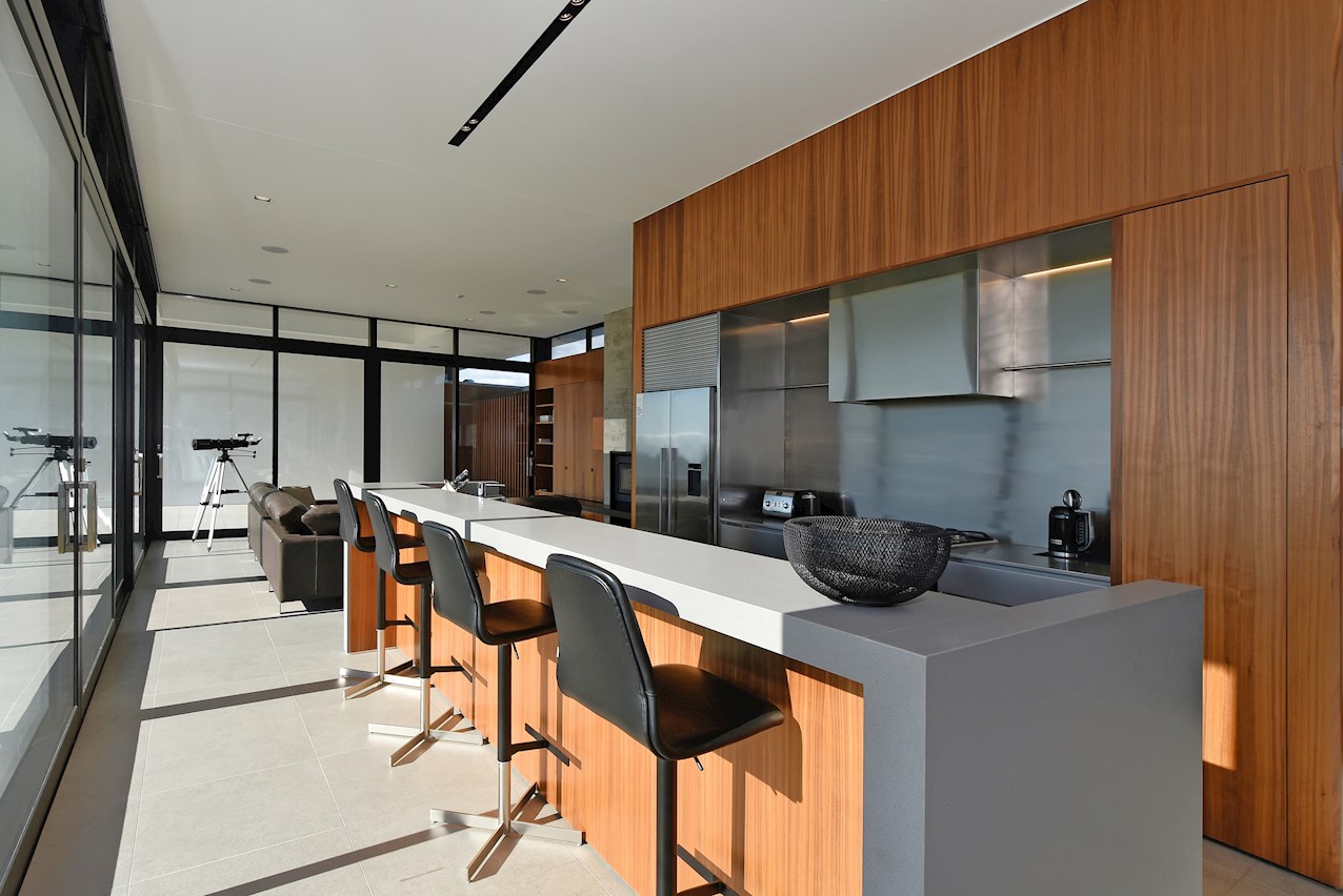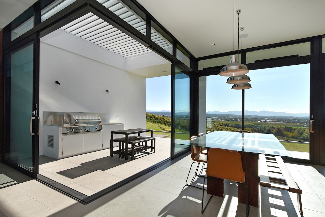 All glass and concrete, the stunning single-level façade stretches an incredible 60m. That’s one way to keep a low profile on a big budget. Warren and Mahoney architects have gone to great lengths to ensure this home in Hope, Nelson, makes a striking impression both inside and out. The spacious open-plan living area embraces residents with its warming walnut panelling. The timber is also used in the rear corridor, doors and bespoke cabinetry. The kitchen is an entertainer’s haven with engaging views to Tasman Bay over the vineyard and Waimea Plains, the perfect excuse to raise a toast. Five bedrooms, three bathrooms and a separate lounge sit more than comfortably on the 500sqm footprint. Plus, there’s a self-contained studio. This house is also highly sustainable, with 44 PV panels and 10 water-heating panels located outside. Timers take care of underfloor heating. Superior insulation, low-E argon-filled windows and a polystyrene underfloor slab keep things extra cosy.