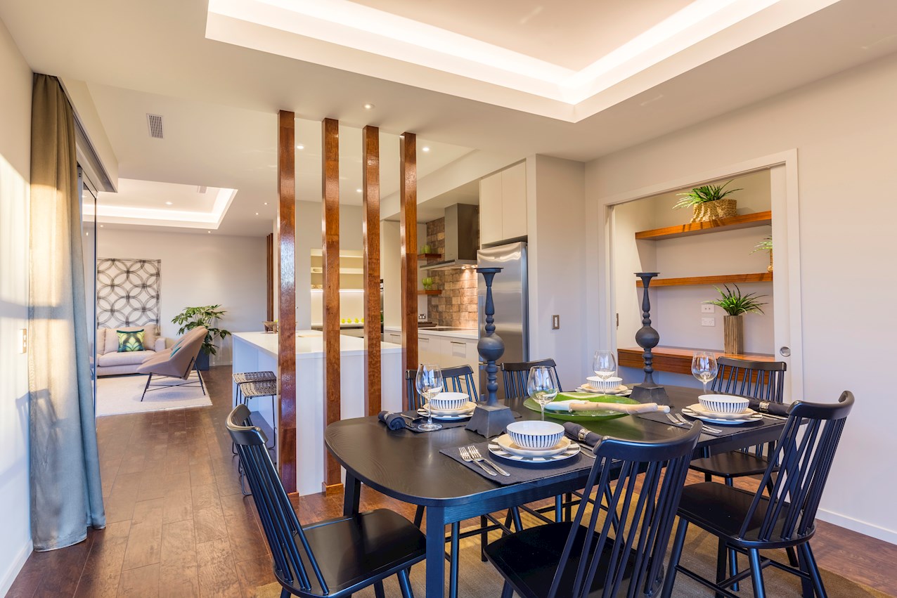 It may have striking street appeal, but this Richmond home is much more than just a pretty face. Designed and decorated with a Balinese theme in mind, the three-bedroom abode exudes contemporary charm and luxury. The open-plan area forms the heart of everyday life. Wood beams subtly define the space without affecting connection and flow. The contemporary kitchen serves up easy everyday living while also catering to keen entertainers. The scullery is well-equipped with plenty of storage and bench space. Thanks to a combination of sunshine and clever interior design, the elegant interior is awash with golden light. Glass sliders open from the living spaces to an inviting outdoor area, where it’s easy to serve meals alfresco. Landscaping, feature lighting and an outdoor fire enhance the tranquil feel after sundown. A freestanding tub in the family bathroom and double vanities in the ensuite continue the resort theme.