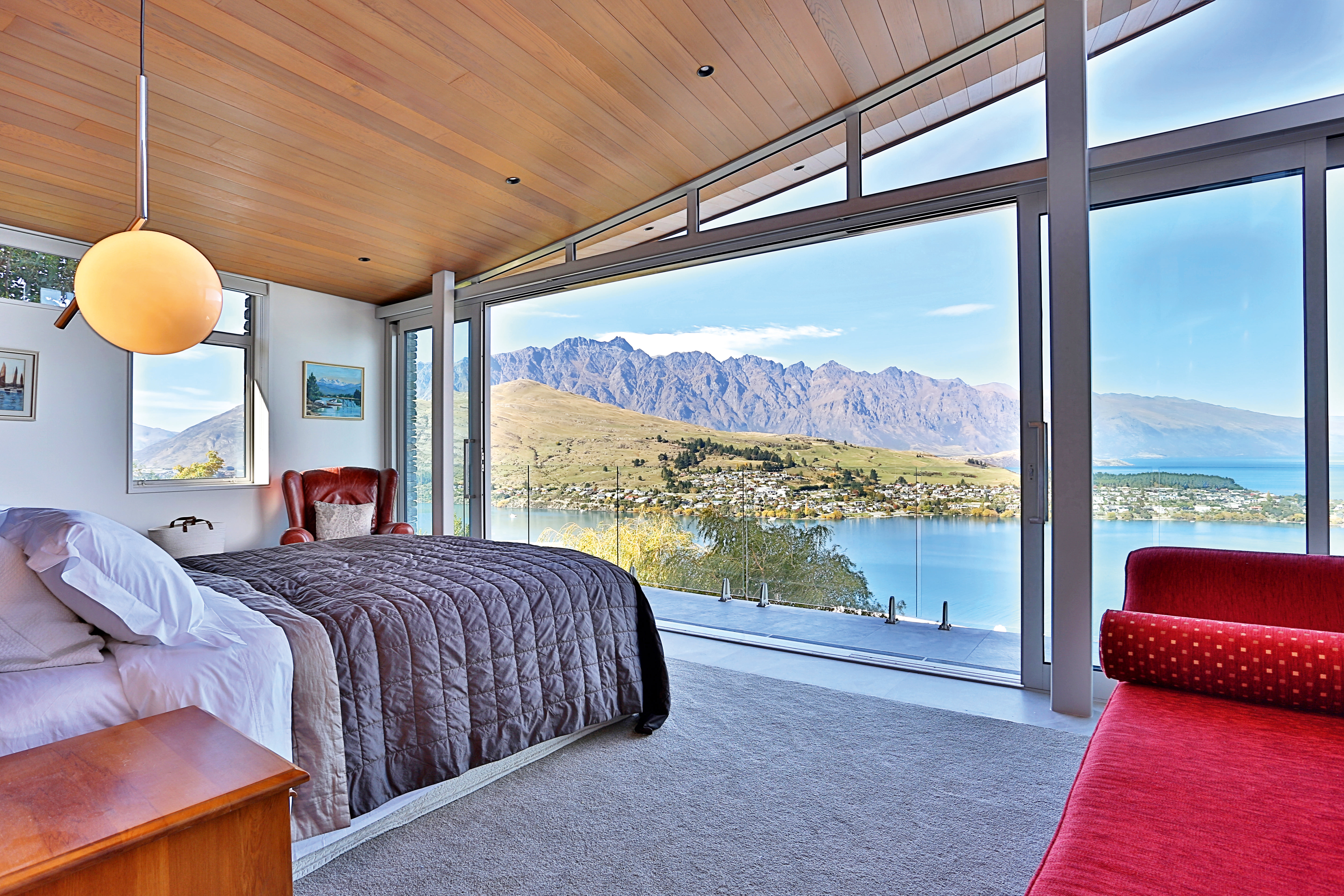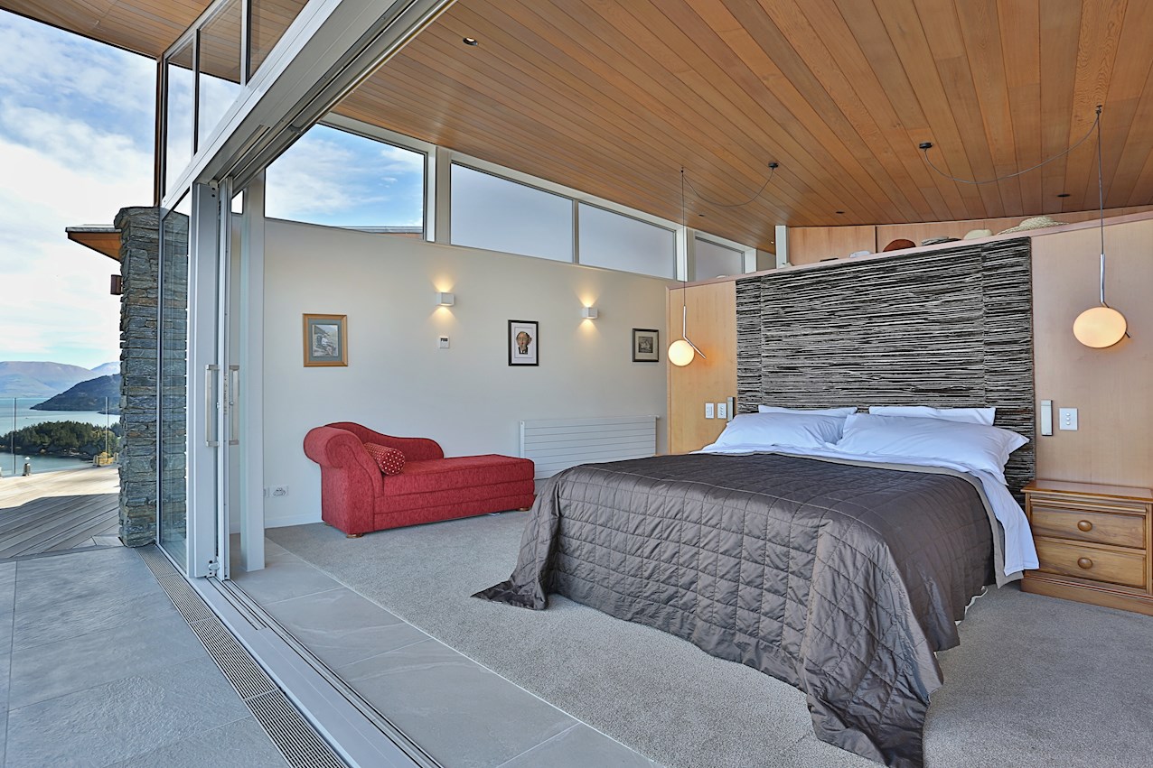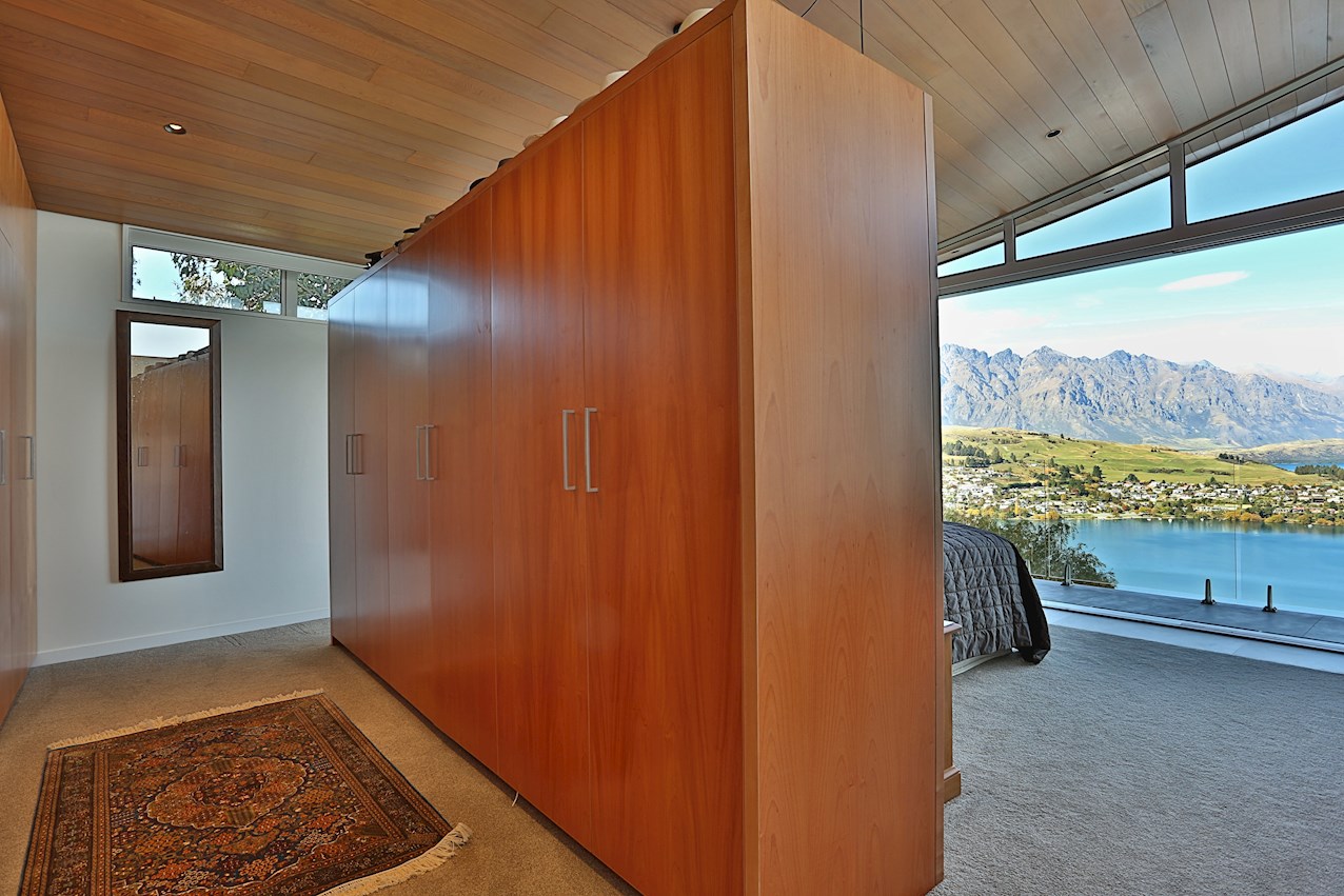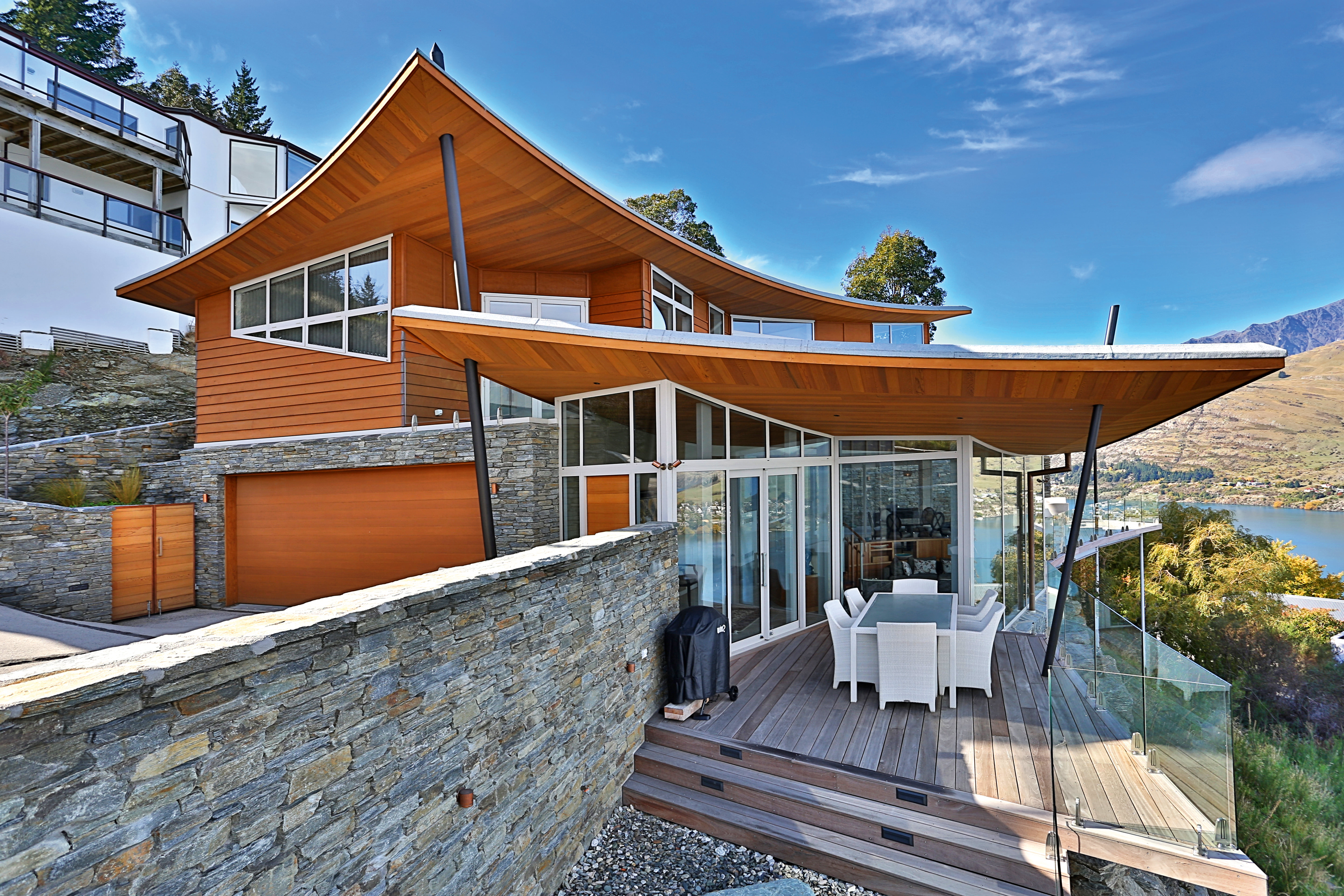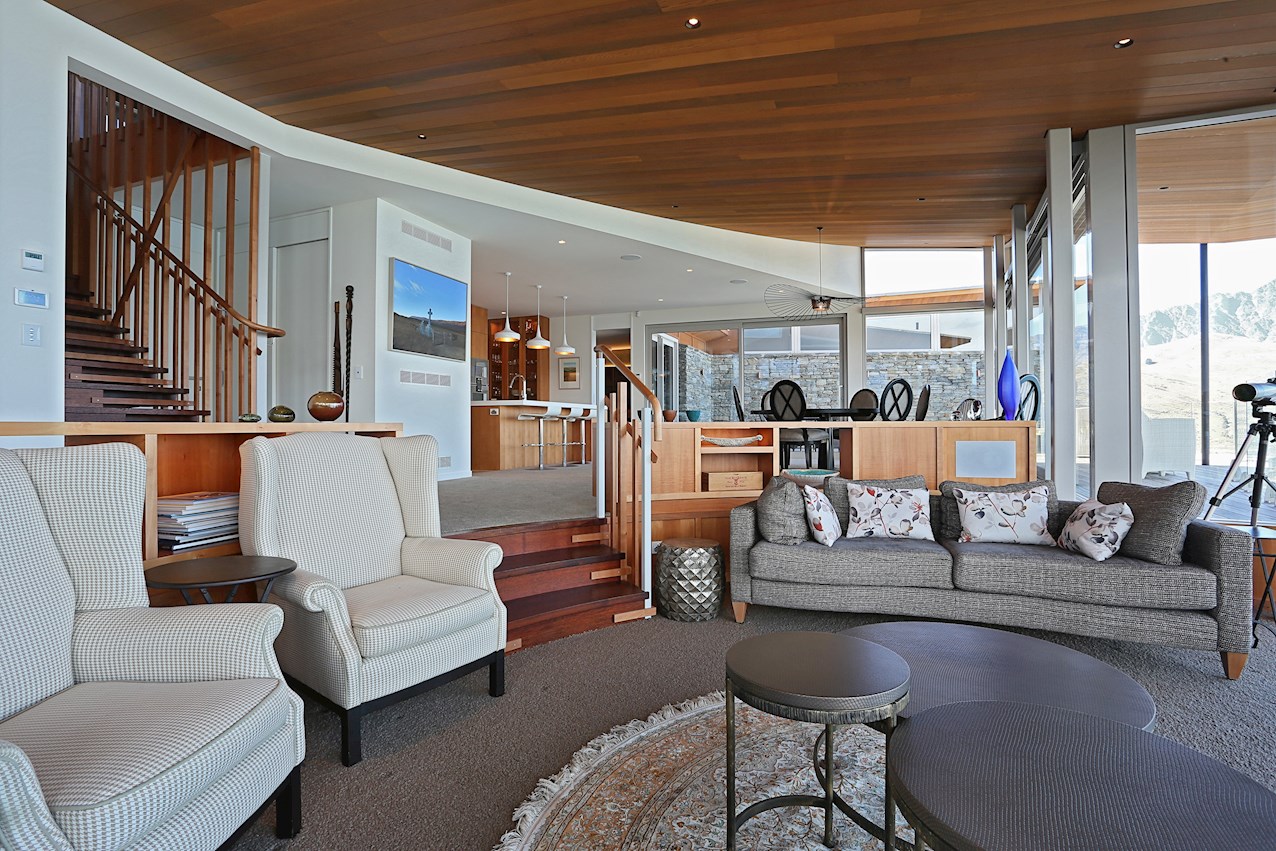 There’s nothing straightforward about this Queenstown abode. Sweeping rooftops float above the home like sheets of paper suspended in mid-air. The design was, in fact, inspired by the drooping of a tent fly and the realisation of this vision deserves recognition. The stylish interior with its 200-degree views, meanwhile, is a clear departure from the home’s camping origins. Curved cedar tongue-and-groove ceilings feature throughout the two-level, three-bedroom home. They flow seamlessly from the interior to the exterior where they offer shade from the sun. Two guest bedrooms with ensures bookend the upstairs level with its casual living/study area sandwiched between. Diverging from the bulk of the cedar weatherboard home, the master bedroom wing is encased in local Gibbston schist. Glazing frames the picture-perfect outlook and off ers access to a private balcony where you can see the sun rise over The Remarkables.