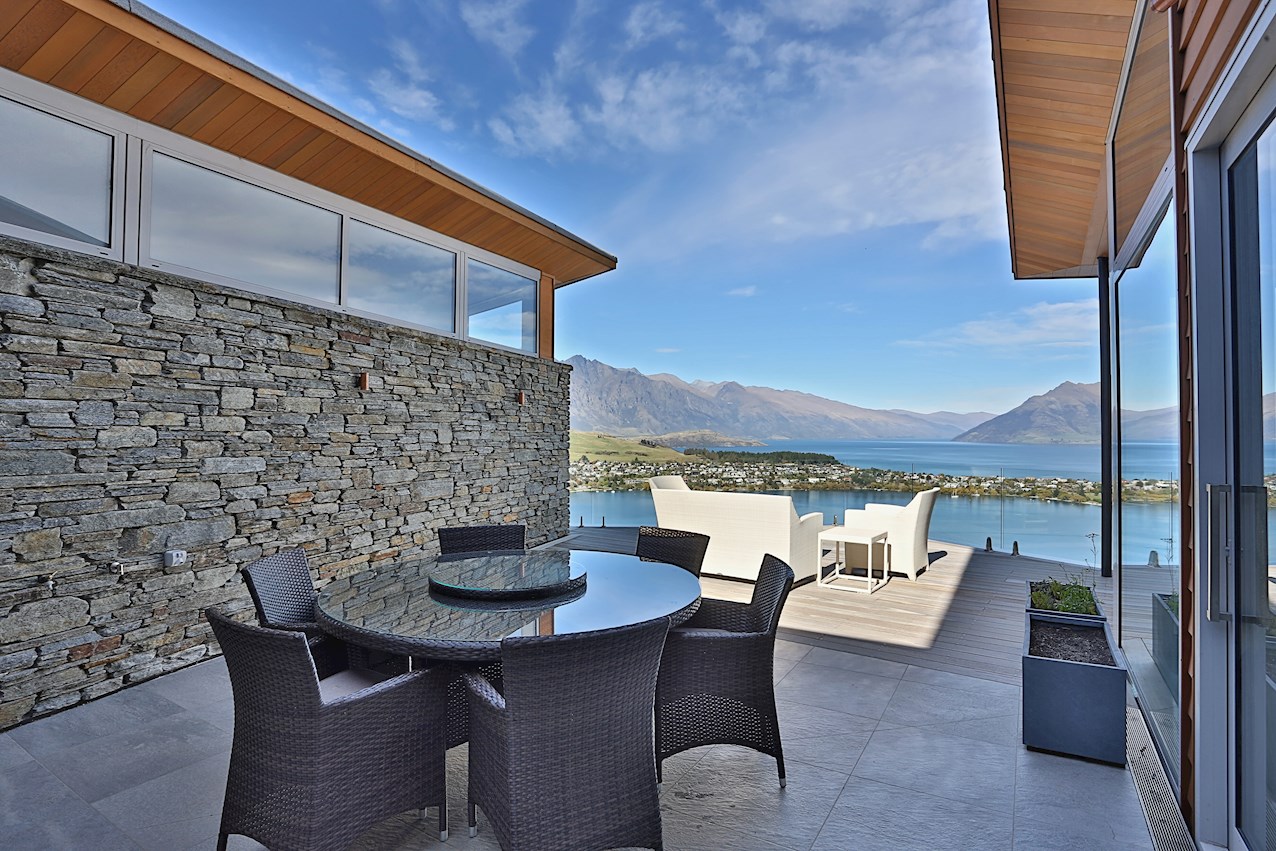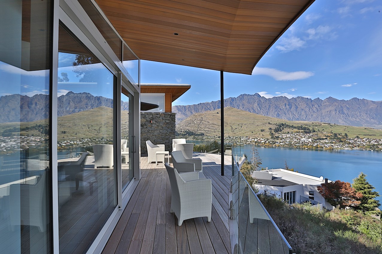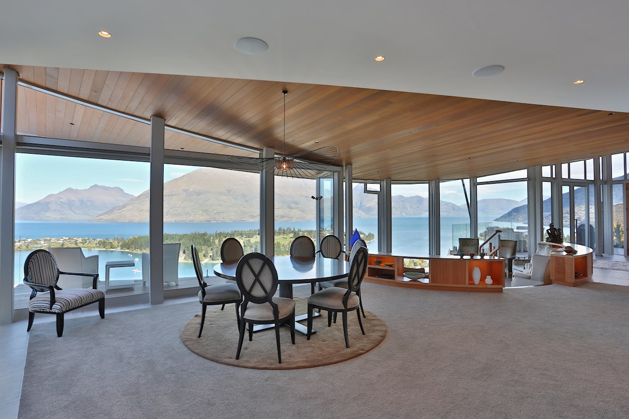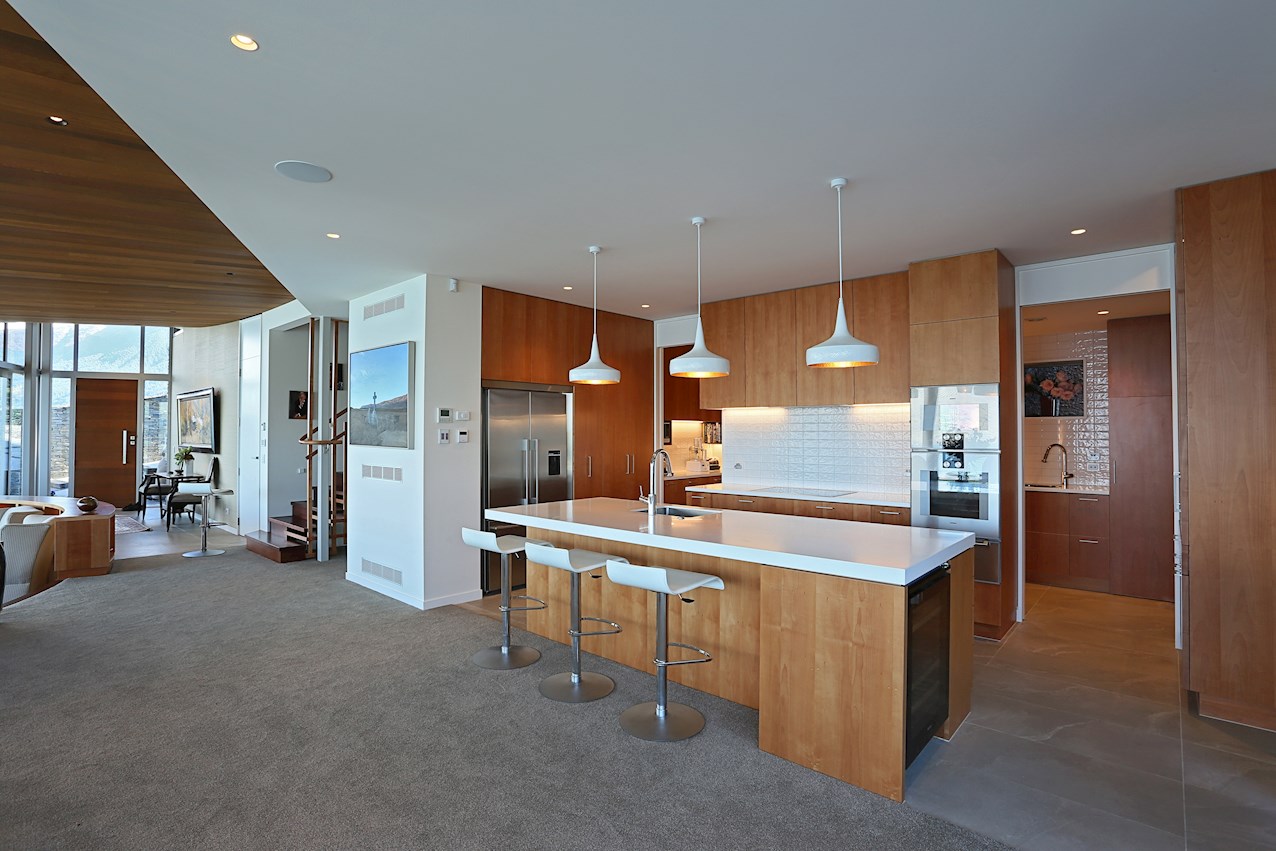 There’s nothing straightforward about this Queenstown abode. Sweeping rooftops float above the home like sheets of paper suspended in mid-air. The design was, in fact, inspired by the drooping of a tent fly and the realisation of this vision deserves recognition. The stylish interior with its 200-degree views, meanwhile, is a clear departure from the home’s camping origins. Curved cedar tongue-and-groove ceilings feature throughout the two-level, three-bedroom home. They flow seamlessly from the interior to the exterior where they offer shade from the sun. Two guest bedrooms with ensures bookend the upstairs level with its casual living/study area sandwiched between. Diverging from the bulk of the cedar weatherboard home, the master bedroom wing is encased in local Gibbston schist. Glazing frames the picture-perfect outlook and off ers access to a private balcony where you can see the sun rise over The Remarkables.