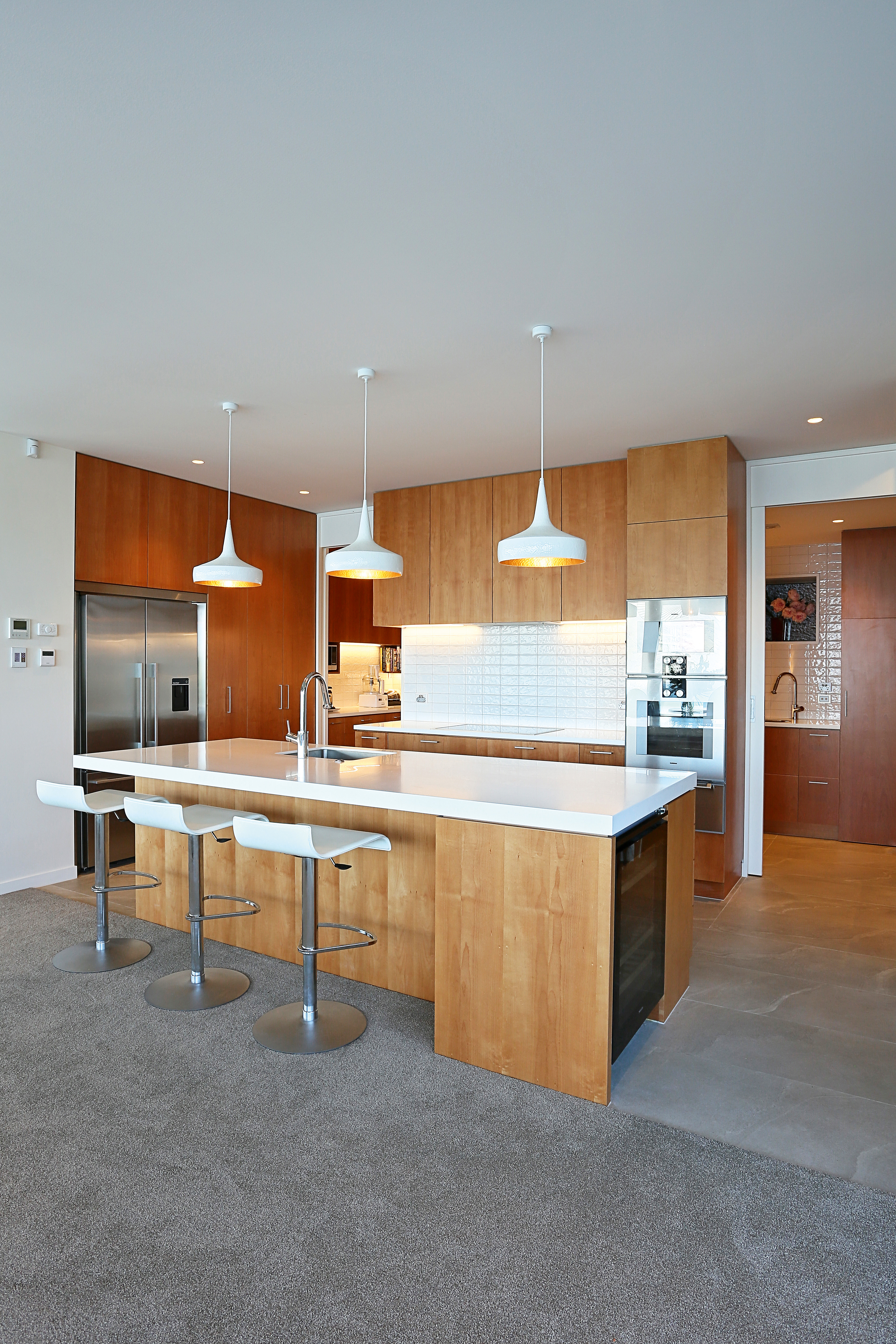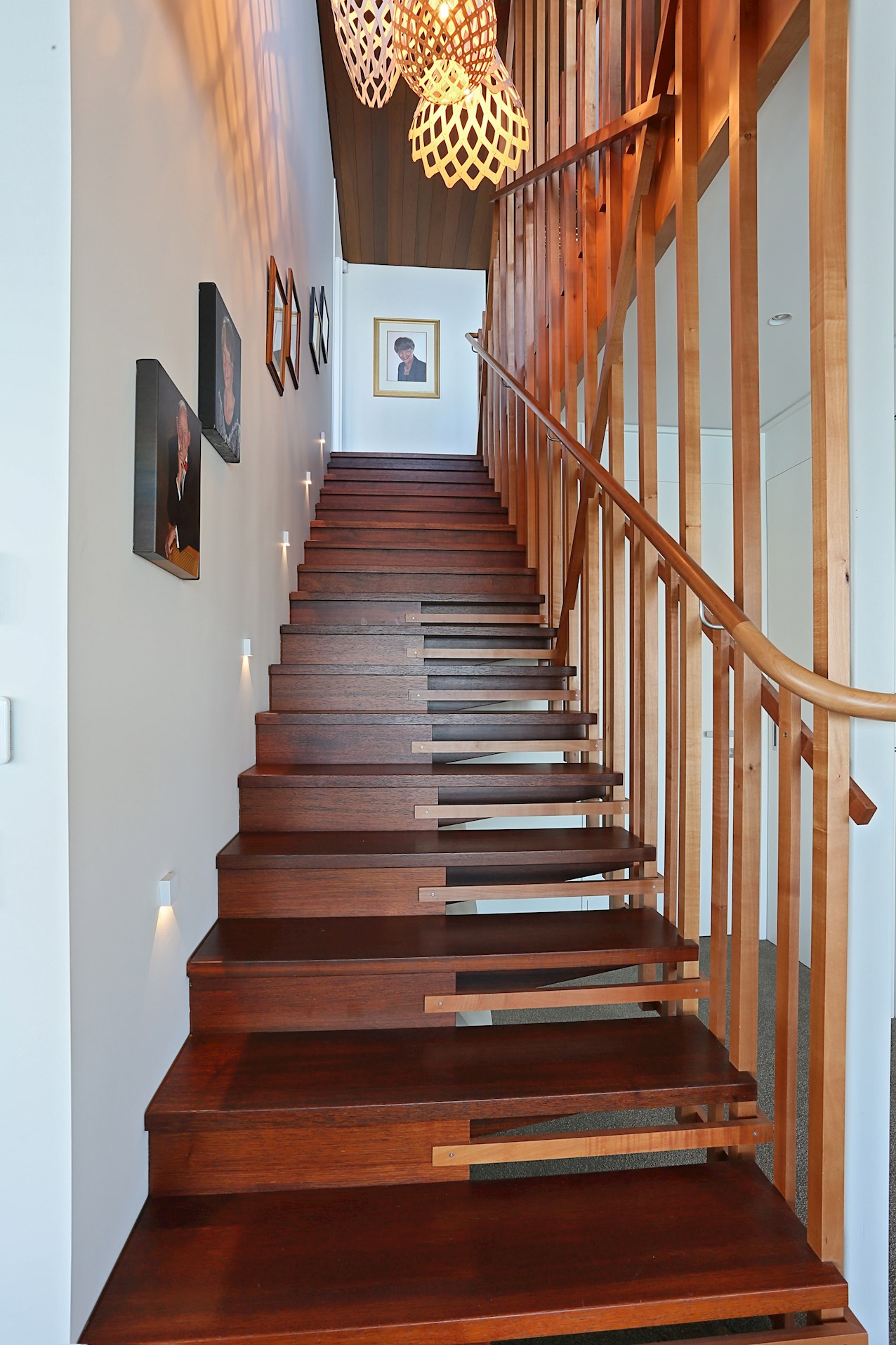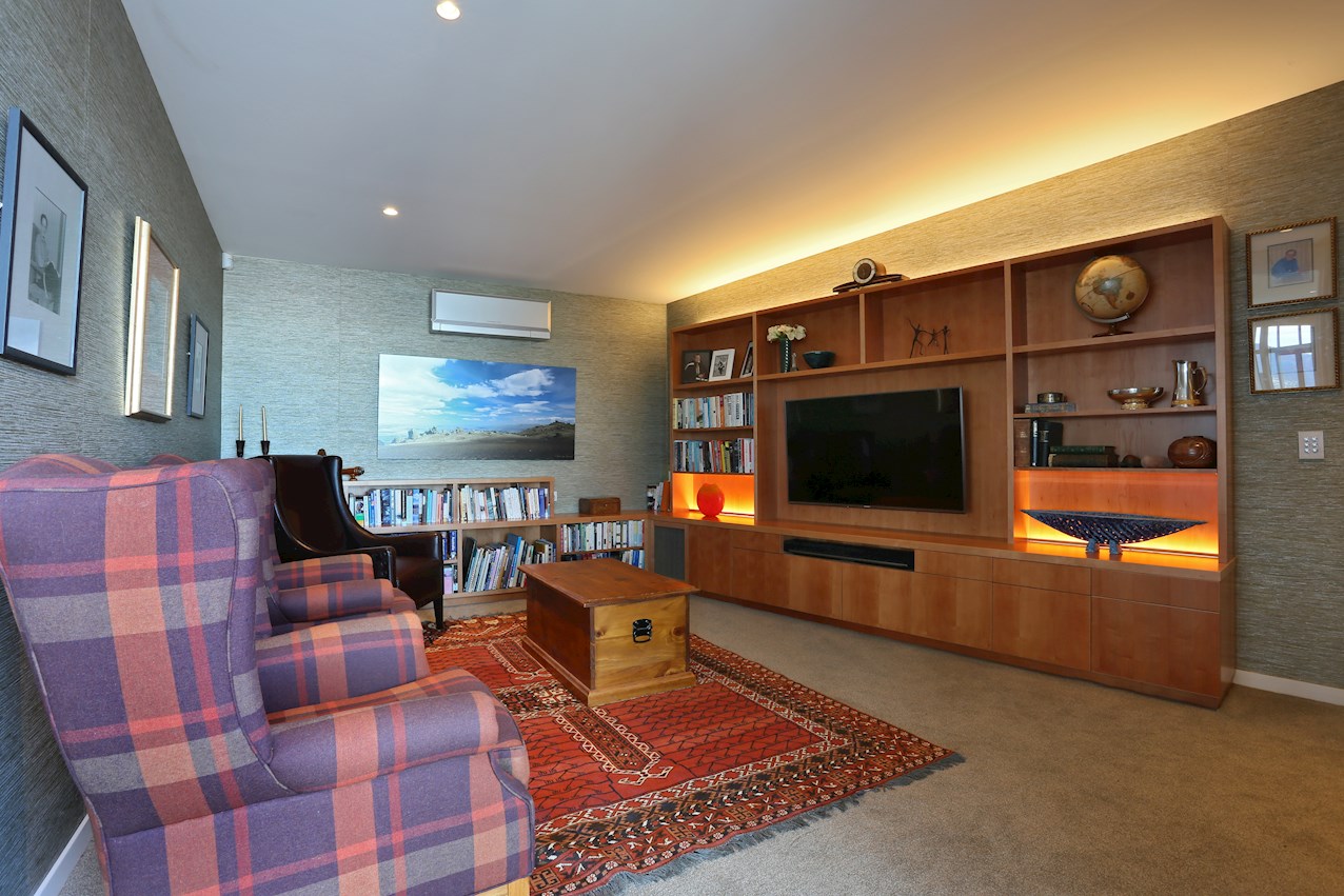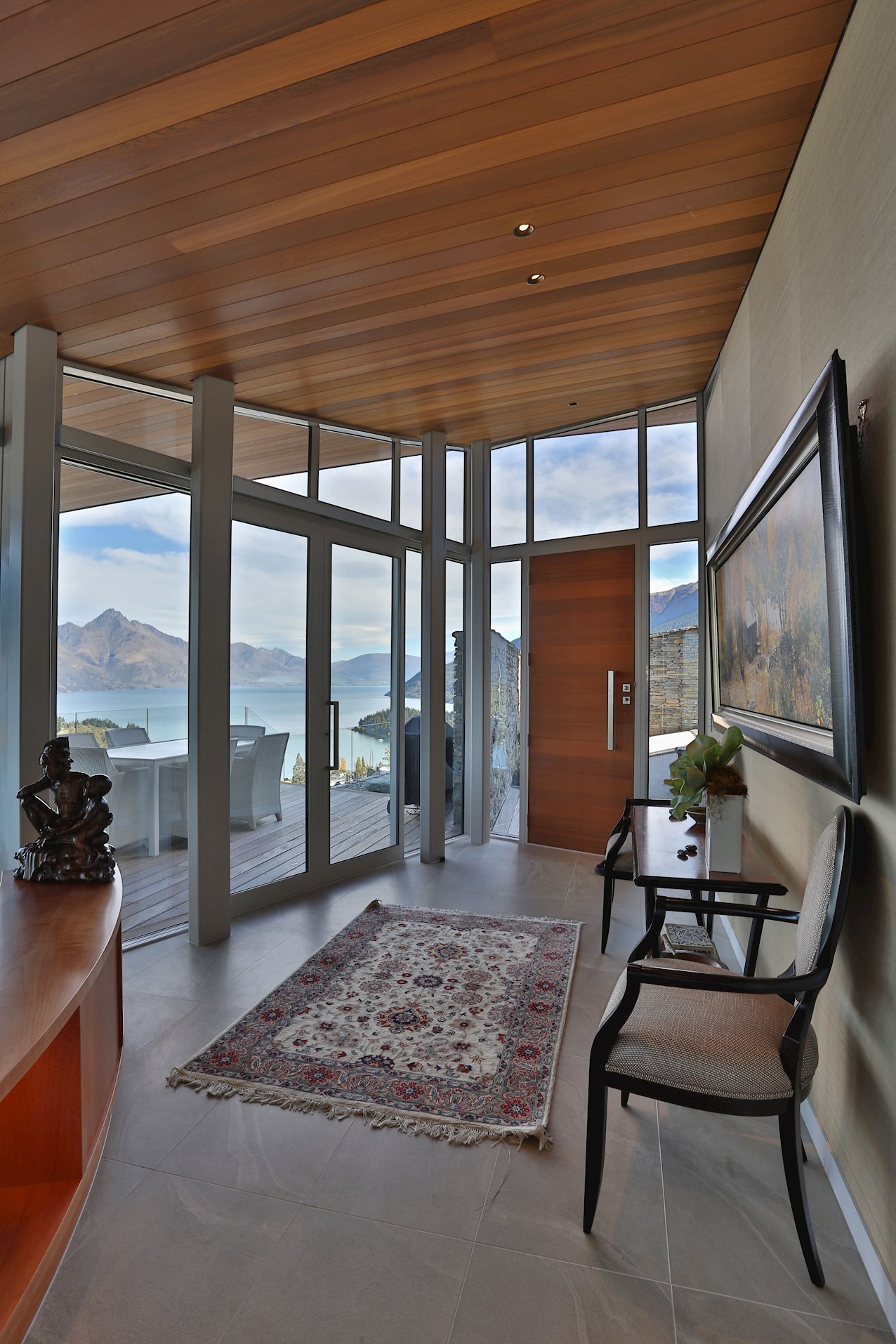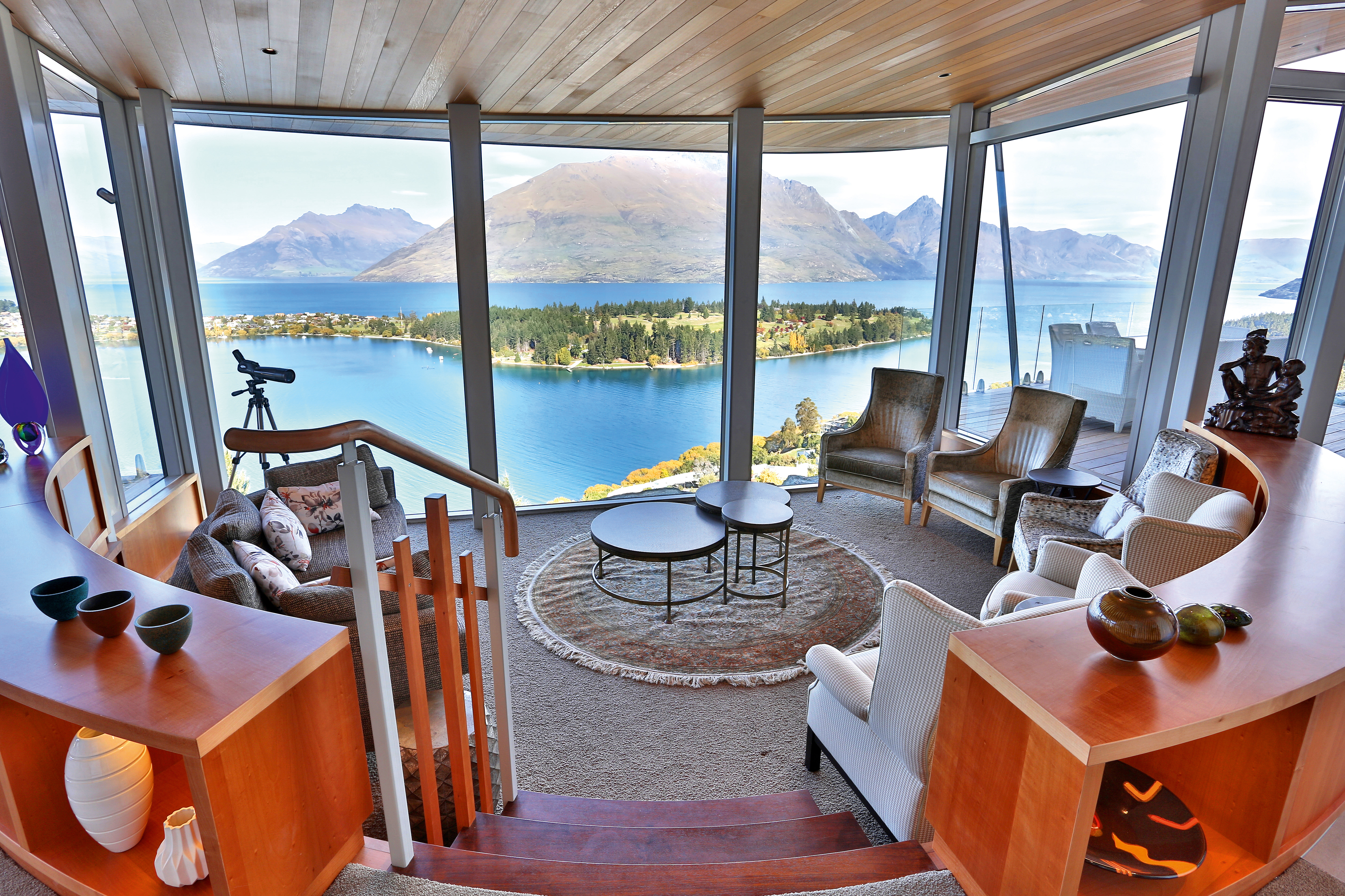 There’s nothing straightforward about this Queenstown abode. Sweeping rooftops float above the home like sheets of paper suspended in mid-air. The design was, in fact, inspired by the drooping of a tent fly and the realisation of this vision deserves recognition. The stylish interior with its 200-degree views, meanwhile, is a clear departure from the home’s camping origins. Curved cedar tongue-and-groove ceilings feature throughout the two-level, three-bedroom home. They flow seamlessly from the interior to the exterior where they offer shade from the sun. Two guest bedrooms with ensures bookend the upstairs level with its casual living/study area sandwiched between. Diverging from the bulk of the cedar weatherboard home, the master bedroom wing is encased in local Gibbston schist. Glazing frames the picture-perfect outlook and off ers access to a private balcony where you can see the sun rise over The Remarkables.