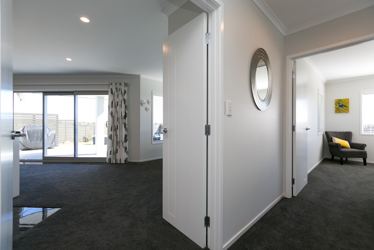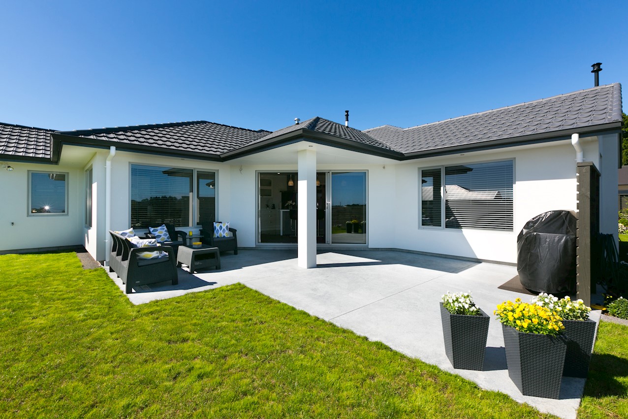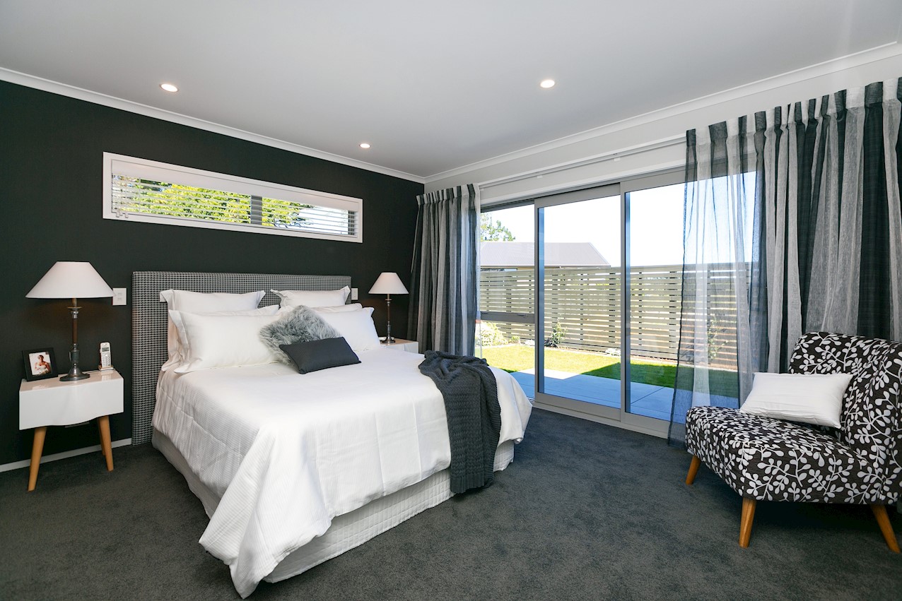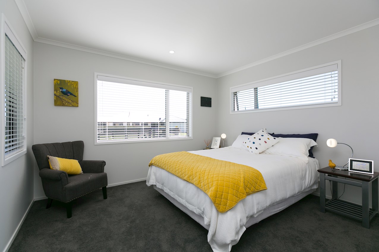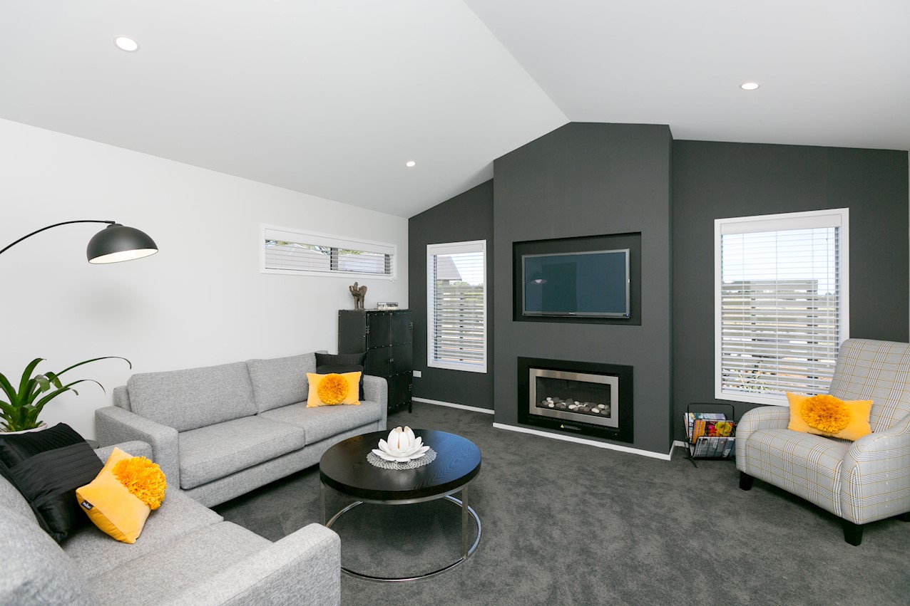 A smart layout gives this postcard-perfect home in Fernbrook, New Plymouth, a seriously spacious feel. The 212sqm abode includes three bedrooms, two bathrooms and not one but two living spaces. That’s a lot of bang for your buck. The heart of the home is the stylish kitchen with generous walk-in pantry. Extra storage cuts down on clutter. Use of white keeps things light and bright – as does the trio of hanging pendants above the central island bench. The dining space is nestled snugly nearby, with the formal lounge positioned through cavity sliders. Here, carpet adds a cosy feel and ties in nicely with the charcoal feature wall. The fireplace provides a nice focal point, warming the home on winter days. Large stacker sliding doors open off a nook in the kitchen, allowing the interior to spill out onto the concrete tiled patio. It’s the perfect place to unwind and watch the sun set at the end of the day. A hush falls over the home thanks to sound-proofing batts between bedrooms and bathrooms and living areas. How thoughtful.