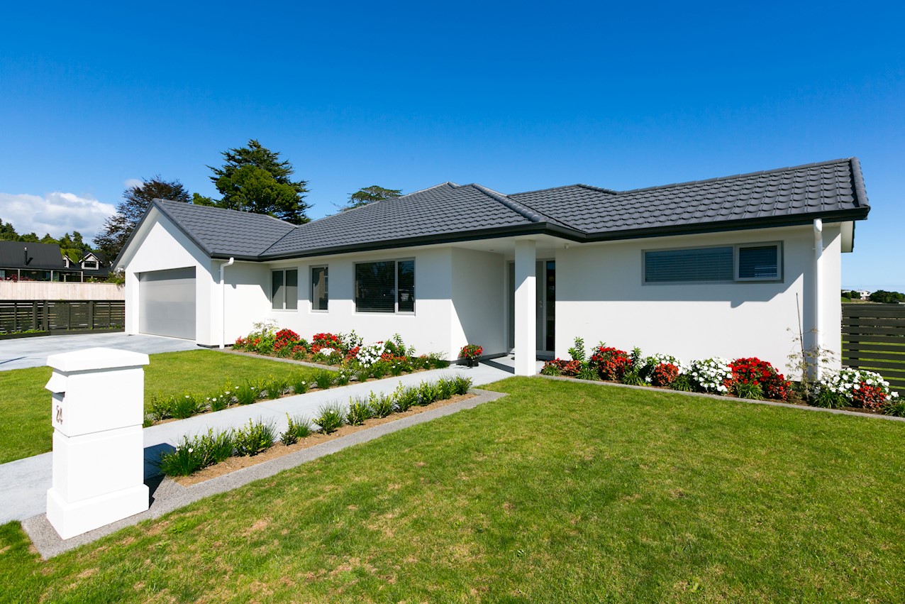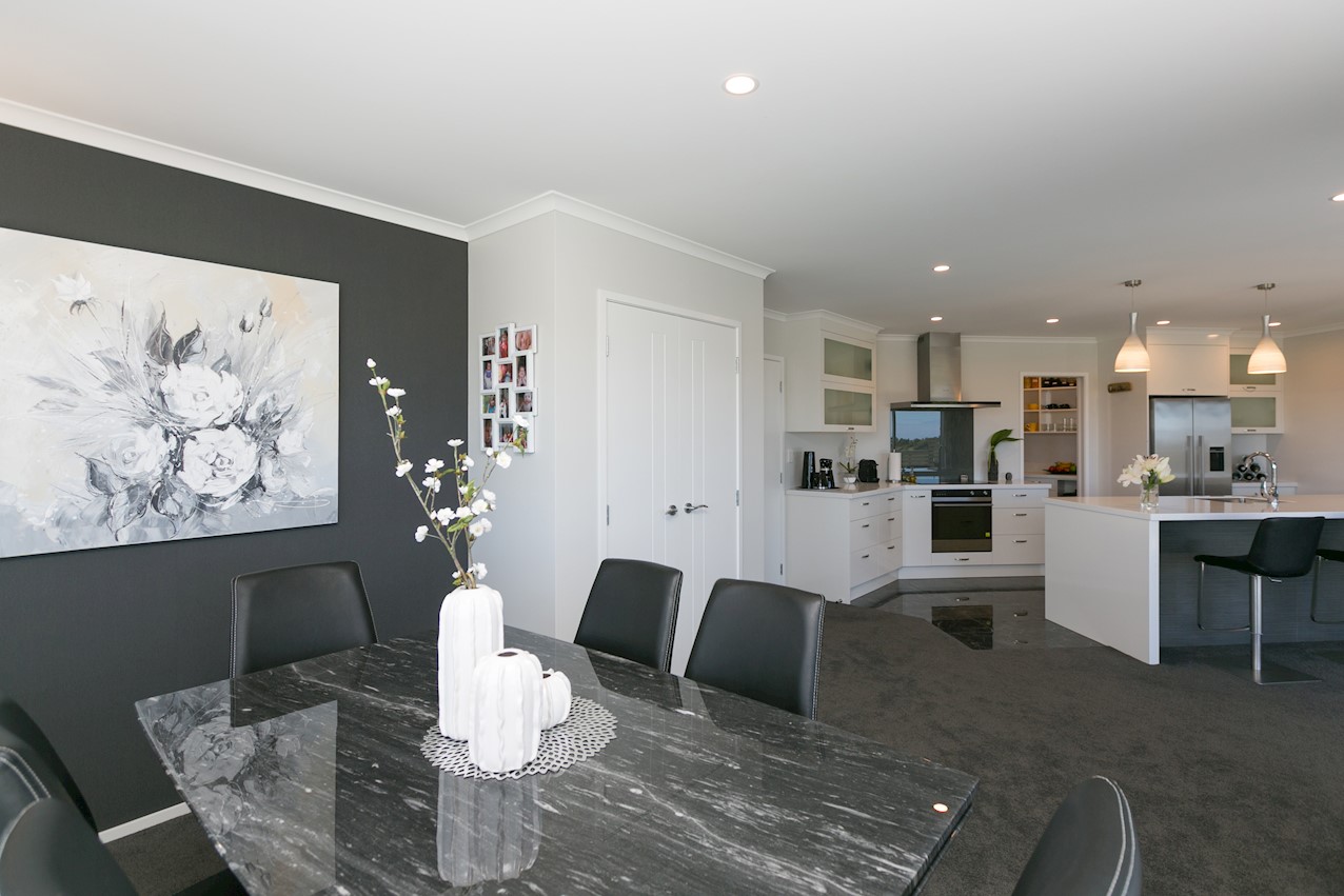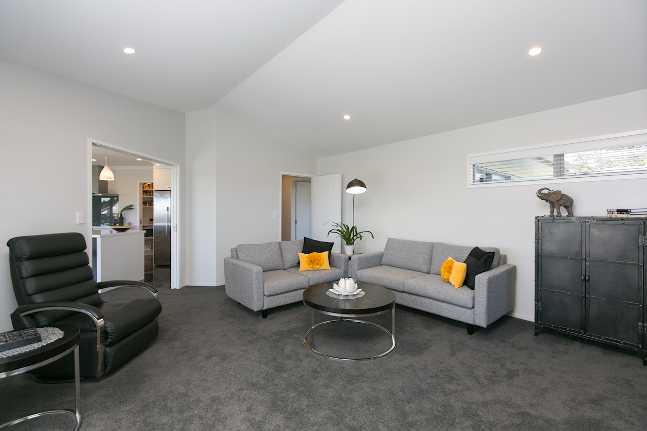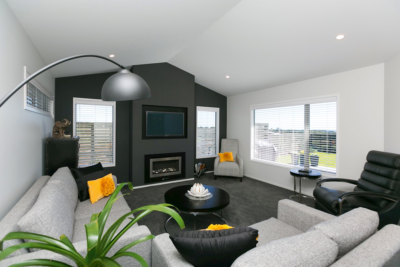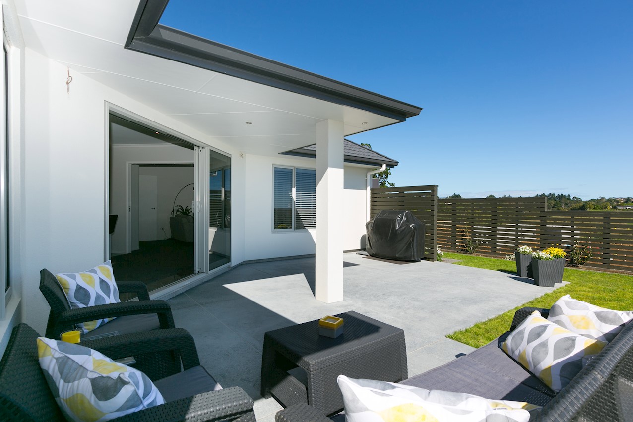 A smart layout gives this postcard-perfect home in Fernbrook, New Plymouth, a seriously spacious feel. The 212sqm abode includes three bedrooms, two bathrooms and not one but two living spaces. That’s a lot of bang for your buck. The heart of the home is the stylish kitchen with generous walk-in pantry. Extra storage cuts down on clutter. Use of white keeps things light and bright – as does the trio of hanging pendants above the central island bench. The dining space is nestled snugly nearby, with the formal lounge positioned through cavity sliders. Here, carpet adds a cosy feel and ties in nicely with the charcoal feature wall. The fireplace provides a nice focal point, warming the home on winter days. Large stacker sliding doors open off a nook in the kitchen, allowing the interior to spill out onto the concrete tiled patio. It’s the perfect place to unwind and watch the sun set at the end of the day. A hush falls over the home thanks to sound-proofing batts between bedrooms and bathrooms and living areas. How thoughtful.