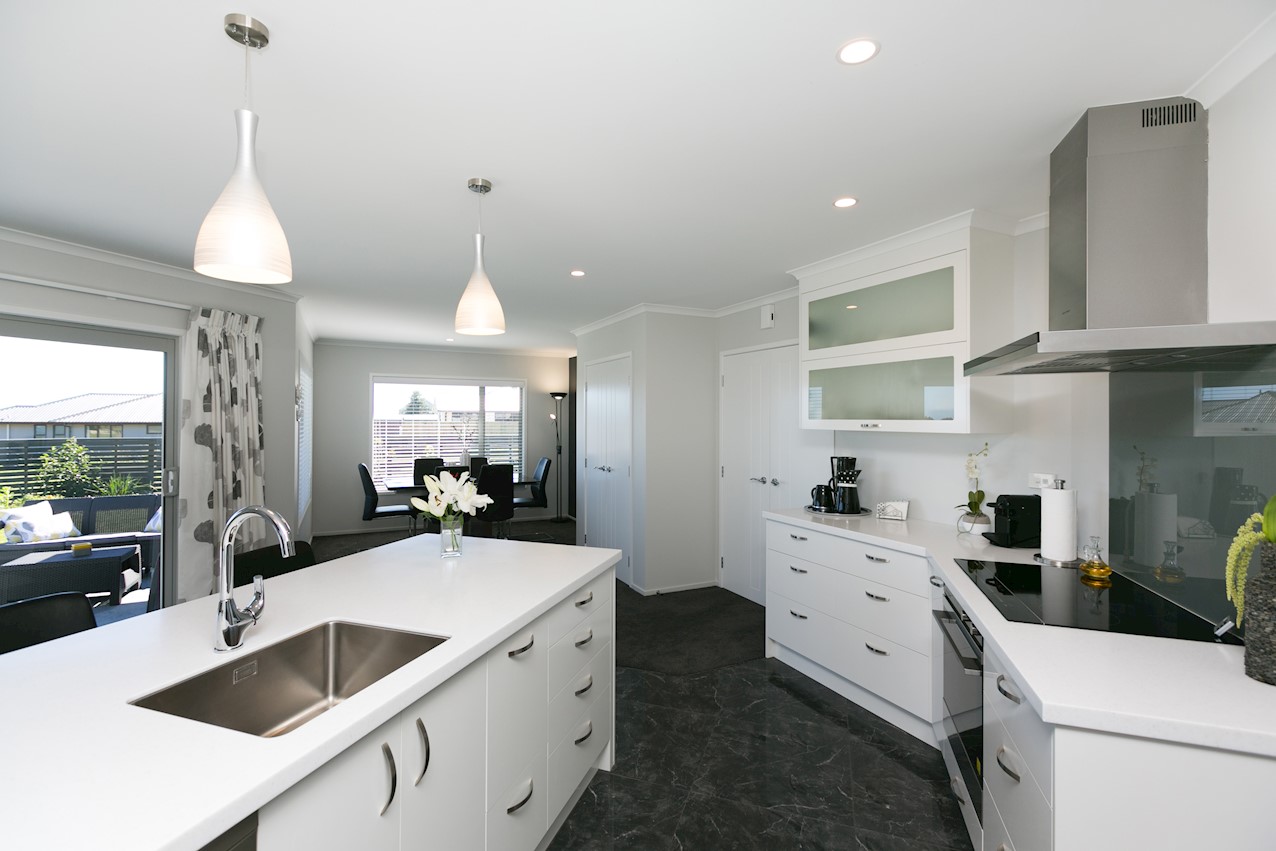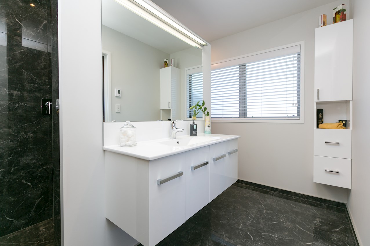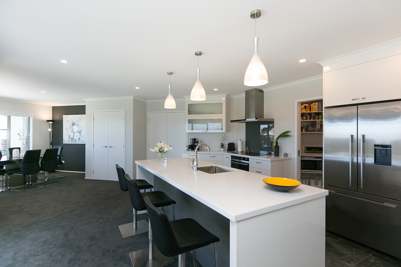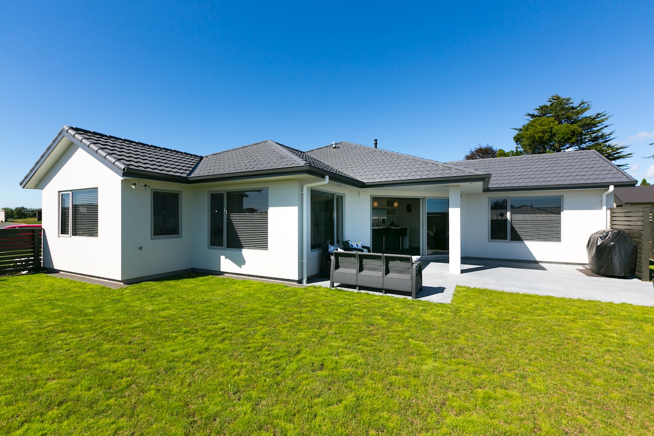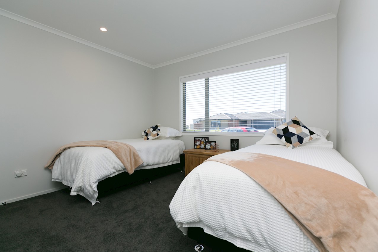 A smart layout gives this postcard-perfect home in Fernbrook, New Plymouth, a seriously spacious feel. The 212sqm abode includes three bedrooms, two bathrooms and not one but two living spaces. That’s a lot of bang for your buck. The heart of the home is the stylish kitchen with generous walk-in pantry. Extra storage cuts down on clutter. Use of white keeps things light and bright – as does the trio of hanging pendants above the central island bench. The dining space is nestled snugly nearby, with the formal lounge positioned through cavity sliders. Here, carpet adds a cosy feel and ties in nicely with the charcoal feature wall. The fireplace provides a nice focal point, warming the home on winter days. Large stacker sliding doors open off a nook in the kitchen, allowing the interior to spill out onto the concrete tiled patio. It’s the perfect place to unwind and watch the sun set at the end of the day. A hush falls over the home thanks to sound-proofing batts between bedrooms and bathrooms and living areas. How thoughtful.
