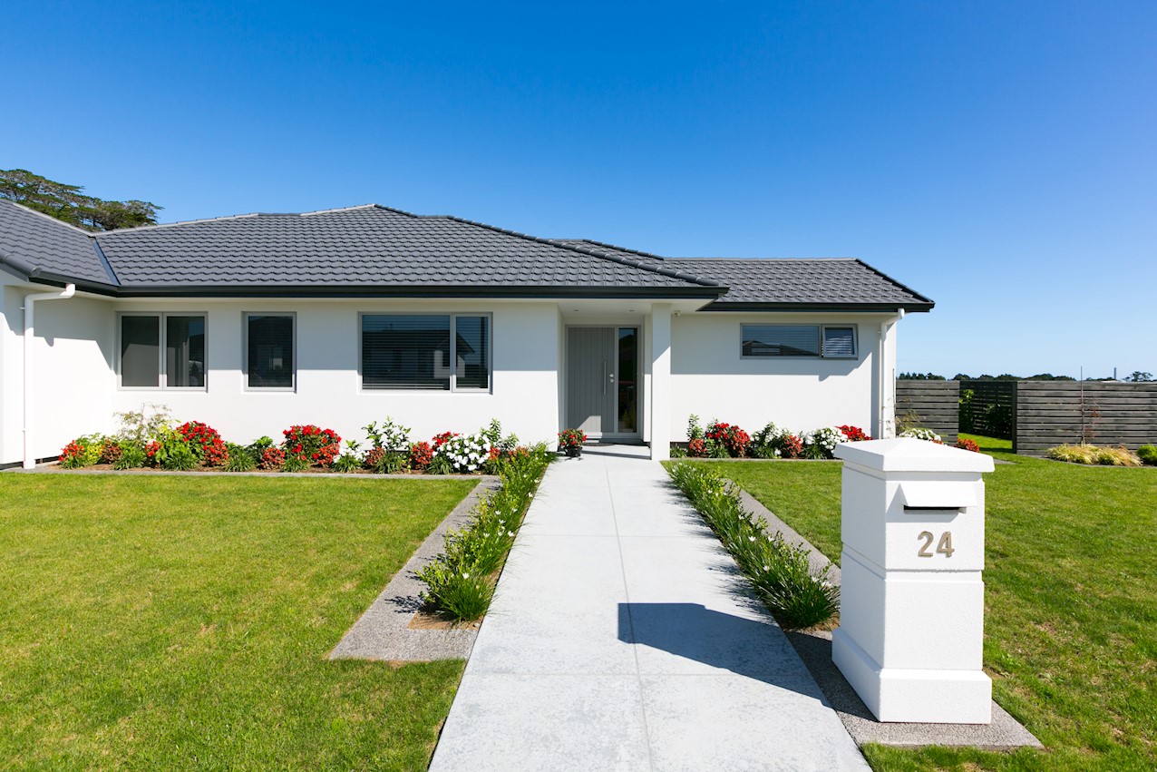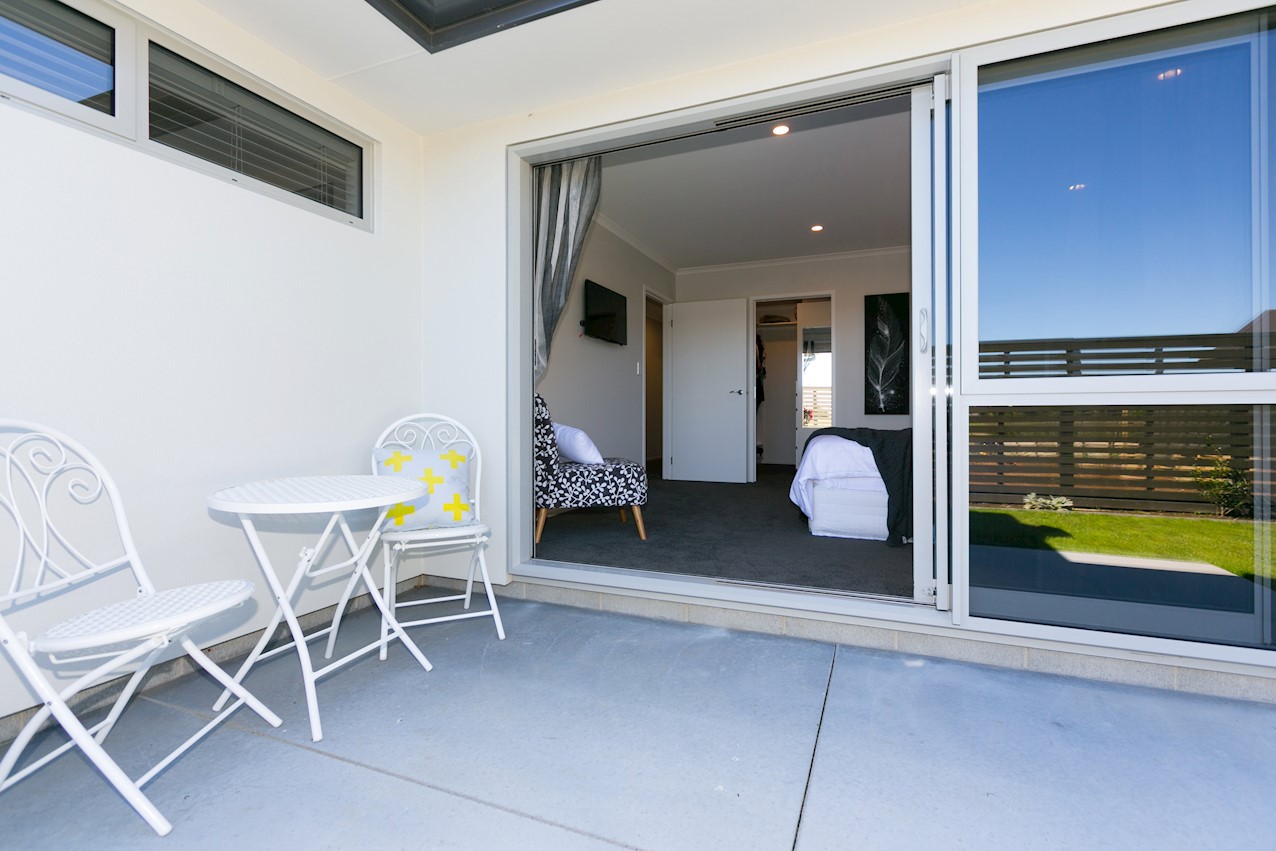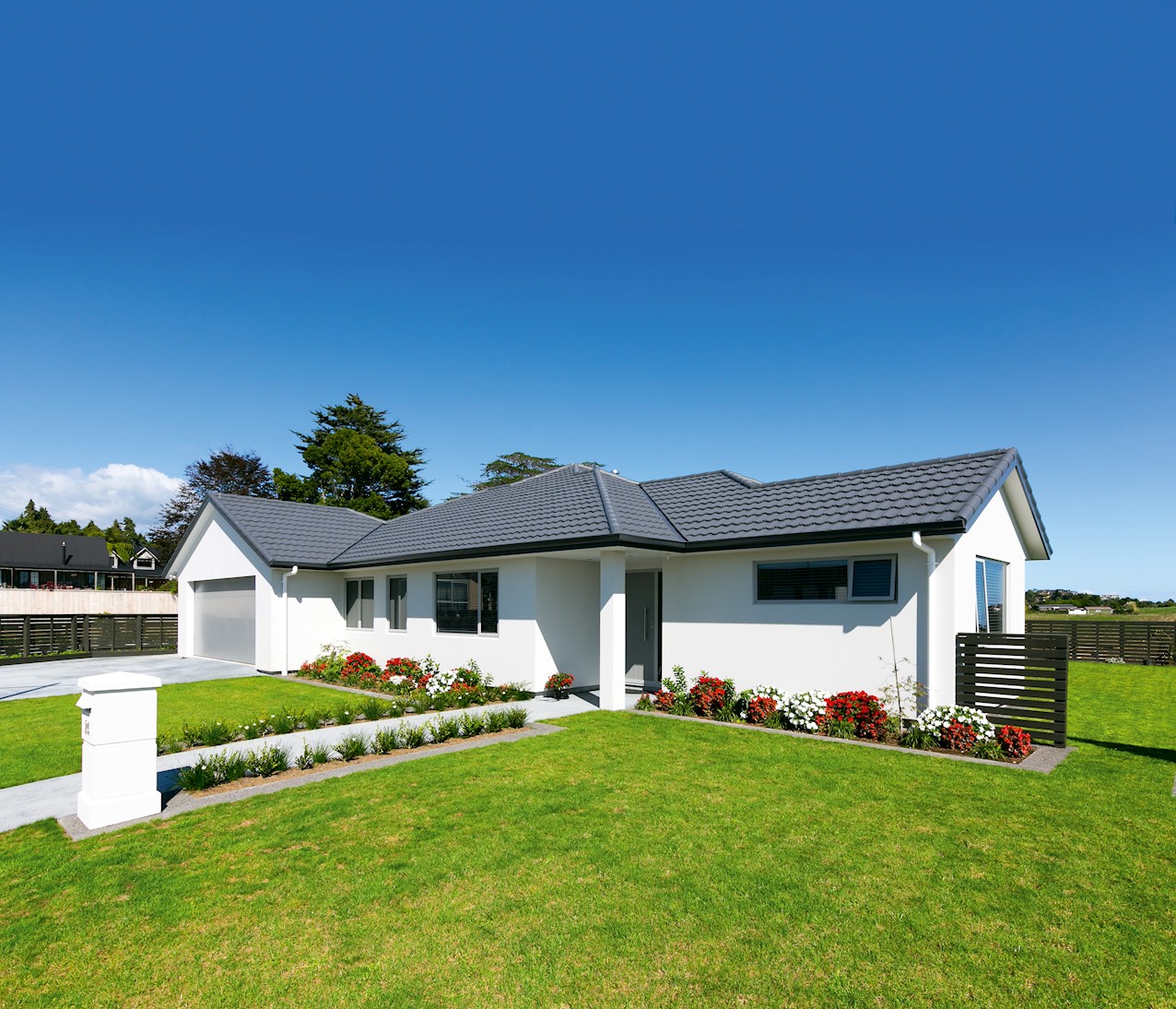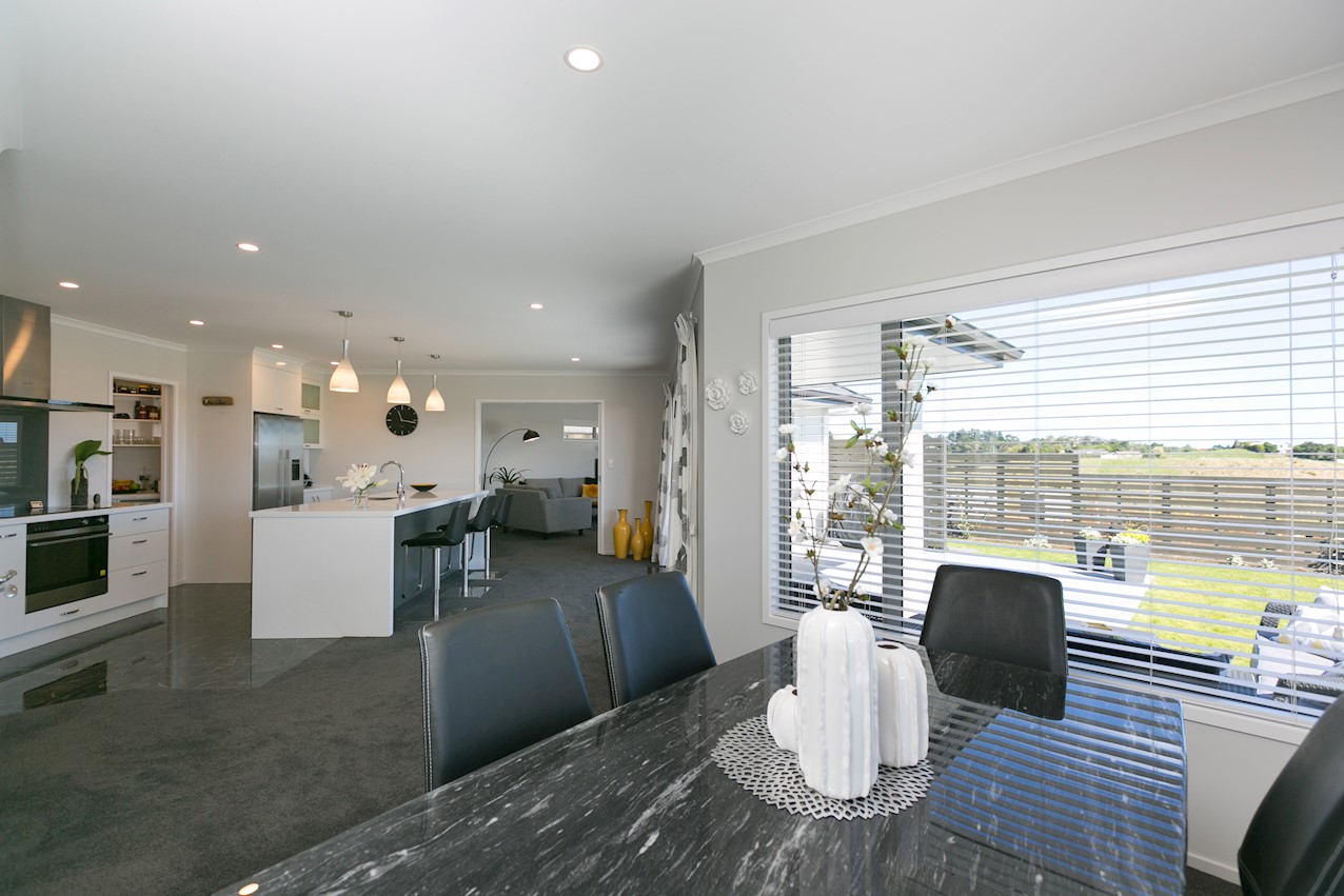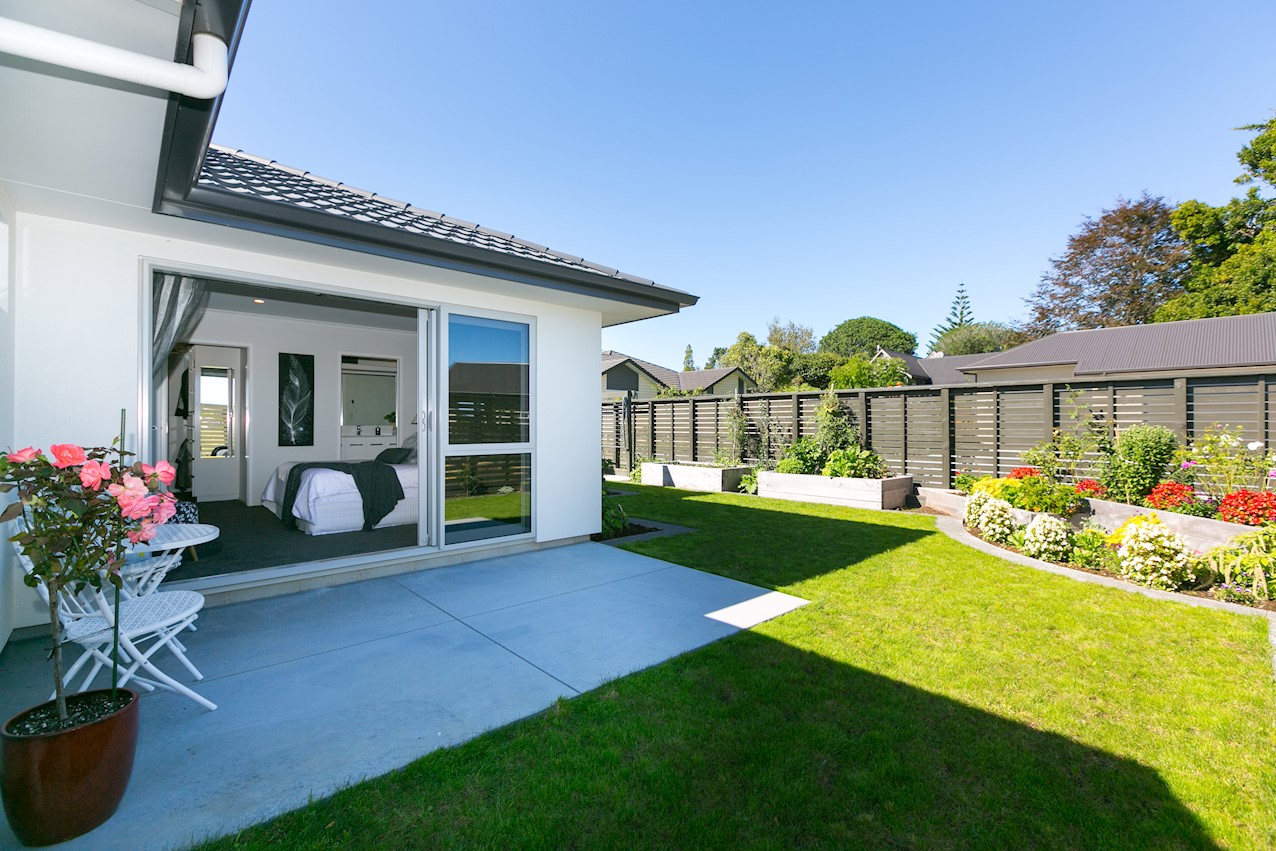 A smart layout gives this postcard-perfect home in Fernbrook, New Plymouth, a seriously spacious feel. The 212sqm abode includes three bedrooms, two bathrooms and not one but two living spaces. That’s a lot of bang for your buck. The heart of the home is the stylish kitchen with generous walk-in pantry. Extra storage cuts down on clutter. Use of white keeps things light and bright – as does the trio of hanging pendants above the central island bench. The dining space is nestled snugly nearby, with the formal lounge positioned through cavity sliders. Here, carpet adds a cosy feel and ties in nicely with the charcoal feature wall. The fireplace provides a nice focal point, warming the home on winter days. Large stacker sliding doors open off a nook in the kitchen, allowing the interior to spill out onto the concrete tiled patio. It’s the perfect place to unwind and watch the sun set at the end of the day. A hush falls over the home thanks to sound-proofing batts between bedrooms and bathrooms and living areas. How thoughtful.