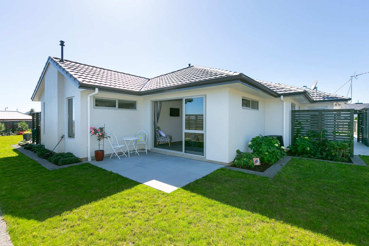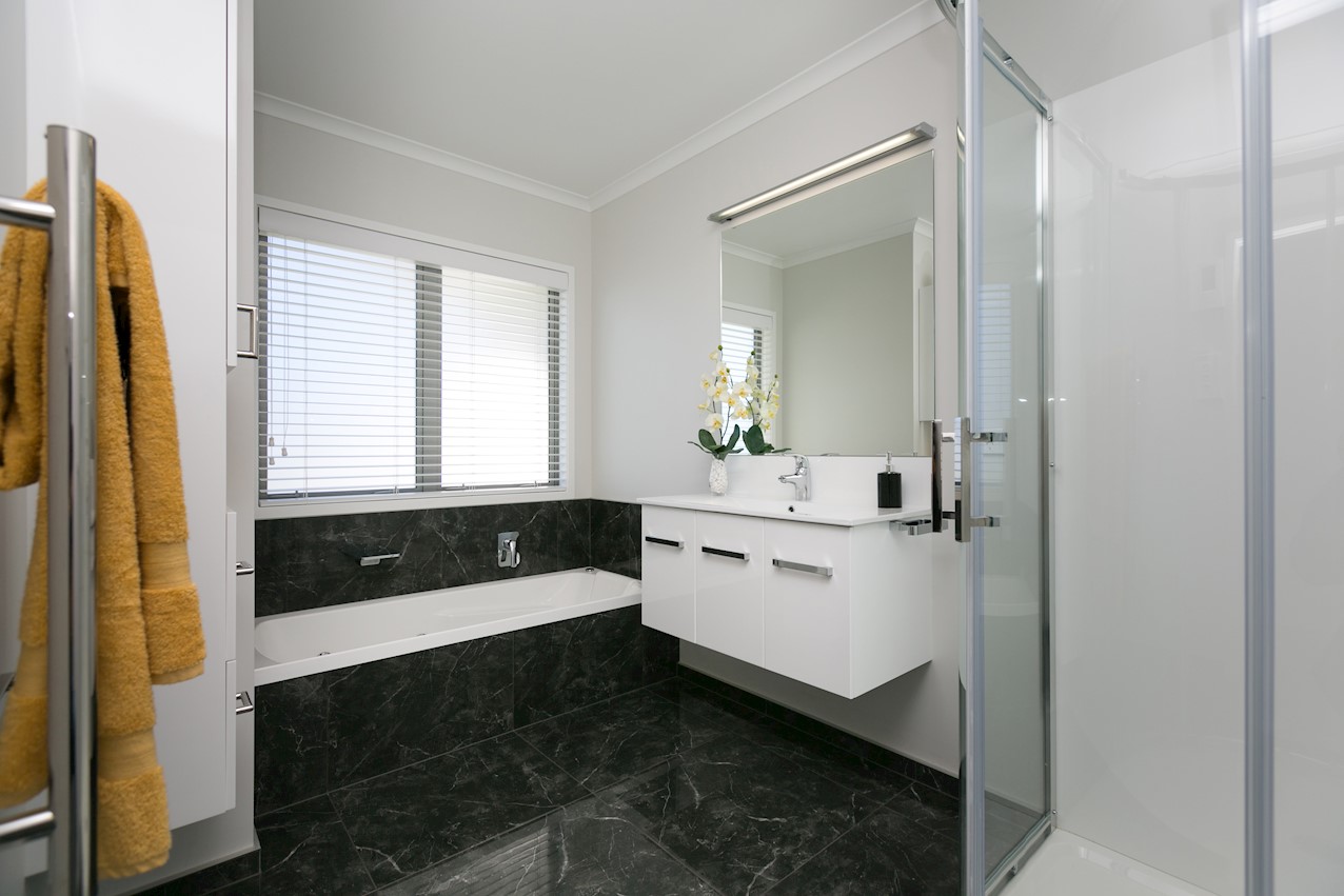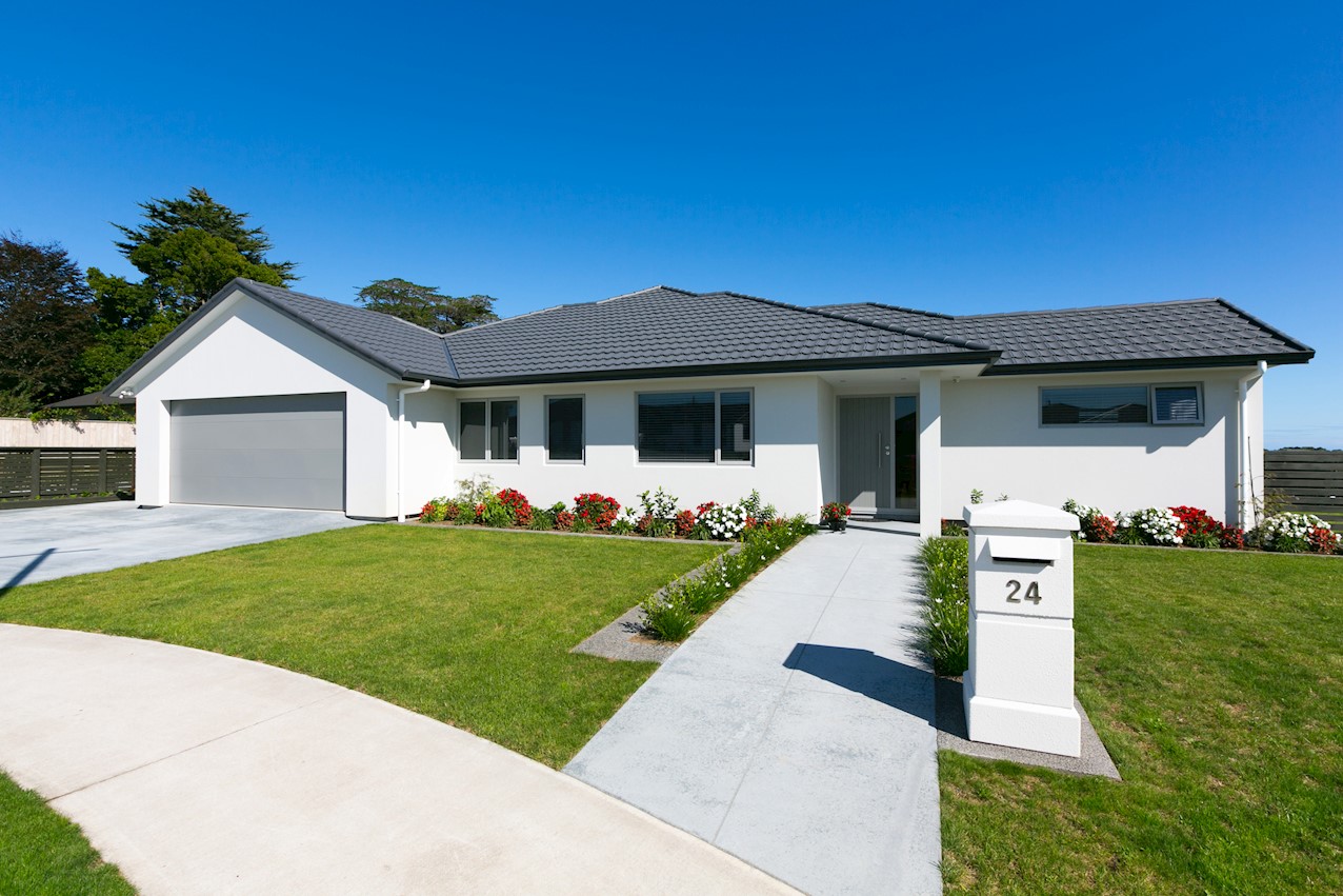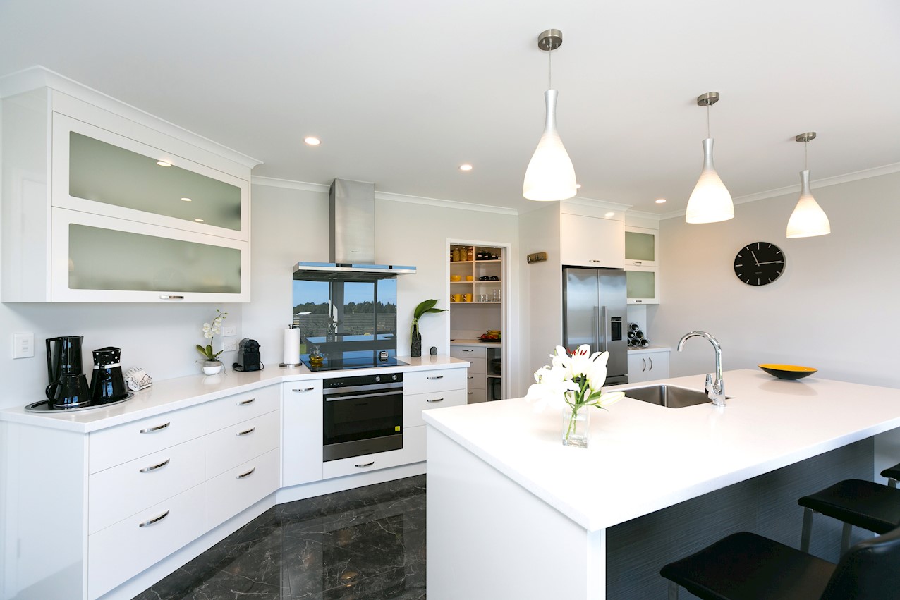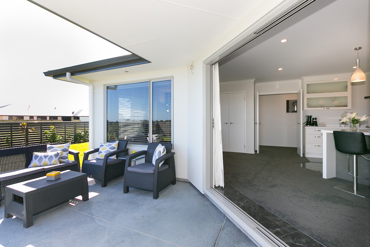 A smart layout gives this postcard-perfect home in Fernbrook, New Plymouth, a seriously spacious feel. The 212sqm abode includes three bedrooms, two bathrooms and not one but two living spaces. That’s a lot of bang for your buck. The heart of the home is the stylish kitchen with generous walk-in pantry. Extra storage cuts down on clutter. Use of white keeps things light and bright – as does the trio of hanging pendants above the central island bench. The dining space is nestled snugly nearby, with the formal lounge positioned through cavity sliders. Here, carpet adds a cosy feel and ties in nicely with the charcoal feature wall. The fireplace provides a nice focal point, warming the home on winter days. Large stacker sliding doors open off a nook in the kitchen, allowing the interior to spill out onto the concrete tiled patio. It’s the perfect place to unwind and watch the sun set at the end of the day. A hush falls over the home thanks to sound-proofing batts between bedrooms and bathrooms and living areas. How thoughtful.