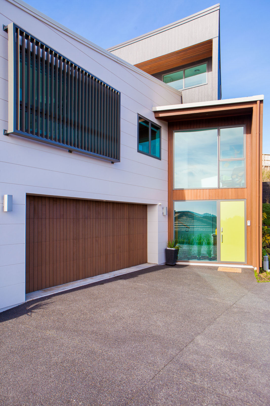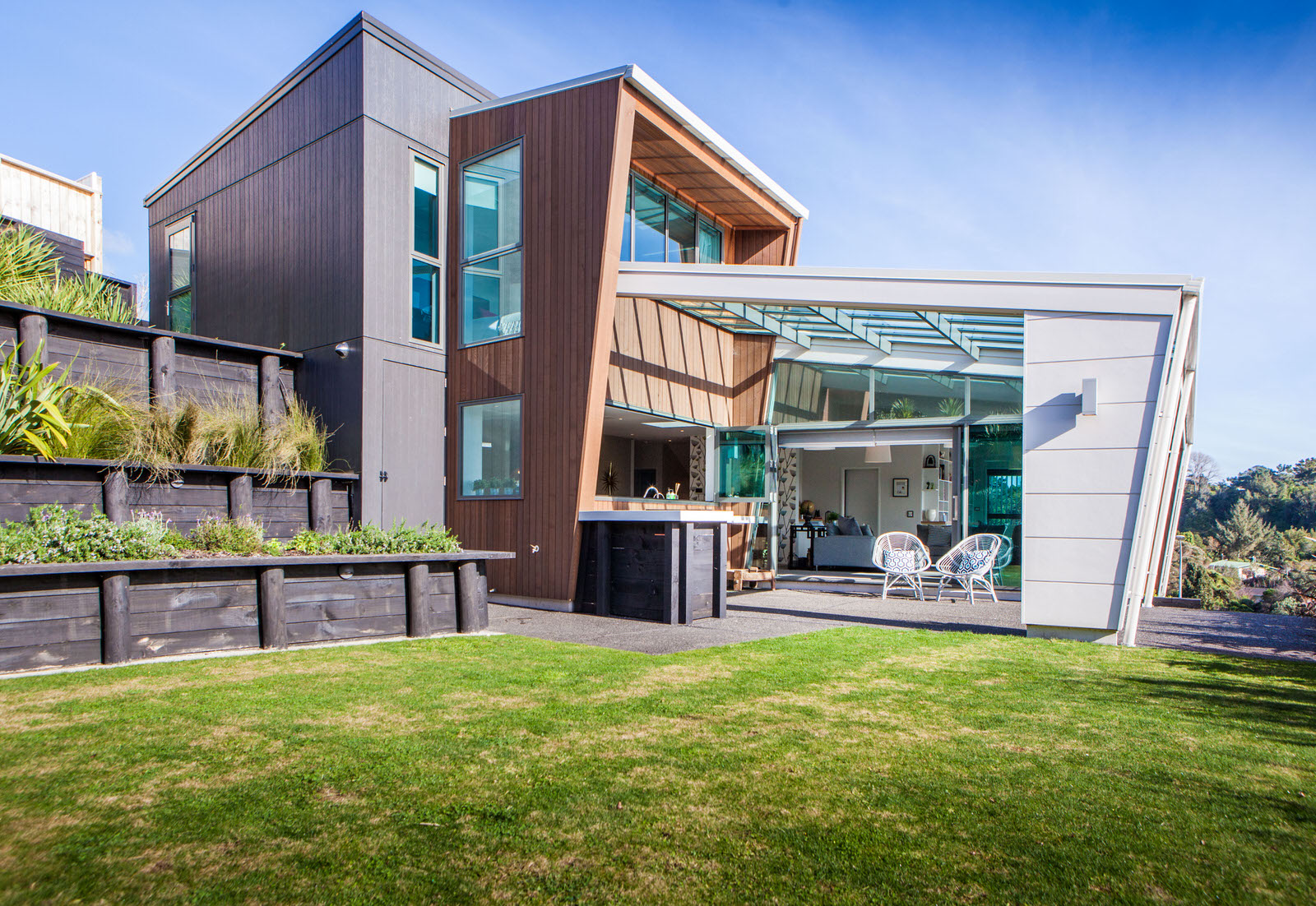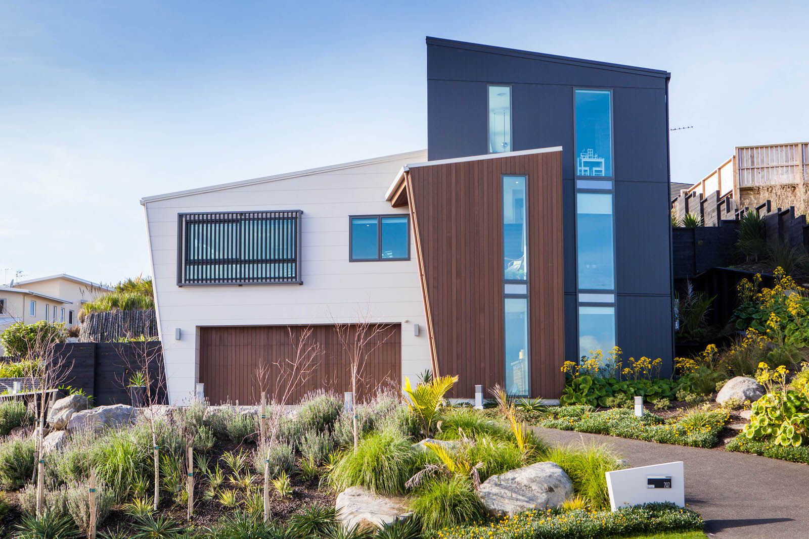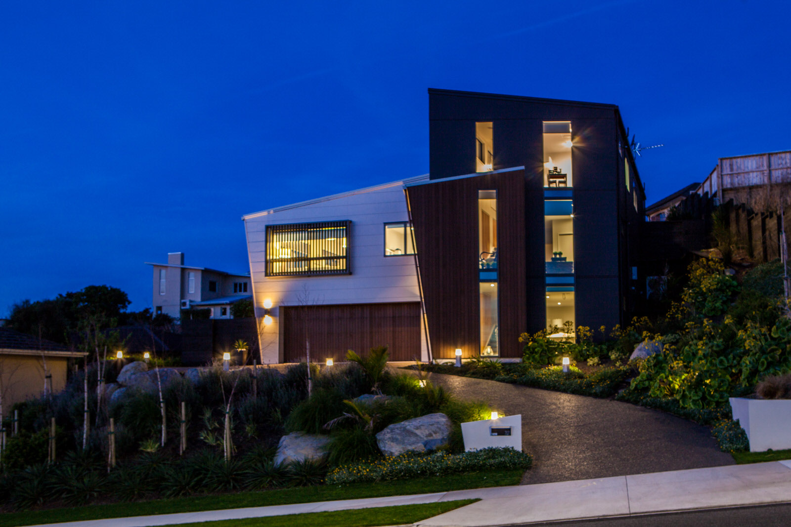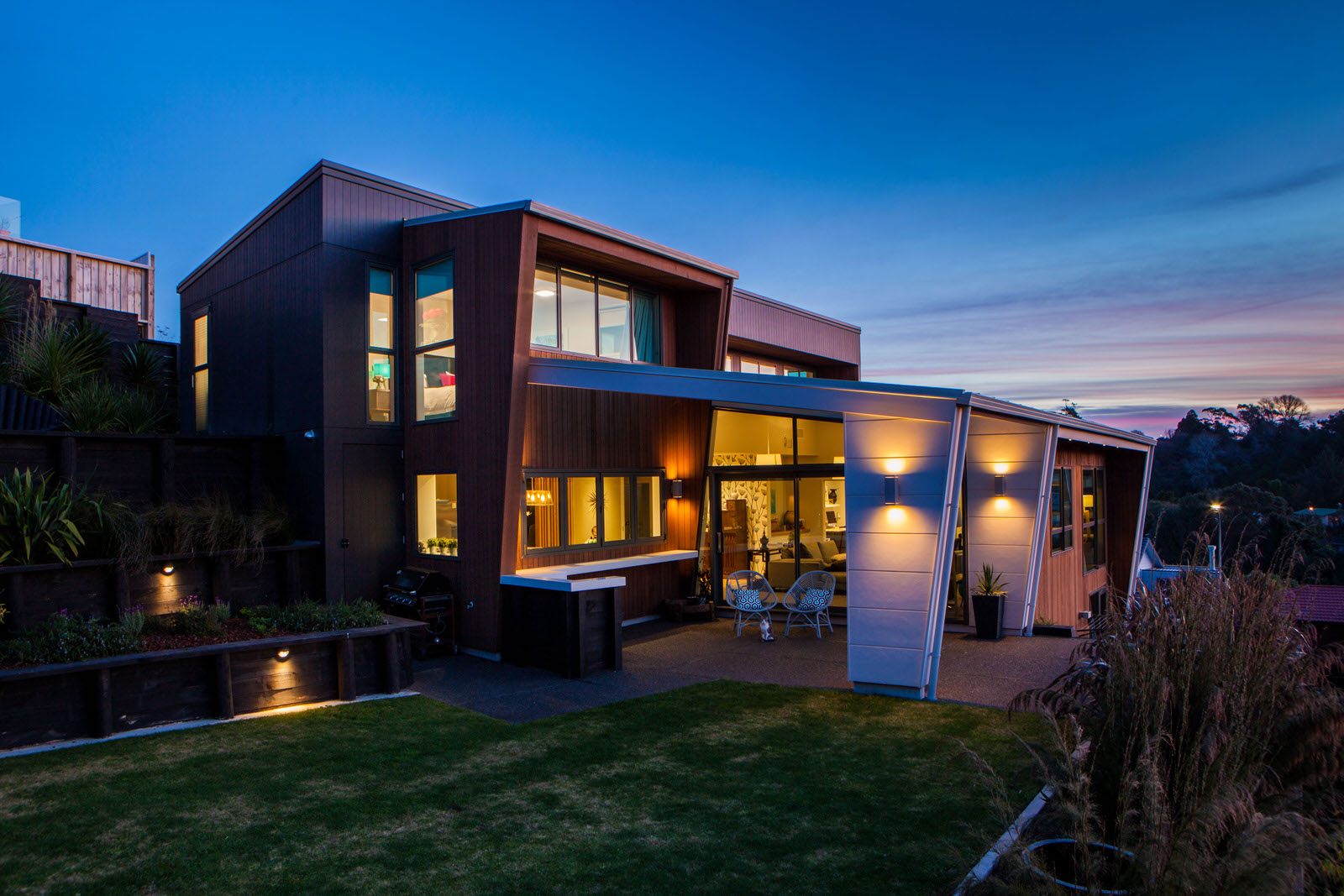 There’s no denying this modern Merrilands abode has wow factor. Its multiple volumes, stacked one in front of the other, and each progressively smaller, call to mind an unconventional Russian doll. It’s impossible not to take a closer look. But it’s not all form over function. Sidled up to its southern boundary, the 373sqm, four-bedroom home faces due north, enhancing solar gain in the spacious living areas and maximising space for outdoor entertaining. The lower level houses a large concrete block double garage, separate laundry, entry and games/media room. Next level up is the main open-plan living area, office, kitchen with scullery, dining and outdoor living. Overnight visitors will feel right at home thanks to the stylish guest bedroom and bathroom. Heading upstairs to the third and final floor, you’ll find three bedrooms, including the well-appointed master bedroom with its beautifully designed ensuite and walk-in wardrobe. A generous family bathroom on this level completes the exceptional example of modern living. Photo Credit: Rodger Richardson