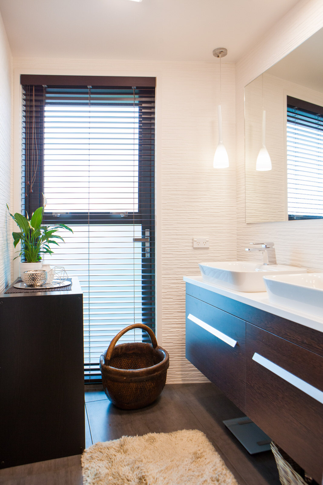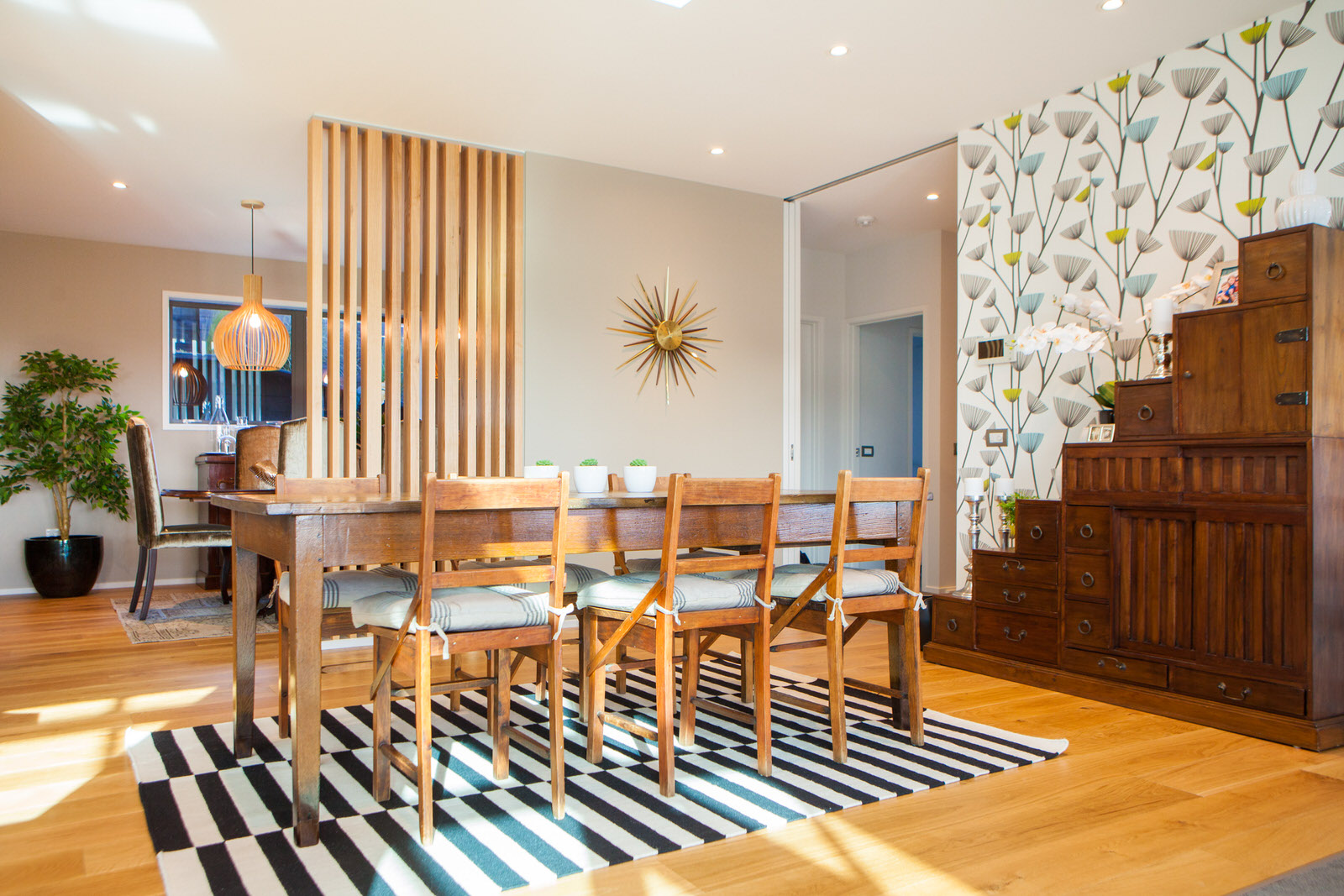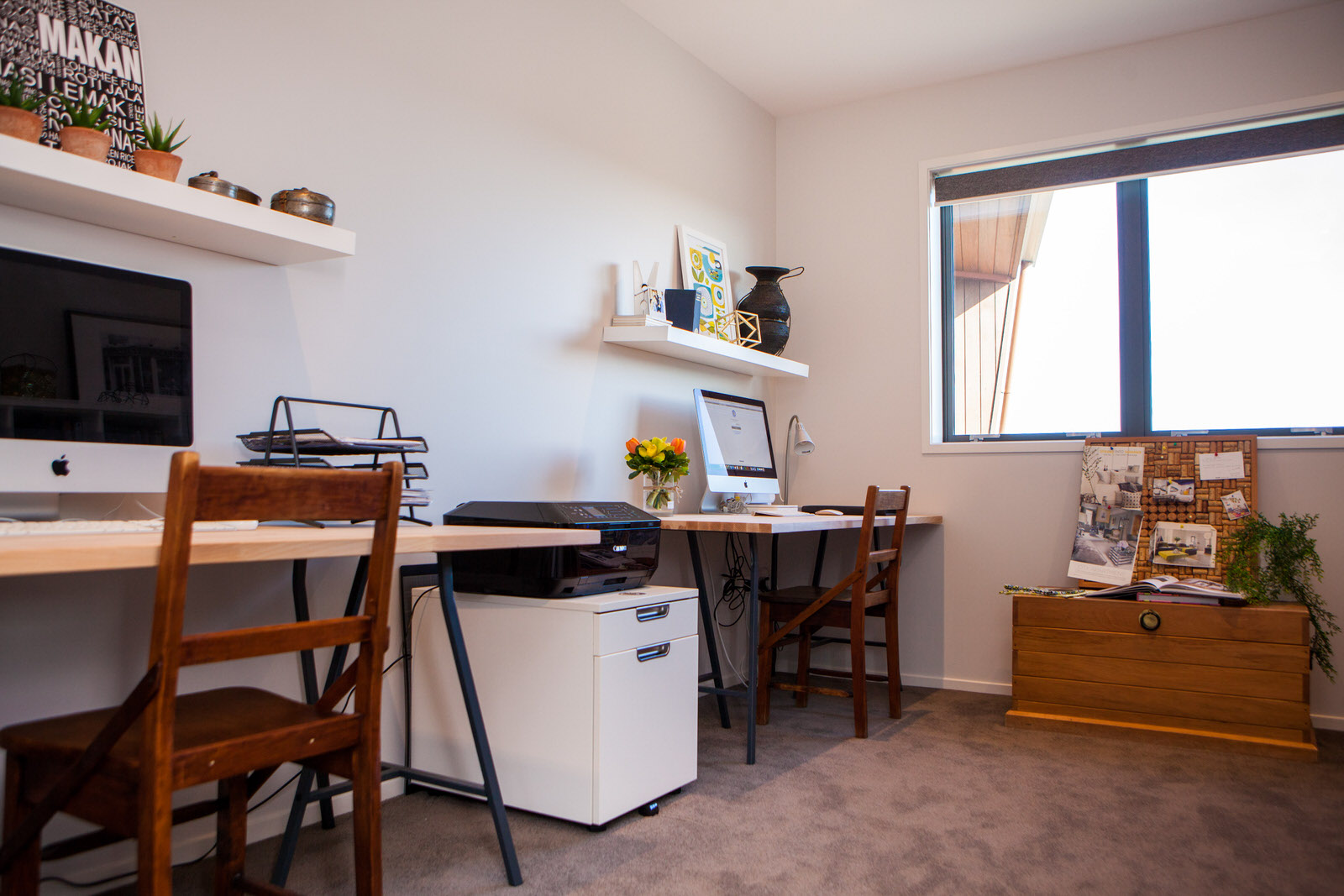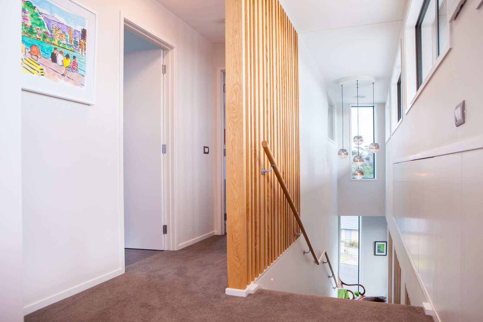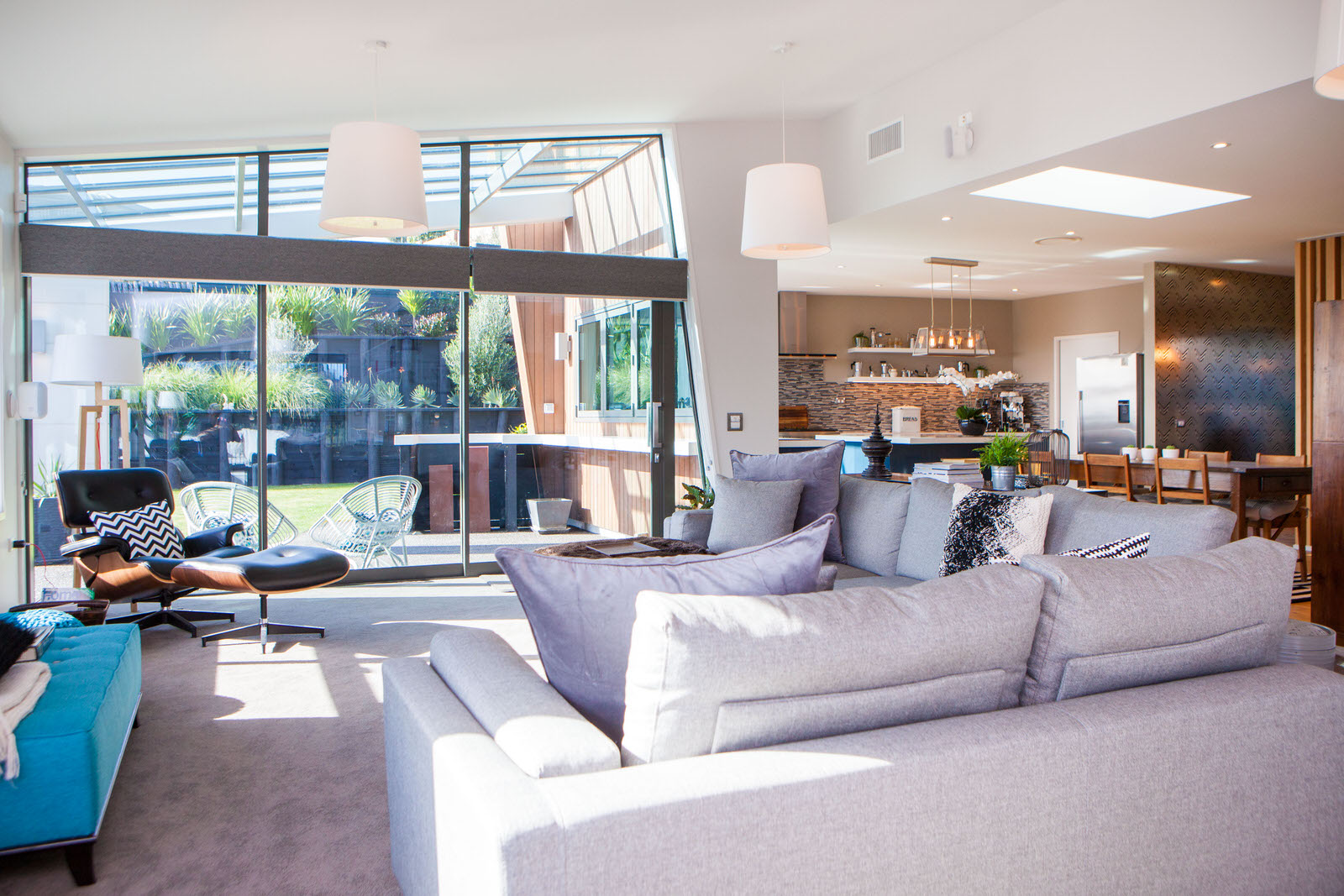There’s no denying this modern Merrilands abode has wow factor. Its multiple volumes, stacked one in front of the other, and each progressively smaller, call to mind an unconventional Russian doll. It’s impossible not to take a closer look. But it’s not all form over function. Sidled up to its southern boundary, the 373sqm, four-bedroom home faces due north, enhancing solar gain in the spacious living areas and maximising space for outdoor entertaining. The lower level houses a large concrete block double garage, separate laundry, entry and games/media room. Next level up is the main open-plan living area, office, kitchen with scullery, dining and outdoor living. Overnight visitors will feel right at home thanks to the stylish guest bedroom and bathroom. Heading upstairs to the third and final floor, you’ll find three bedrooms, including the well-appointed master bedroom with its beautifully designed ensuite and walk-in wardrobe. A generous family bathroom on this level completes the exceptional example of modern living. Photo Credit: Rodger Richardson