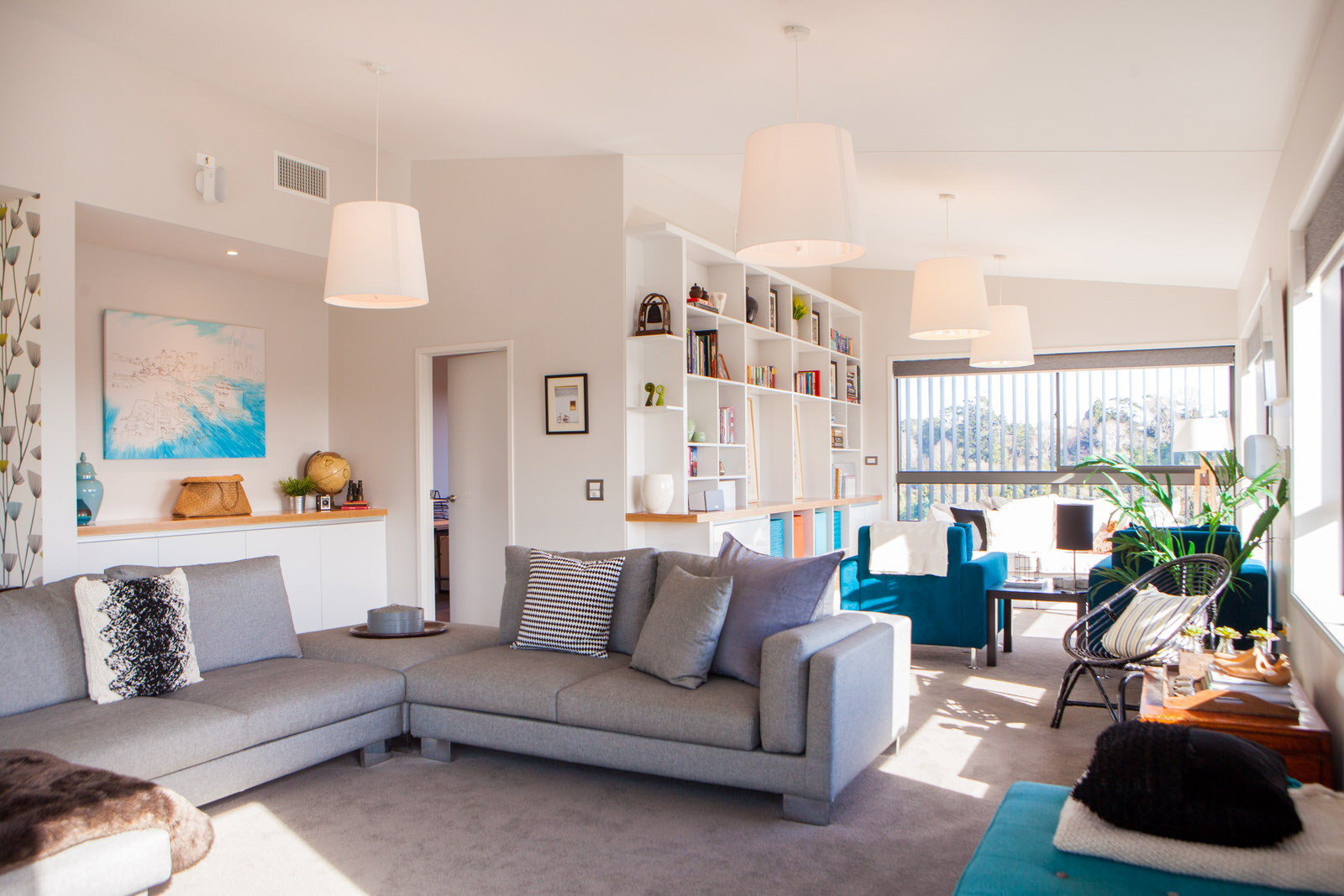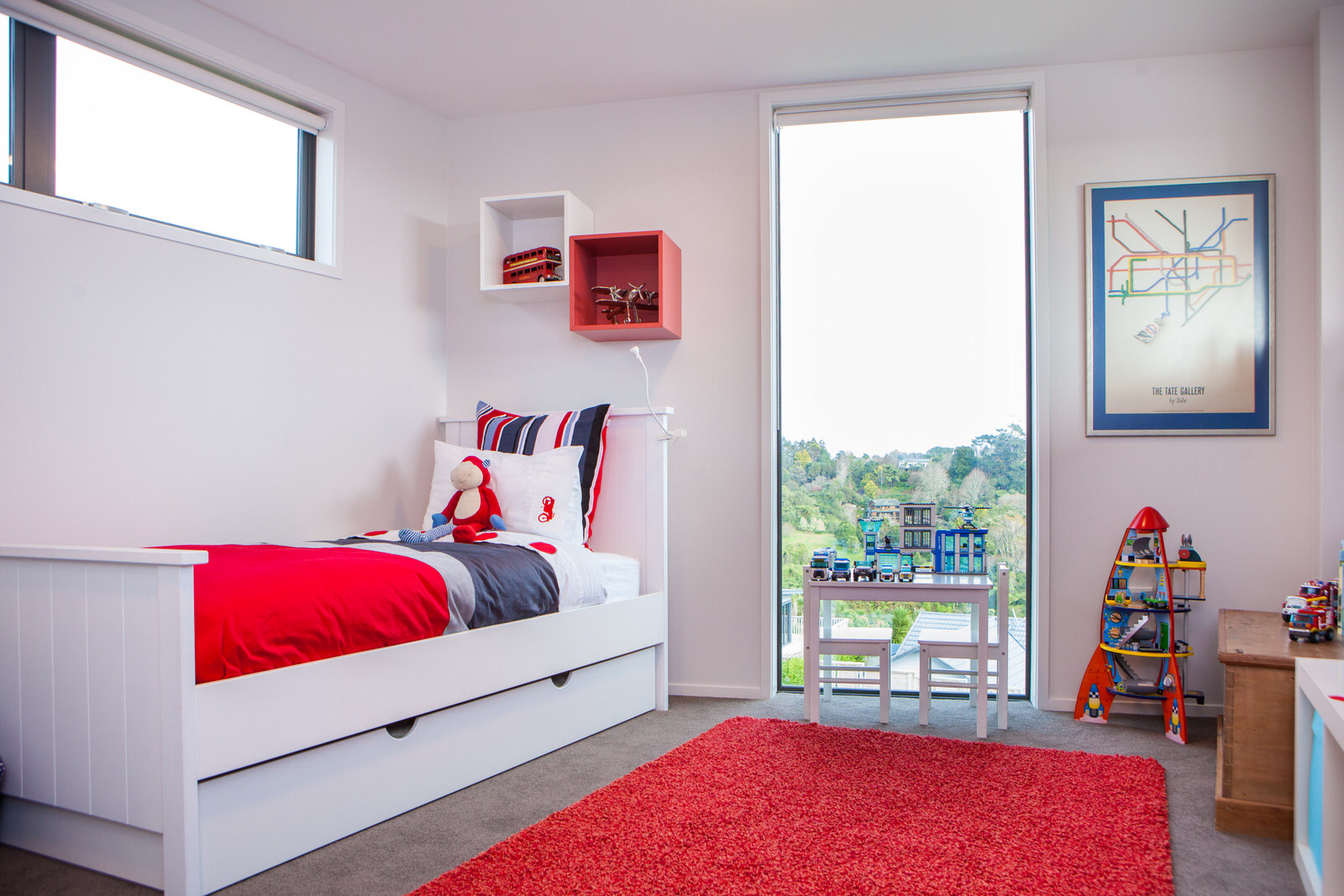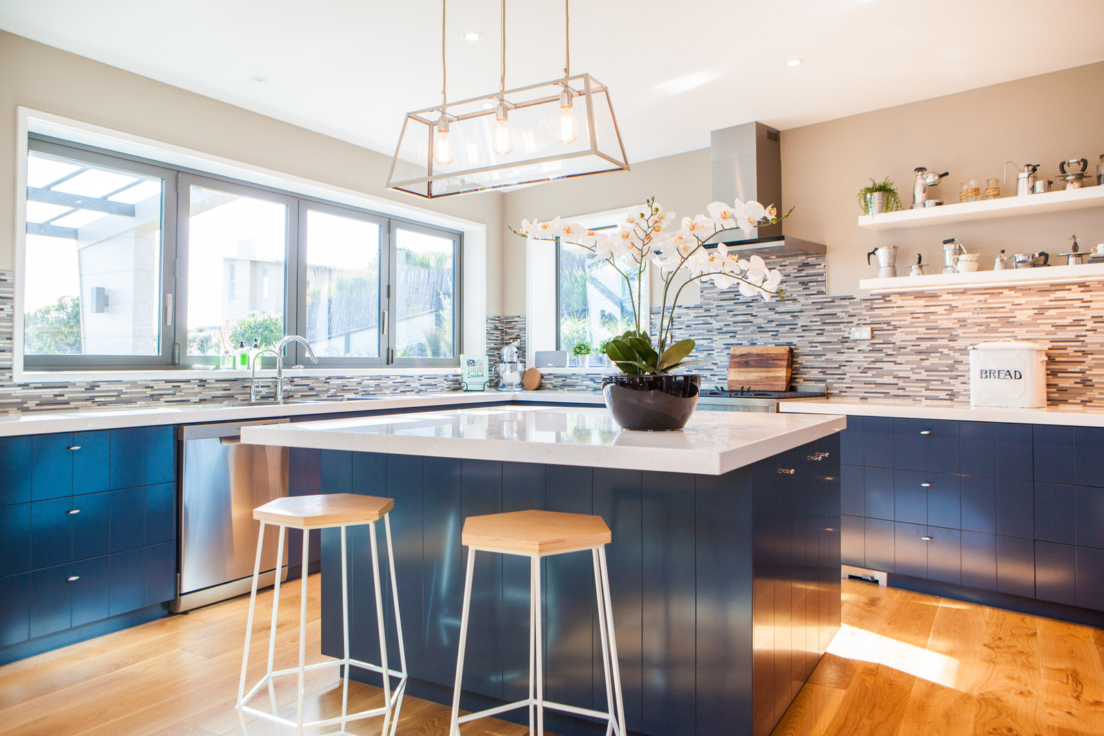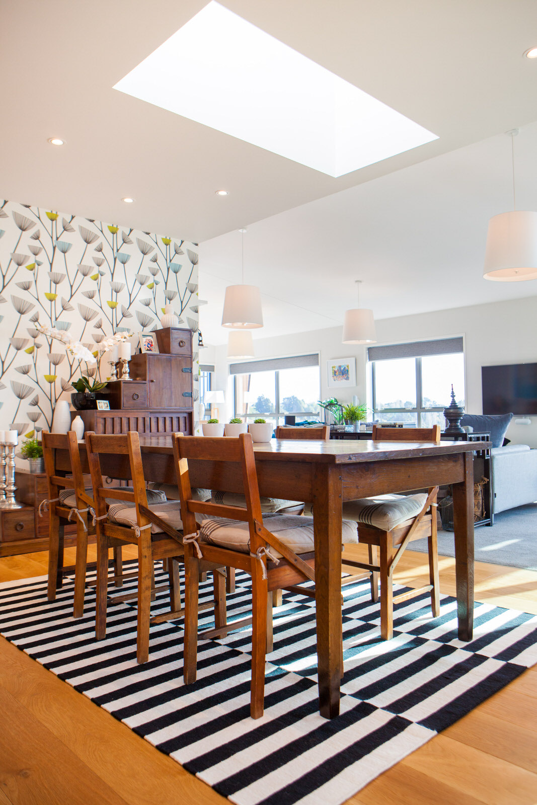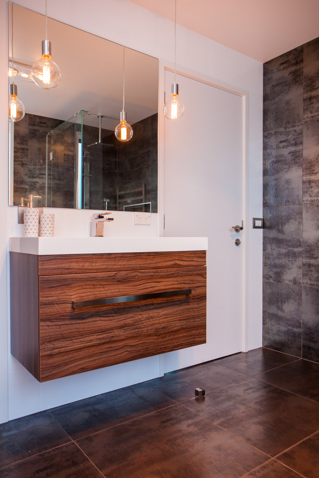 There’s no denying this modern Merrilands abode has wow factor. Its multiple volumes, stacked one in front of the other, and each progressively smaller, call to mind an unconventional Russian doll. It’s impossible not to take a closer look. But it’s not all form over function. Sidled up to its southern boundary, the 373sqm, four-bedroom home faces due north, enhancing solar gain in the spacious living areas and maximising space for outdoor entertaining. The lower level houses a large concrete block double garage, separate laundry, entry and games/media room. Next level up is the main open-plan living area, office, kitchen with scullery, dining and outdoor living. Overnight visitors will feel right at home thanks to the stylish guest bedroom and bathroom. Heading upstairs to the third and final floor, you’ll find three bedrooms, including the well-appointed master bedroom with its beautifully designed ensuite and walk-in wardrobe. A generous family bathroom on this level completes the exceptional example of modern living. Photo Credit: Rodger Richardson
