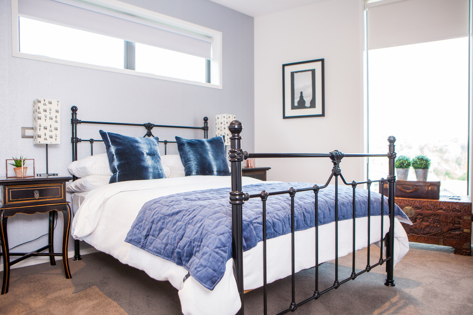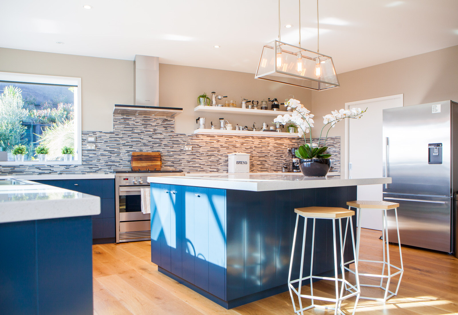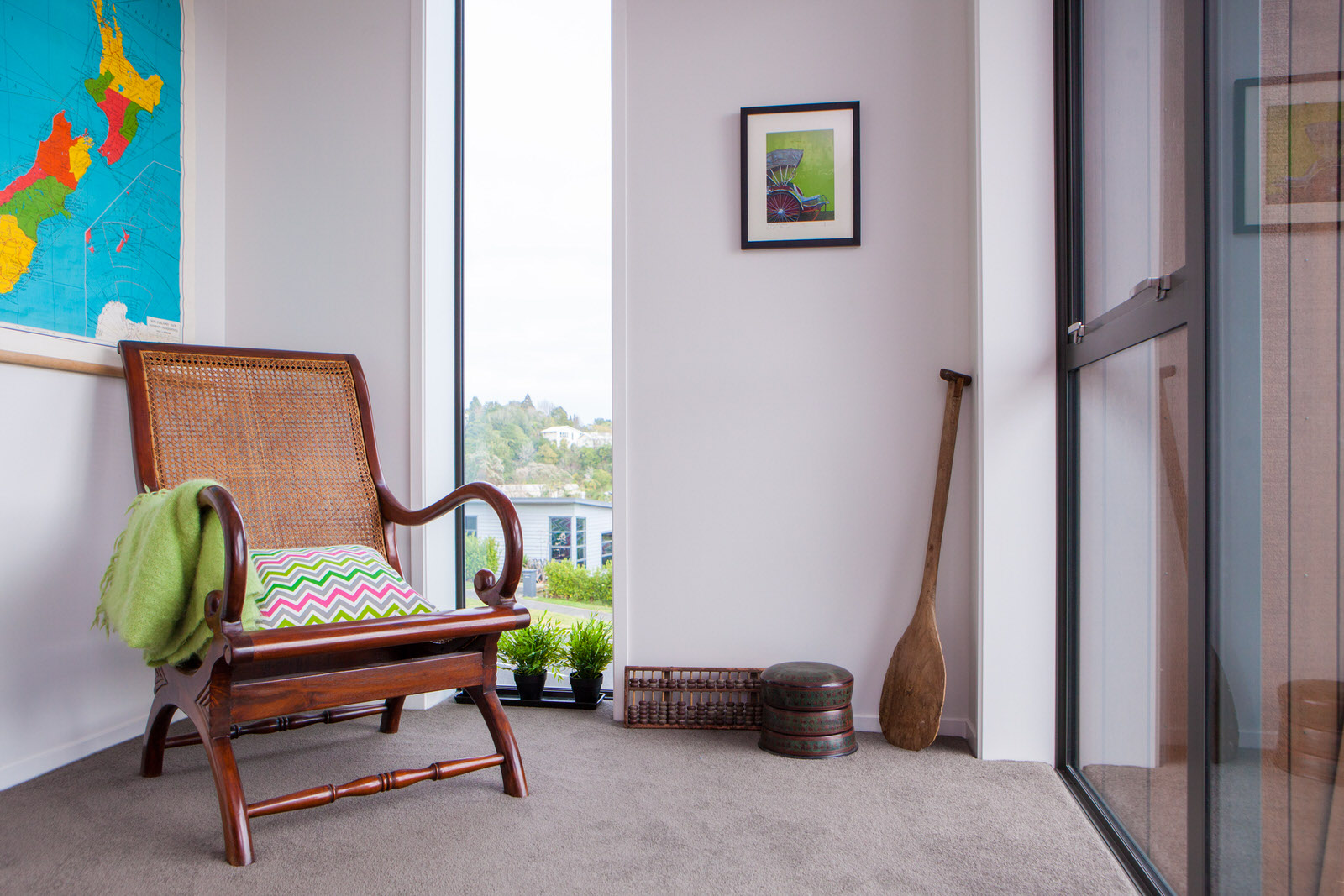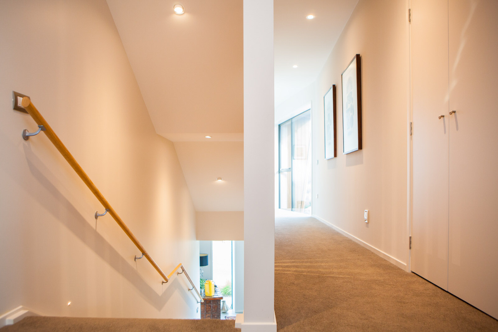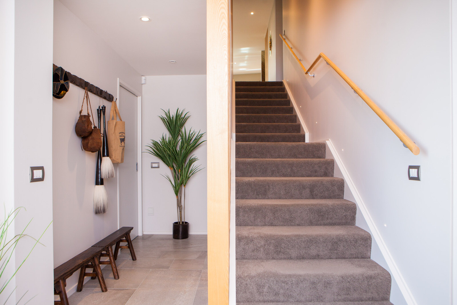 There’s no denying this modern Merrilands abode has wow factor. Its multiple volumes, stacked one in front of the other, and each progressively smaller, call to mind an unconventional Russian doll. It’s impossible not to take a closer look. But it’s not all form over function. Sidled up to its southern boundary, the 373sqm, four-bedroom home faces due north, enhancing solar gain in the spacious living areas and maximising space for outdoor entertaining. The lower level houses a large concrete block double garage, separate laundry, entry and games/media room. Next level up is the main open-plan living area, office, kitchen with scullery, dining and outdoor living. Overnight visitors will feel right at home thanks to the stylish guest bedroom and bathroom. Heading upstairs to the third and final floor, you’ll find three bedrooms, including the well-appointed master bedroom with its beautifully designed ensuite and walk-in wardrobe. A generous family bathroom on this level completes the exceptional example of modern living. Photo Credit: Rodger Richardson