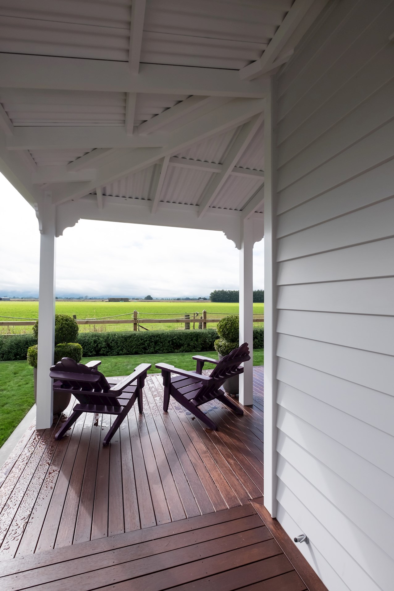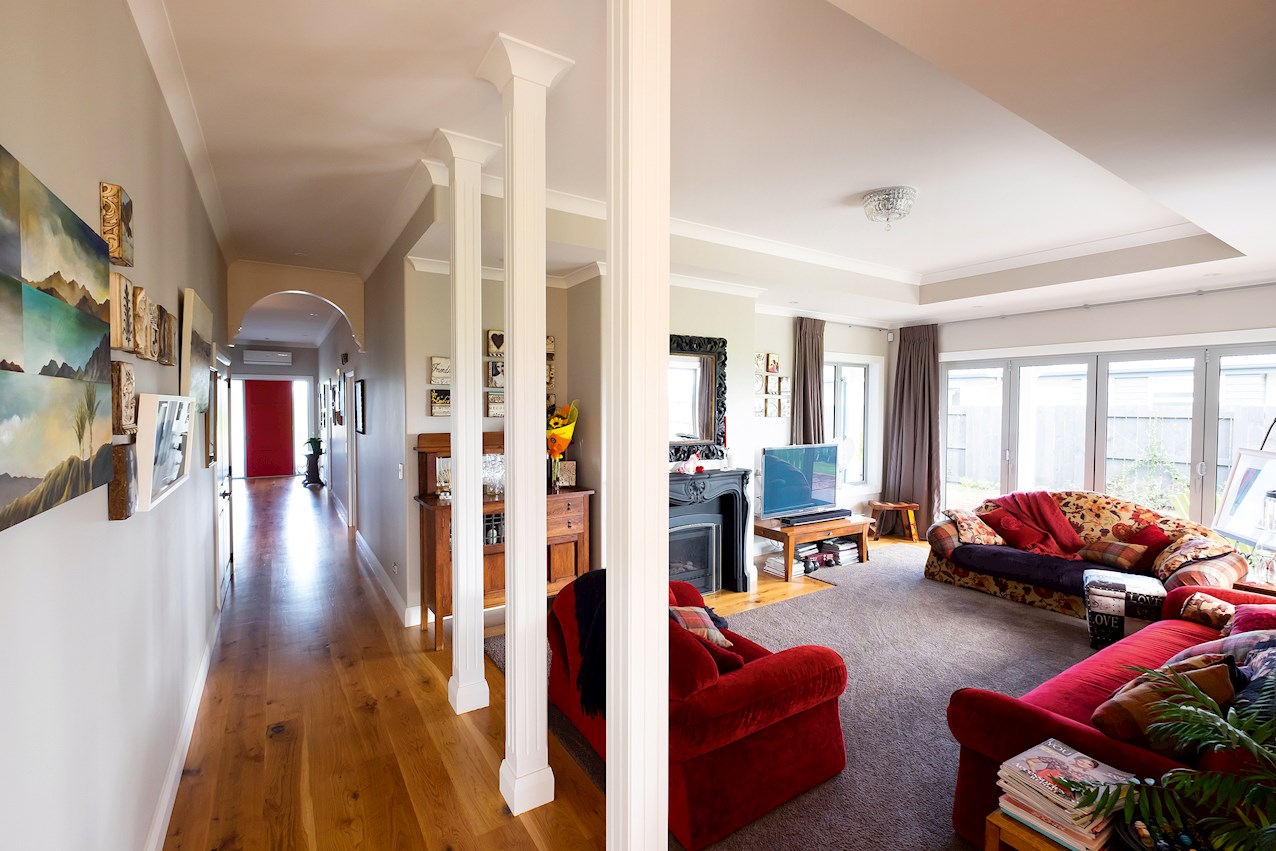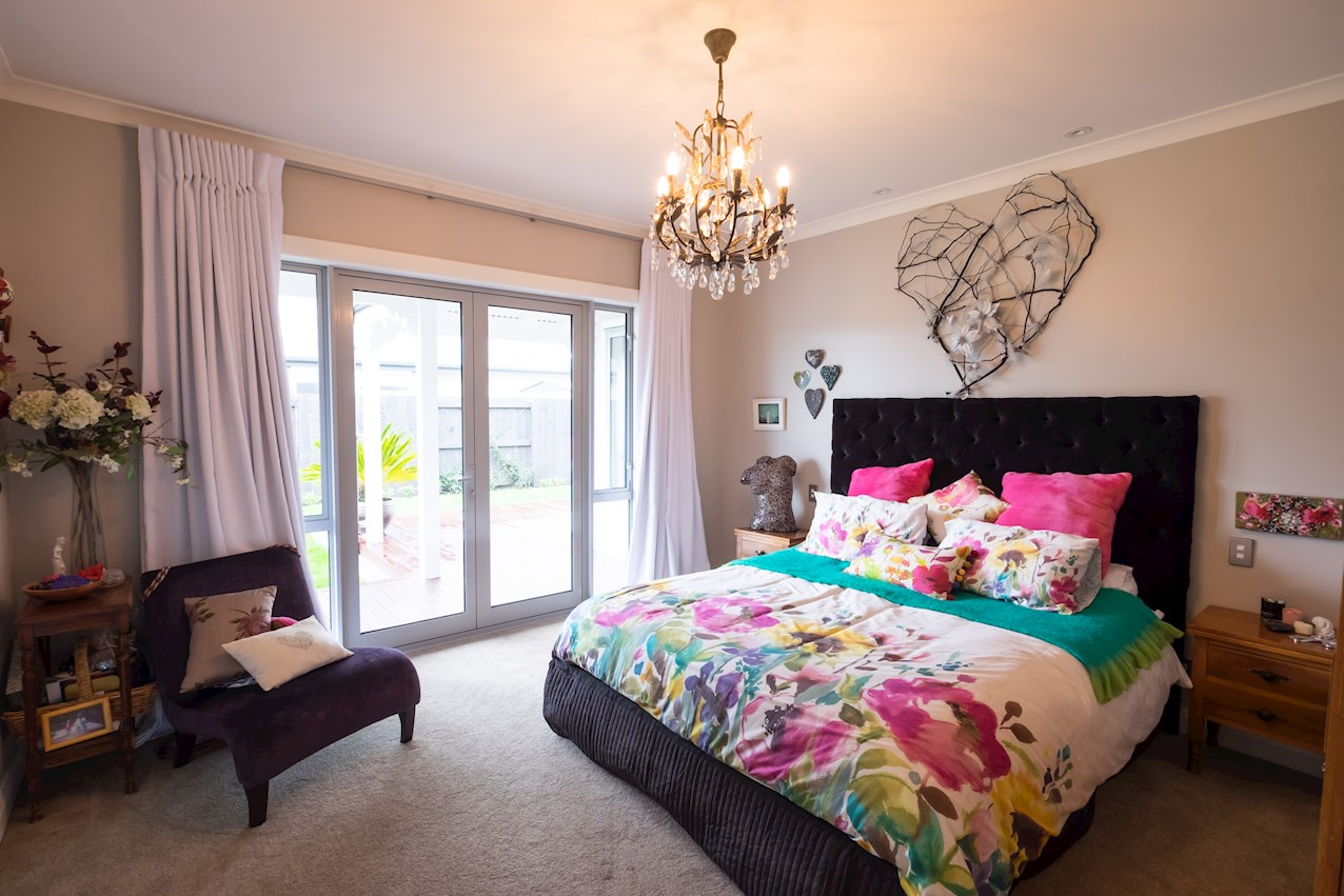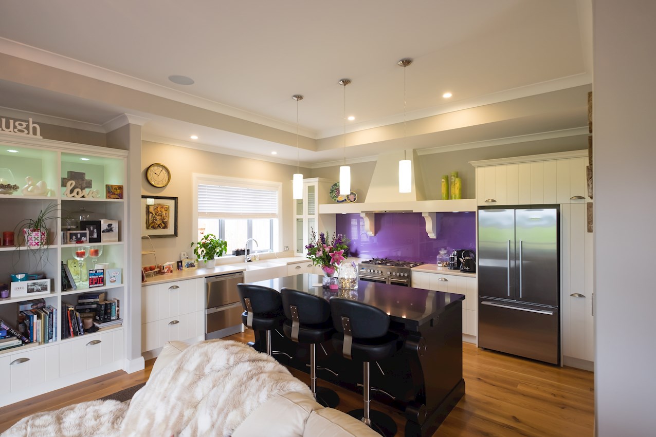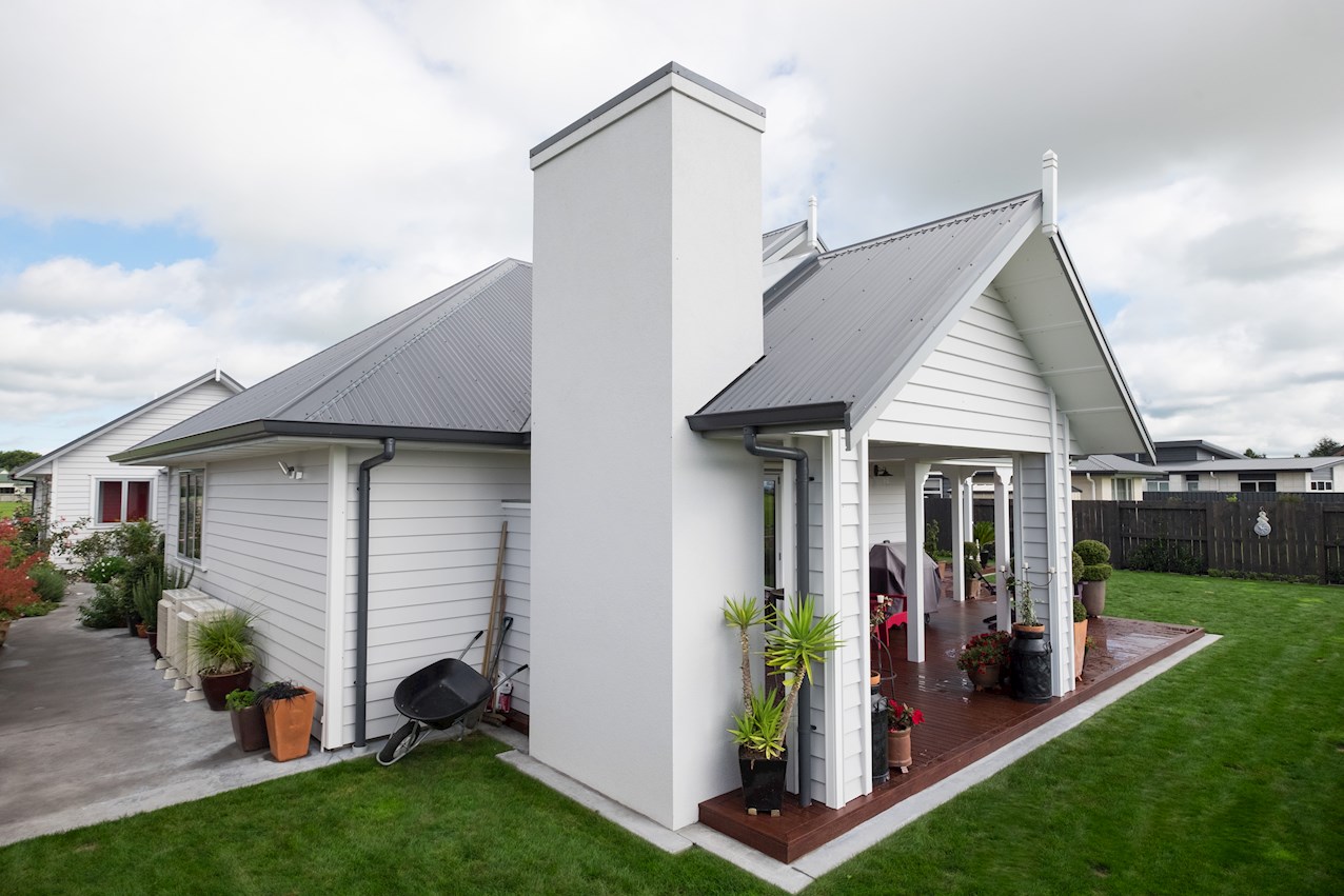 This modern take on a traditional villa hits the mark in Matamata. The fresh and light exterior is elegant and understated. A huge, wraparound deck conjures visions of summer soirees. The portico with gas fire warms late into the evening, so there’s no need to rush inside when the temperature drops. The classic yet contemporary interior boasts four bedrooms, two bathrooms and dual living spaces, including an open-plan layout. A black central island, purple splashback and stainless steel appliances give the entertainer’s haven a dramatic edge. Meanwhile, stepped ceilings, wide architraves and skirtings, and panelled doors foster a traditional feel. The antique bronze hardware on the doors deserves a medal. Window seats with bookshelves in the bedrooms are another fine feature. Plenty of storage, a laundry and a garage with attic are pleasingly practical additions. In the bathroom, the bold, beautiful freestanding tub is a light and lovely place to soak at the end of a long day.